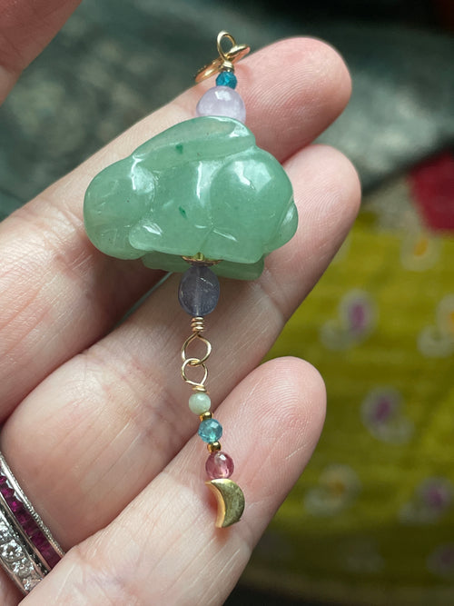 Jade Rabbit Talismanic Pendant - Moon Drop - Kunzite, Garnet, Jade, Apatite and Tanzanite- Gold Filled - Handmade
