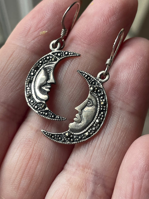 Marcasite Moon Earrings - Sterling Silver - Vintage
