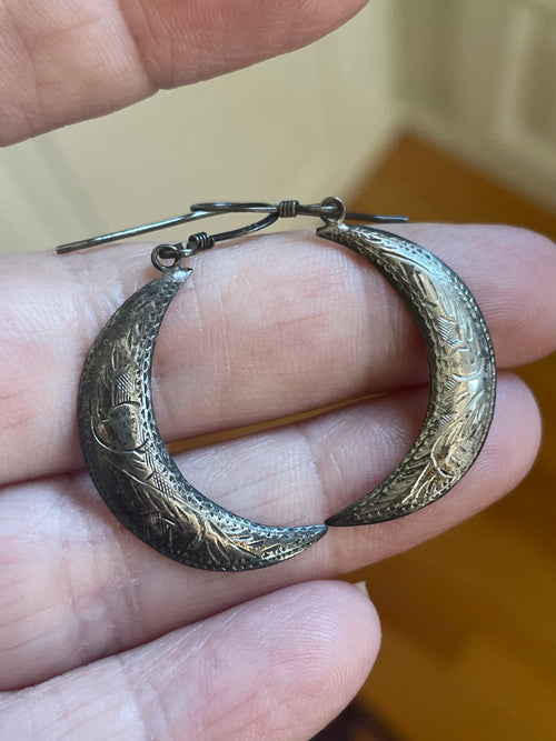 Engraved Moon Earrings - Sterling Silver - Vintage