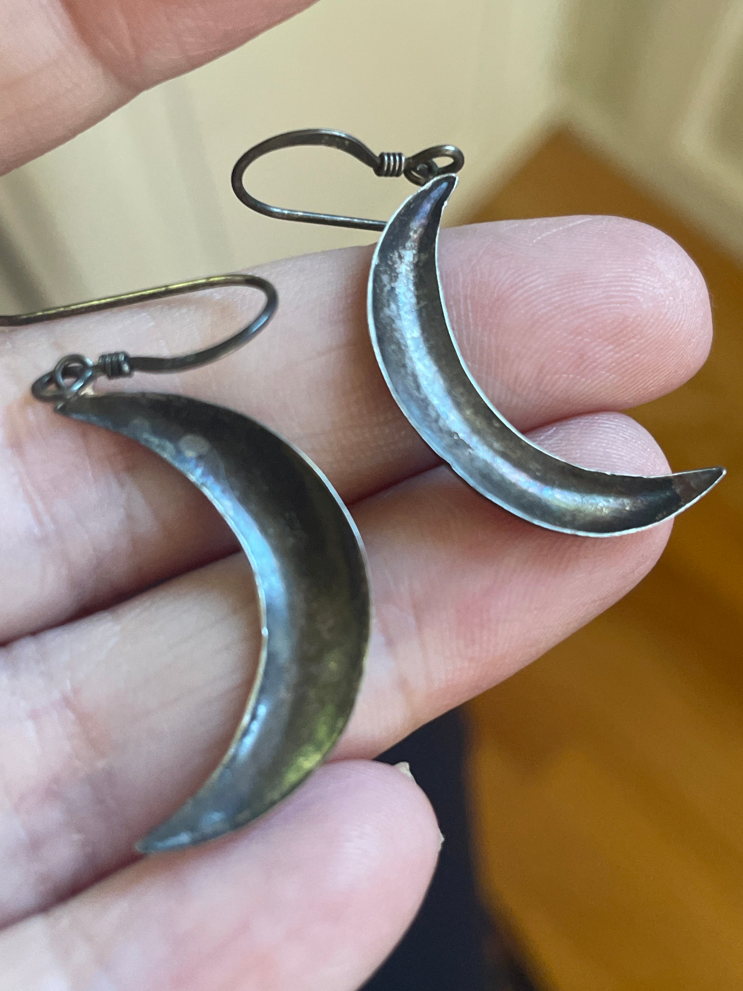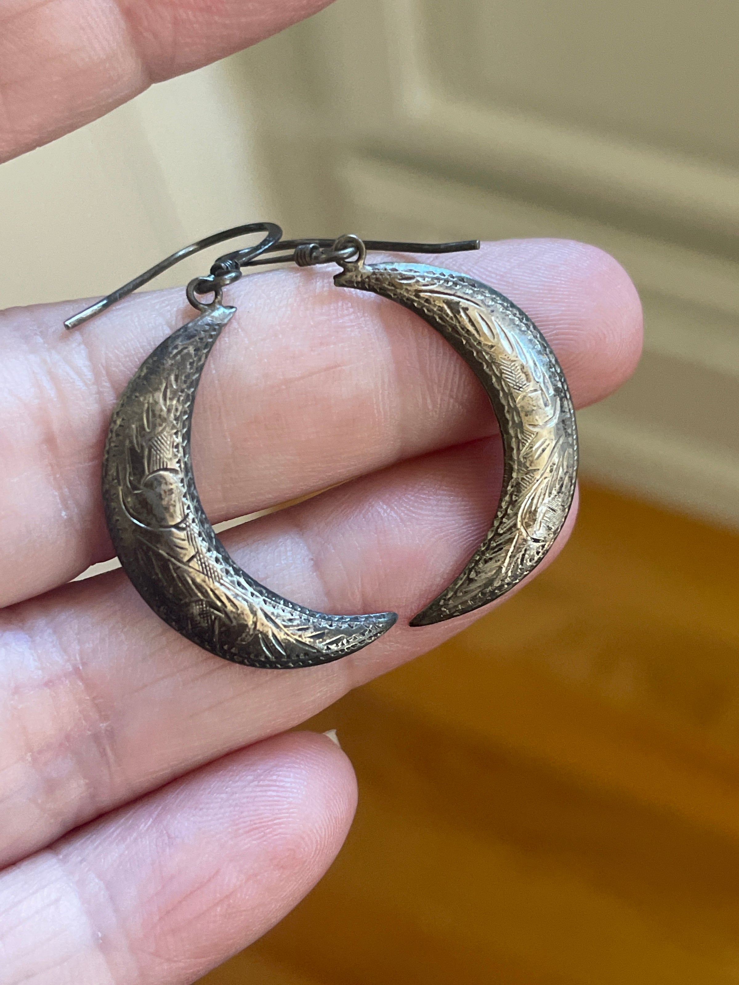 Lovely engraved sterling Moon earrings with ornate details. They measure approx 1.5 inches. Oxidized from age (new owner can decide on polishing). Stamped 925.