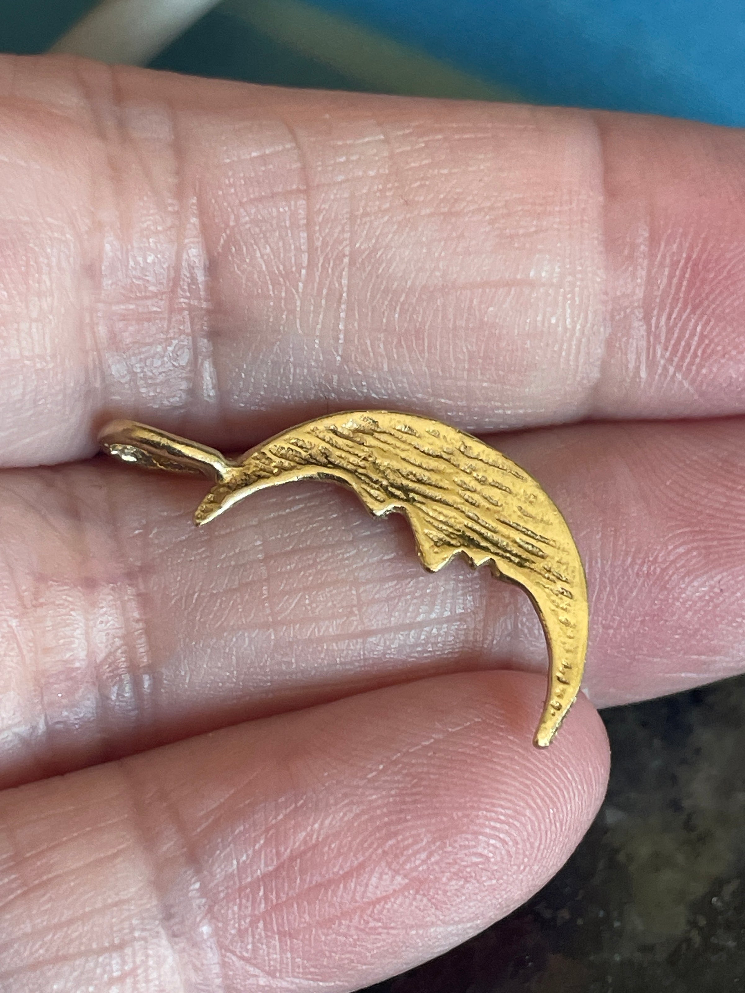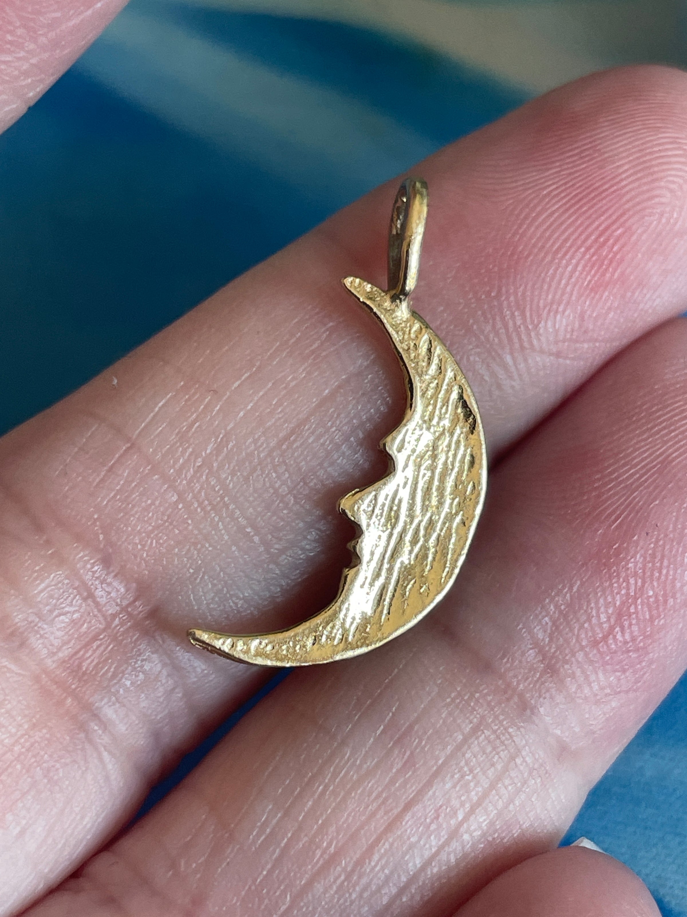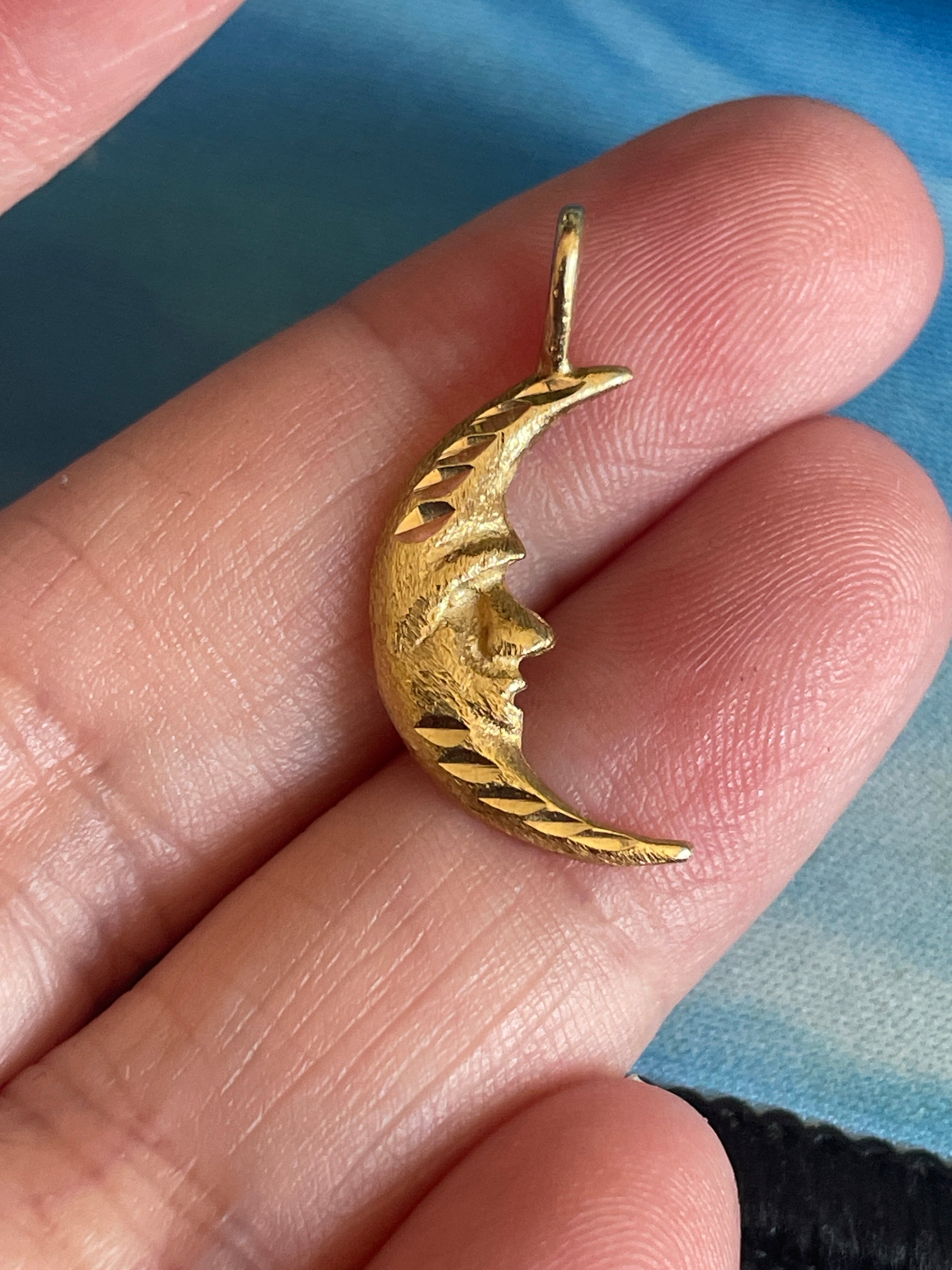 Gorgeous vintage engraved Moon pendant in 14k gold. Moon measures approx 1 inches with stationary bail x 6mm at widest point. Tested 14k.