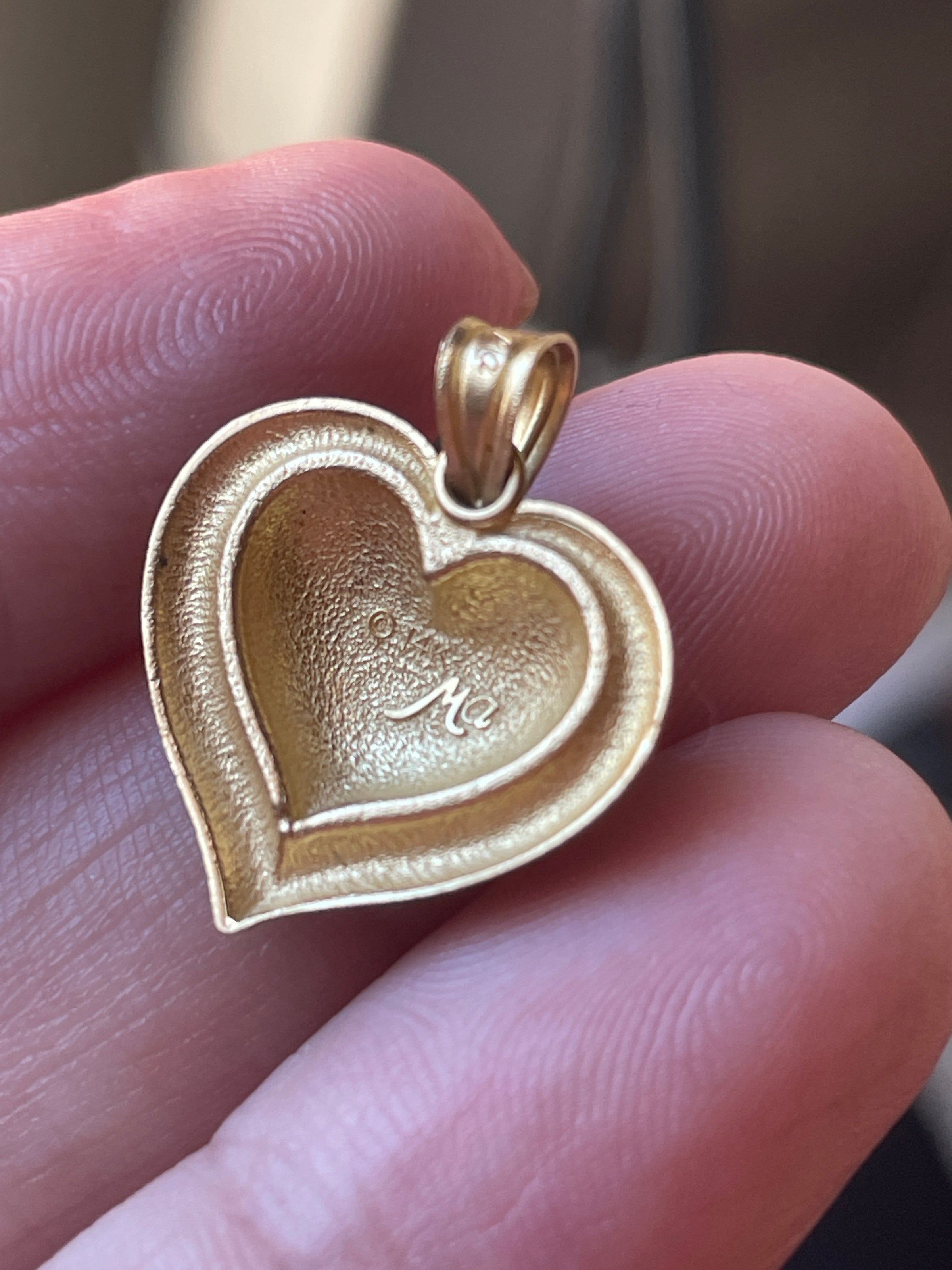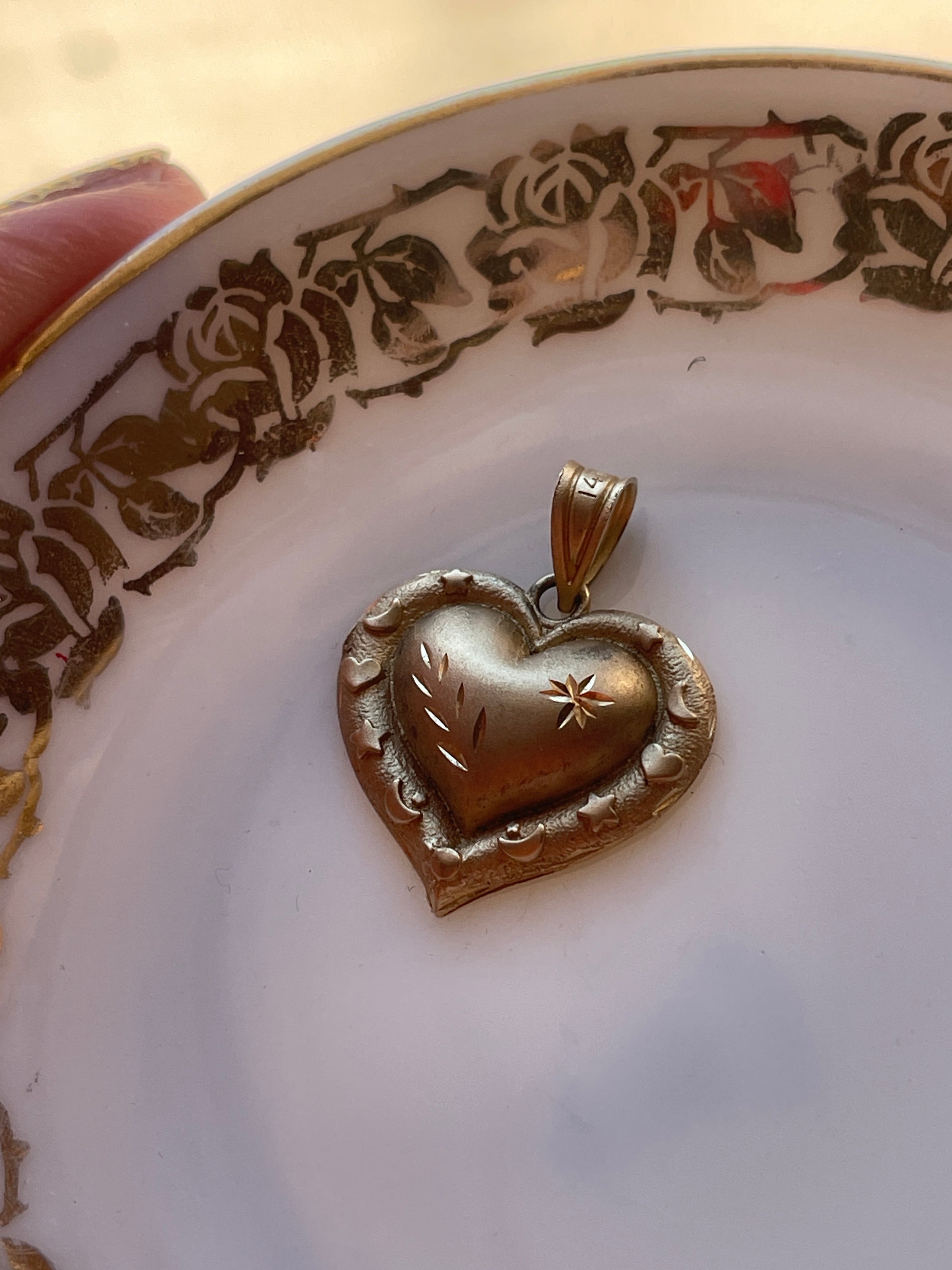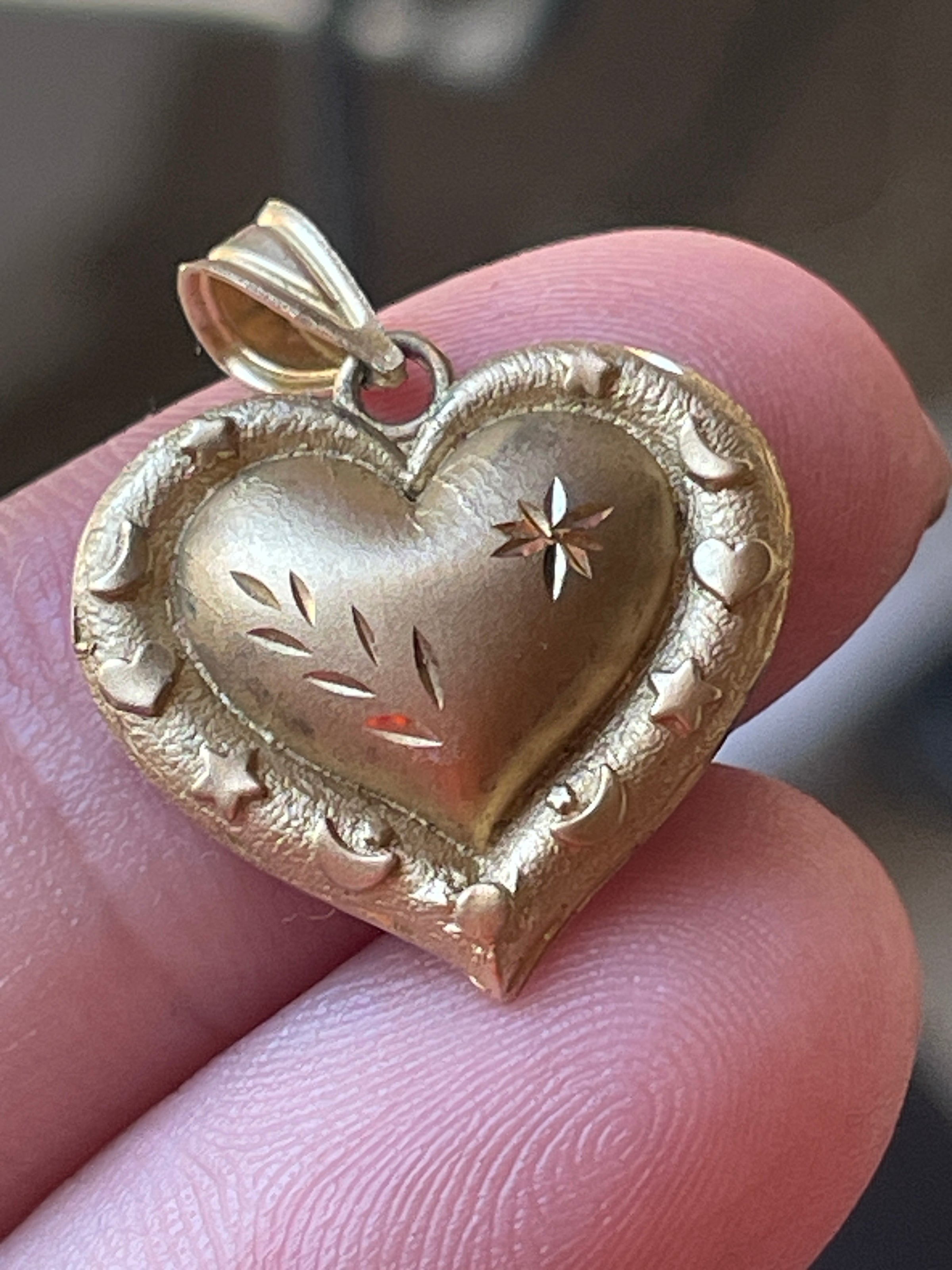 Fabulous vintage Heart pendant with a border design of Moons, Stars and Hearts. Has a star and leaf-like design at the center. Measures just over 0.75 inches with bail x approx 16mm. Stamped 14k and MA on back.