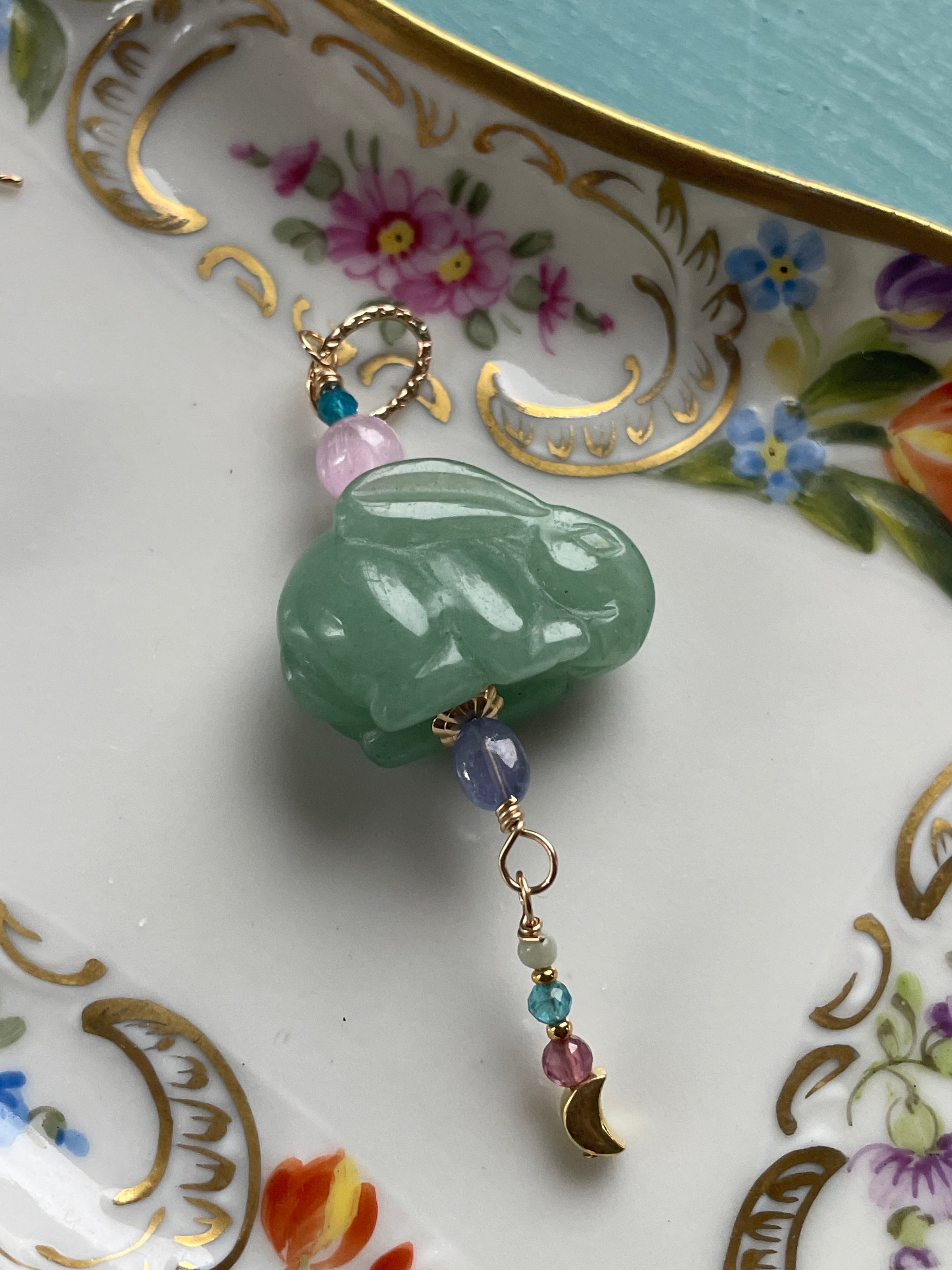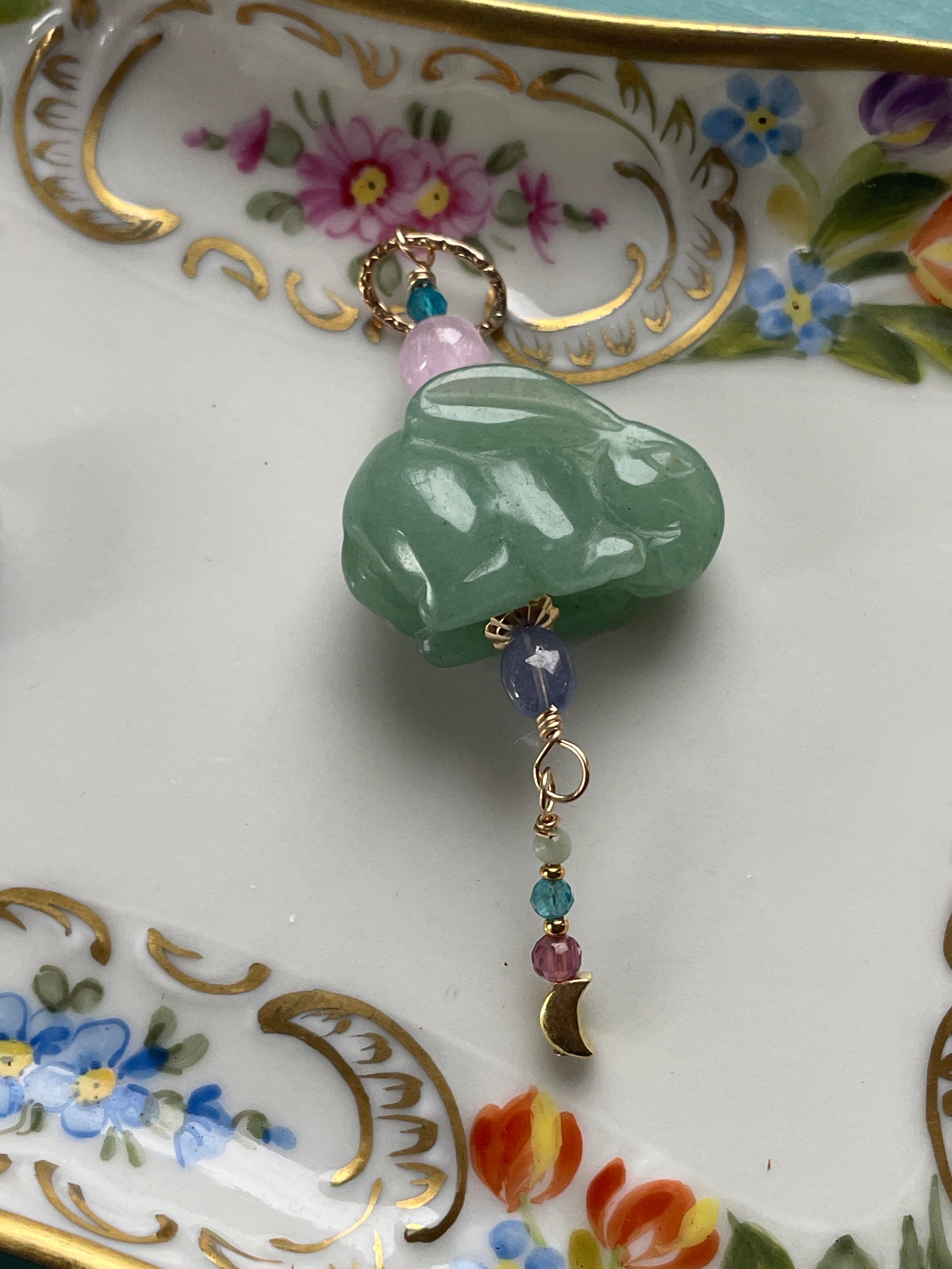 Jade Rabbit Talismanic Pendant - Moon Drop - Kunzite, Garnet, Jade, Apatite and Tanzanite- Gold Filled - Handmade