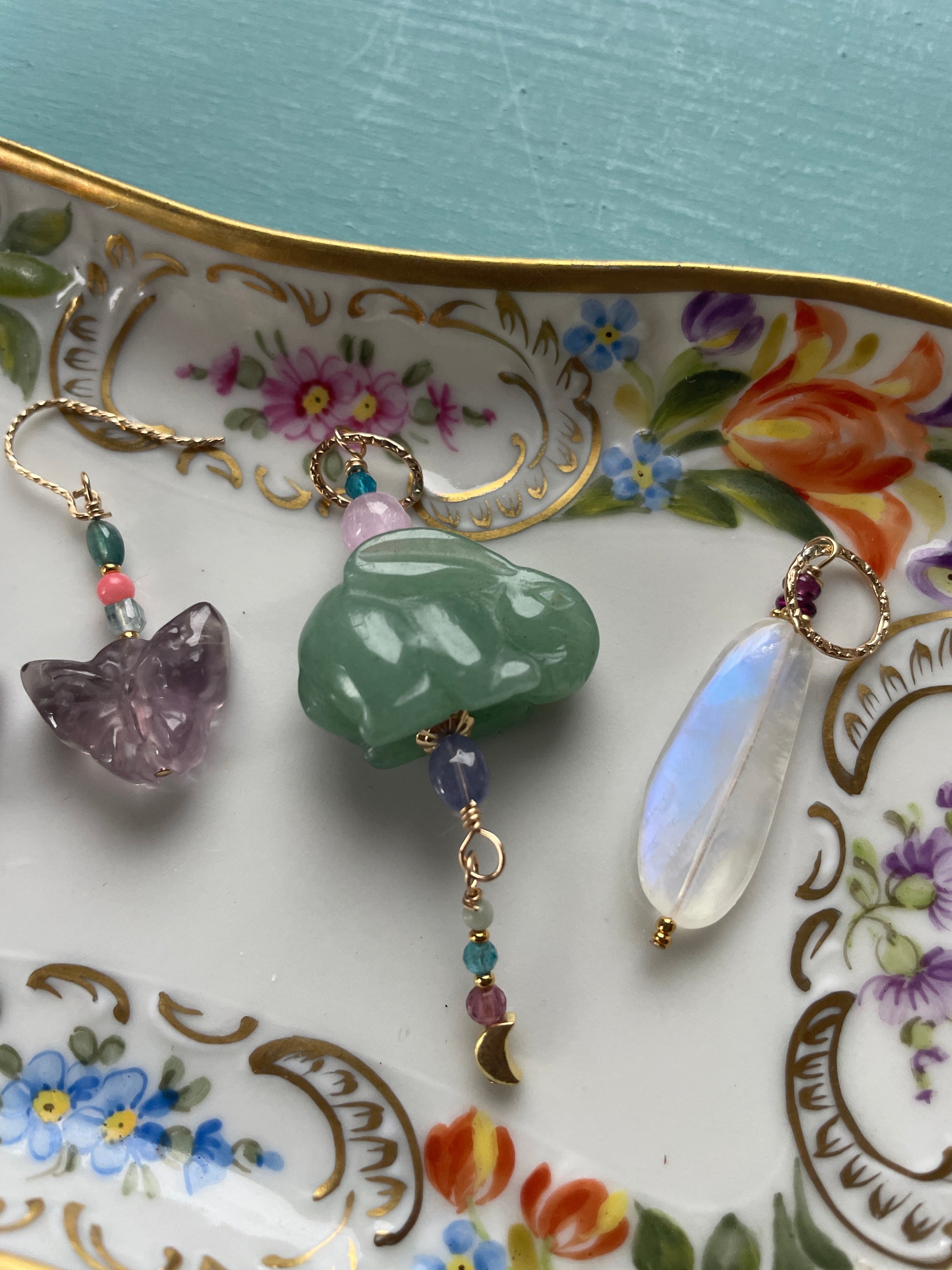 Fabulous vintage Jade Rabbit has been paired with luminous gemstones including Kunzite, Apatite, Jade, Garnet and Tanzanite.  All findings including Moon drop are gold filled.  Pendant measures just under 2.5 inches.  Has a large gold filled loop at the top to accommodate a large chain.