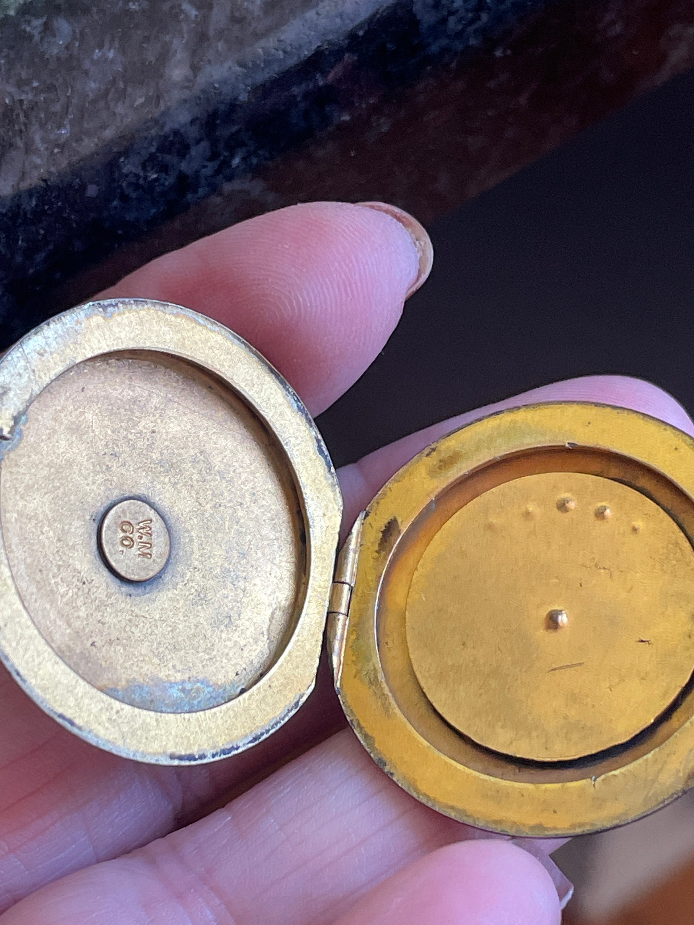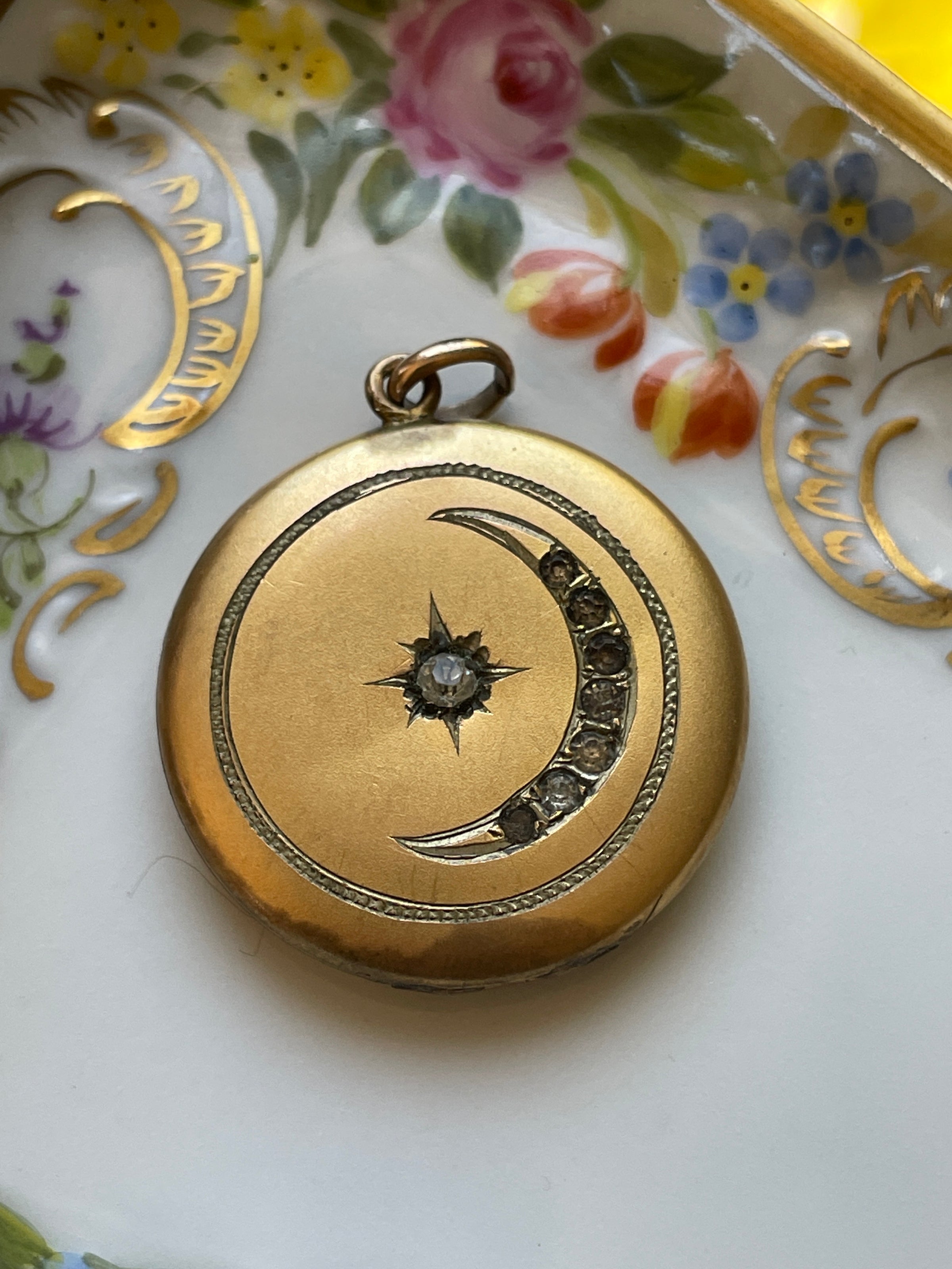 Gorgeous rare Victorian Moon Star locket measuring approx 1 inch and 1.5 inches with top loop. Circa early 1900’s. Stamped WM Co. No frames present. Locket closes but does not snap shut. Some darkening of gold at bottom and darkened paste stones but good condition for a locket over 100 years old.