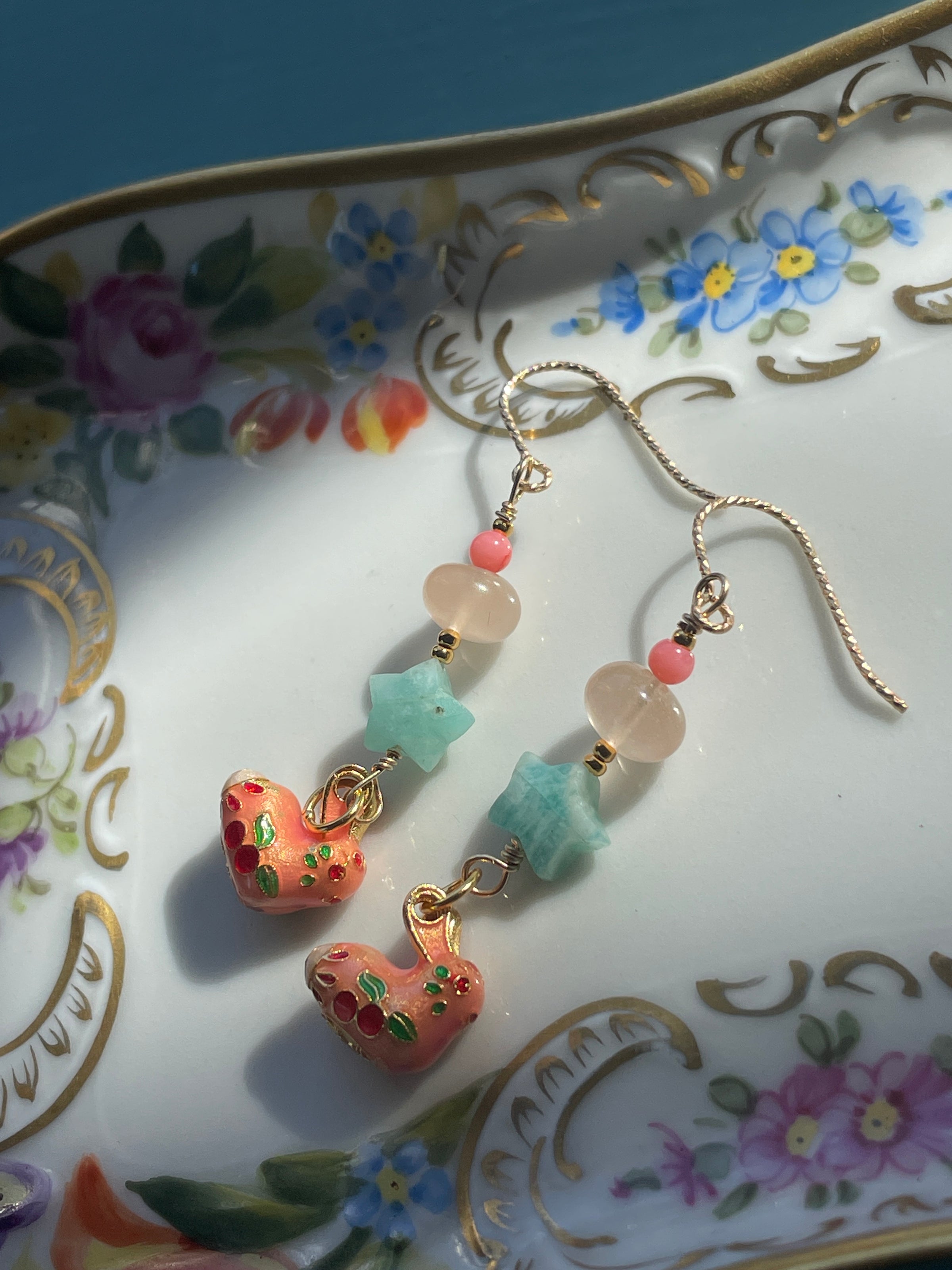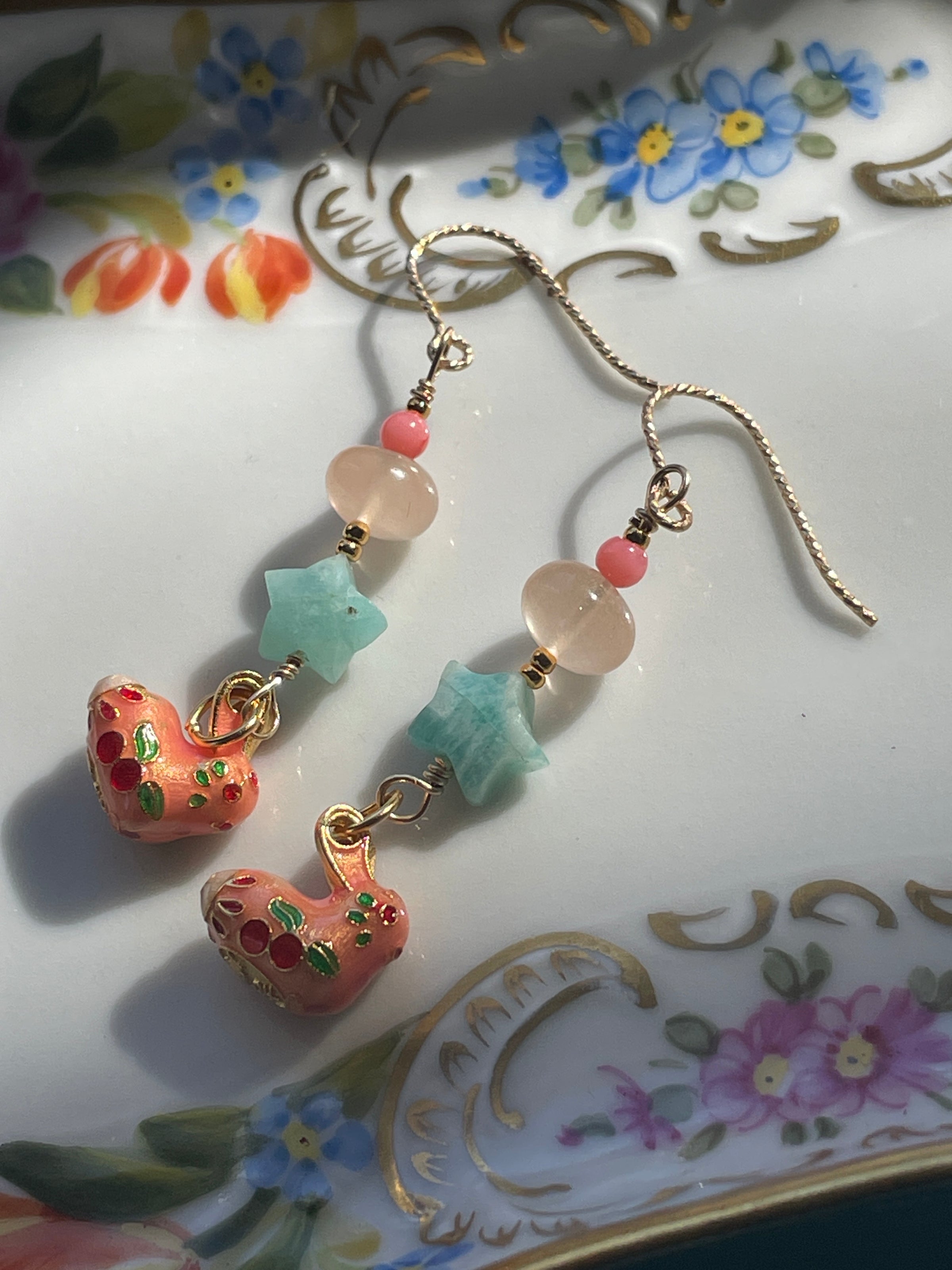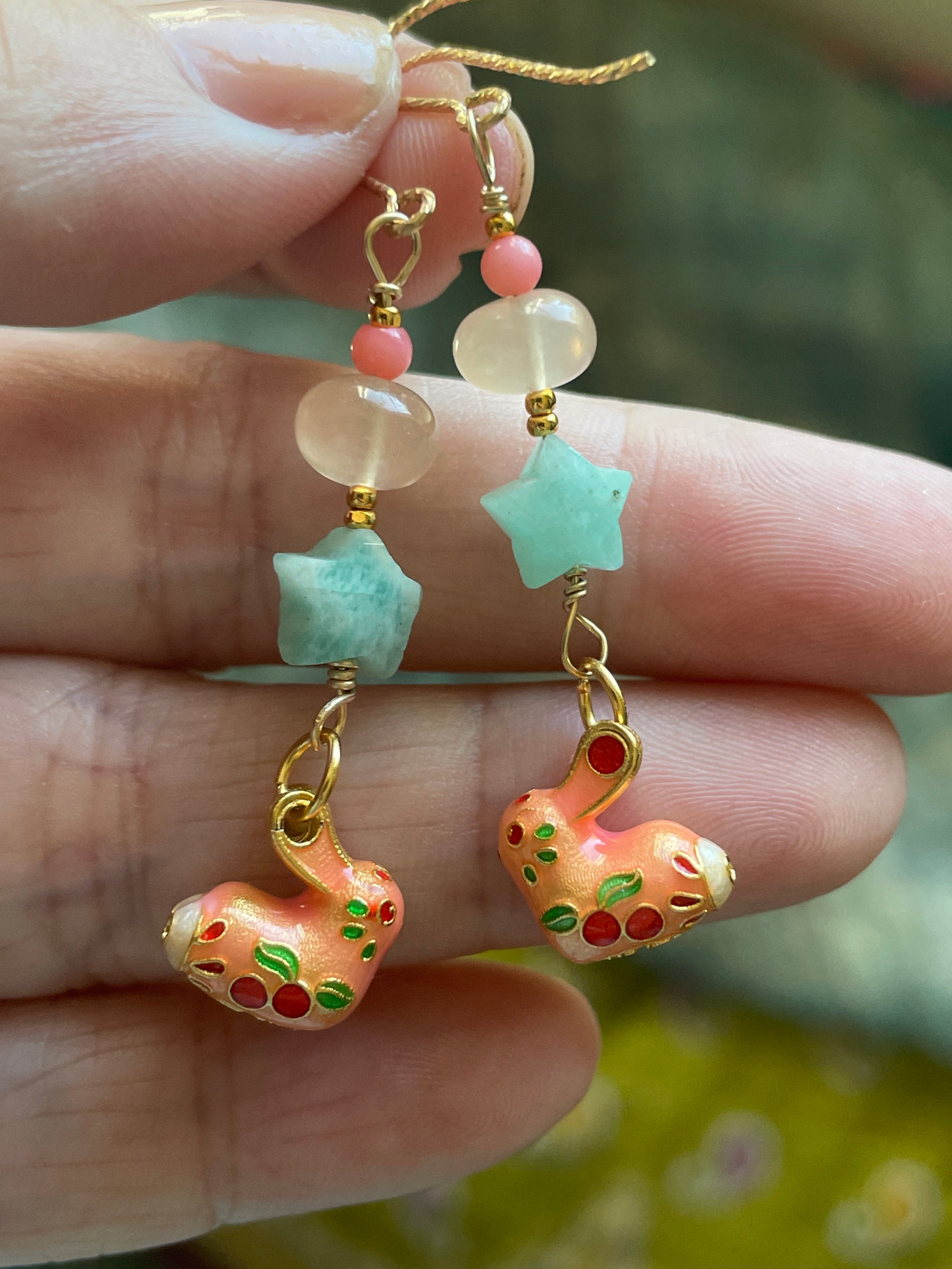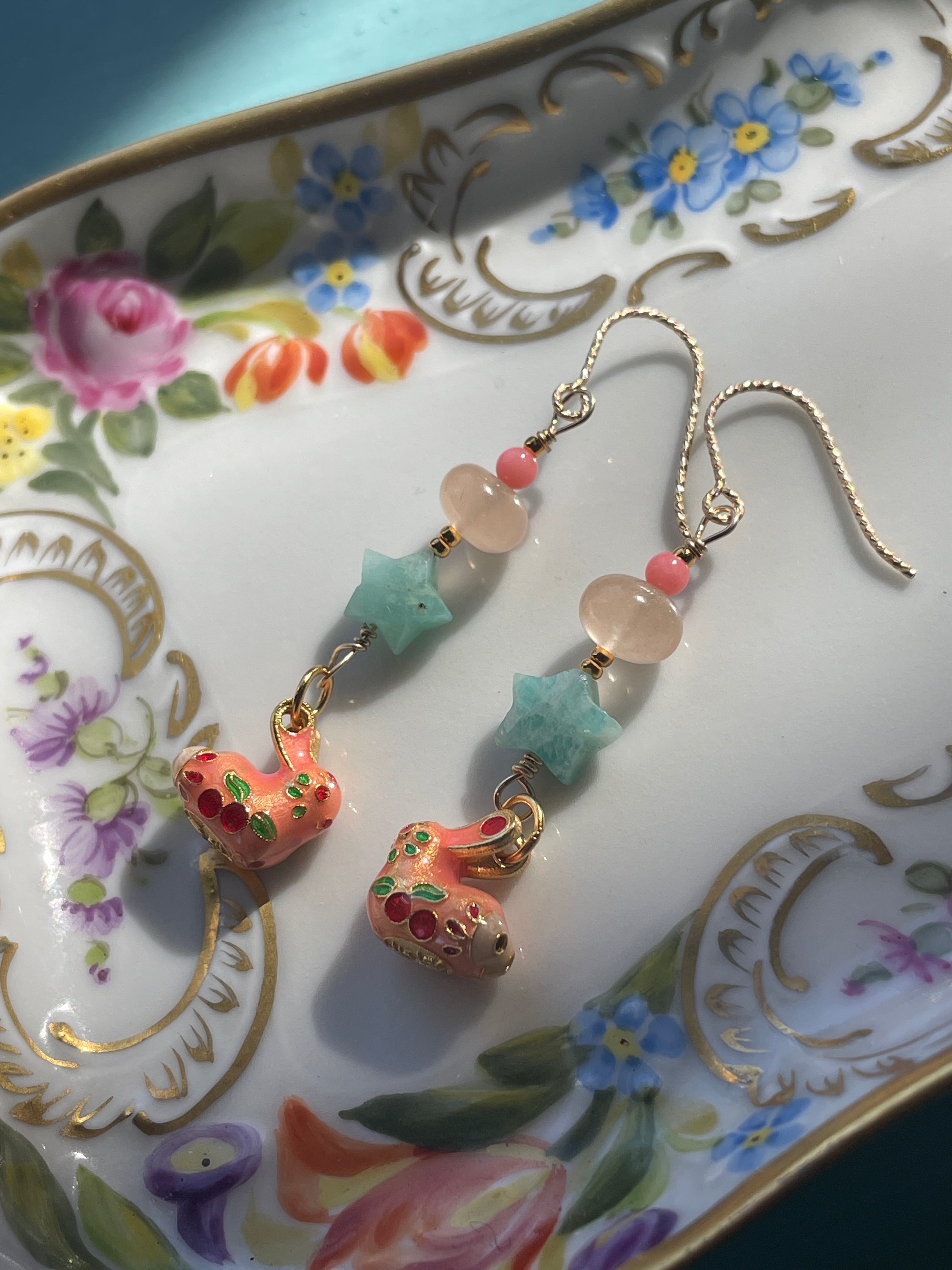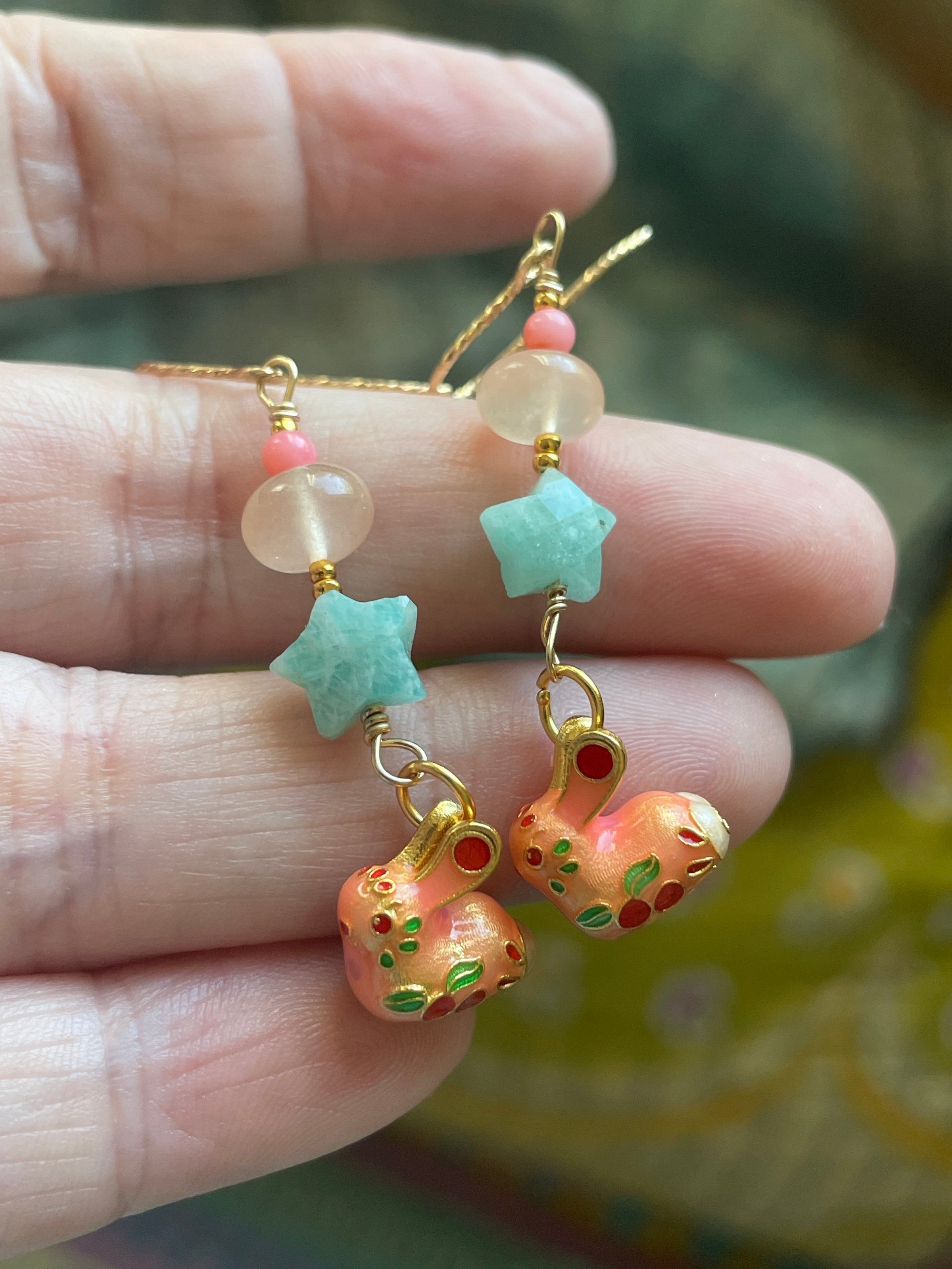 Delicate Rabbit earrings with cloisonne Rabbit drops decorated with cherries paired with Amazonite Stars, Peach Moonstone and Coral. All findings are gold Filled. These measure just under 2 inches. Note one is a tiny bit longer than the other as they are handmade.
