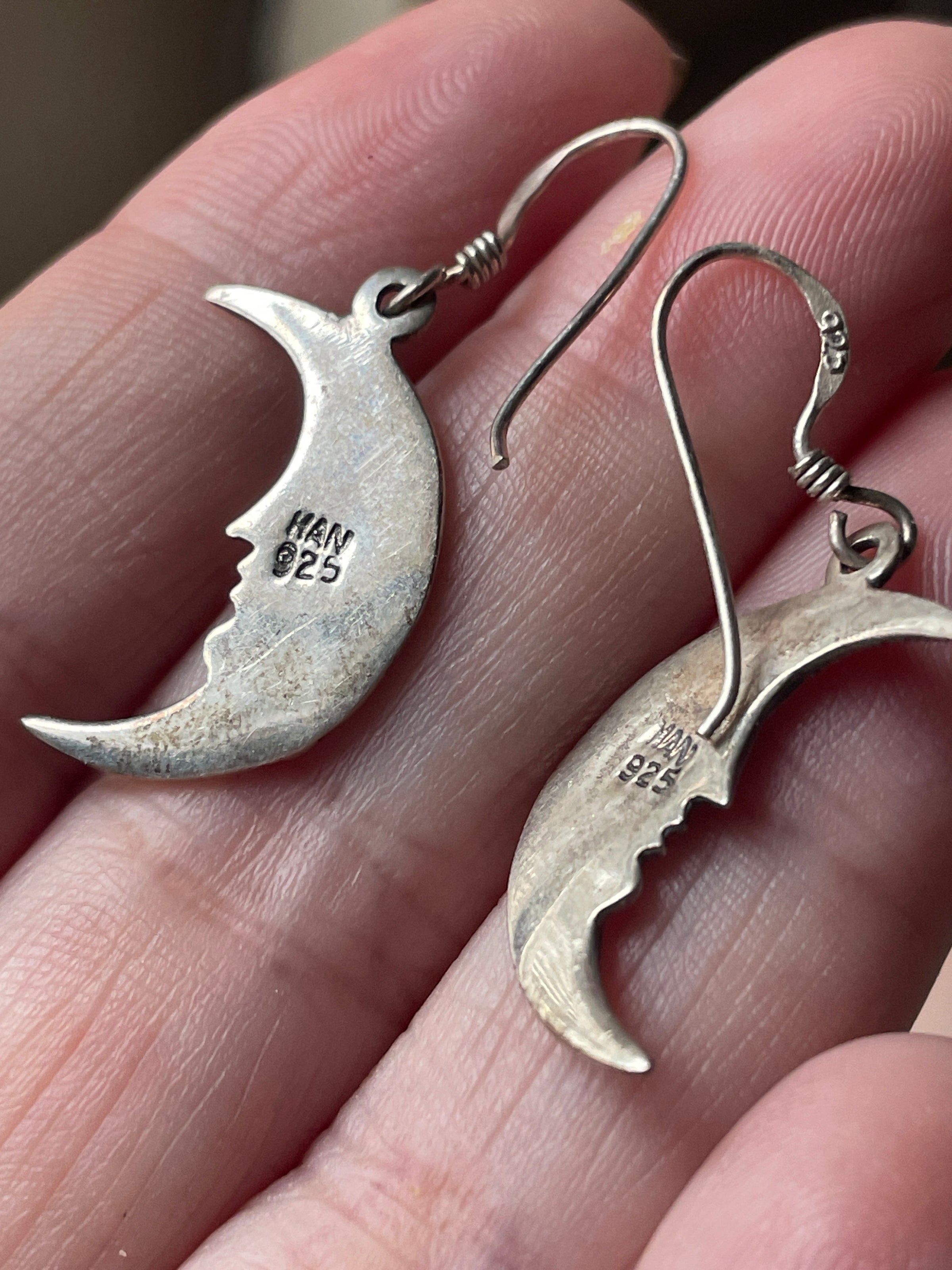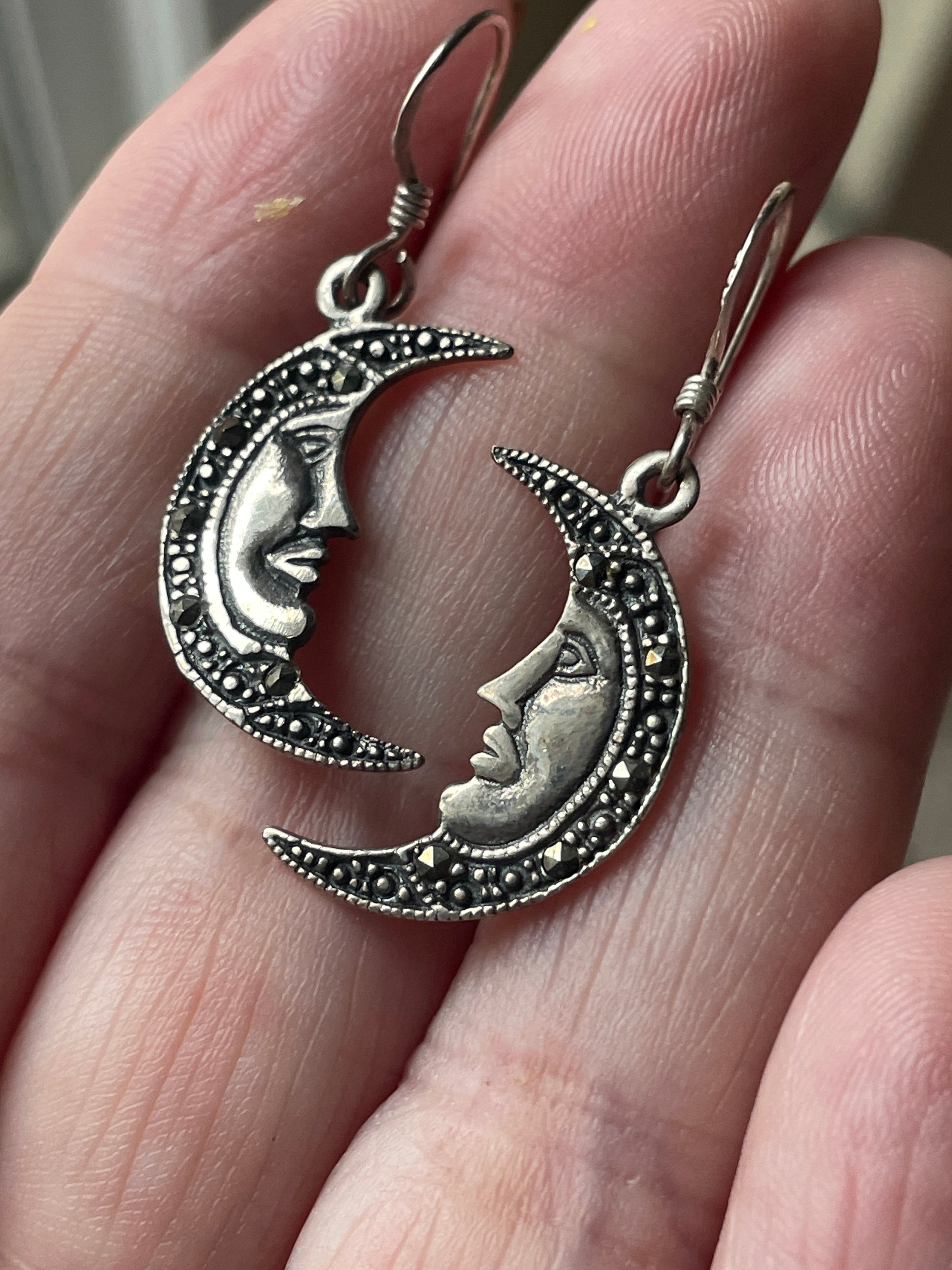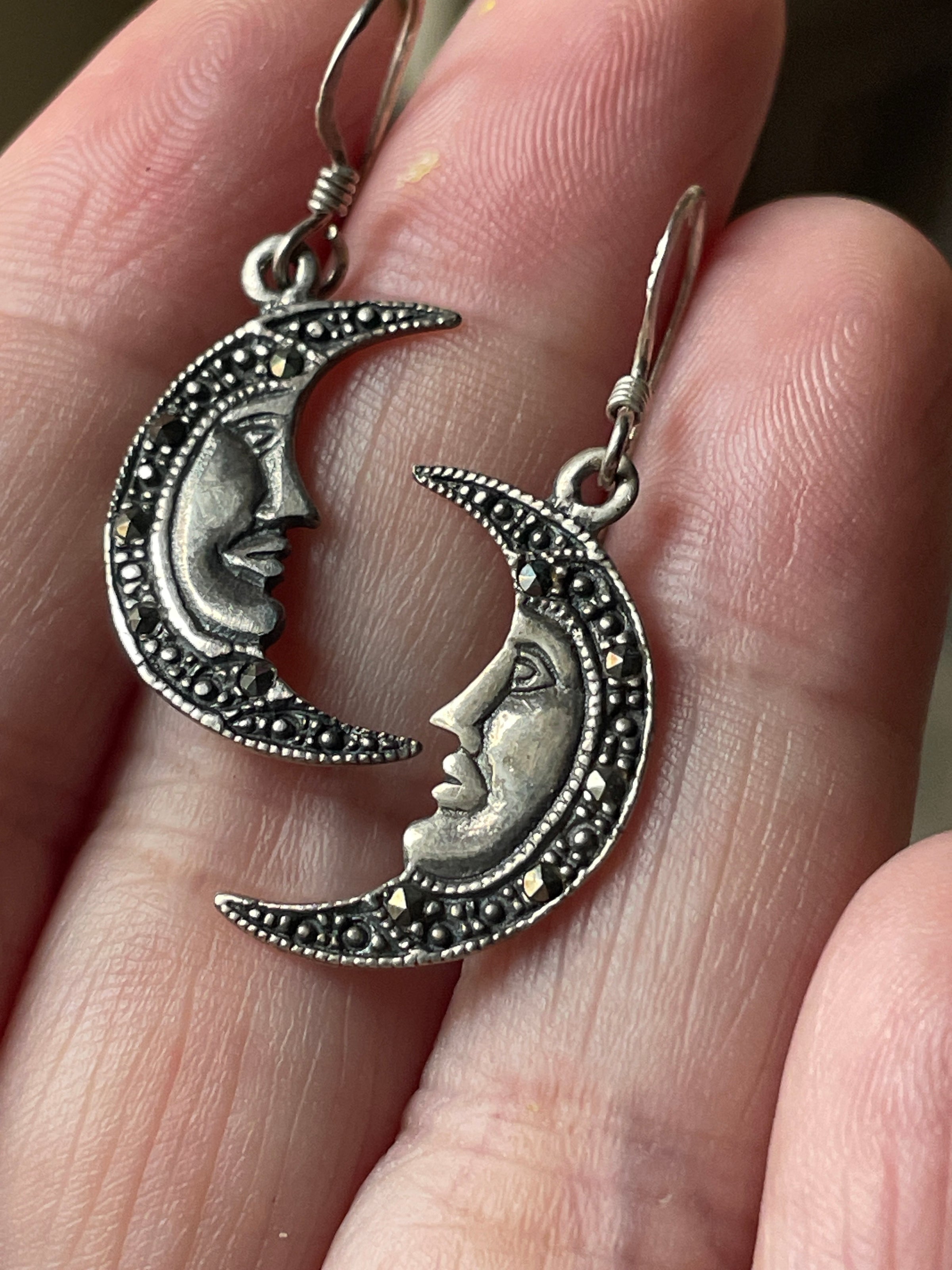 Lovely vintage Marcasite Moon earrings in sterling silver. These measure just over 1.25 inches with earwires. Stamped 925 on earrings and earwires.
