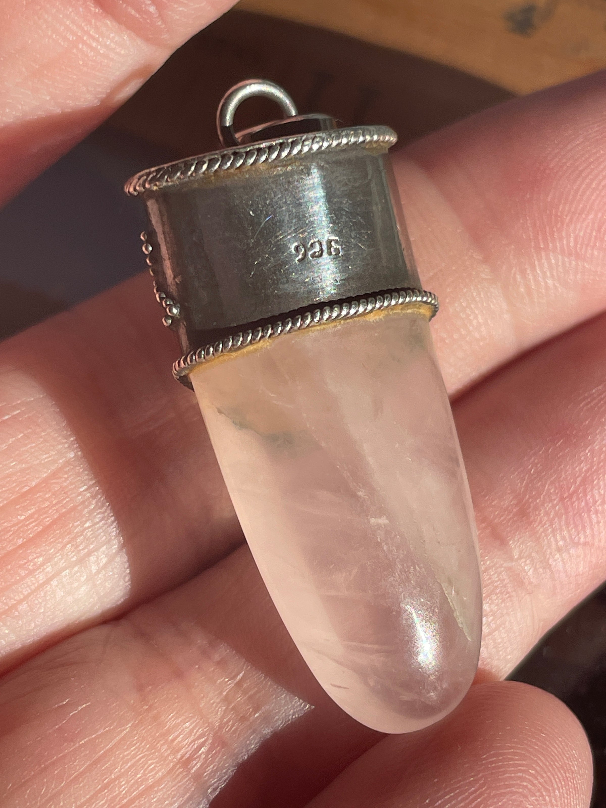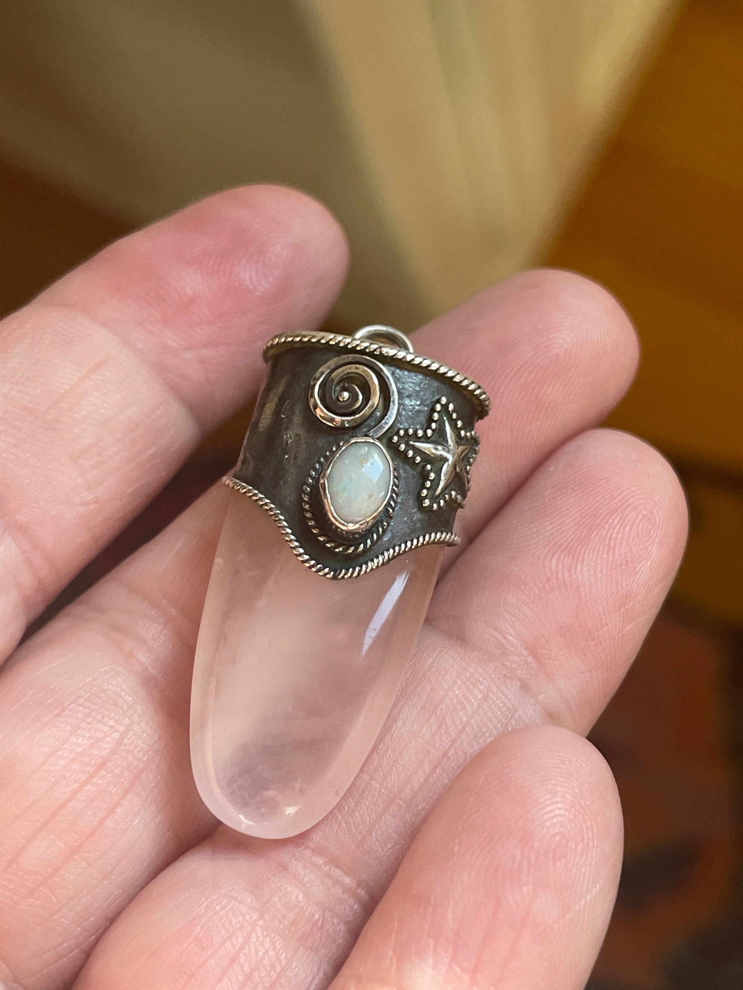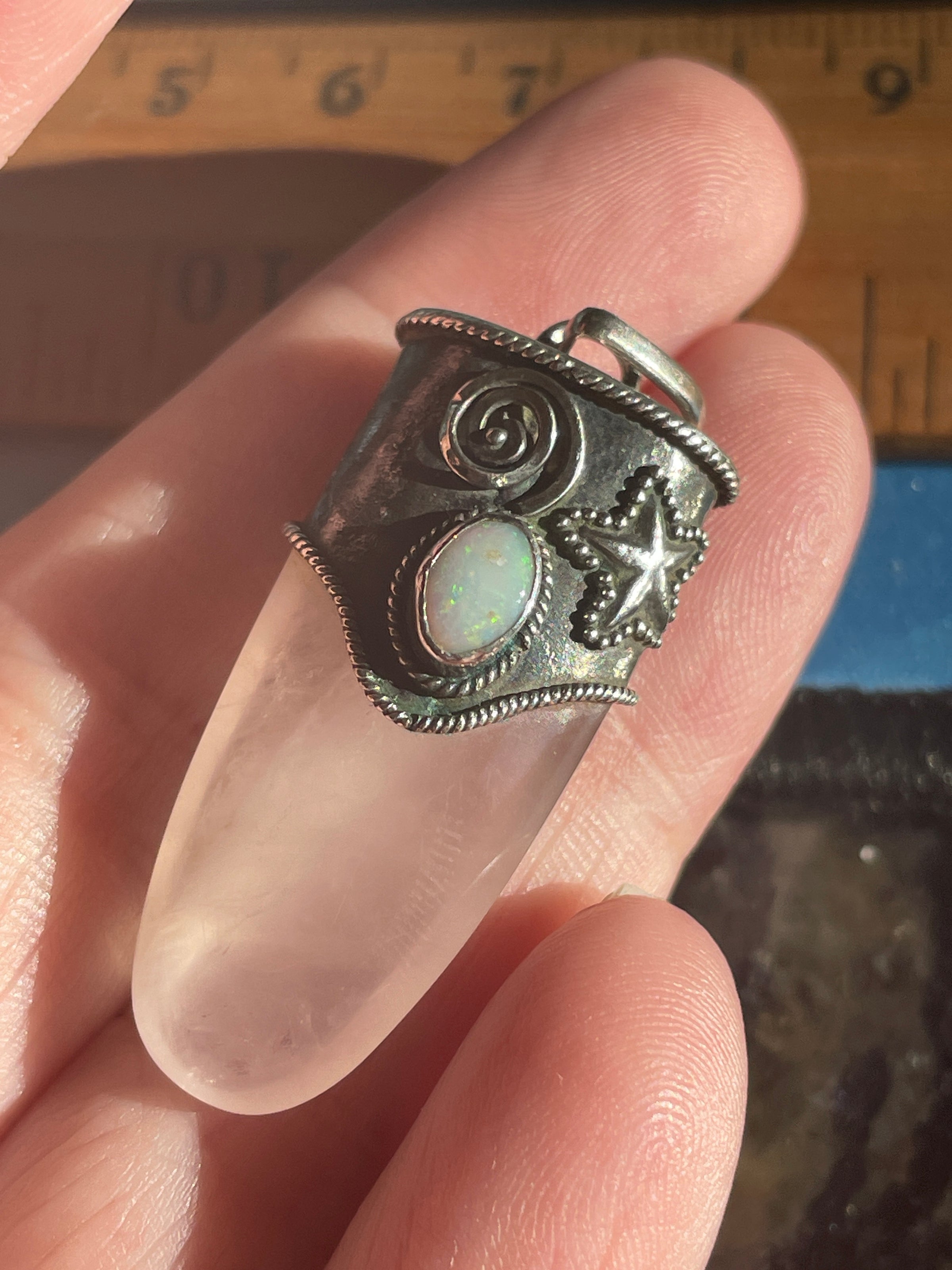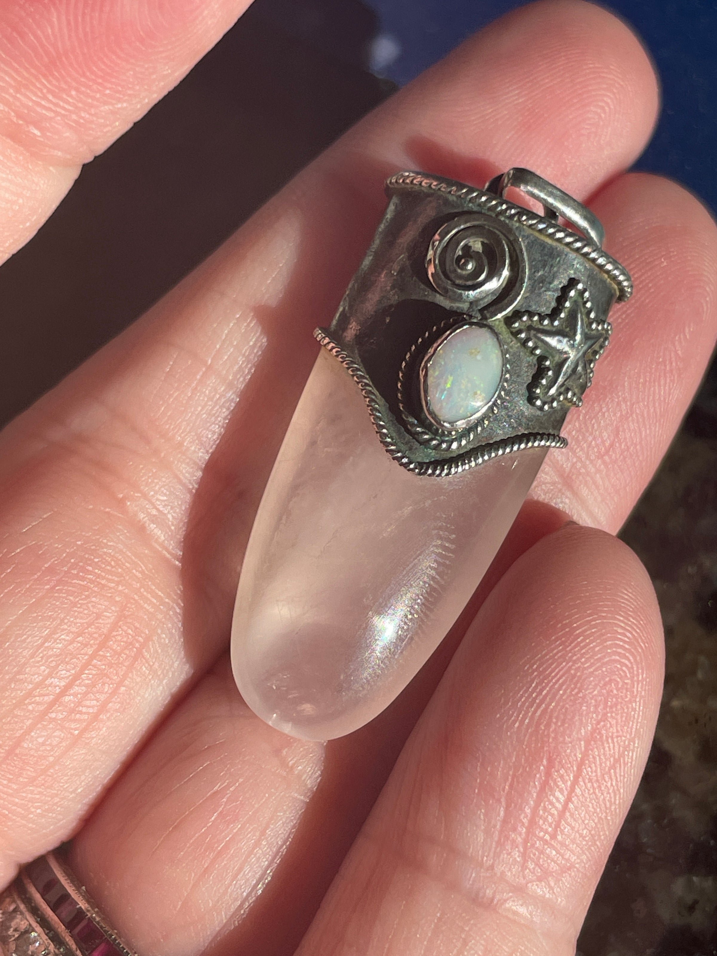 Stunning Rose Quartz pendant with Opal accent and sterling Celestial design including Star and swirl. Opal has subtle fire and you get a flash of color in certain lights. Stamped 925 on back for sterling. Measures approx 1.75 inches long (with bail) x just over 0.5inches.