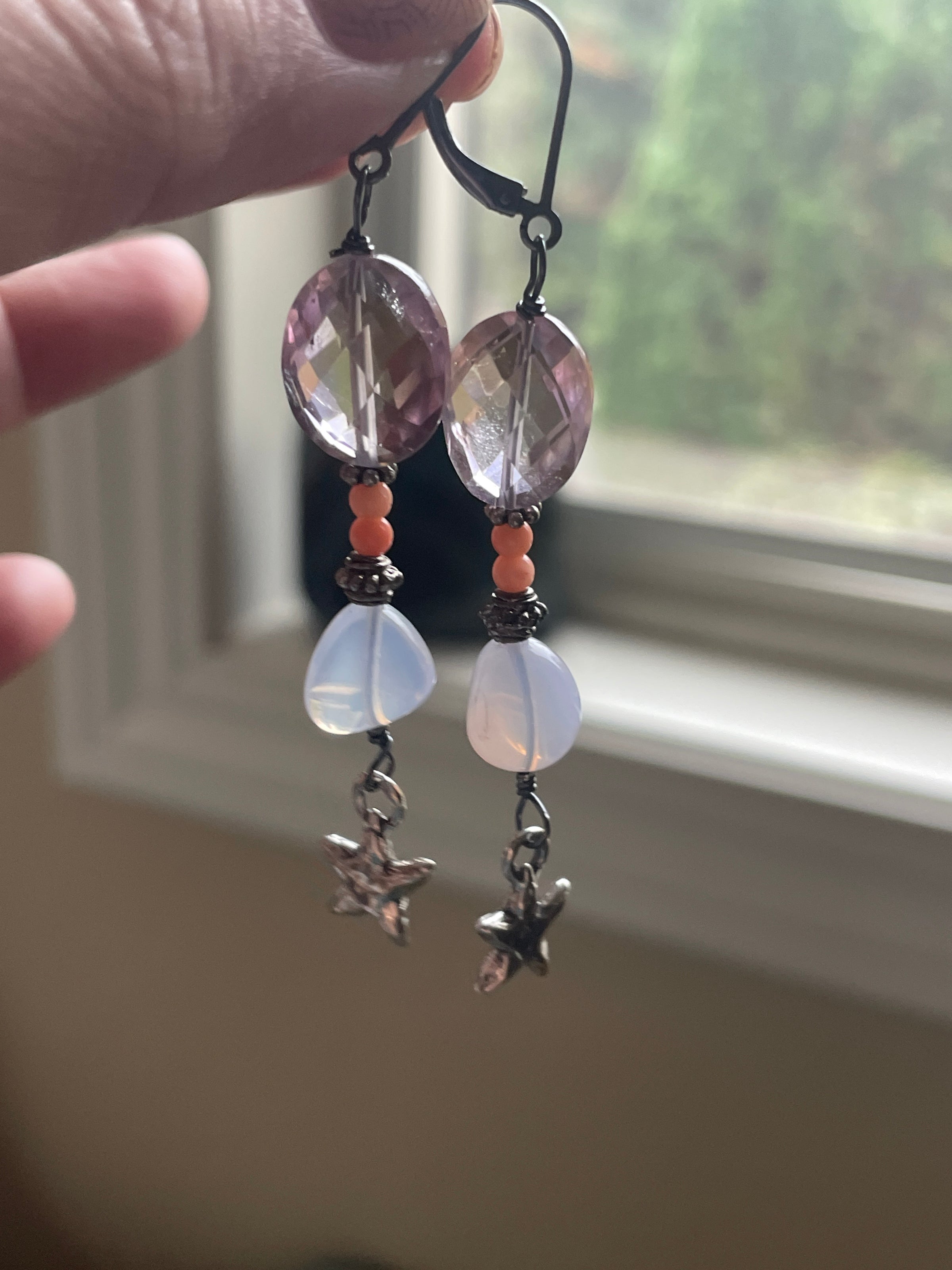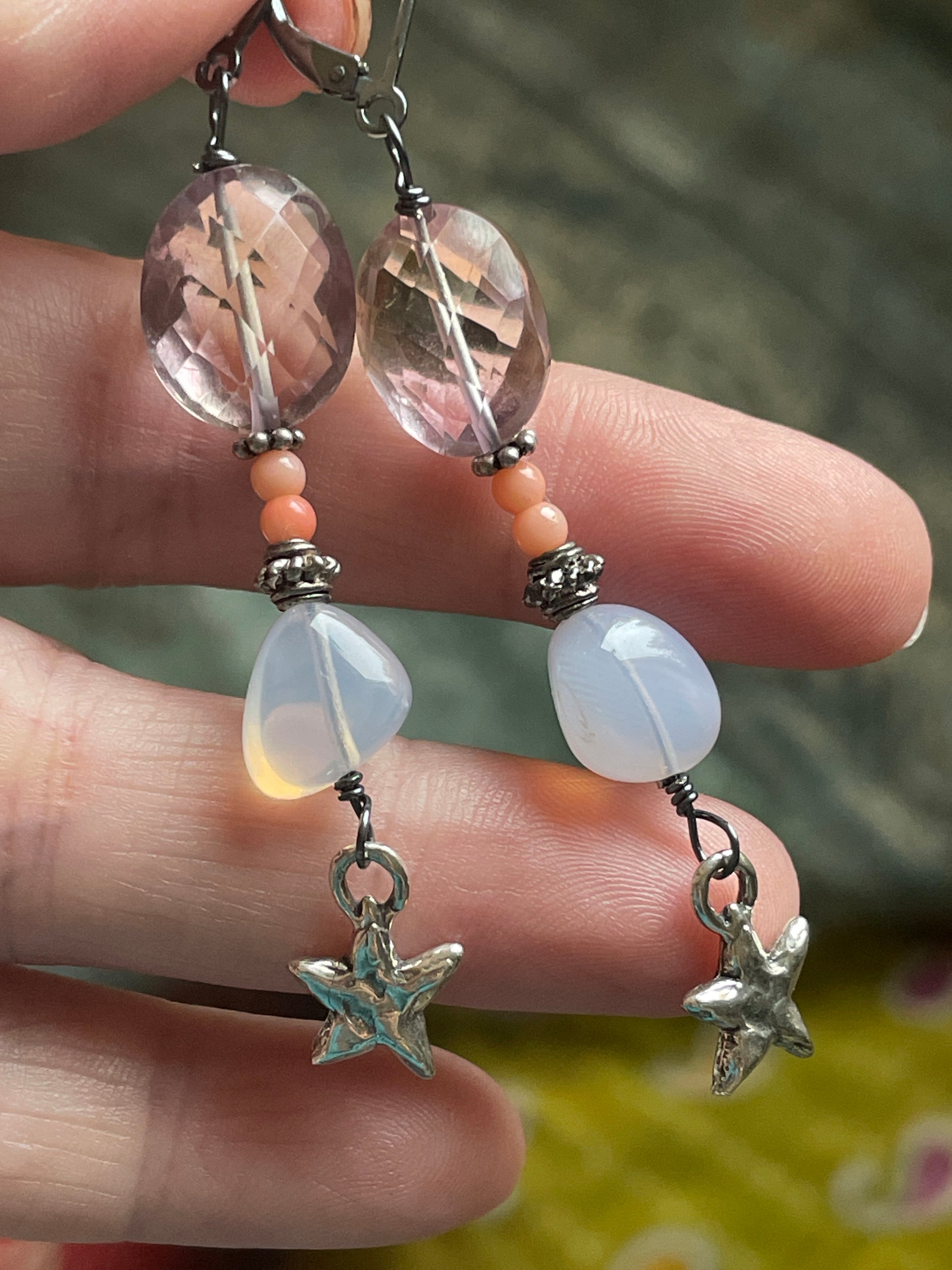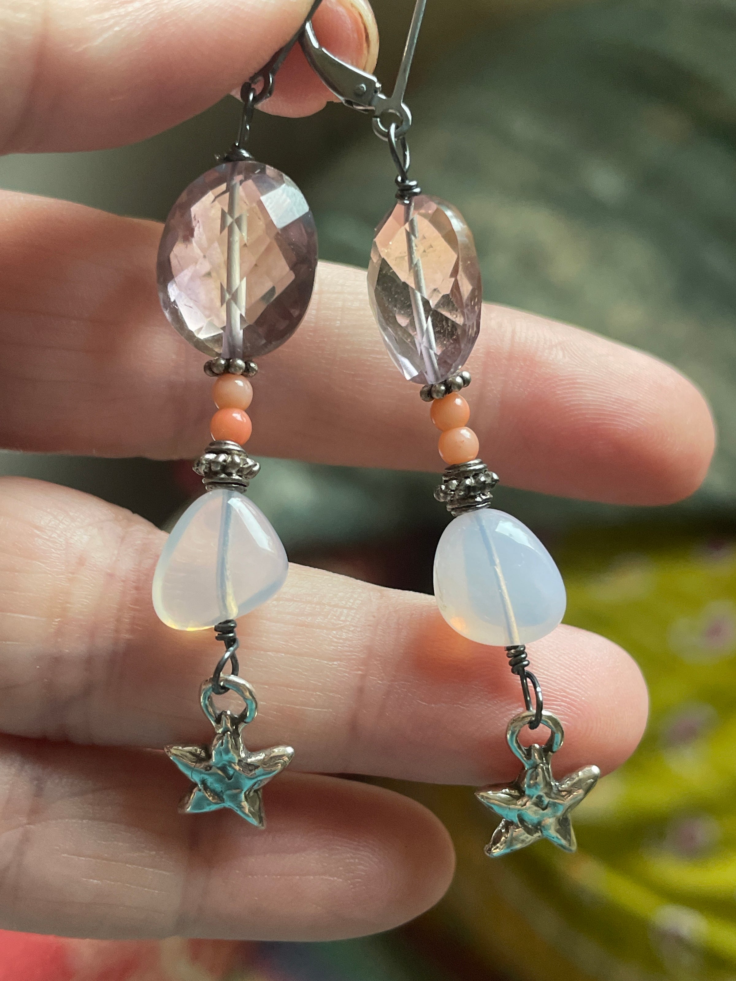 Gorgeous Celestial earrings with Ametrine, Coral and rare Lavender Moon Quartz. All findings are sterling silver. These measure approx 2.25 inches.