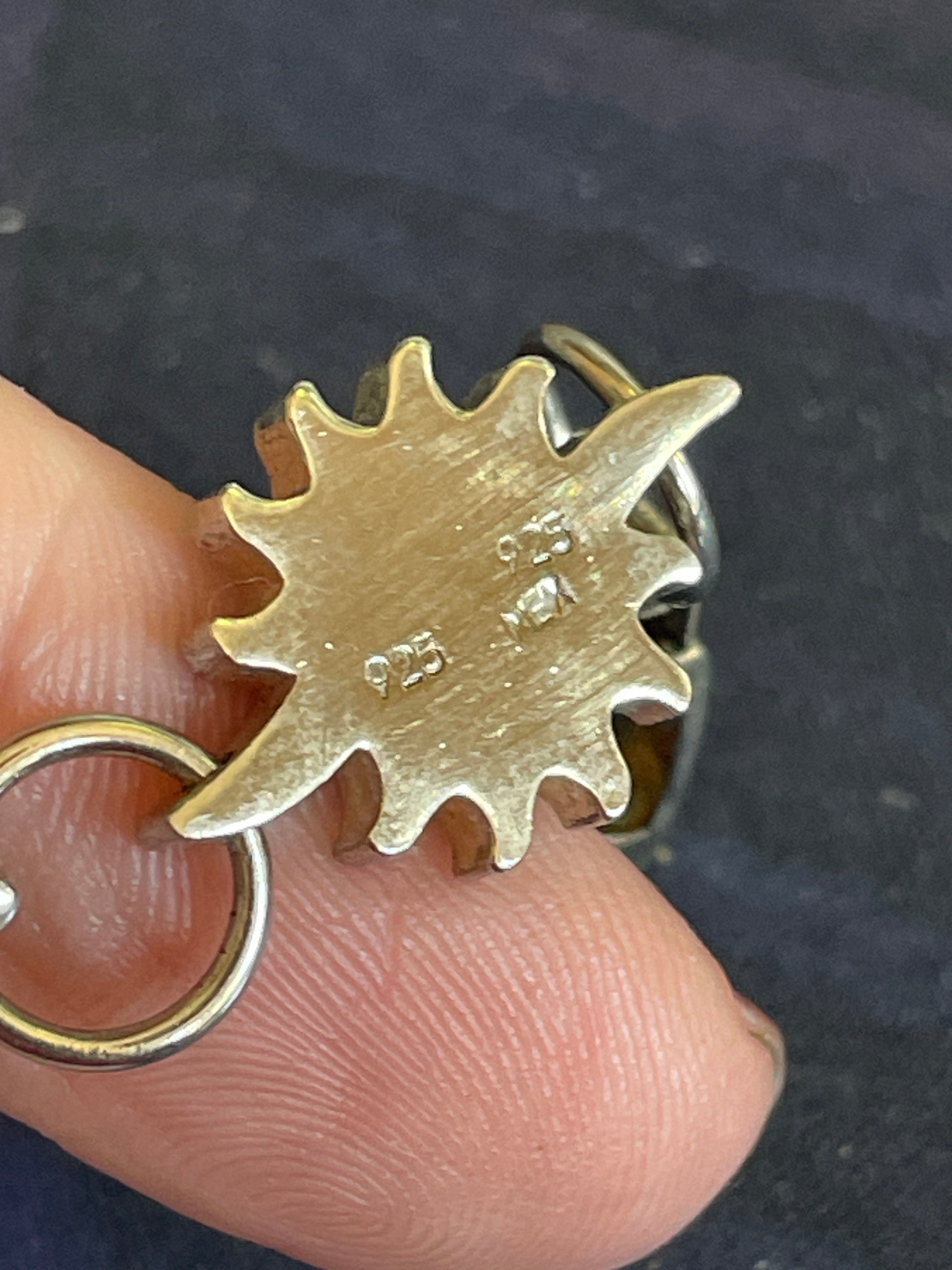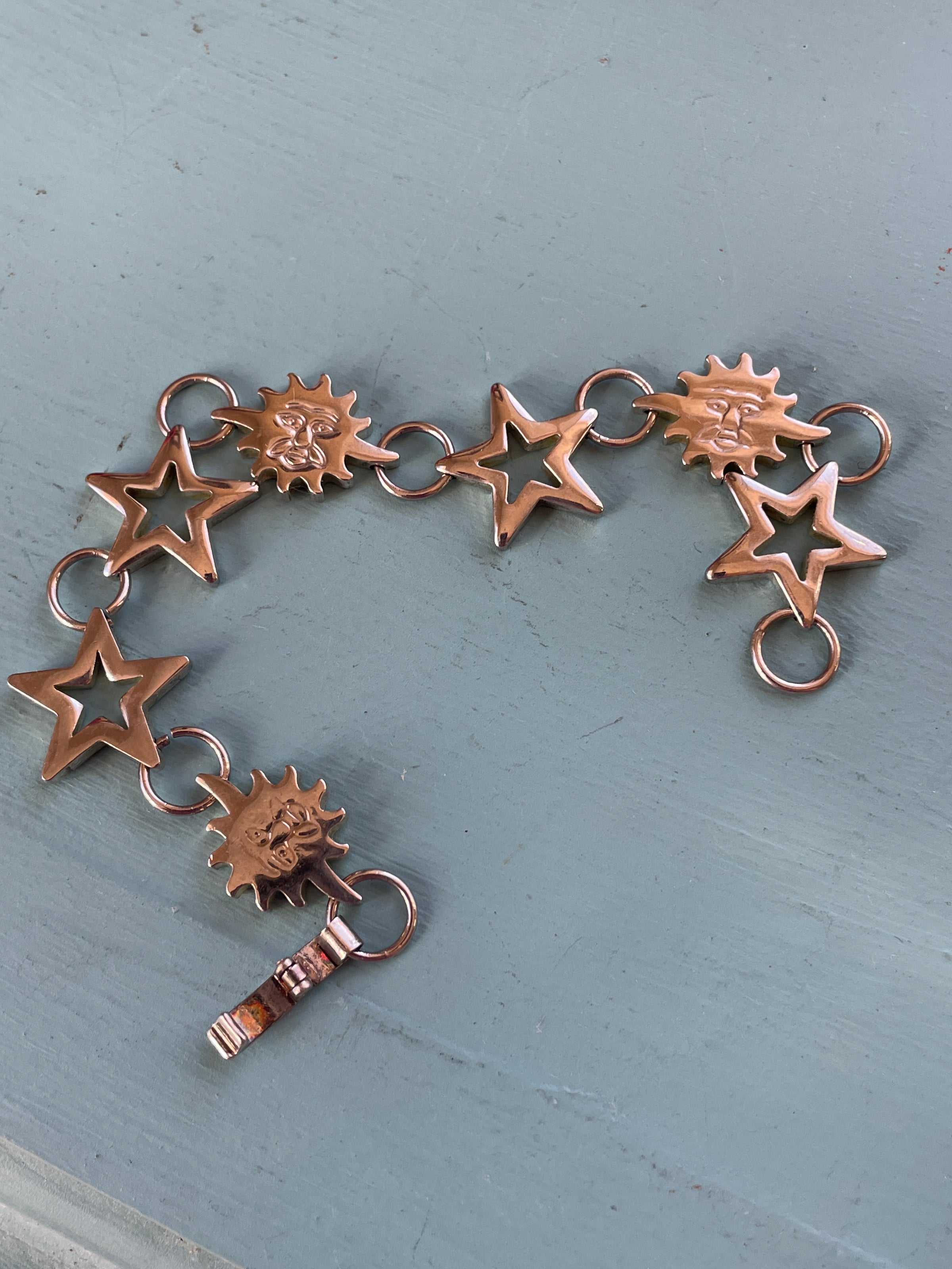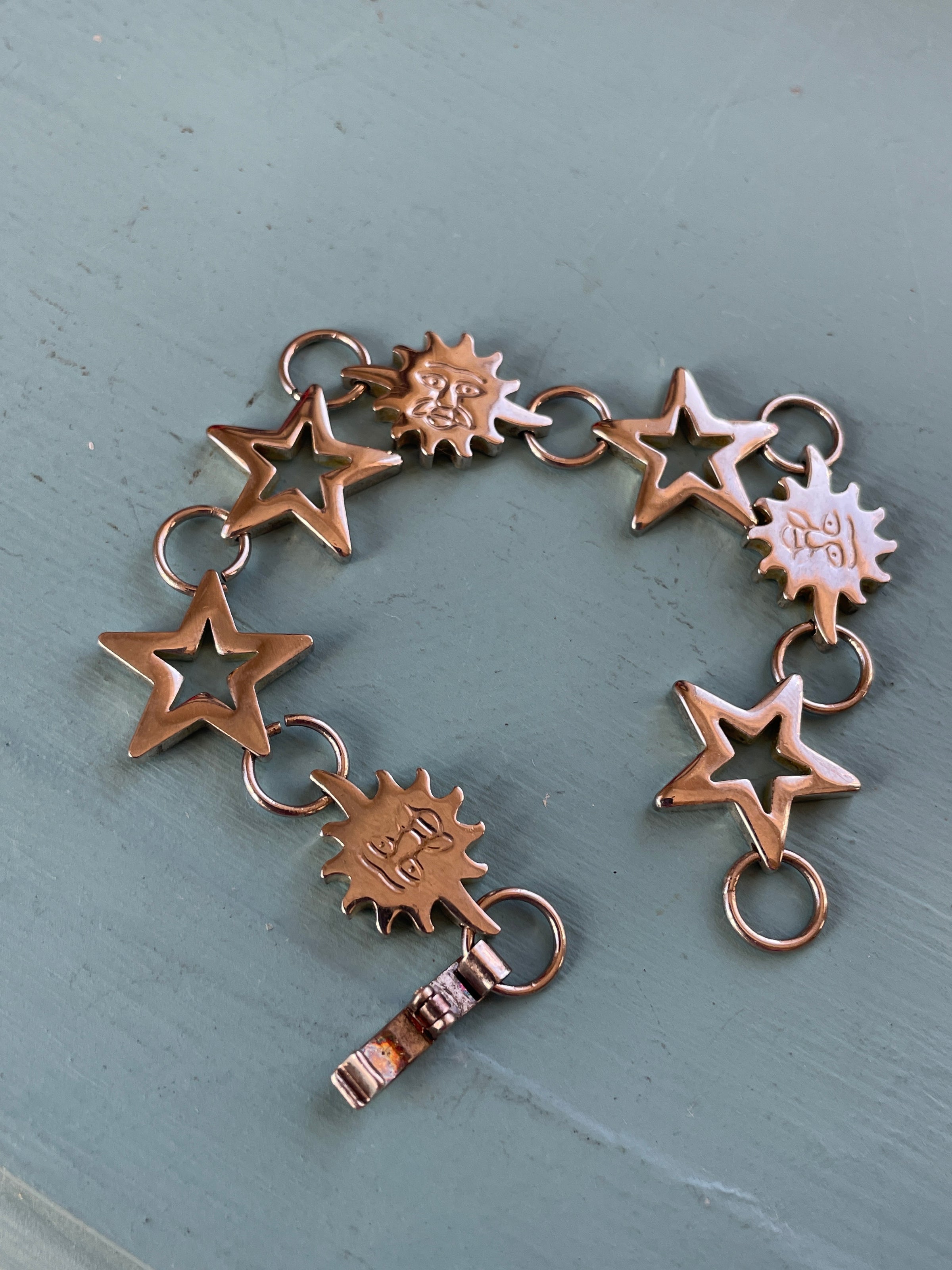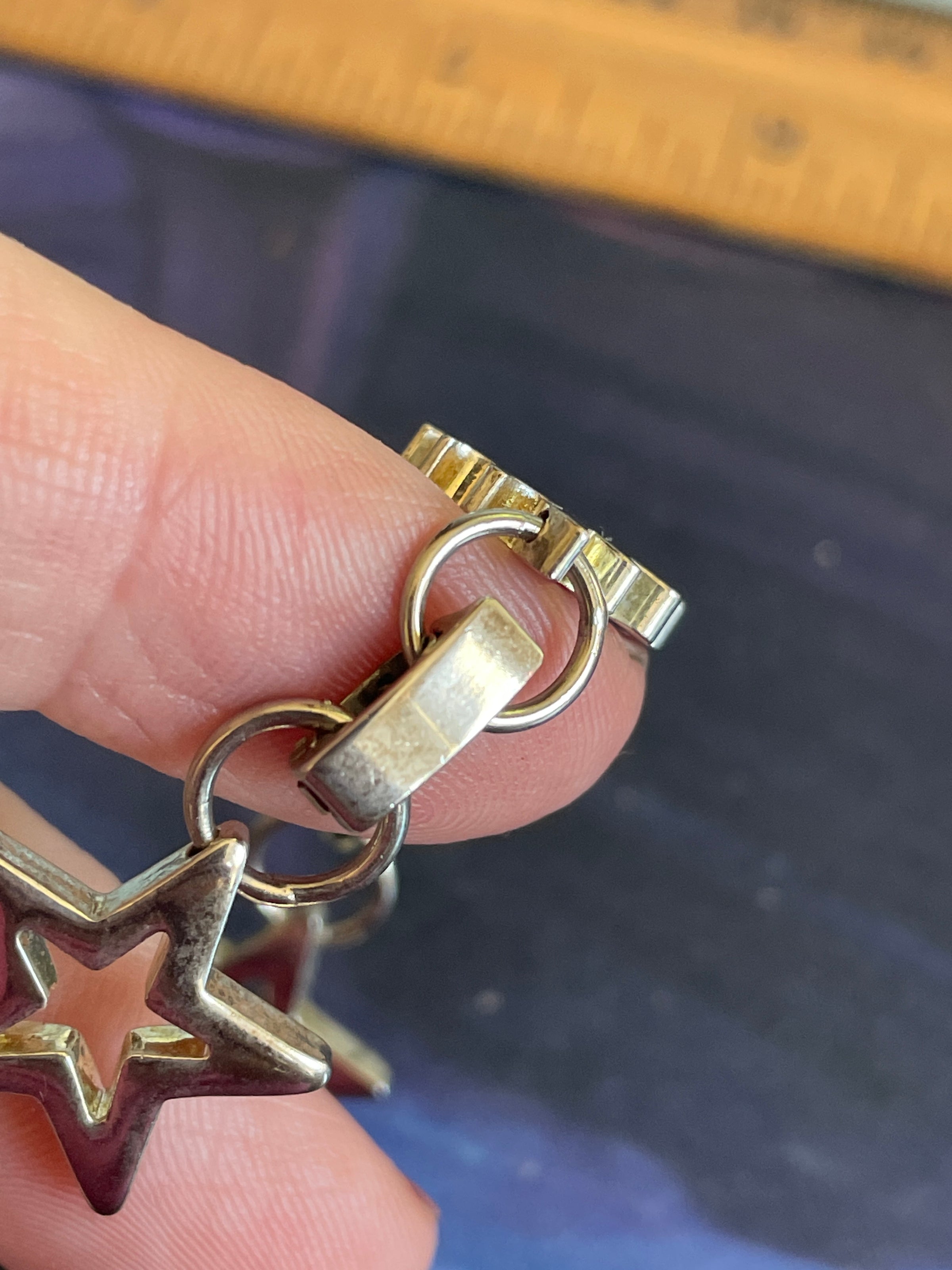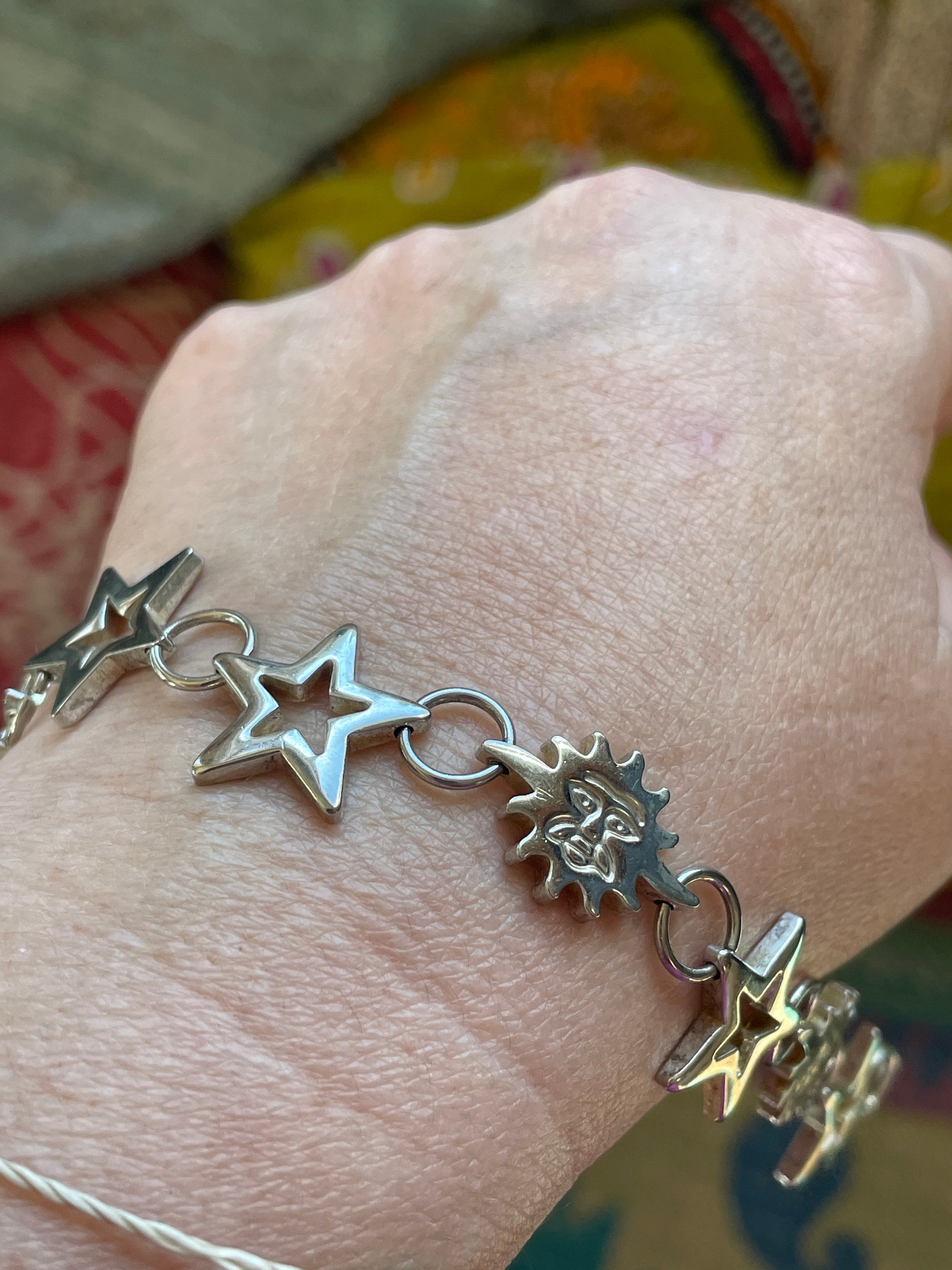 Stunning well made Sun and Stars bracelet in sterling silver. Has thick beautiful links. Measures approx 6.25 inches so definitely fits a smaller wrist. Sun link stamped “925” and “Mexico.” Good heavy piece weighs 16 grams.