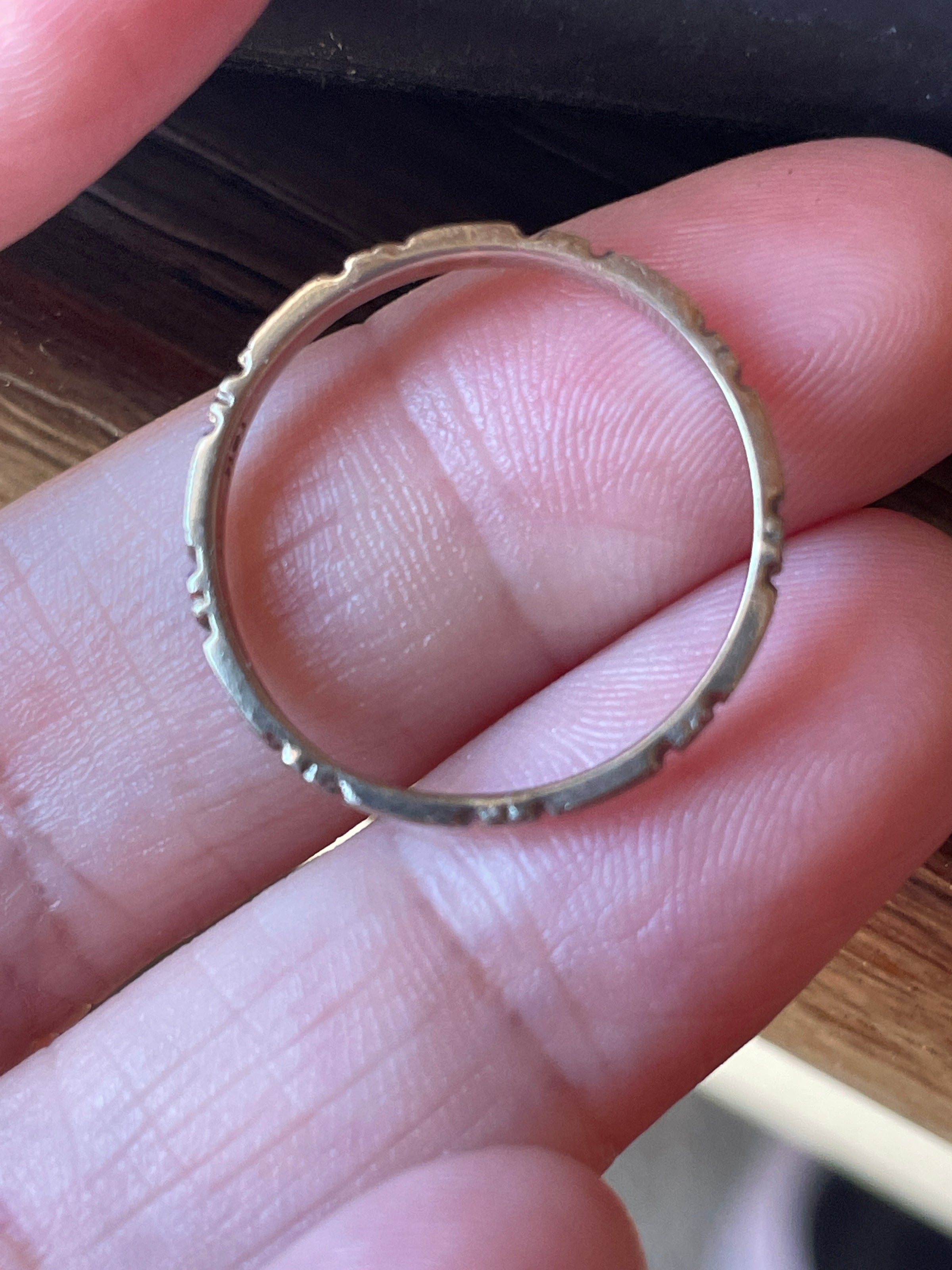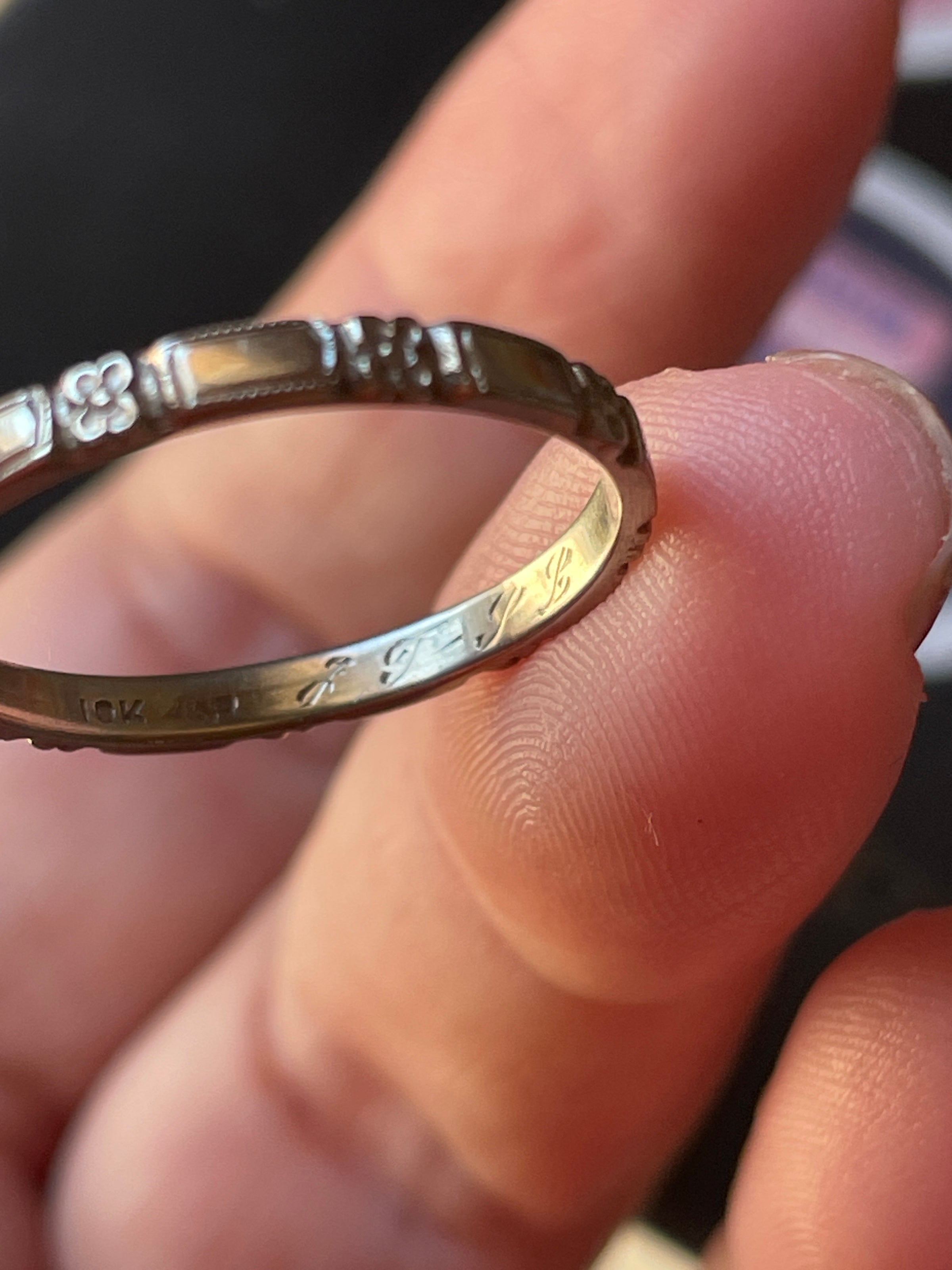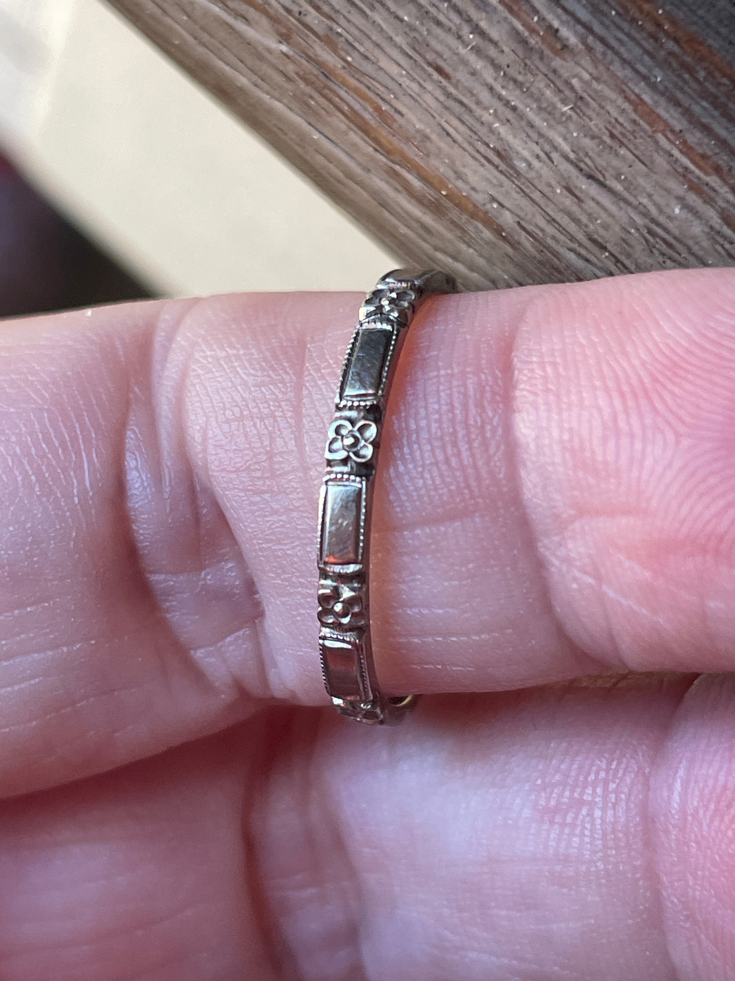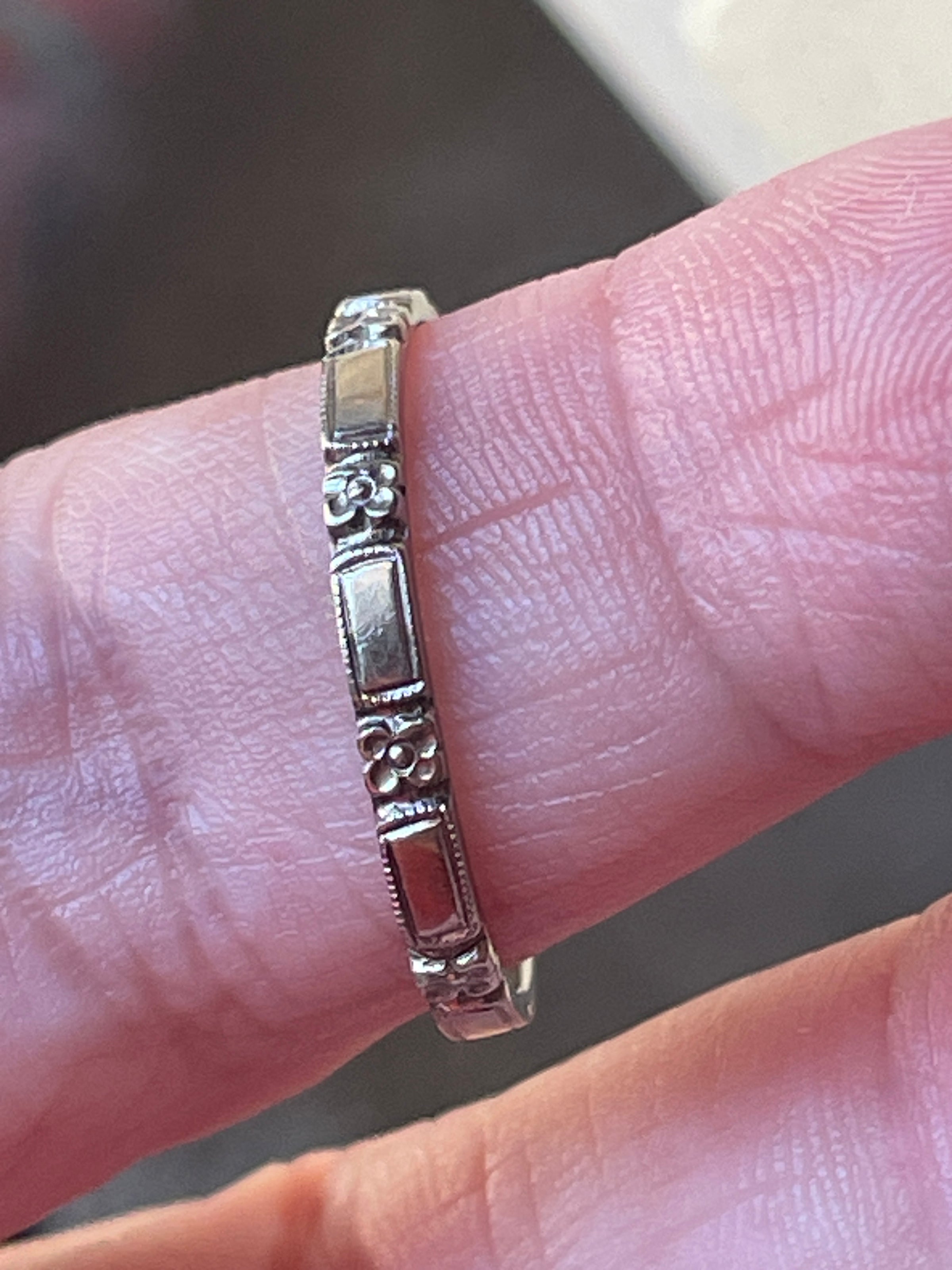 Beautiful vintage delicately ornate 10k white goLd flower band with design of flowers and rectangular sections. Classic band in great condition. Ring size = 7.75. Stamped 10k. Has beautiful initials engraved but they are hard to make out.
