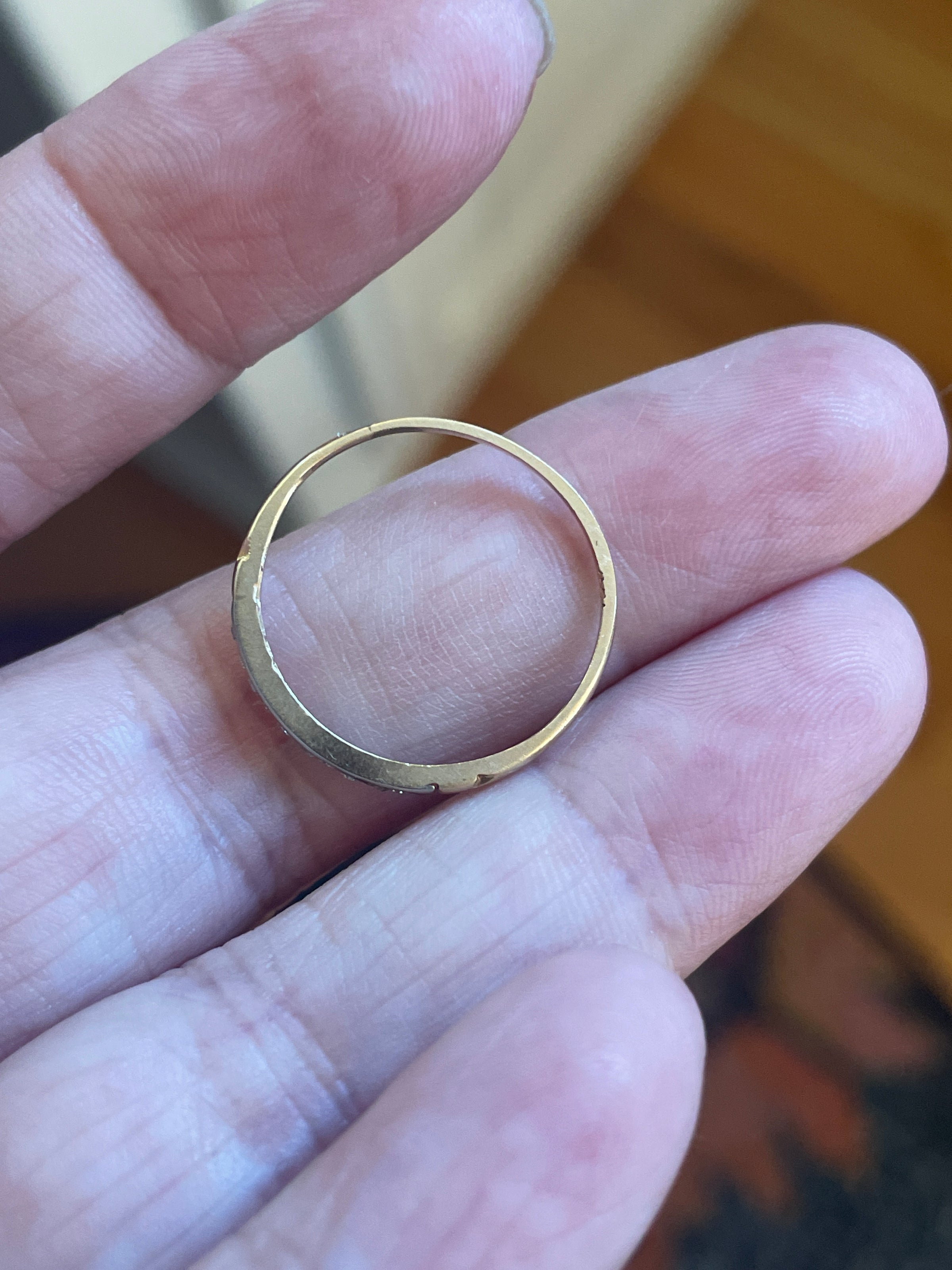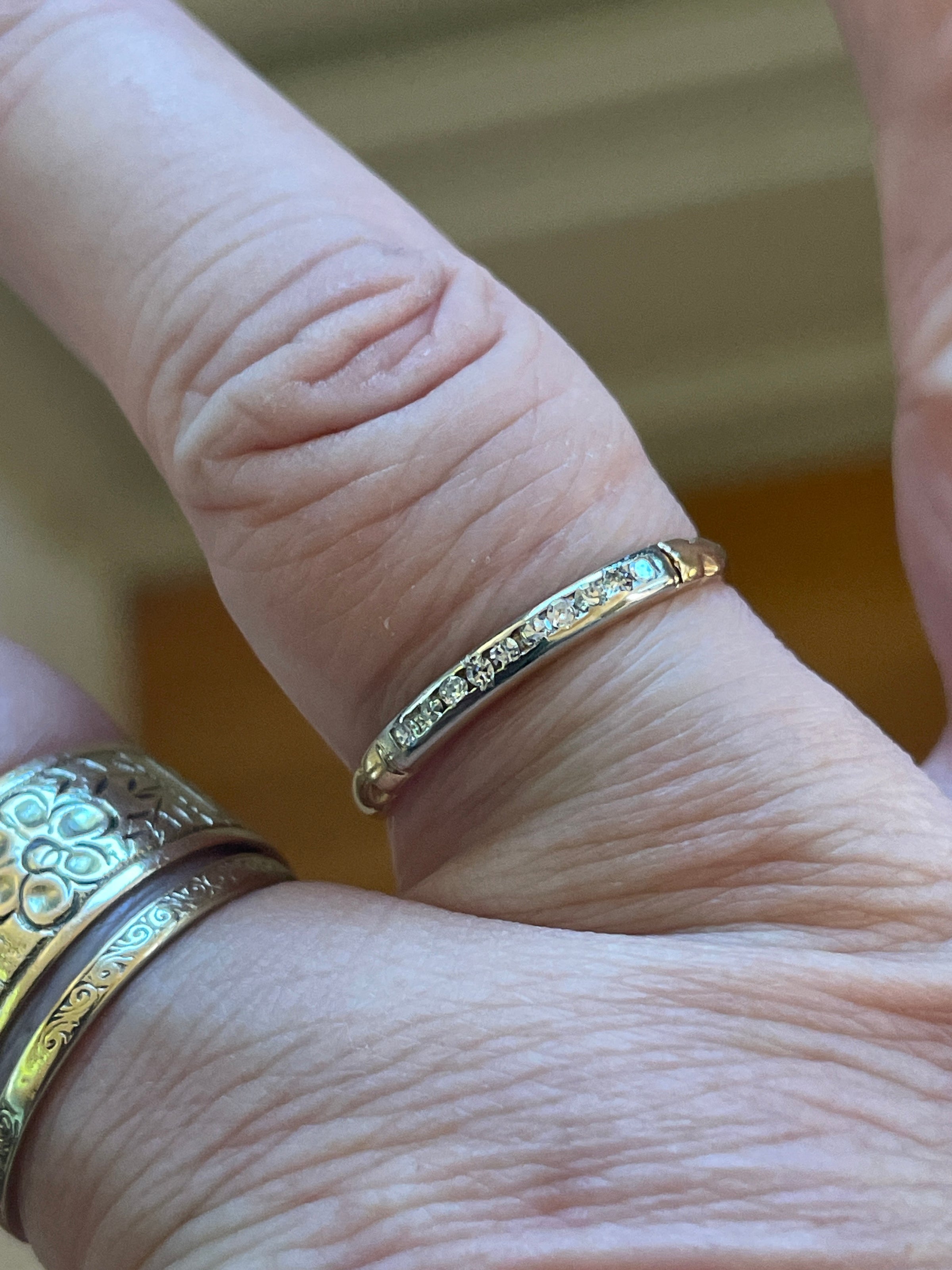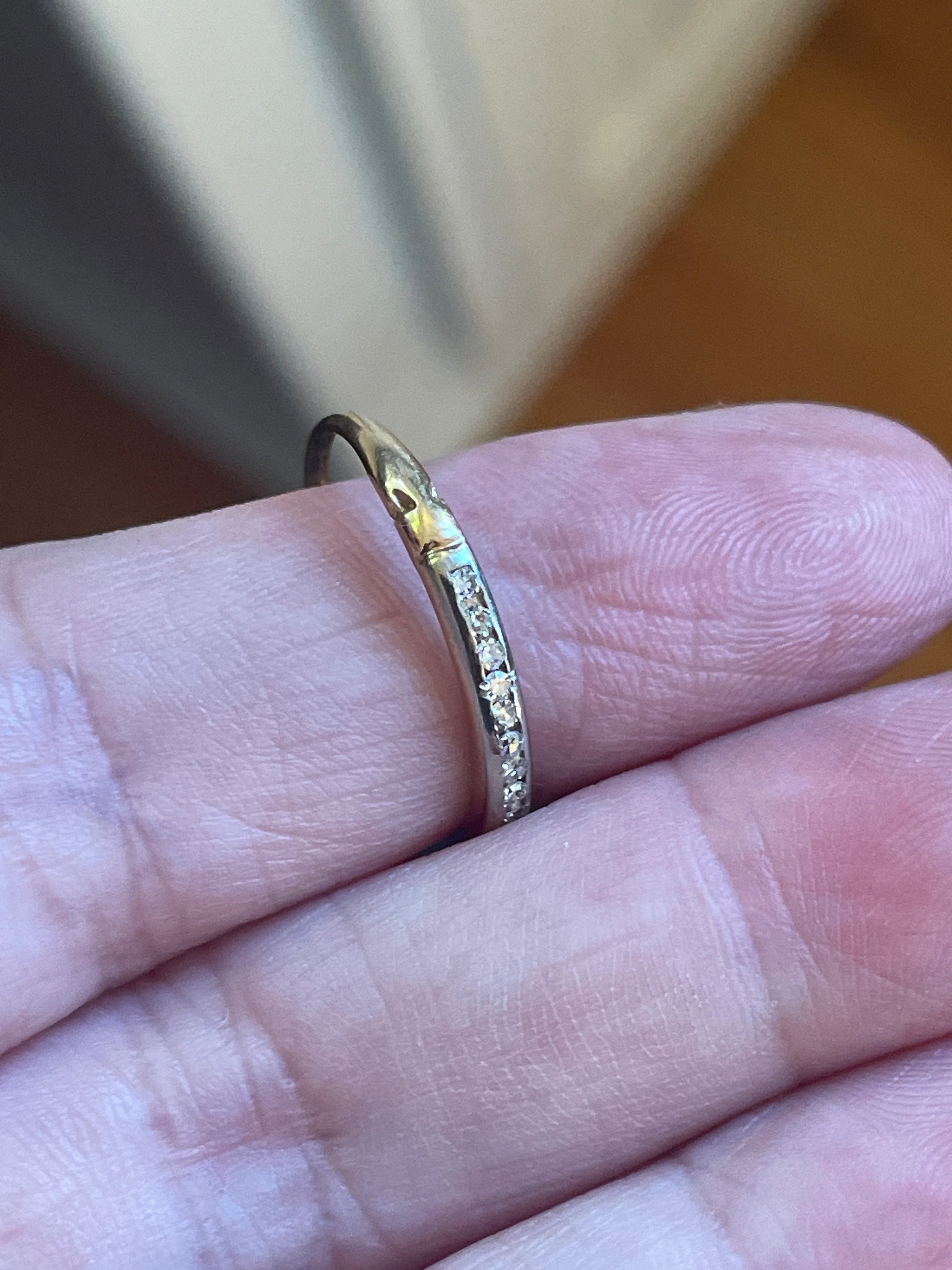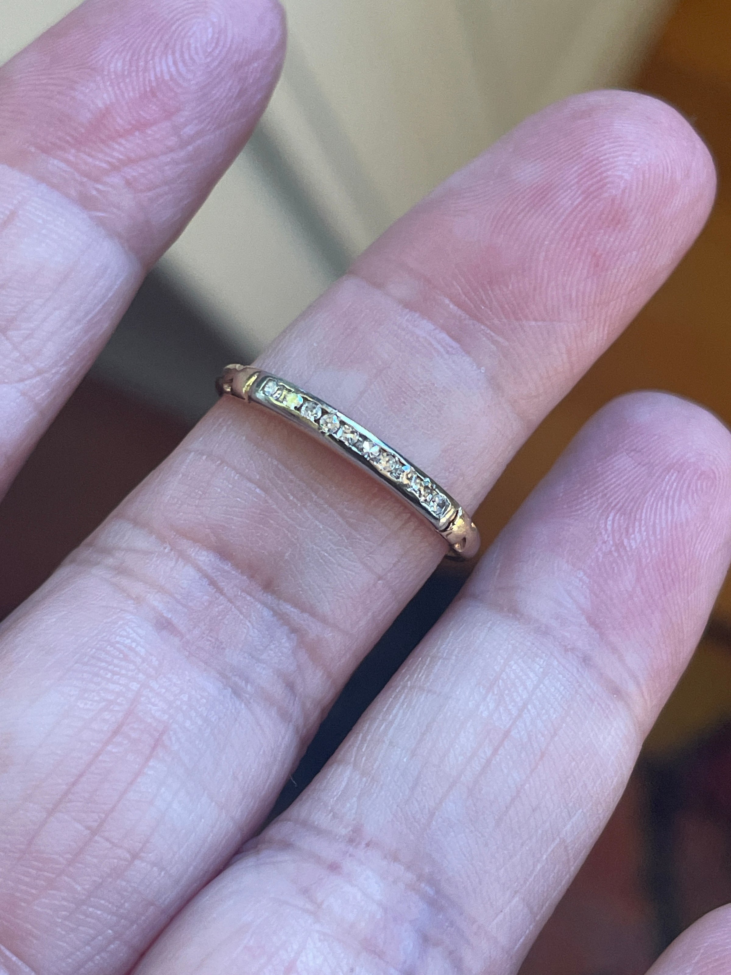 Gorgeous 1930s Diamond band in 14k white and yellow gold.  Diamonds set in white gold.  Rest of band is yellow gold.  Thinner band but Diamonds are very sparkly.  Ring size = 6.5.  There is an area on band where looks like it’s been previously sized.  Stamped 14k.