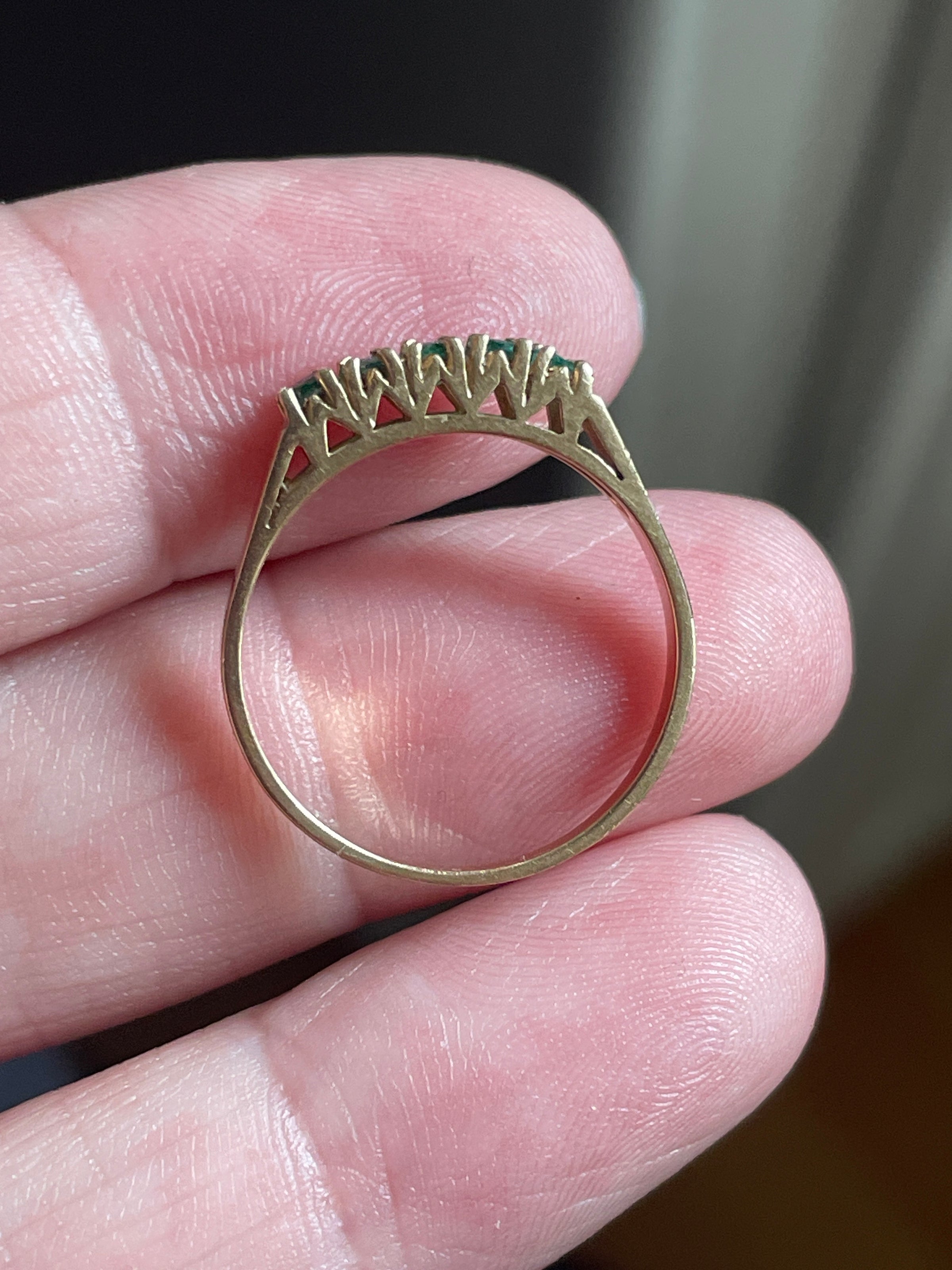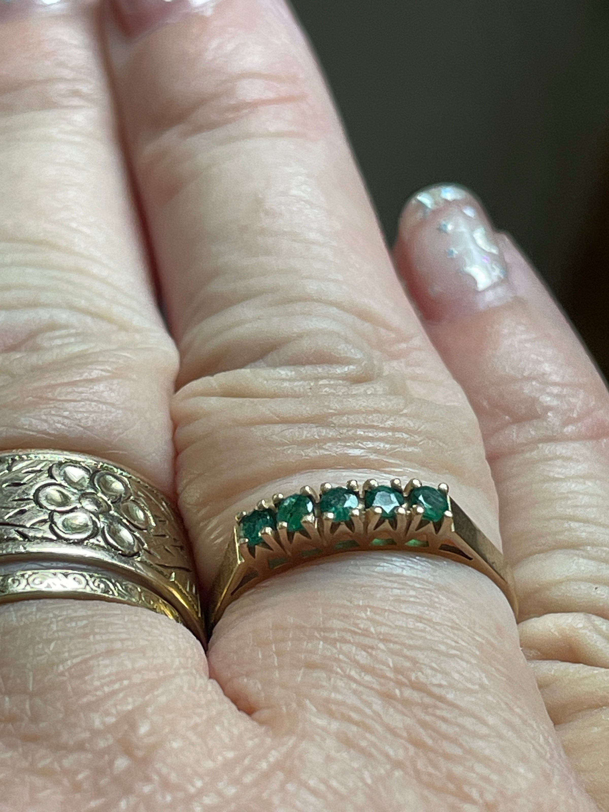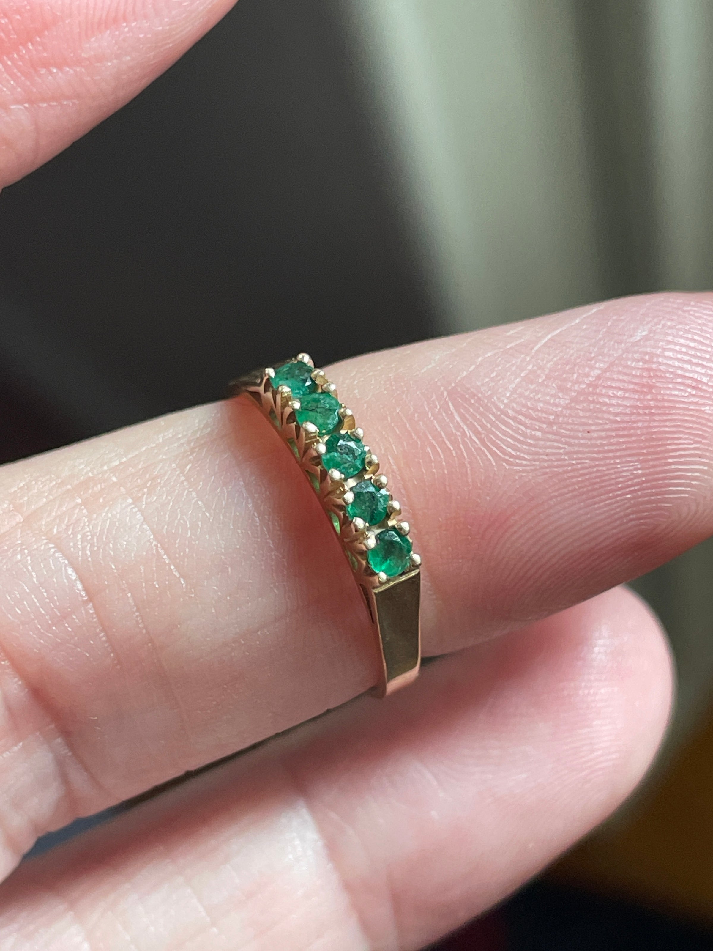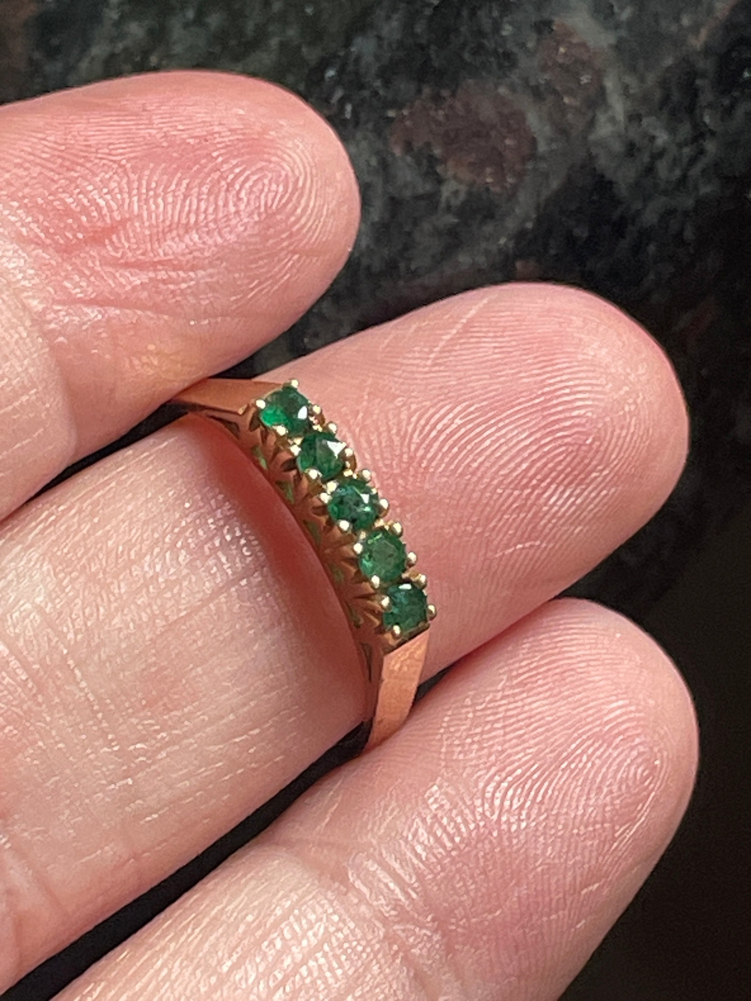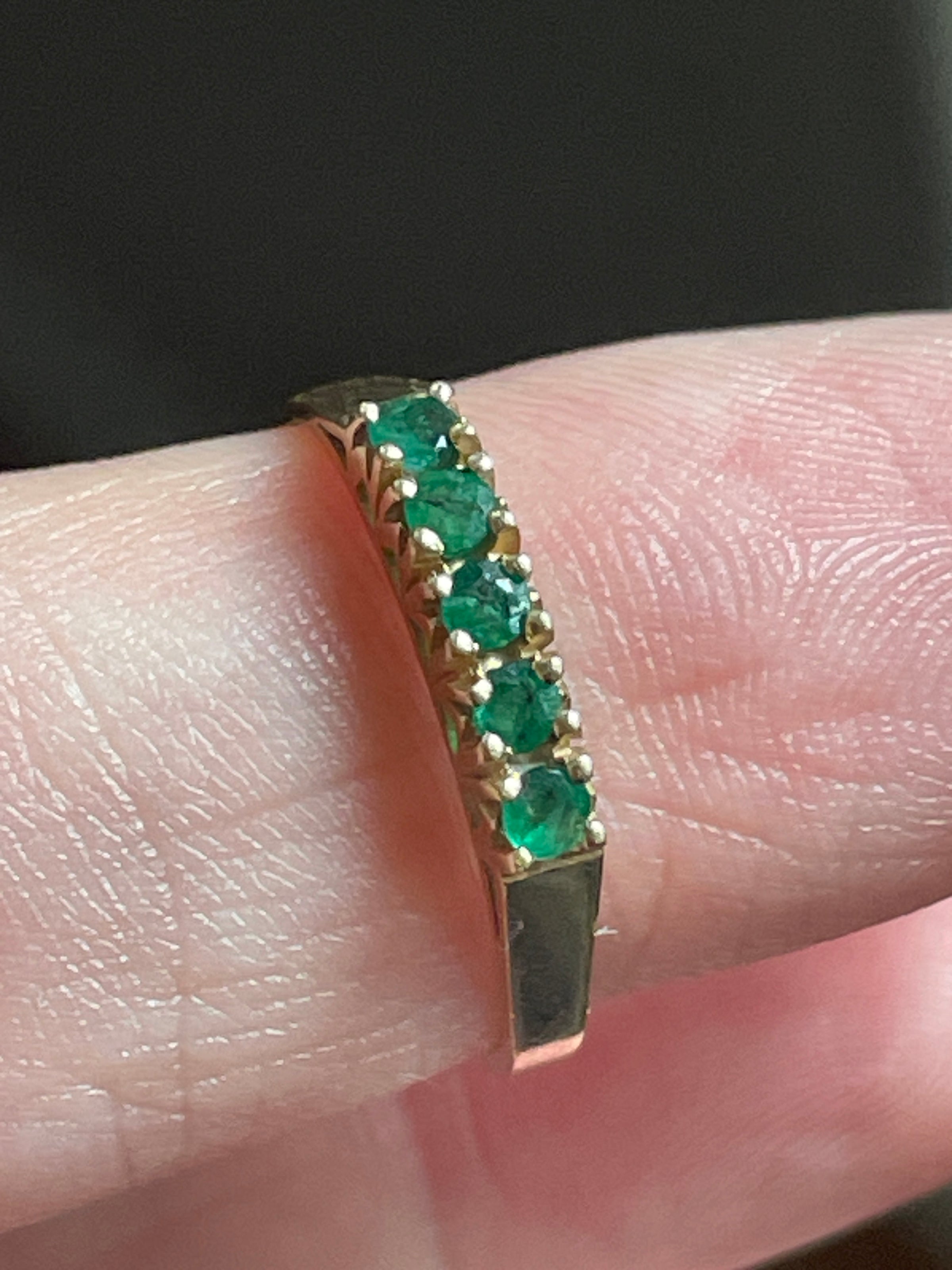 Gorgeous vintage Emerald band. Beautiful five stone setting. Stamped 14k. Size = 6.