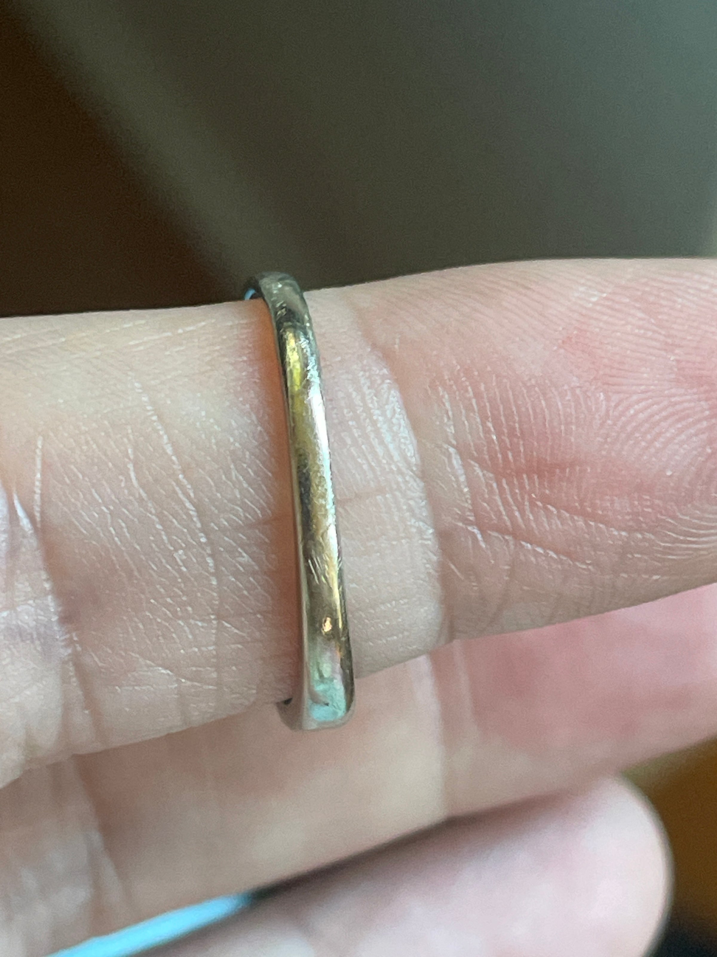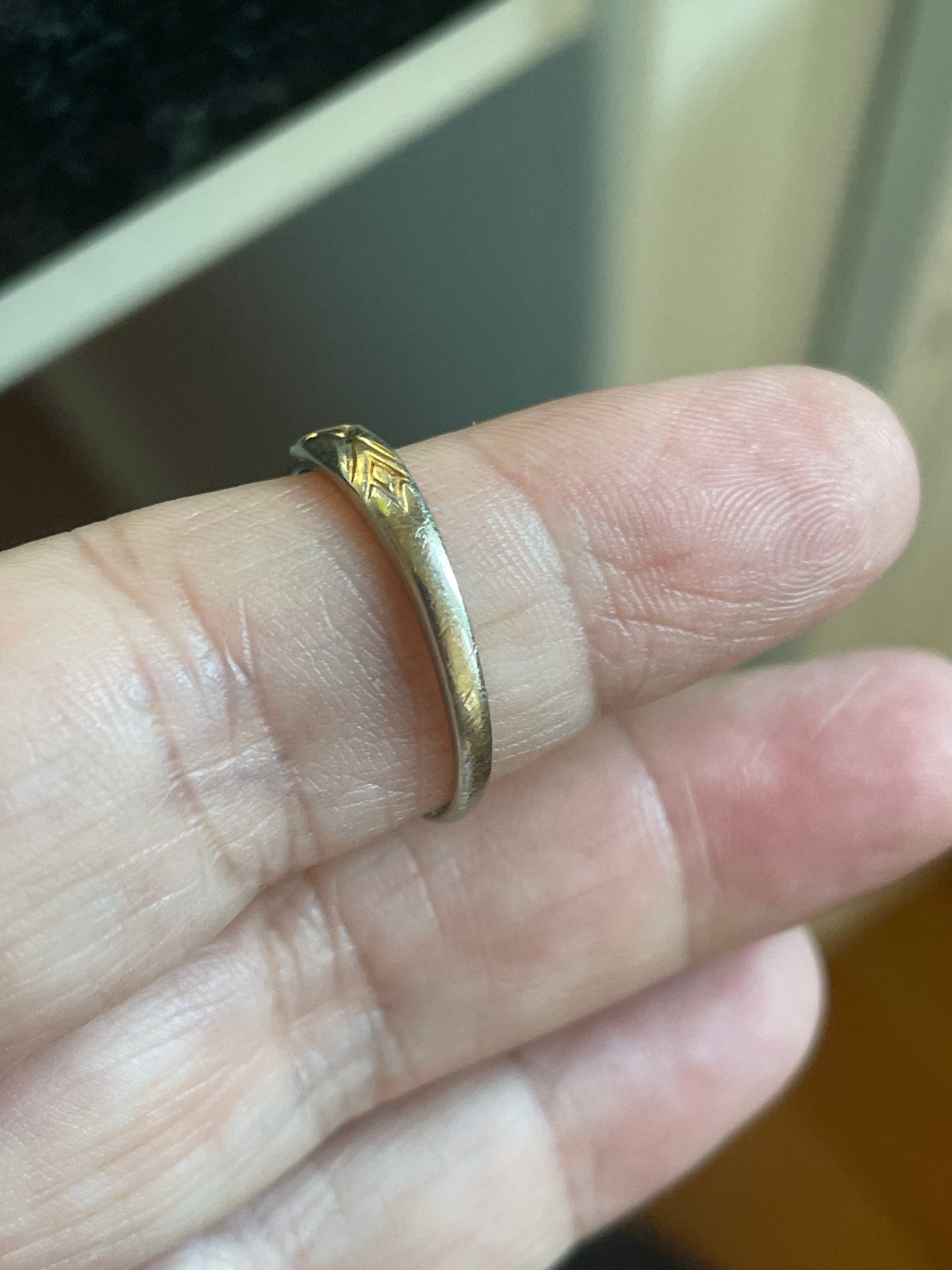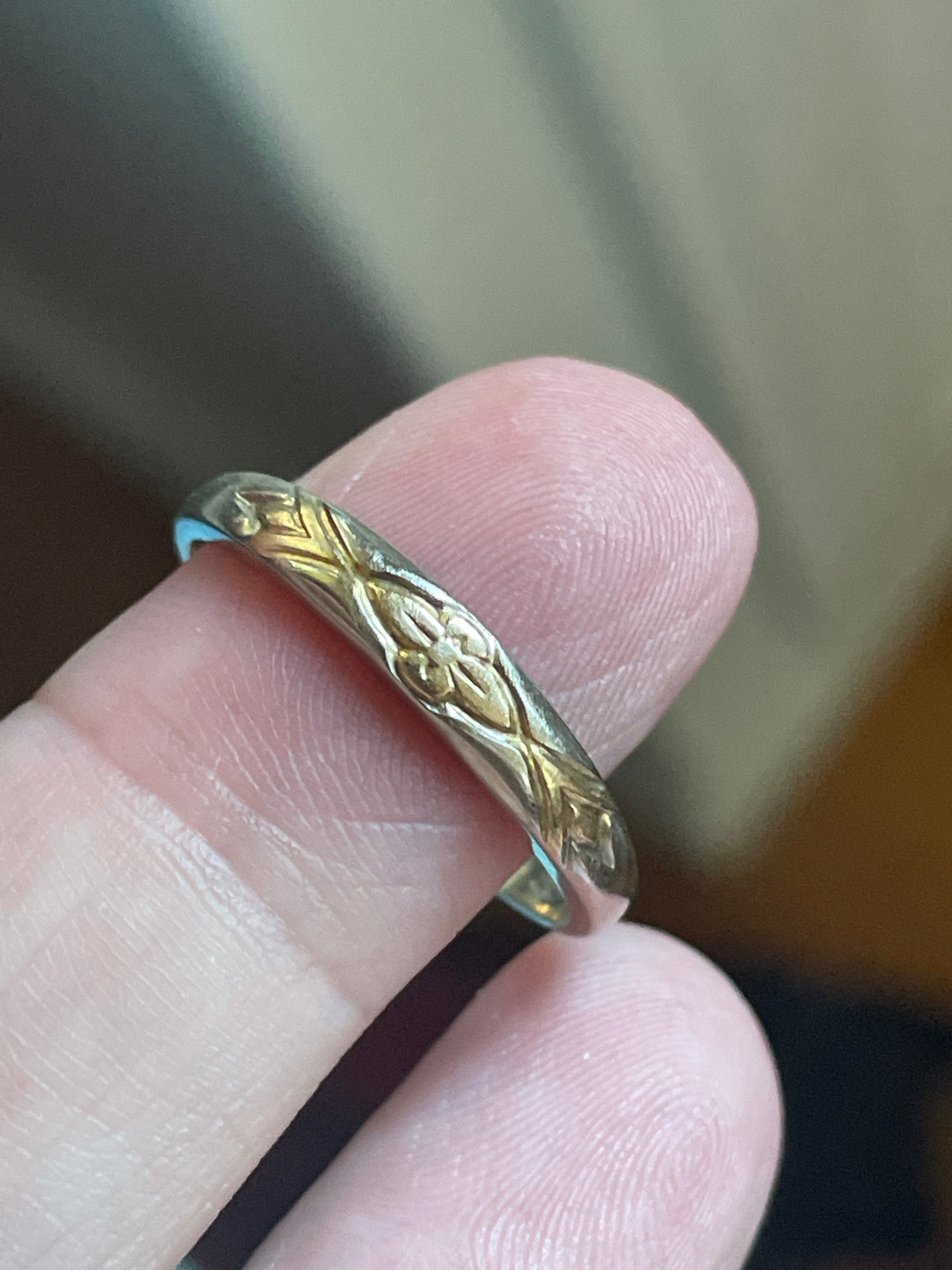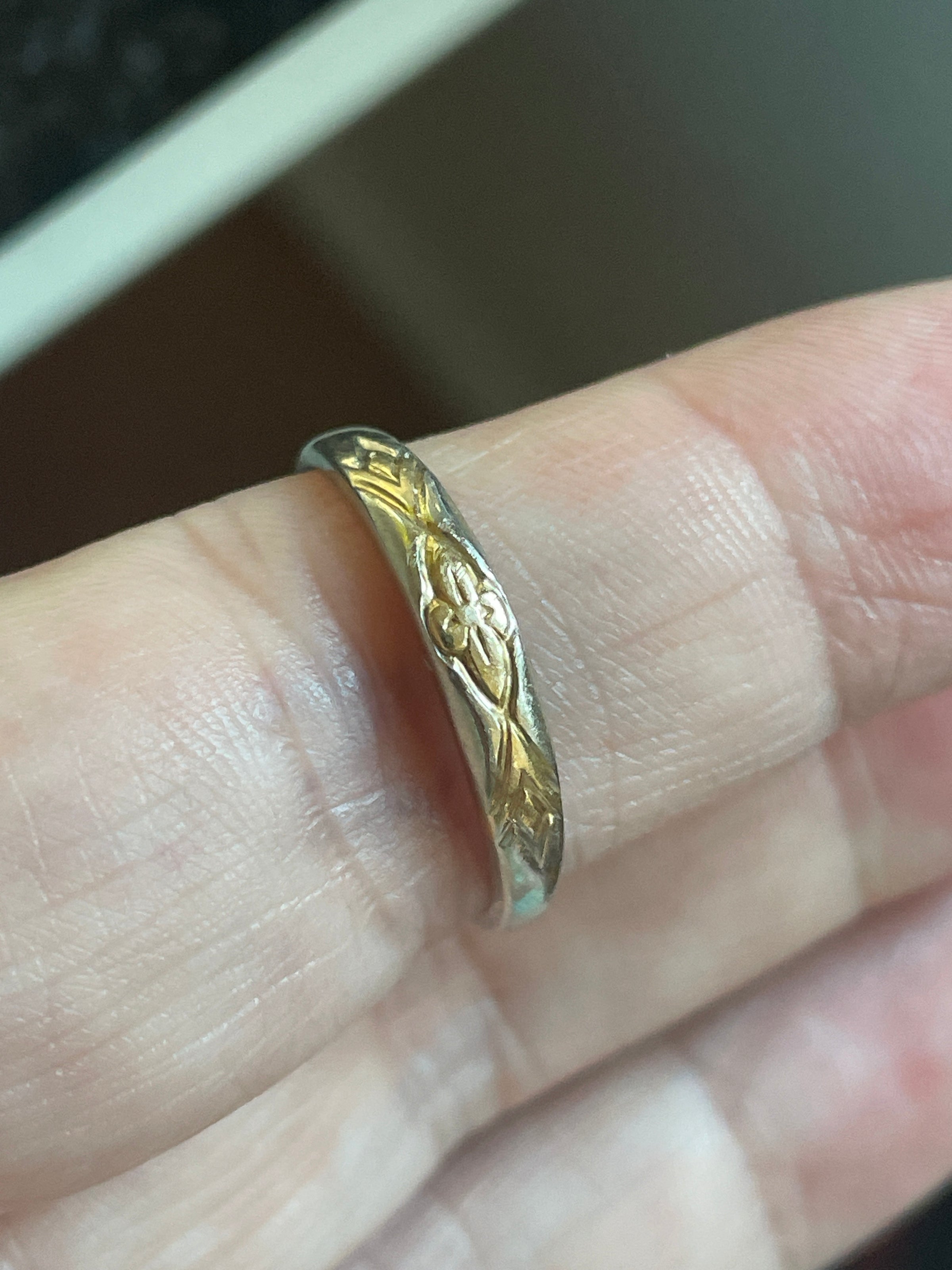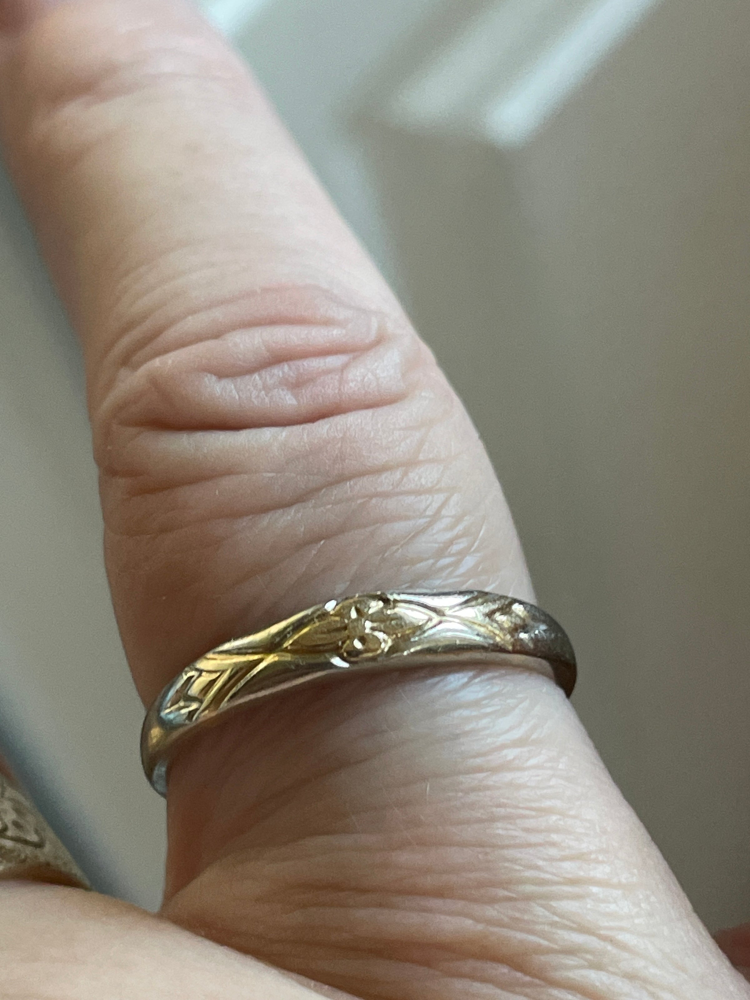 Stunning vintage engraved floral band in white and yellow gold. Tapers from slightly thicker in front to thinner in back. Ring size = 7.75. Band stamped 14k.