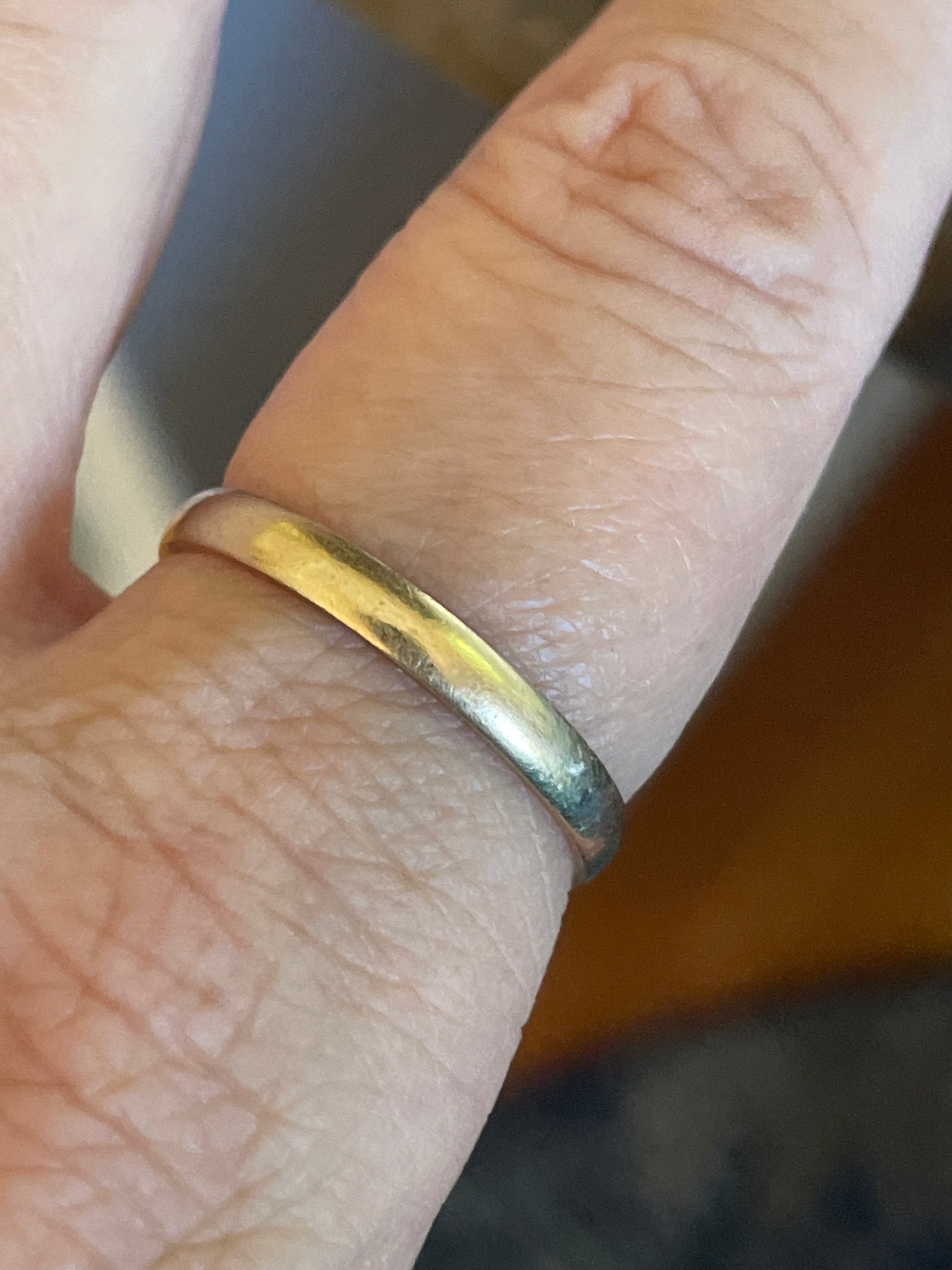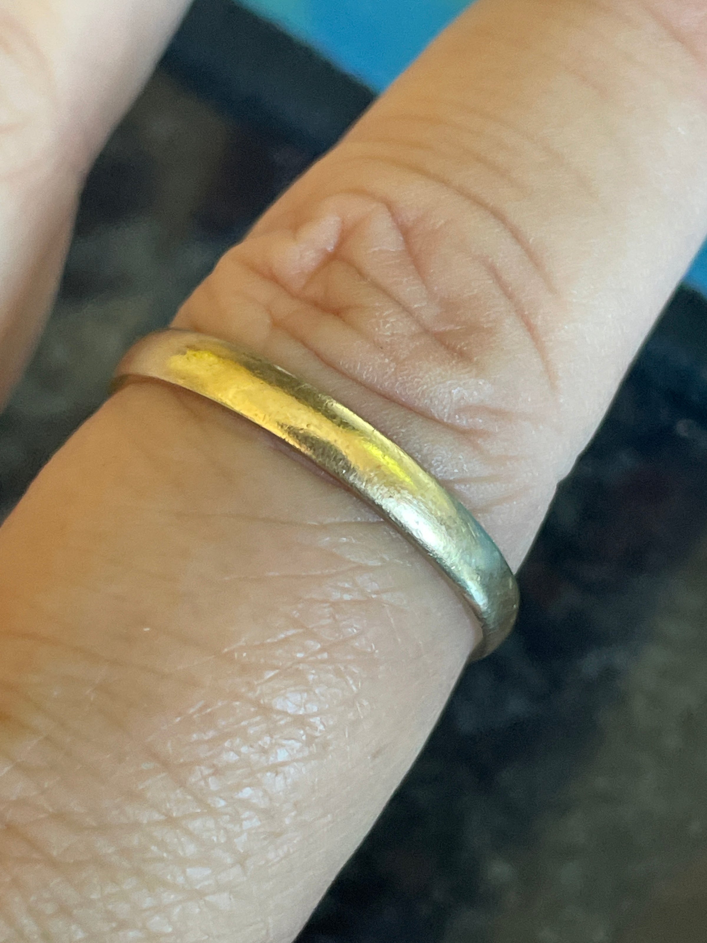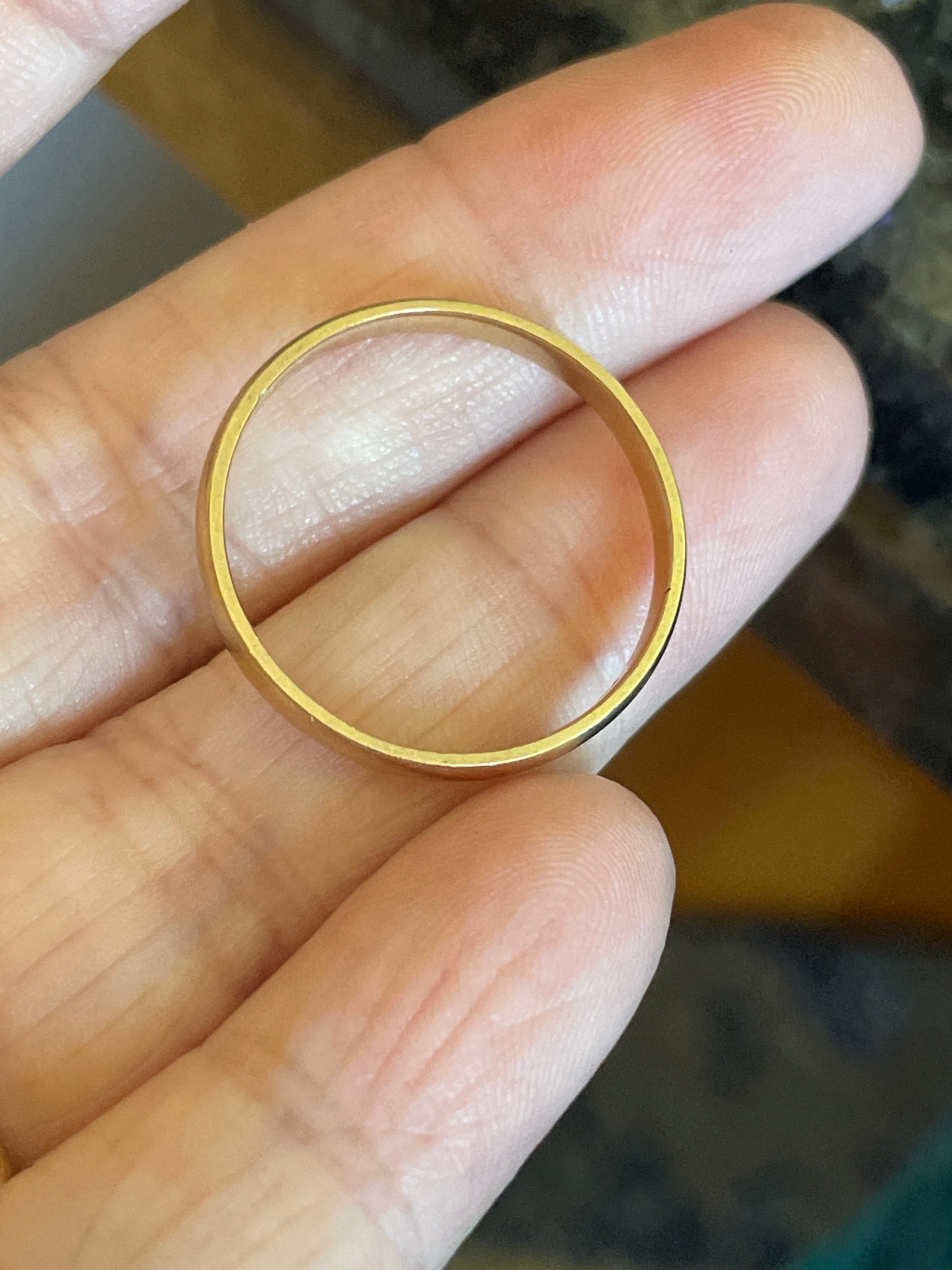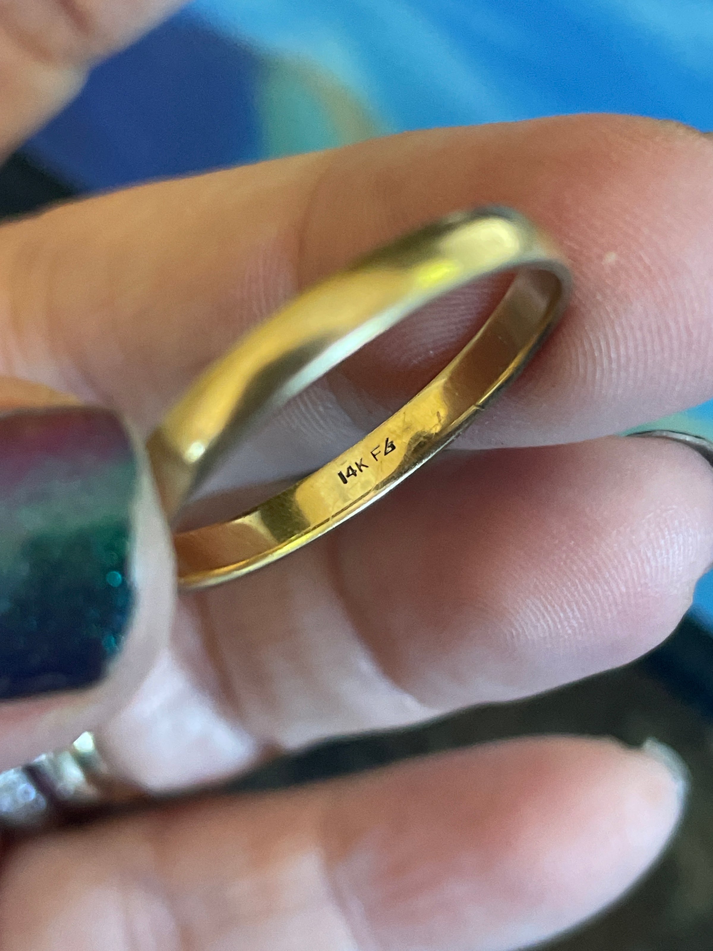 Beautiful buttery gold band with a lovely smoothness from wear. Ring is hallmarked 14k and also F and a symbol which could be maker’s mark. Ring size = 9.75. Approx 2mm in width. 2.19 grams.