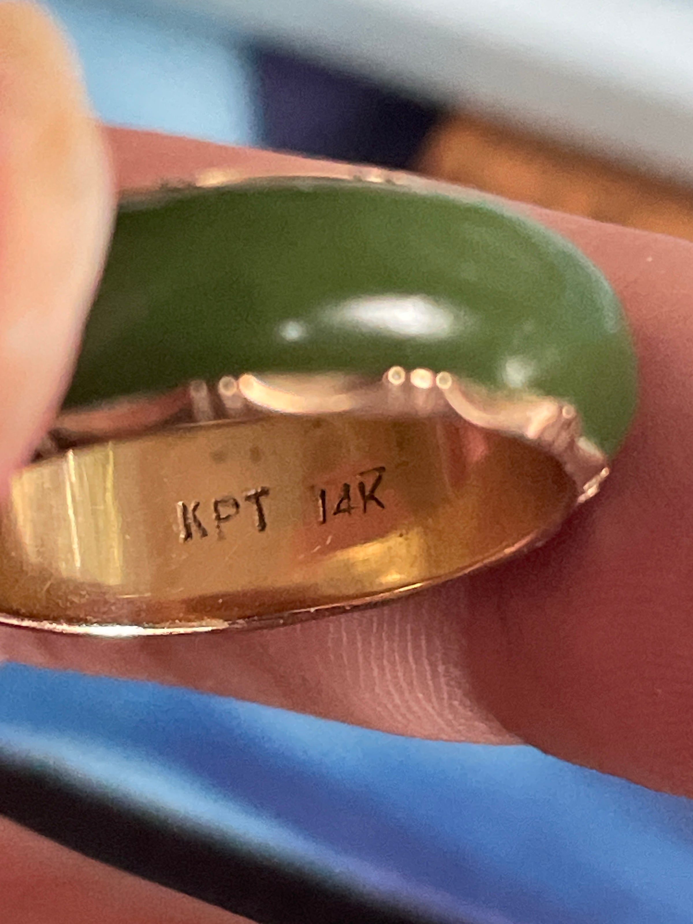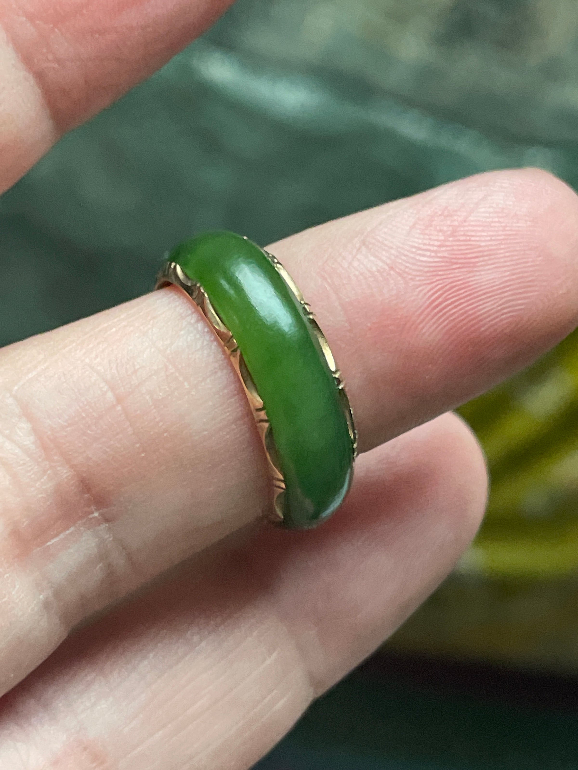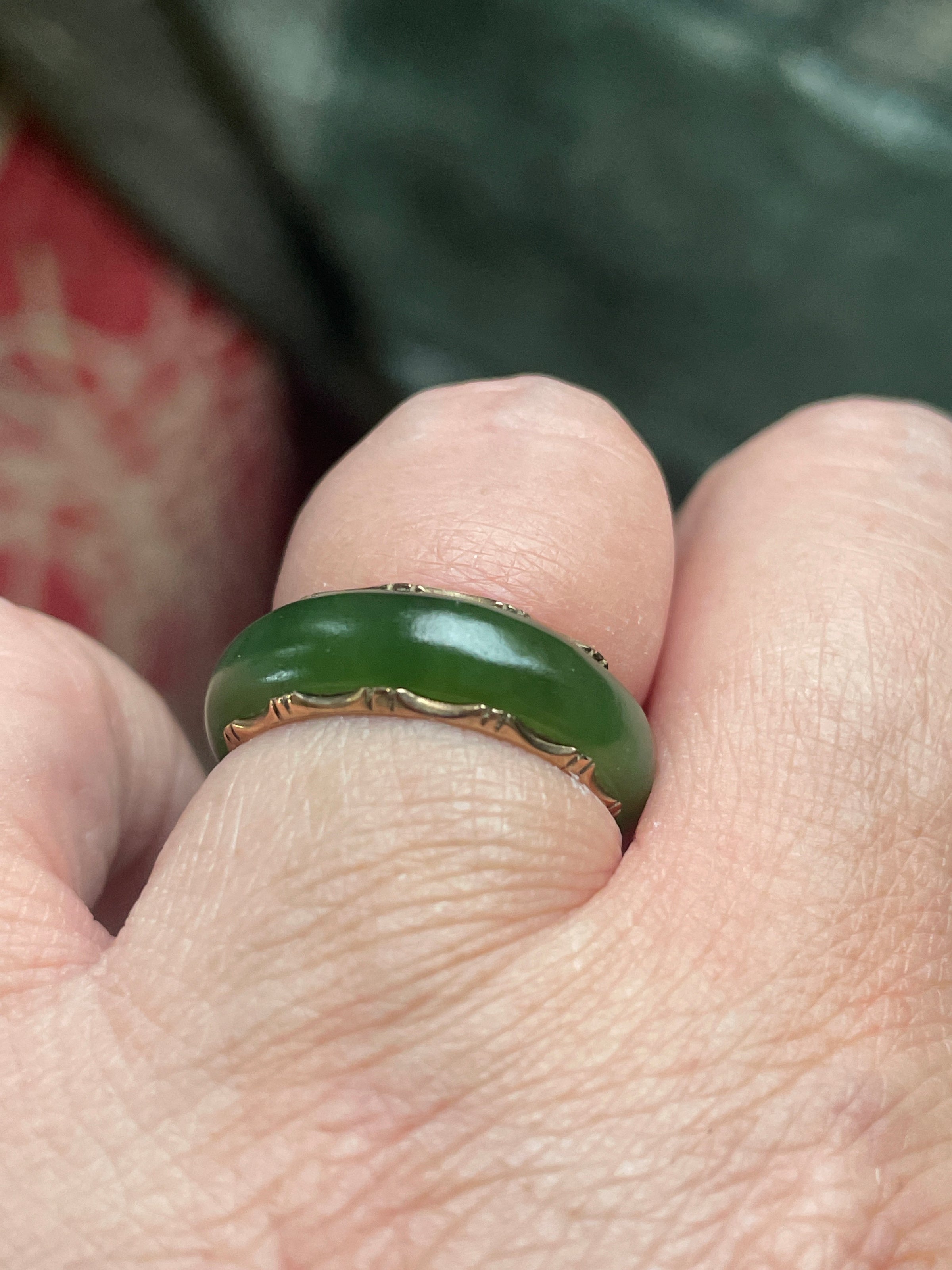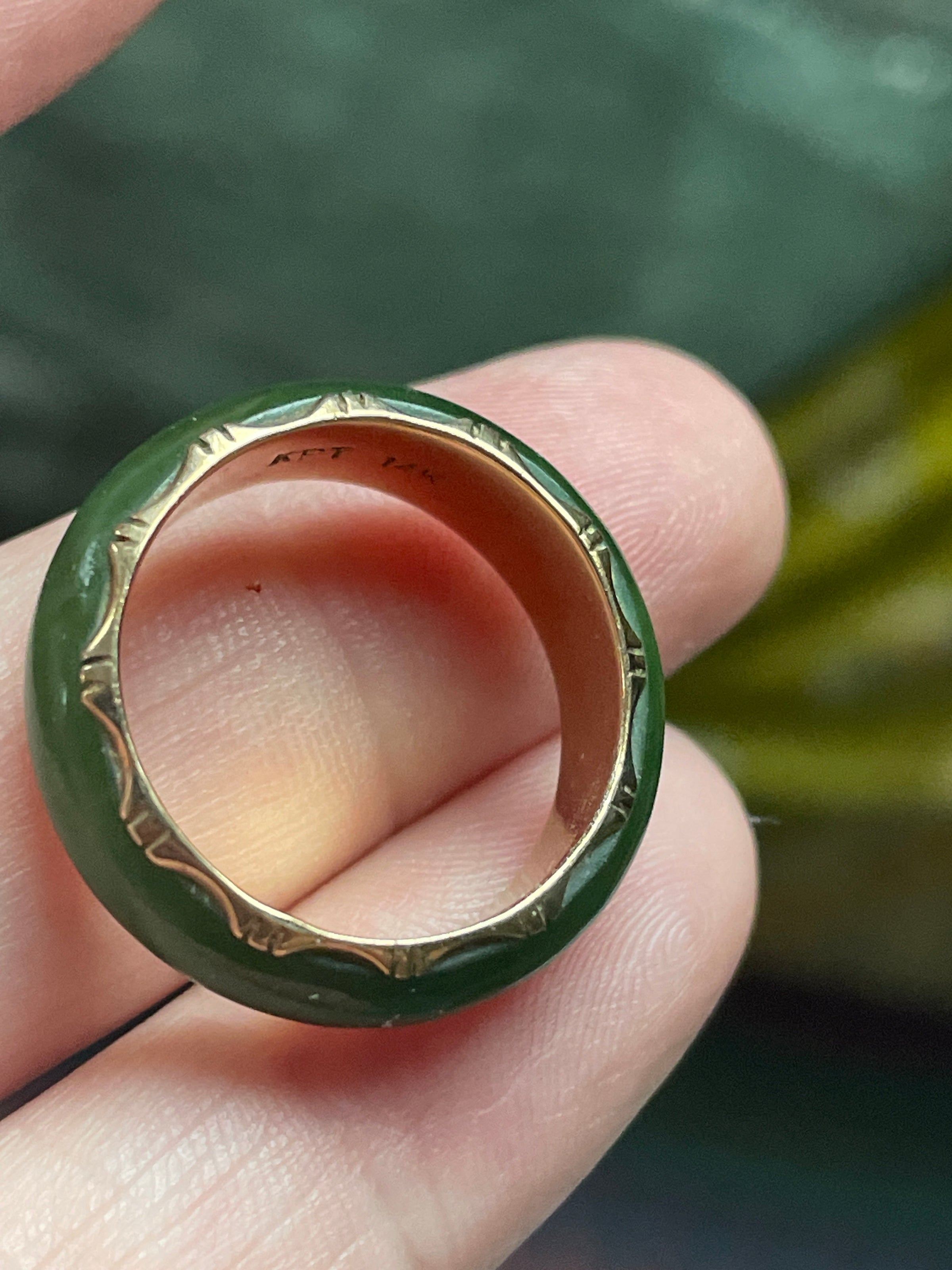 Fabulous vintage Nephrite Jade band with beautiful 14k gold edging that looks beautiful as it shows around the Jade. Ring size = 6.75 but fits a bit smaller due to width. Stamped 14k inside band.