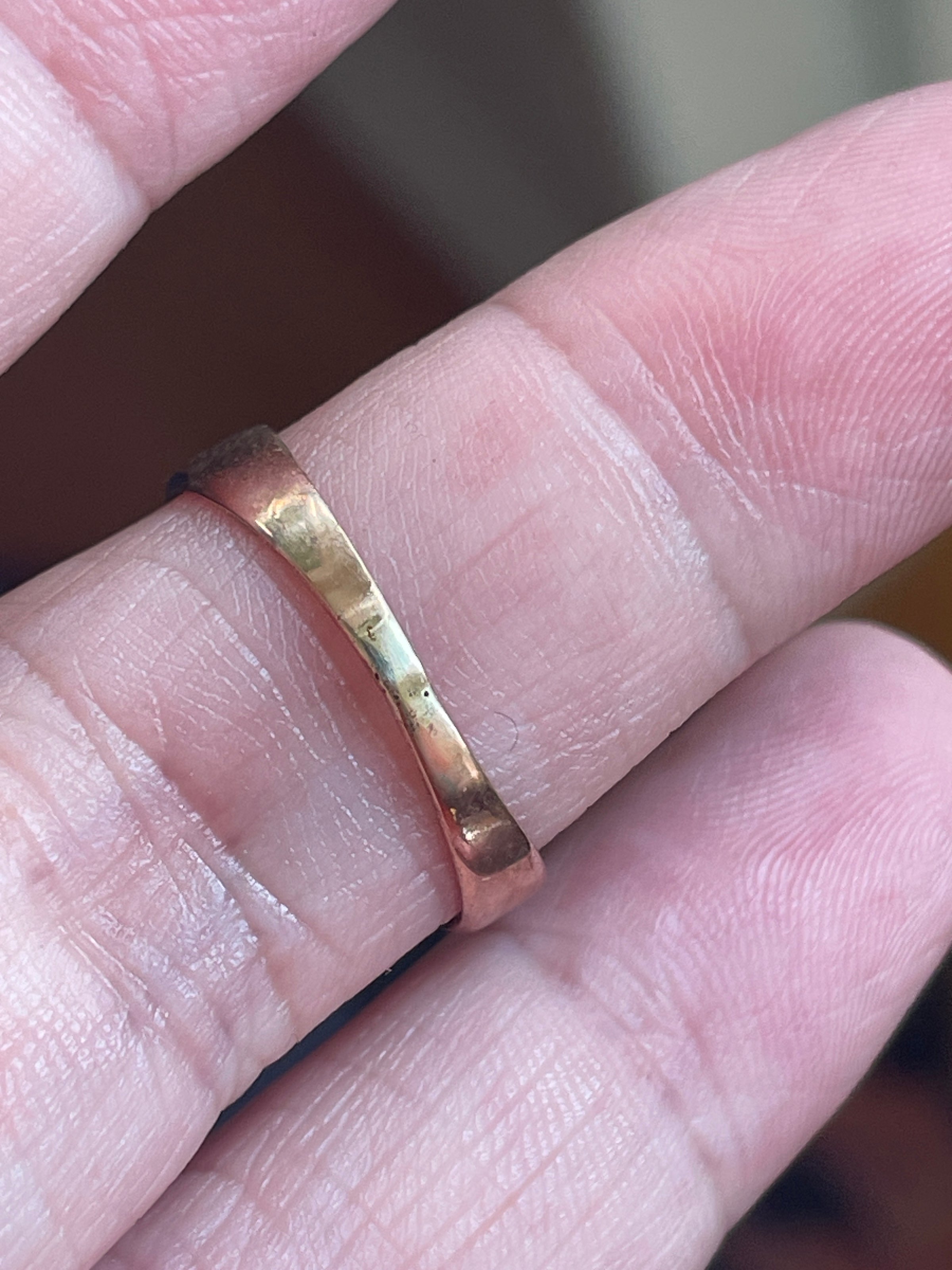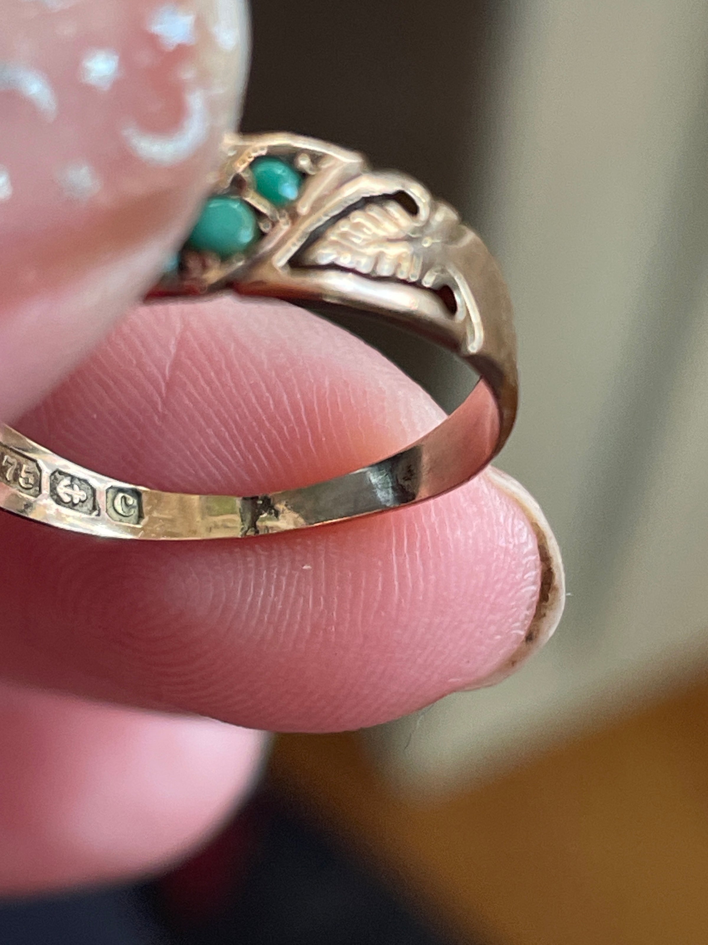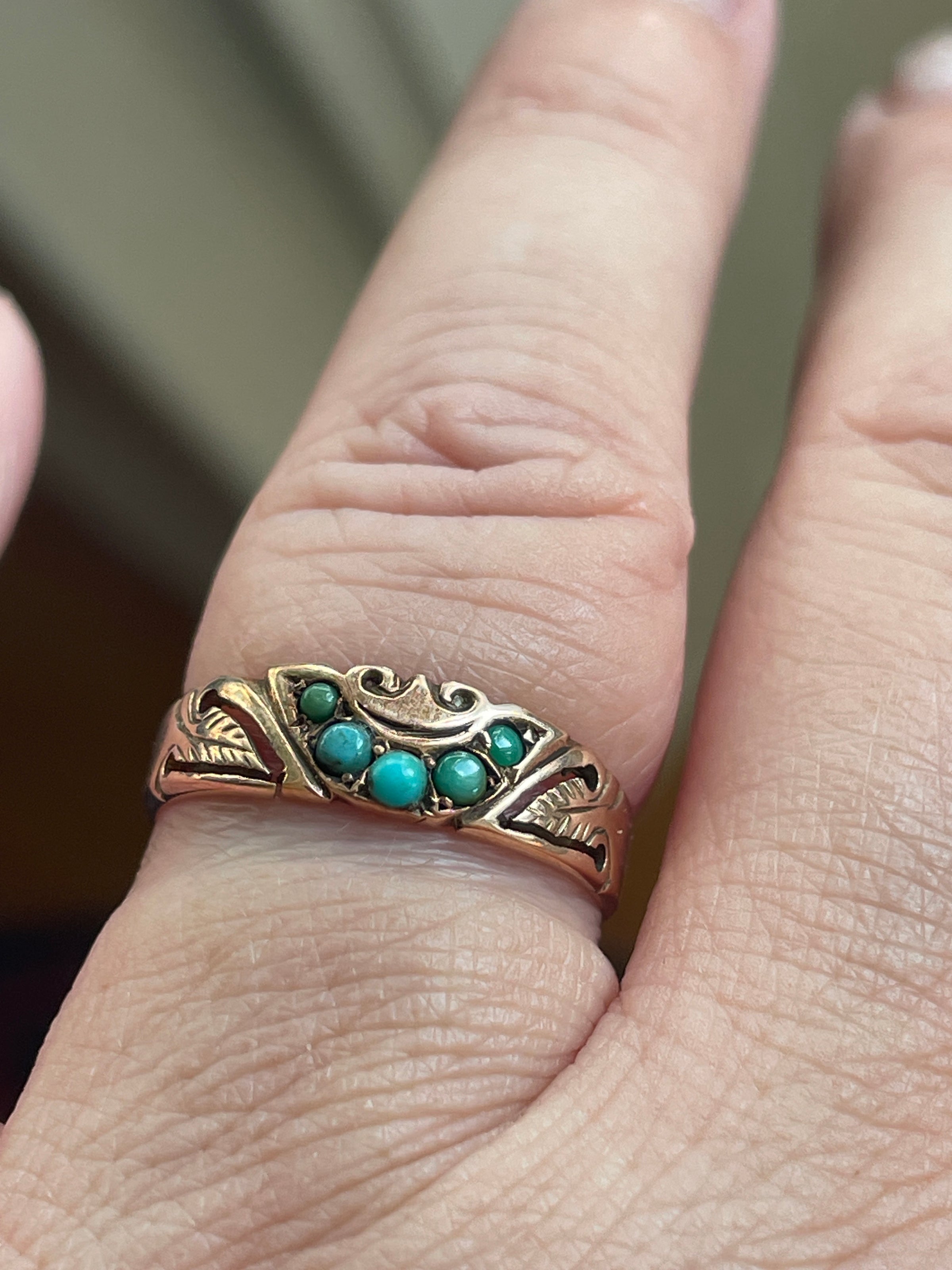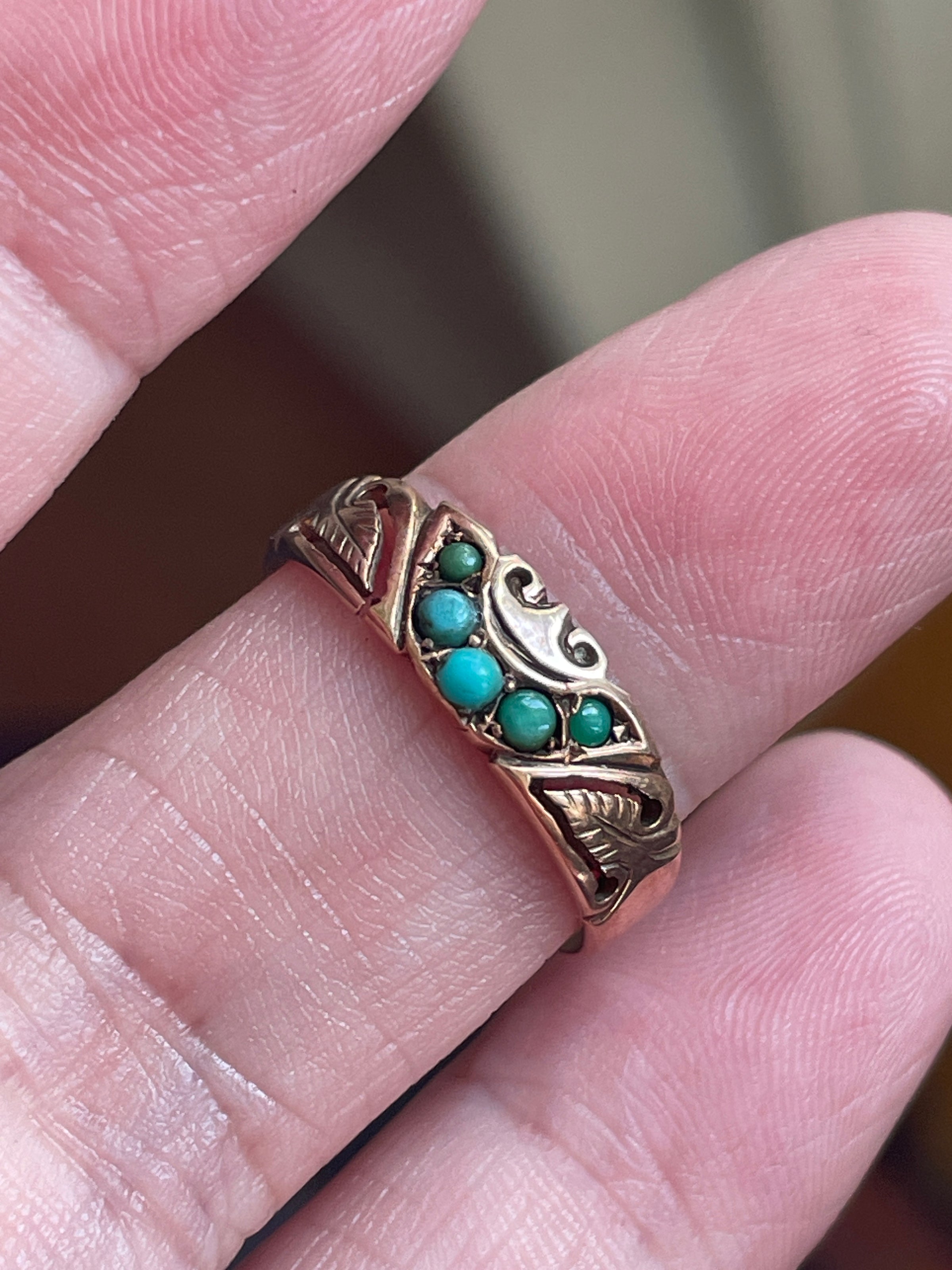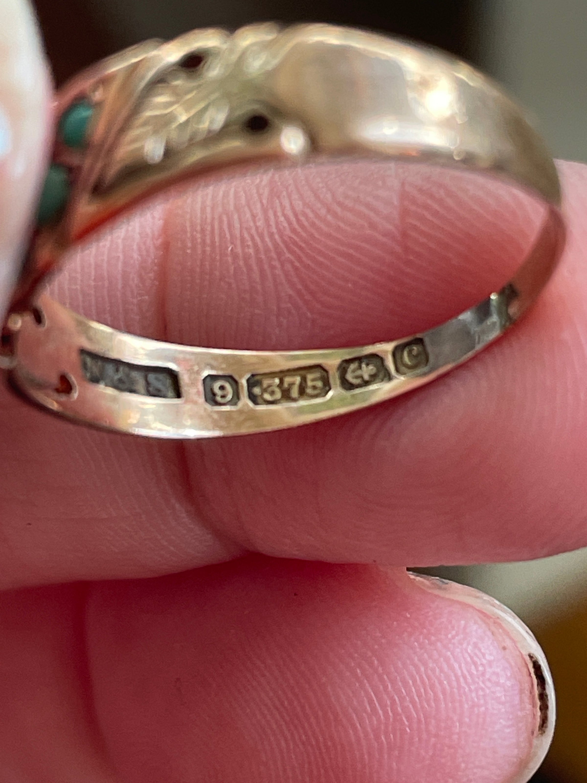 Ultra rare Turquoise band circa early 1900s. Ornate design with openwork, leaf design and engraving. Size = 7.25. Has full British hallmarks including 375 for 9k. Also has an anchor for Birmingham and a C which based on appearances looks to indicate it was made in 1902. Ring has a bit of wear inside band indicating may have been previously sized.