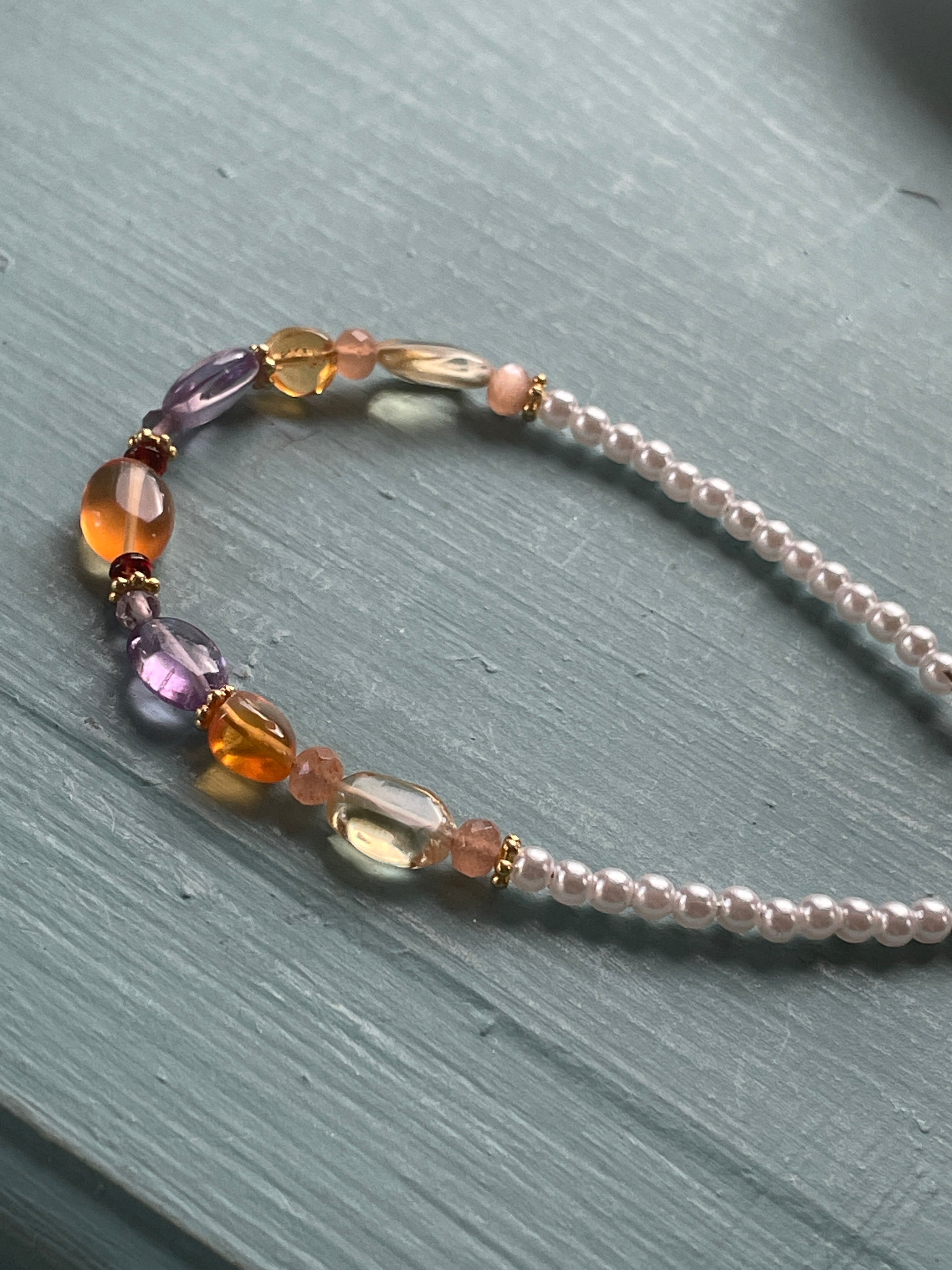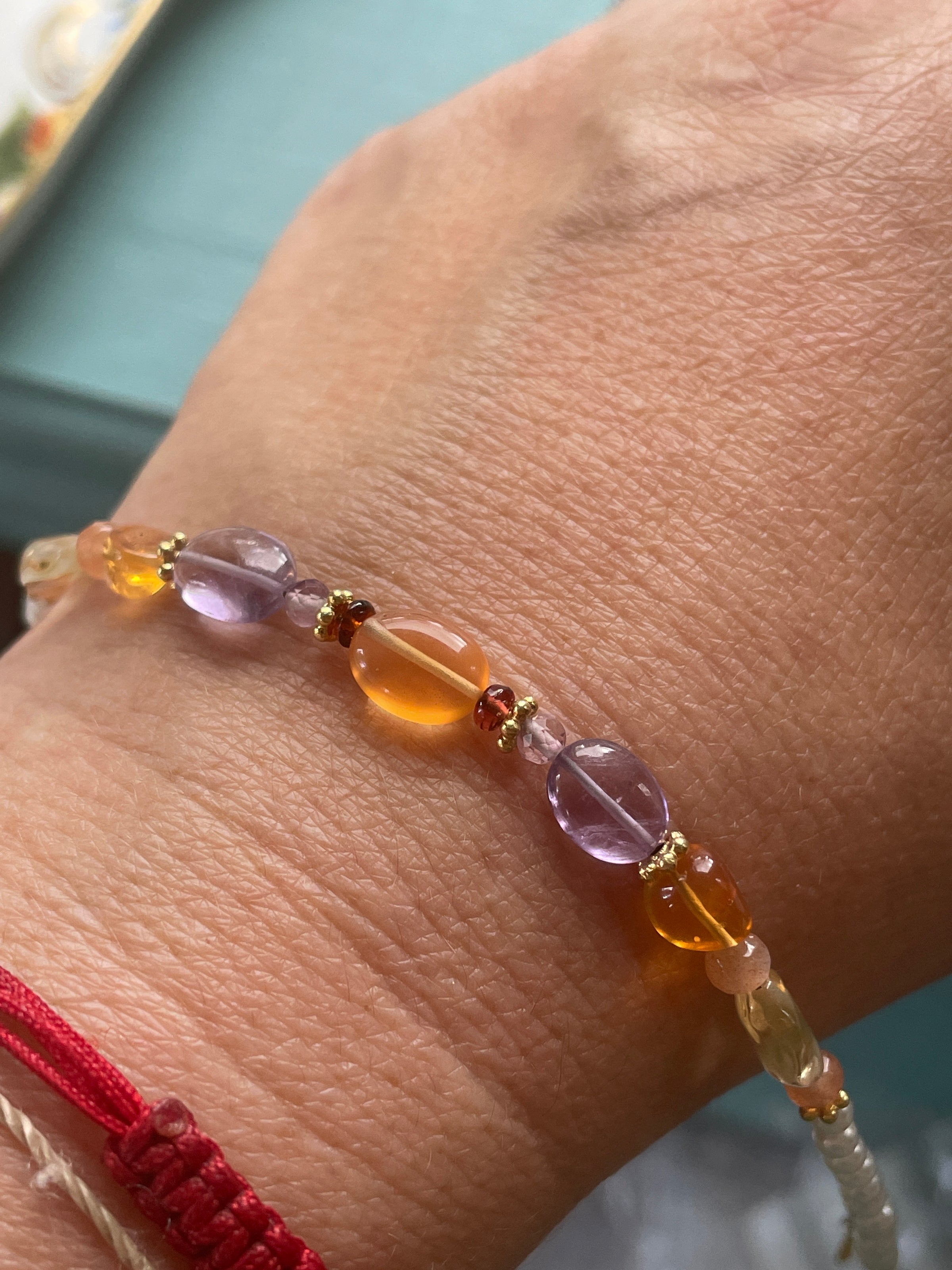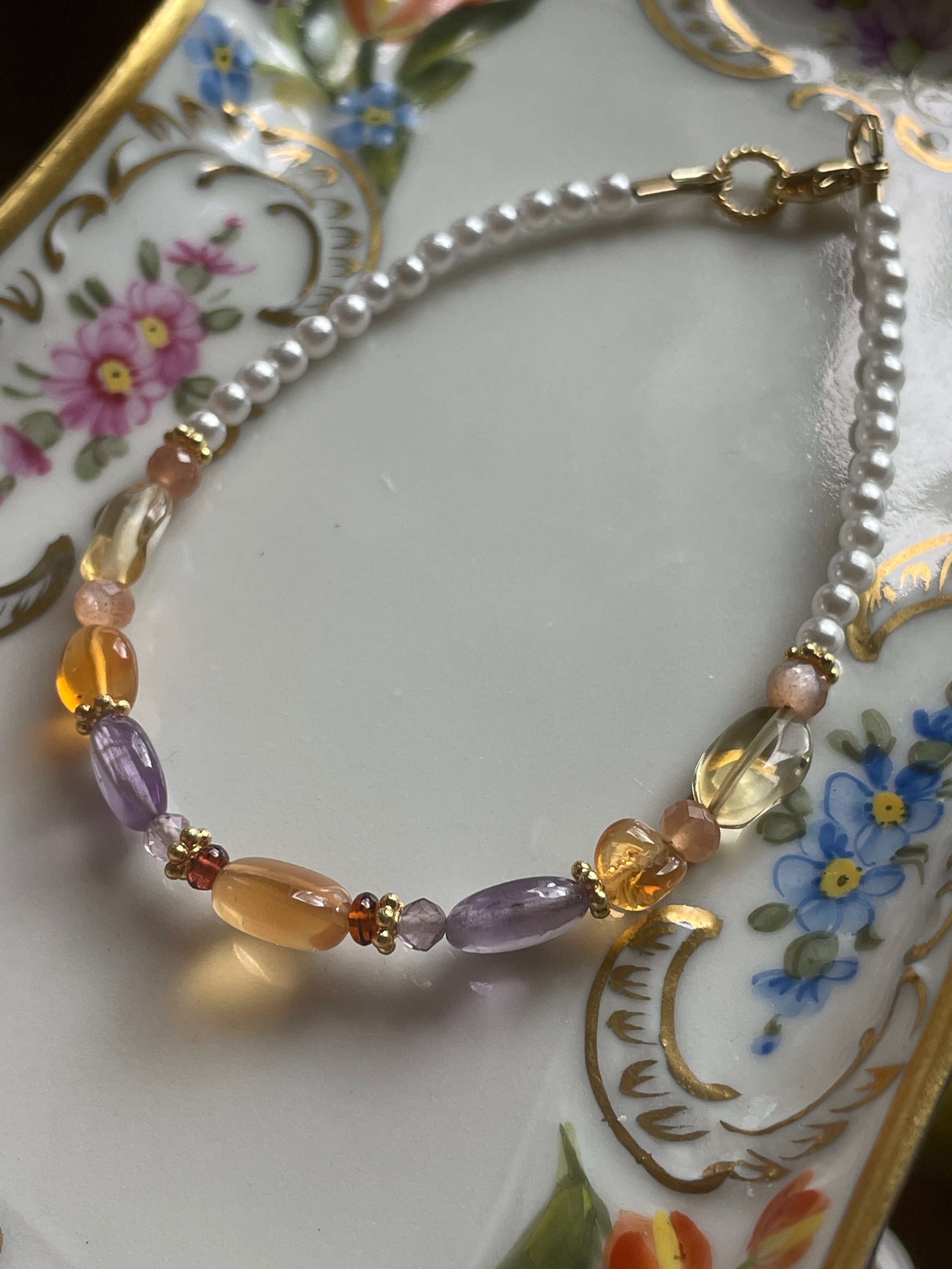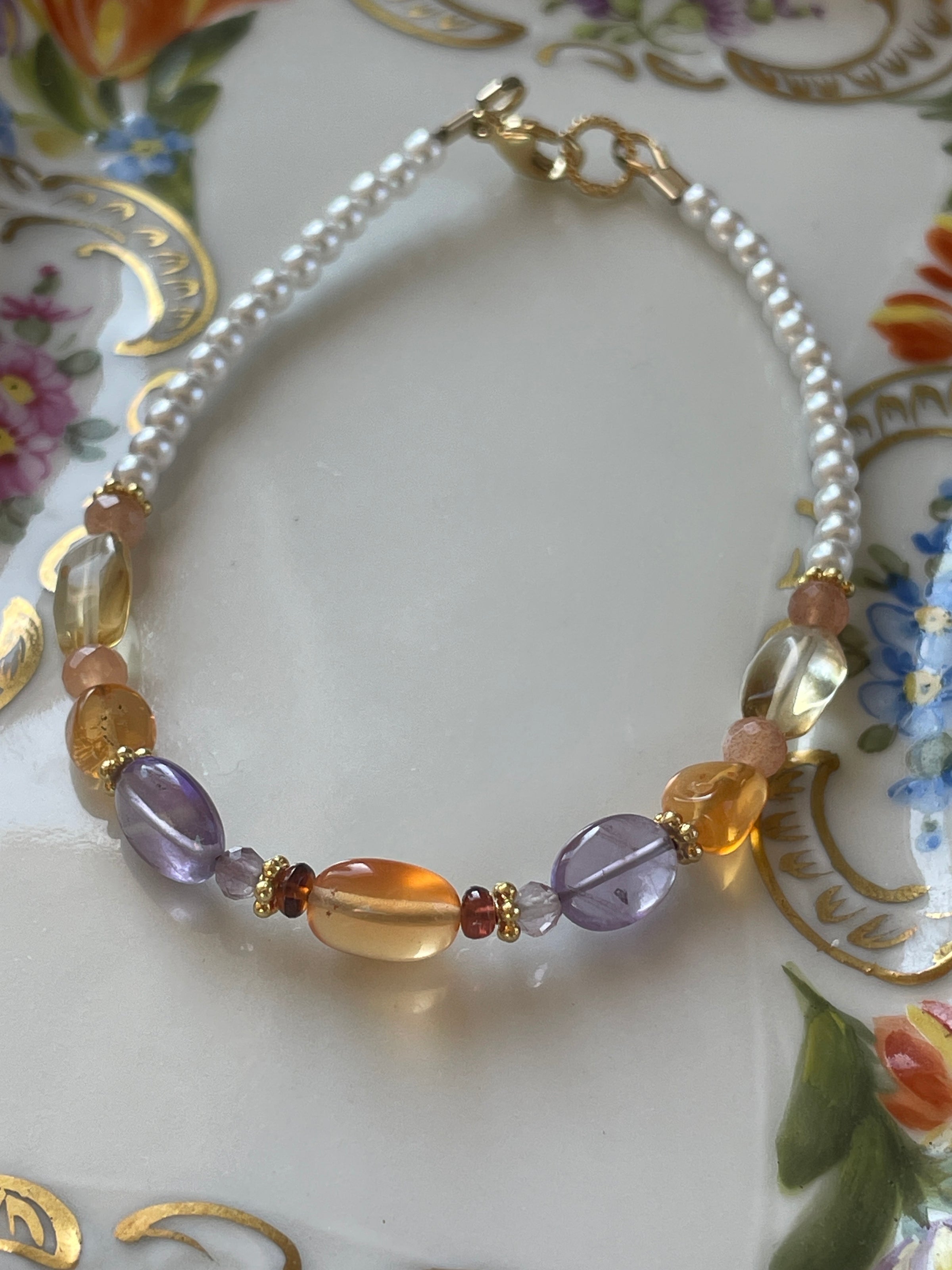 Fabulous Autumnal bracelet with luminous gemstones. Stones include Mexican Opal, Ametrine, Peach Moonstone, Tourmaline, Citrine and Freshwater Pearl. Bracelet measures just under 7.5 inches. All findings are gold filled.