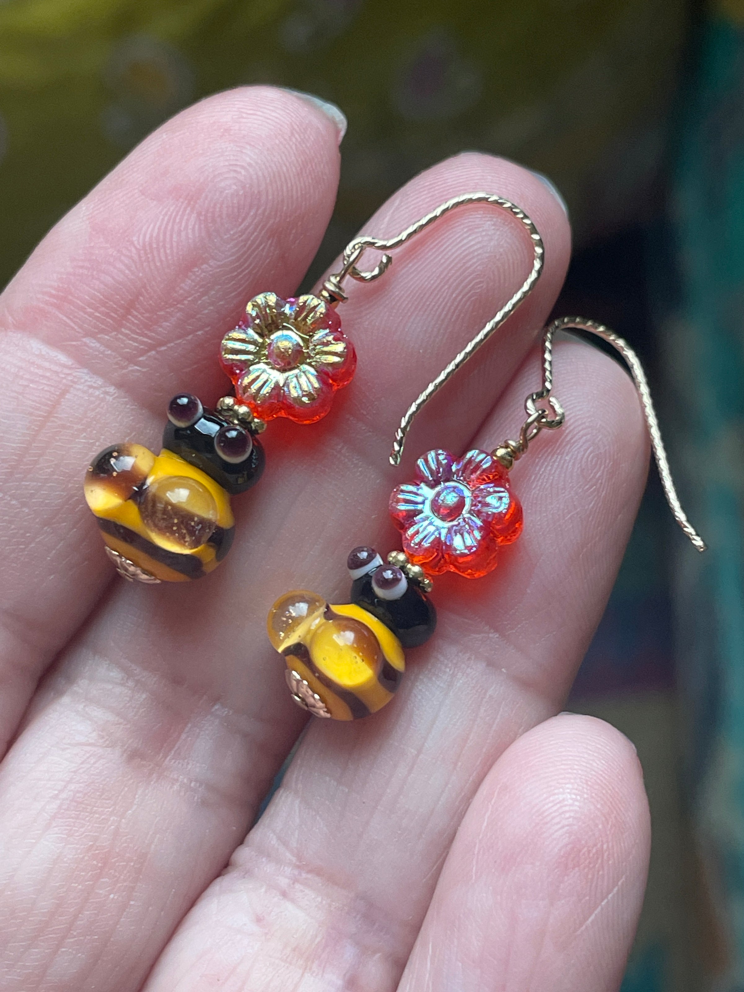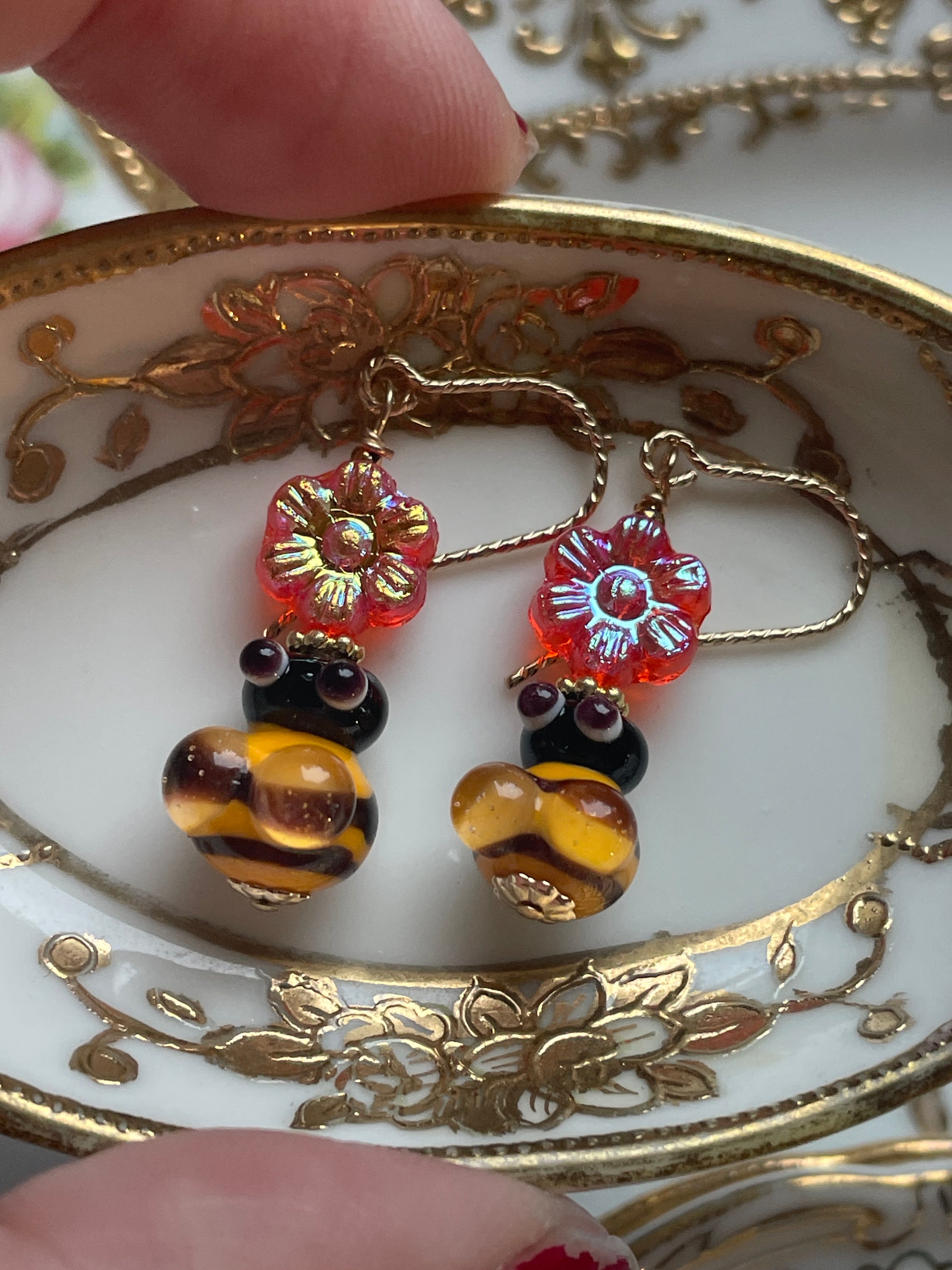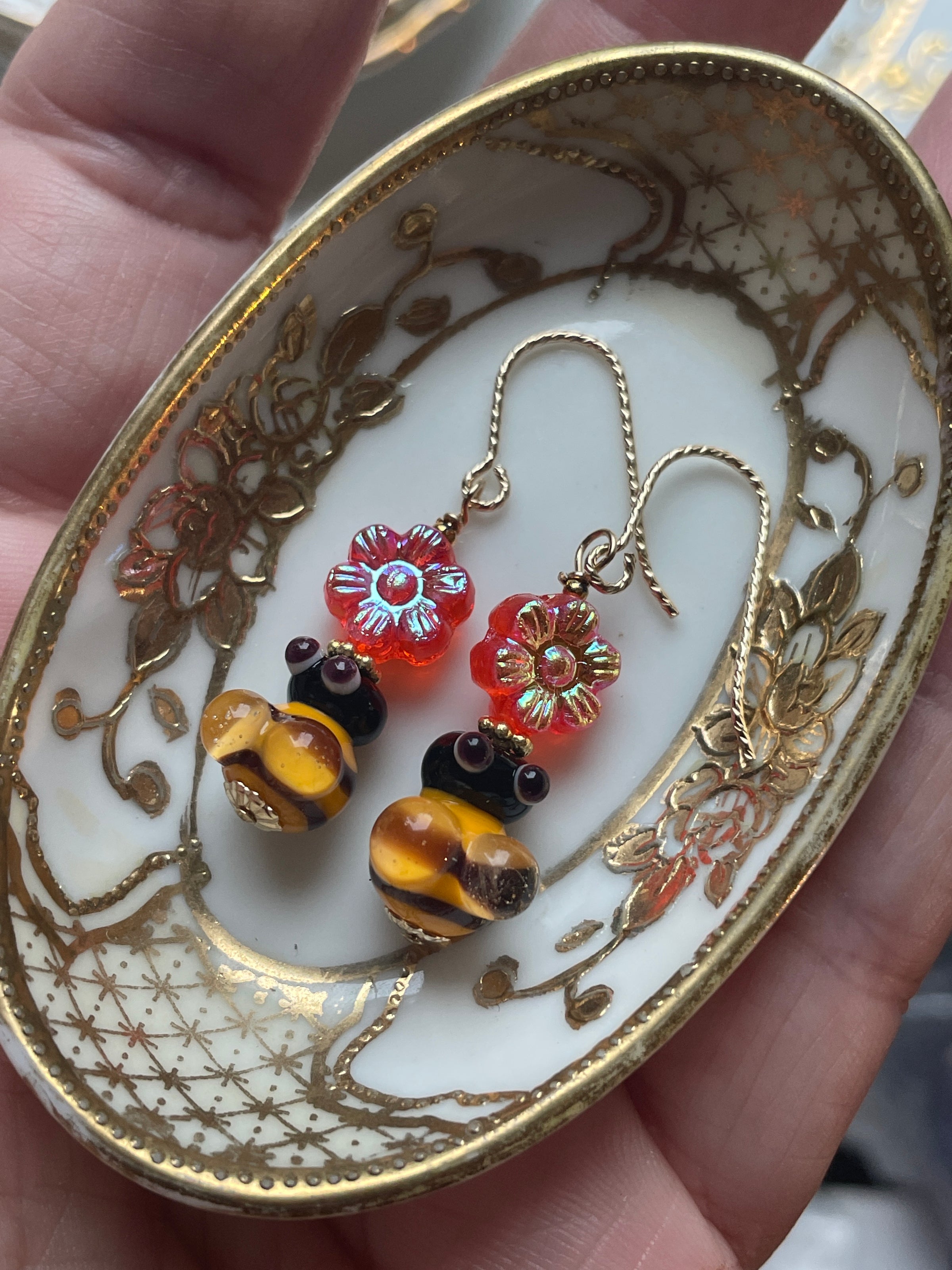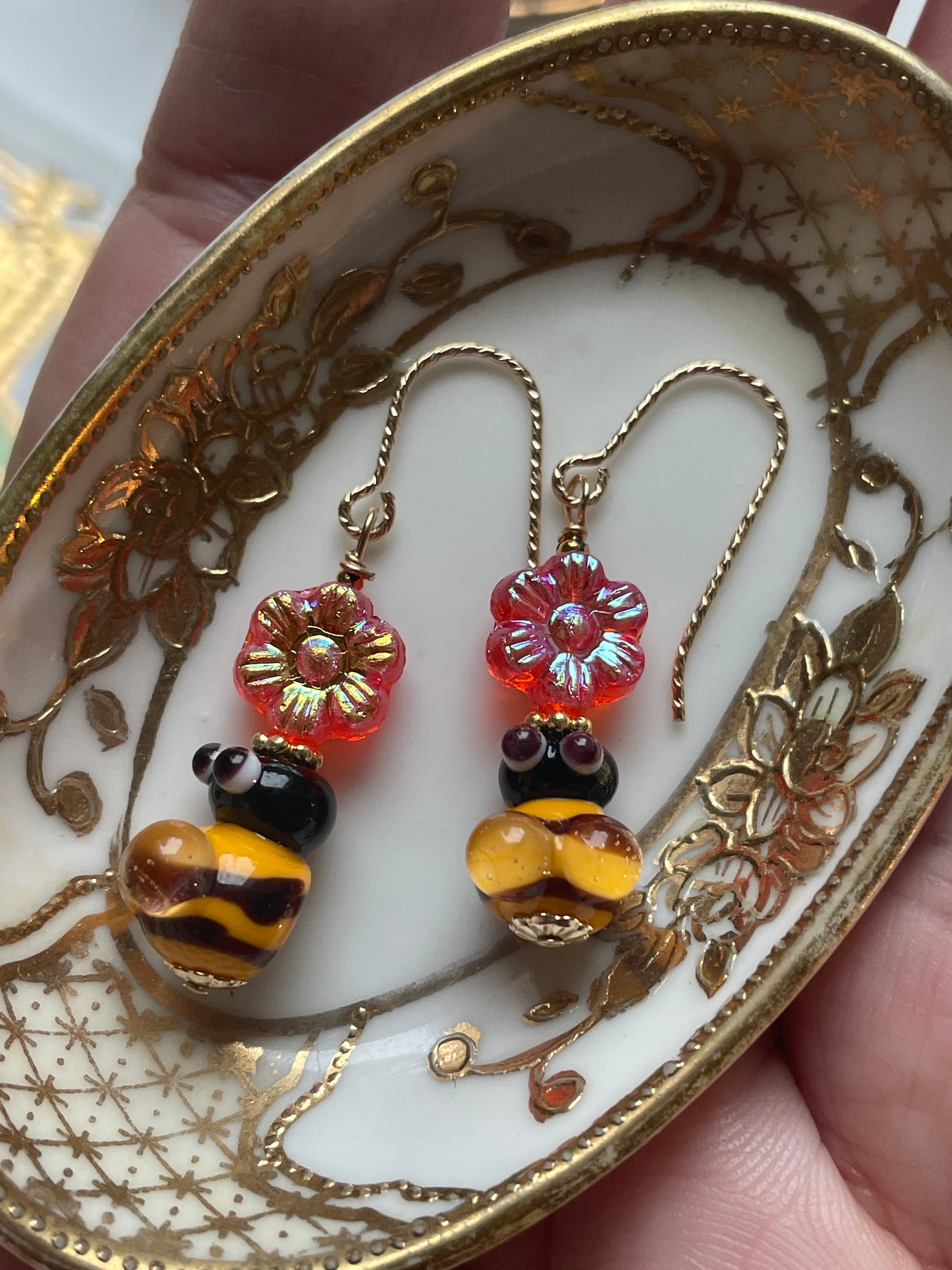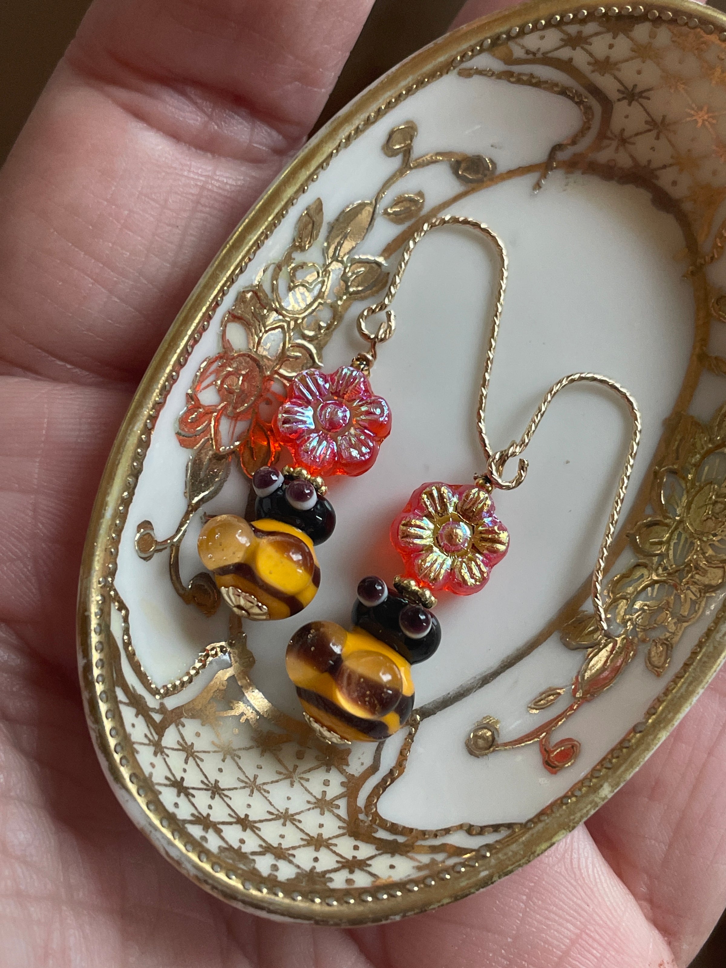 Sweet dainty handmade glass bees have been paired with glass flower beads. All findings are gold filled. These measure approx 1.25 inches with earwires.
