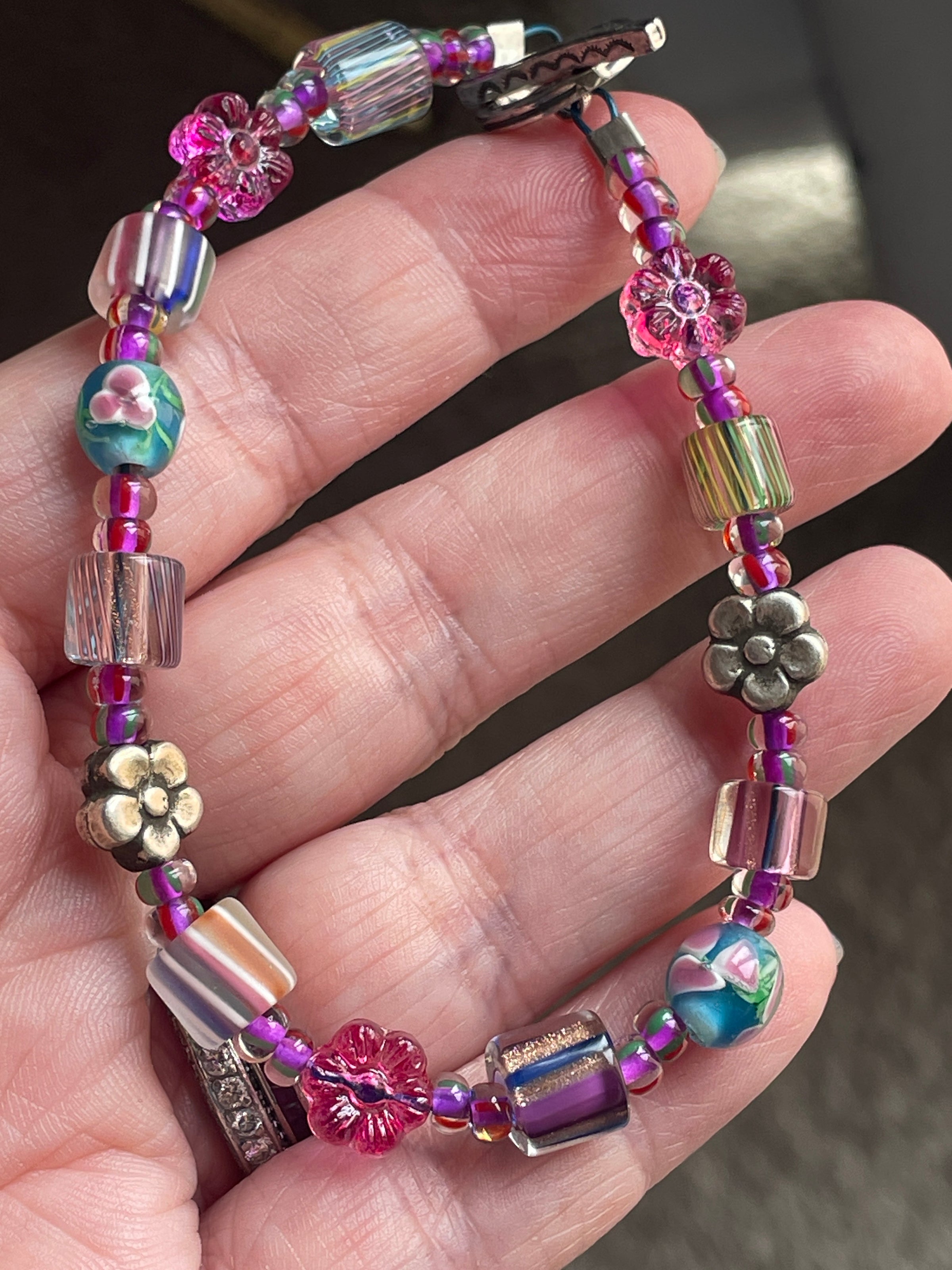 Fabulous Bohemian glass beaded bracelet with rare designer Art Glass beads by David Christensen, vintage sterling beads, Czech glass and vintage lampwork glass. Bracelet has a sterling engraved Toggle clasp.  Bracelet measures approximately 8 inches with the Toggle clasp makes fit smaller.