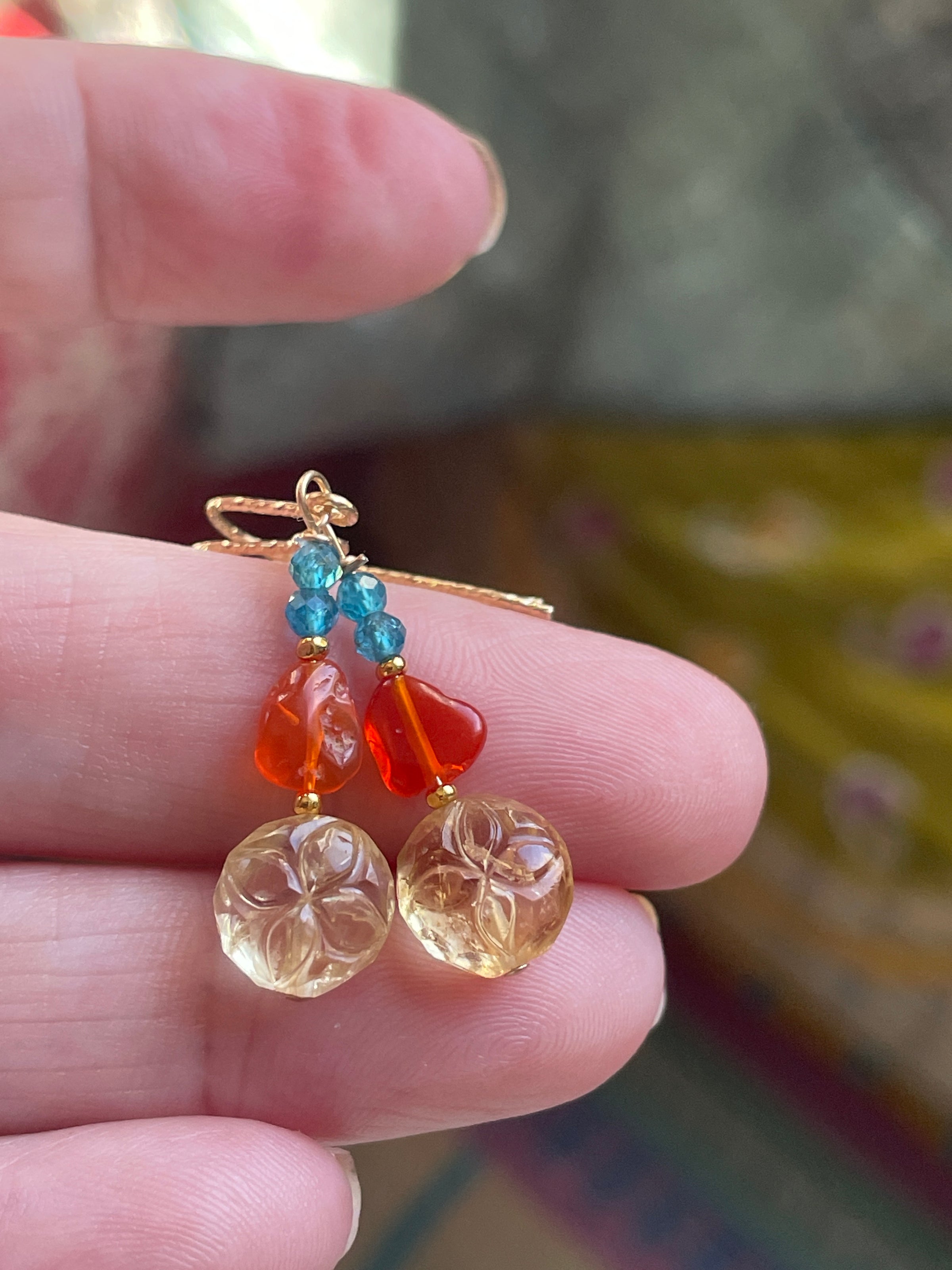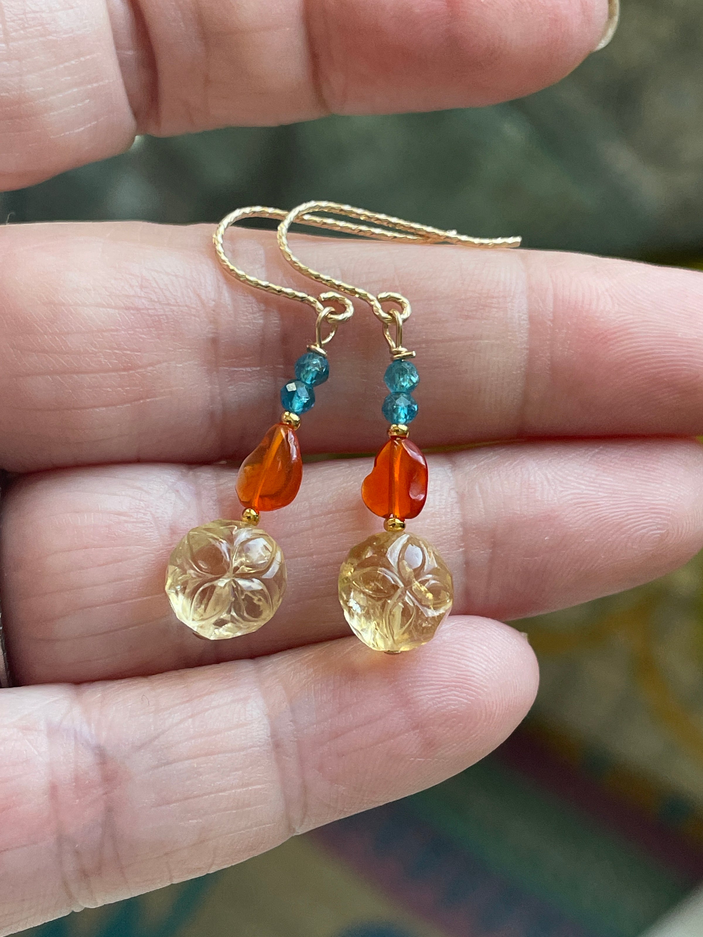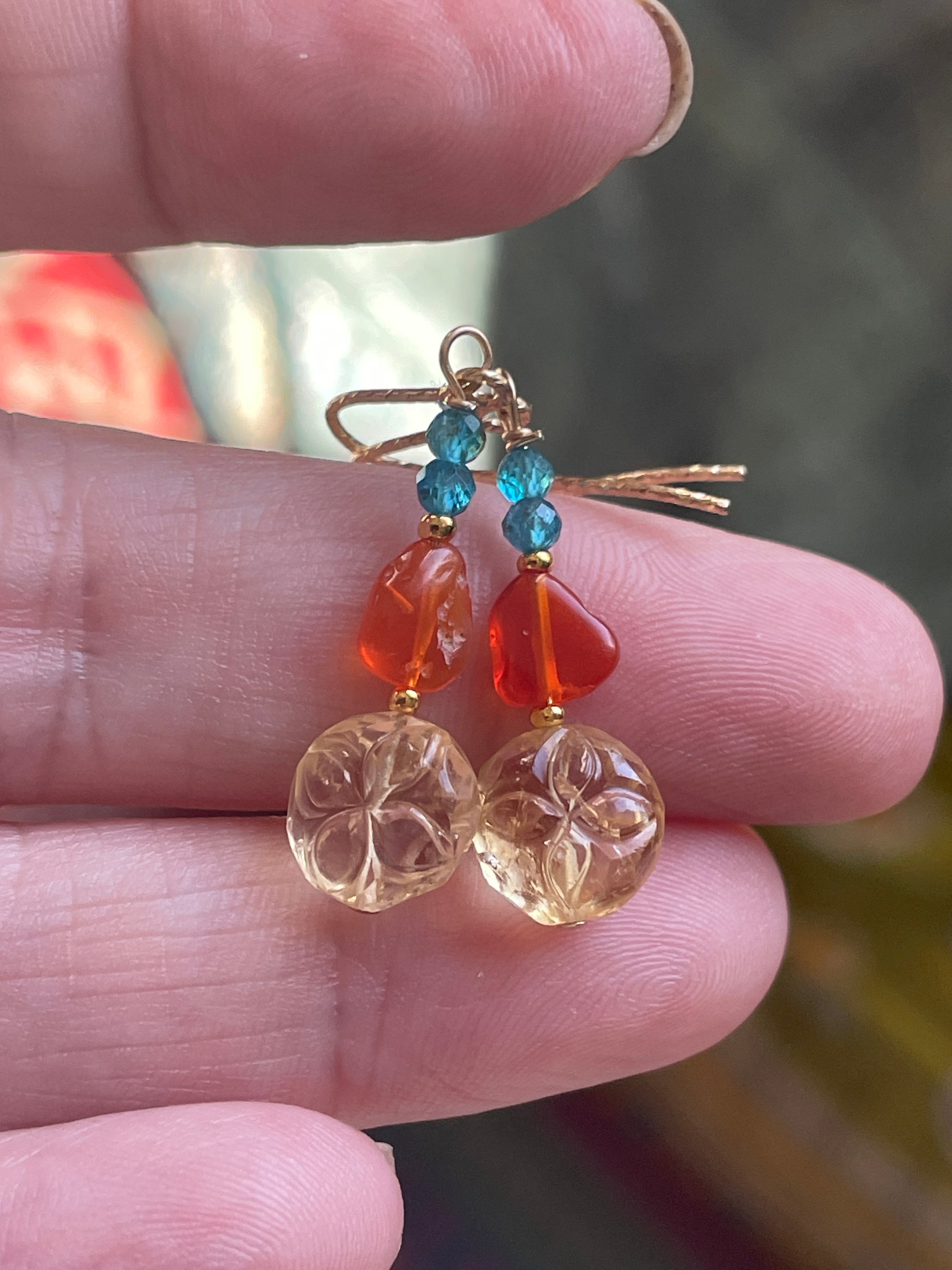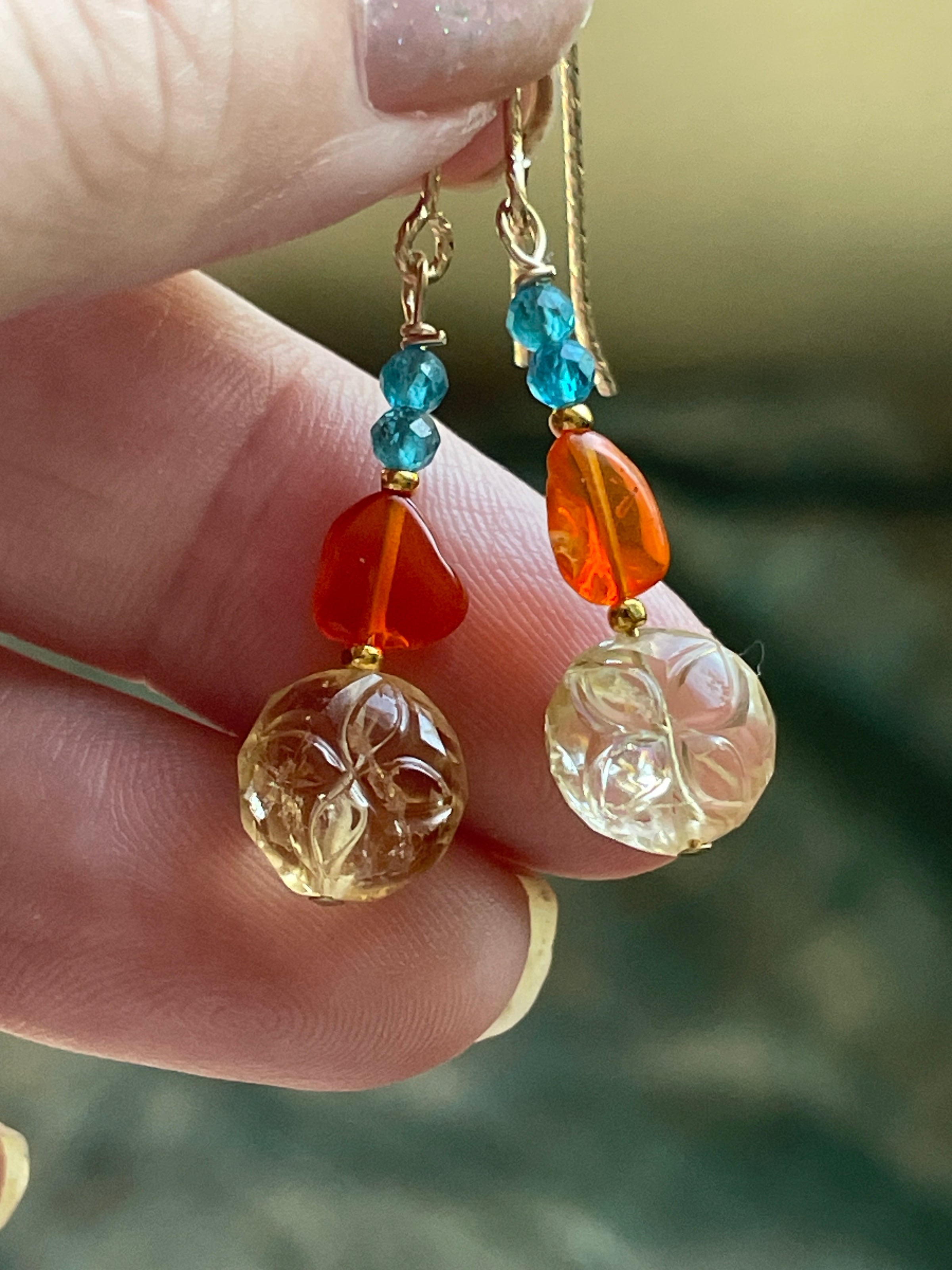 Ultra rare carved Citrine flower beads have been paired with Mexican Fire Opal and delicate Apatite beads. All findings are gold filled. Earwires are a lovely shimmery cut. These measure approx 1.25 inches.