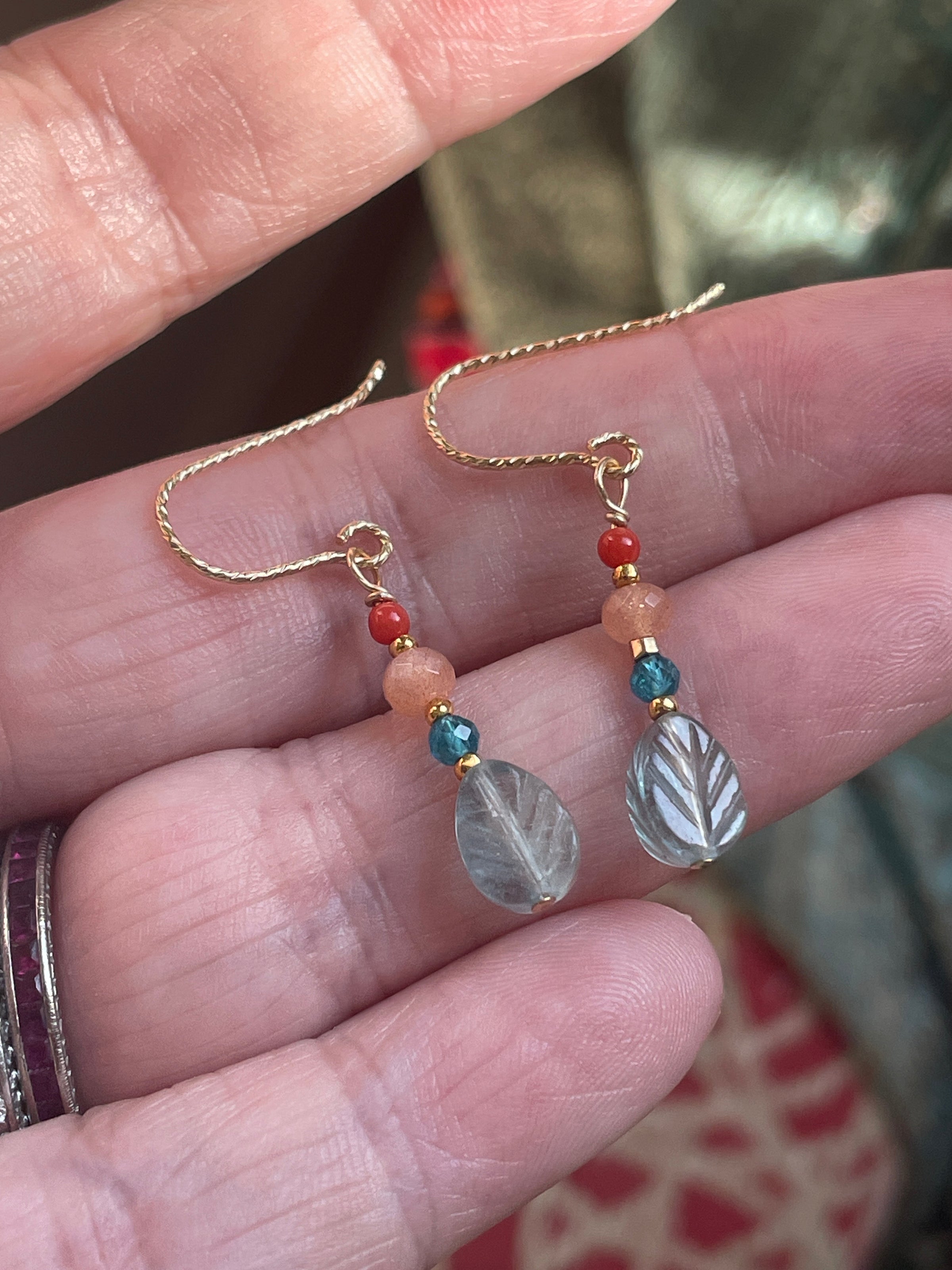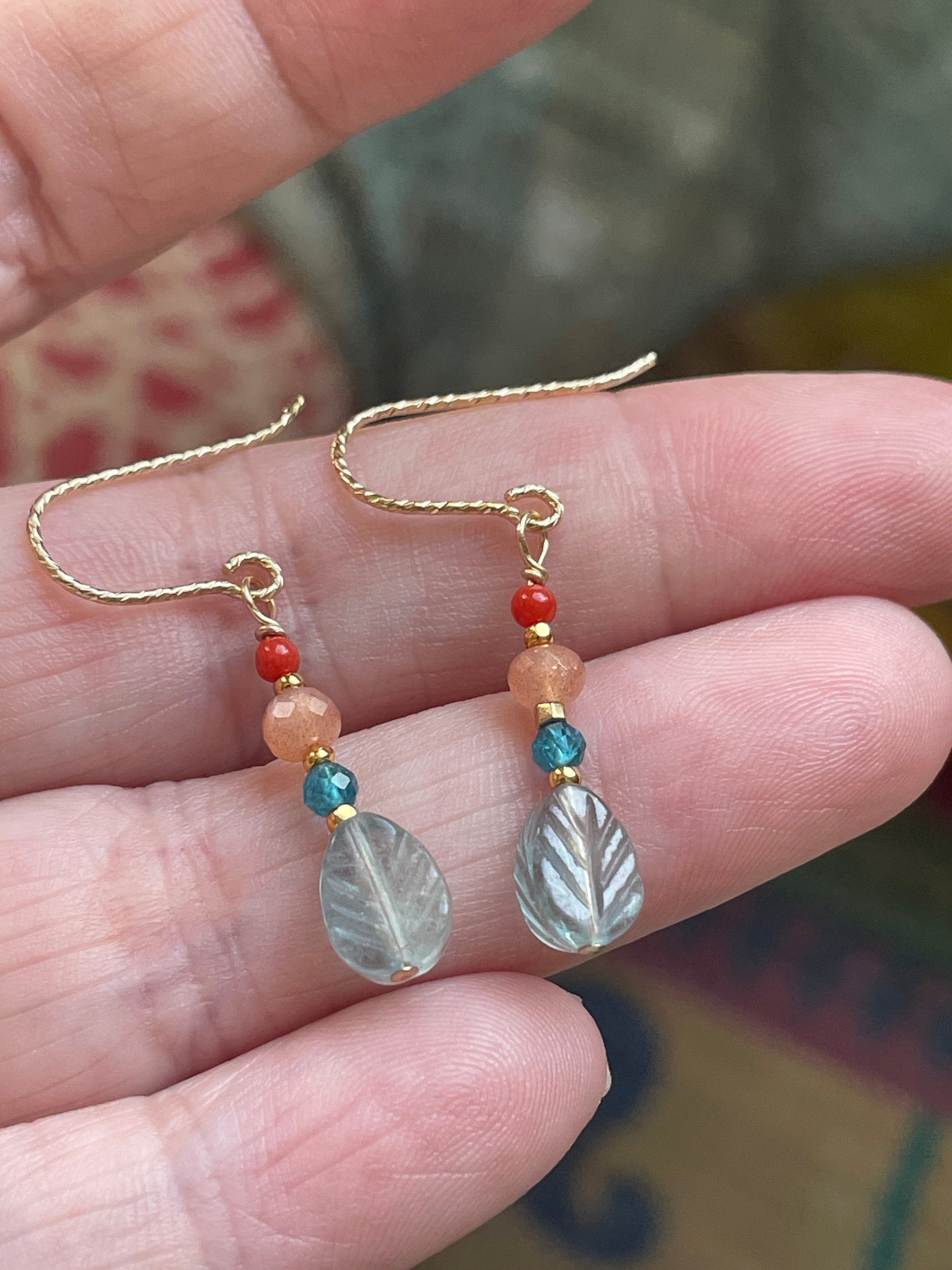 Gorgeous carved Fluorite leaf earrings with Apatite, Peach Moonstone and Coral. All findings are gold filled. These measure just under 1.25 inches.