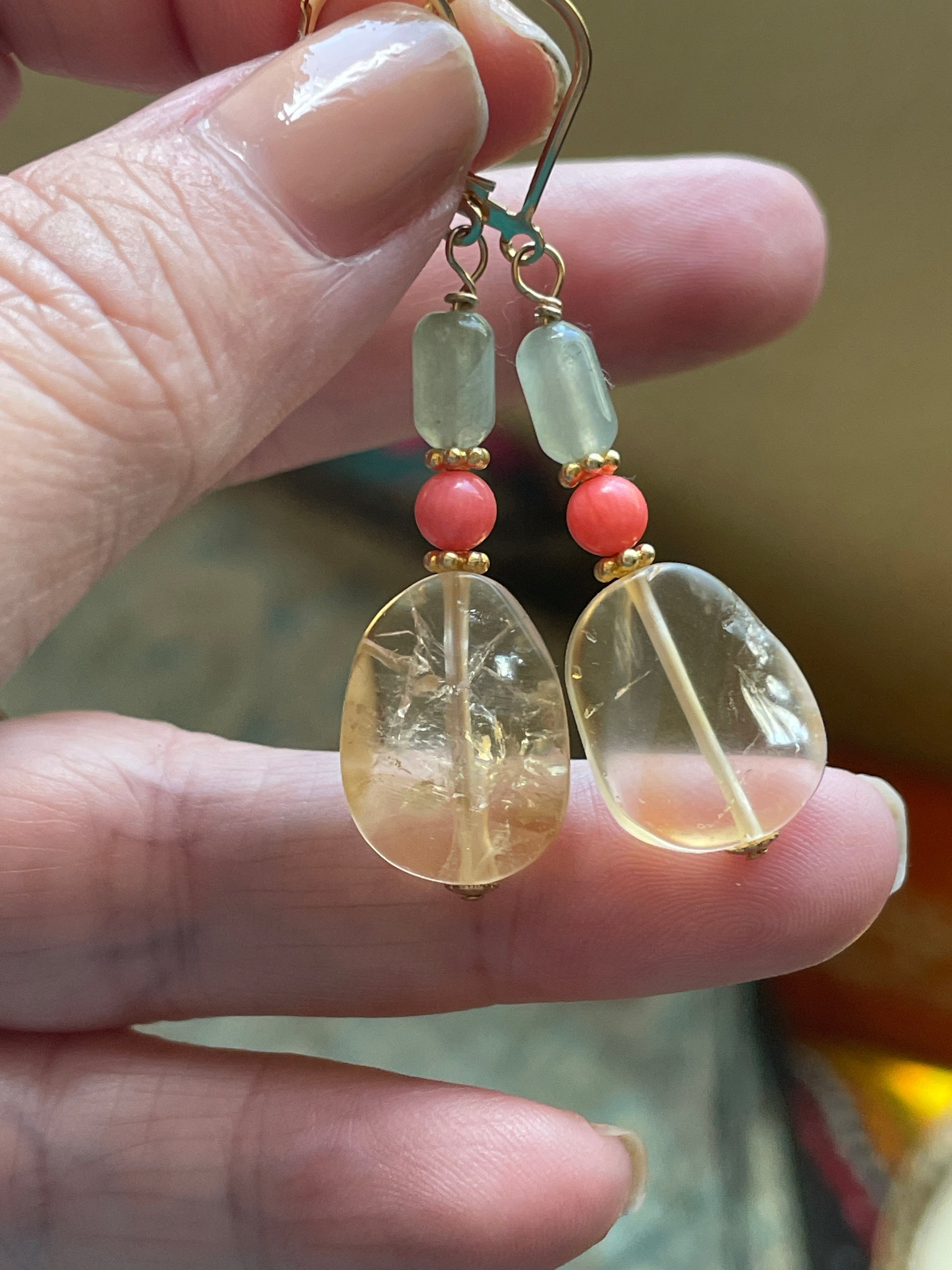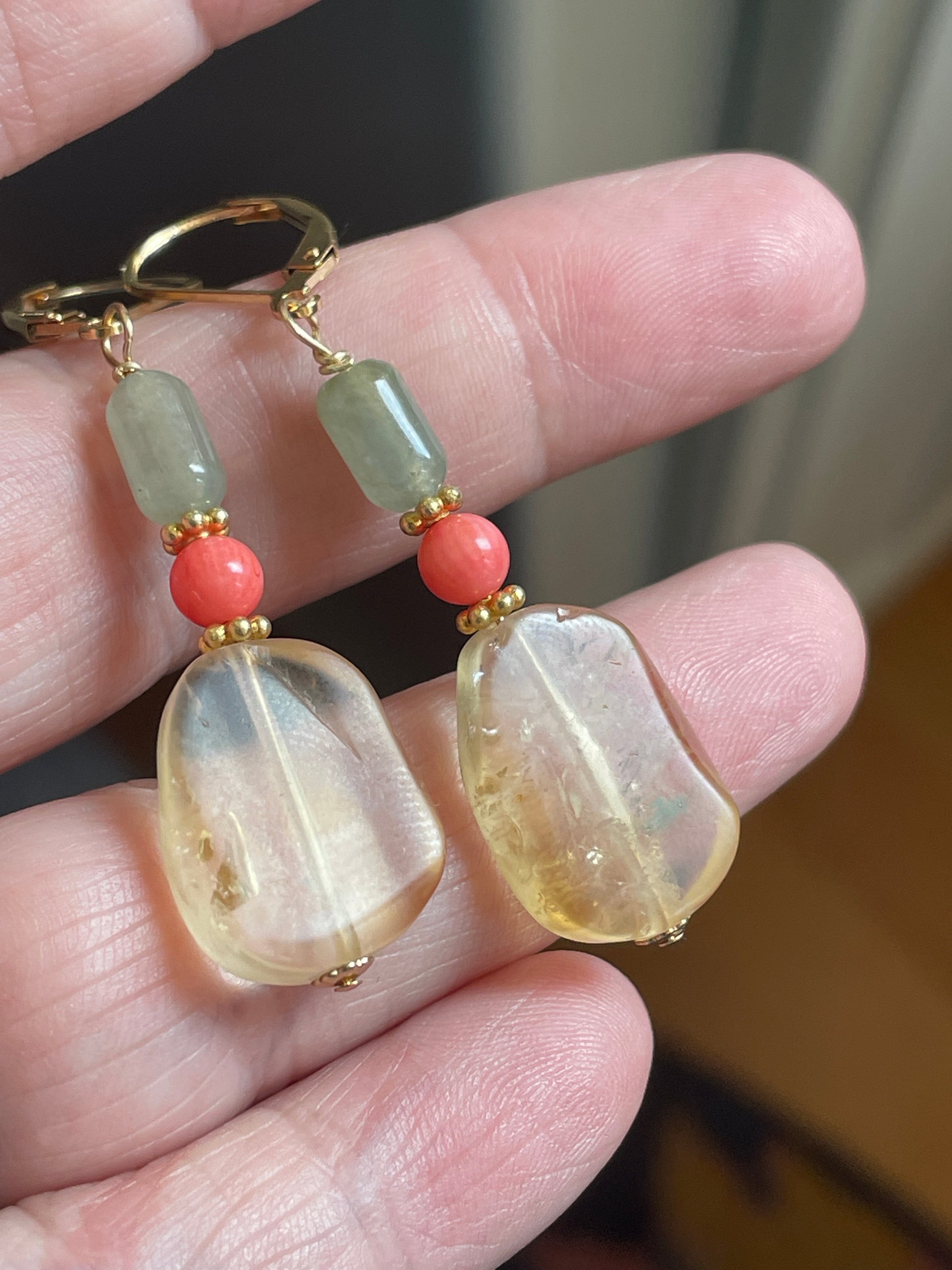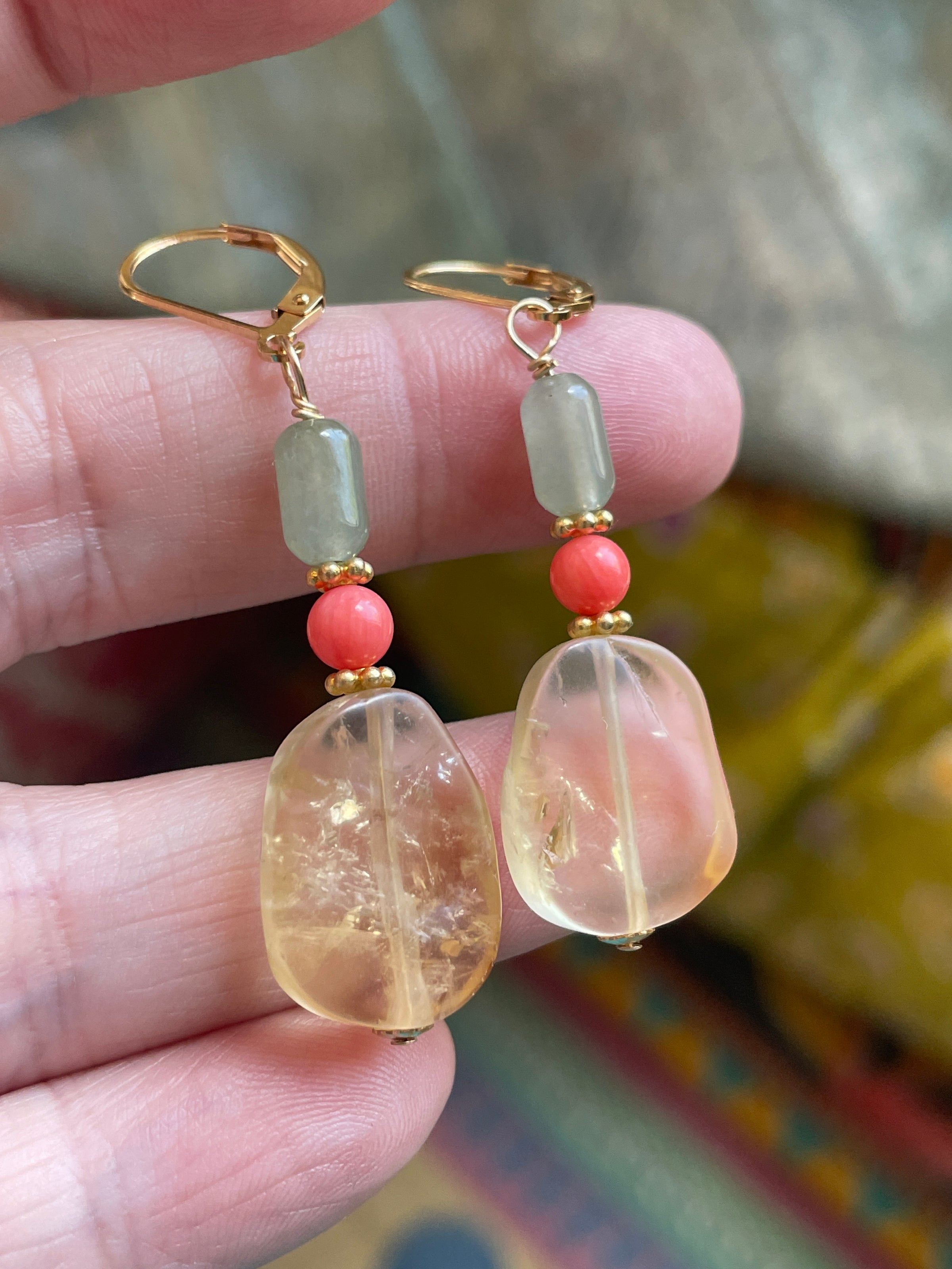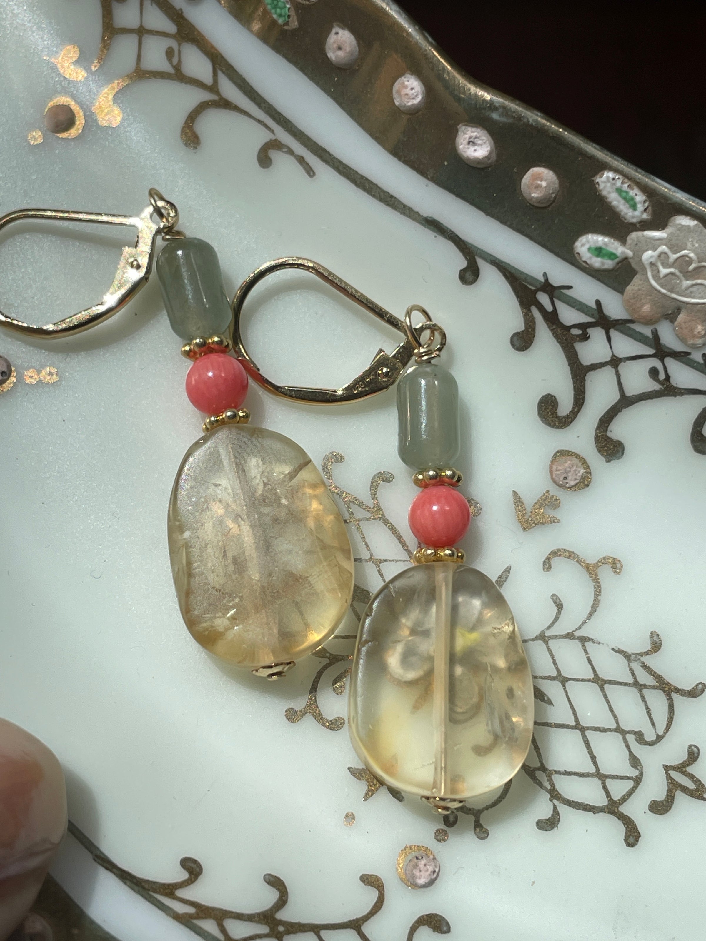 Really unique Citrine beads with natural inclusions paired with Coral and luminous Jade. All findings are gold filled. These measure approx just under 2 inches.