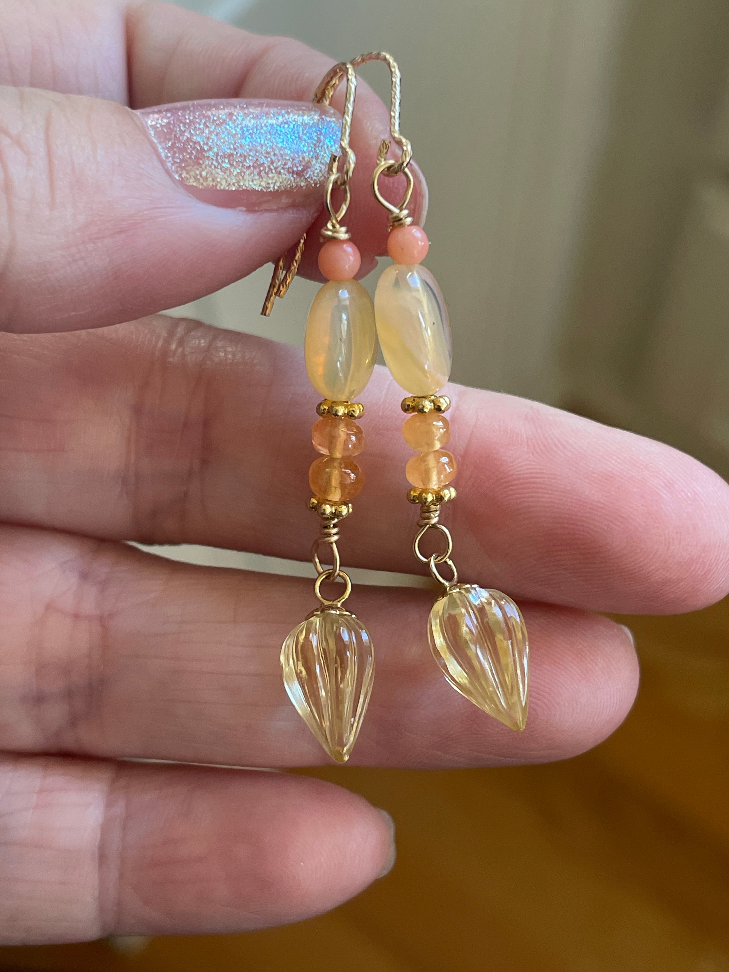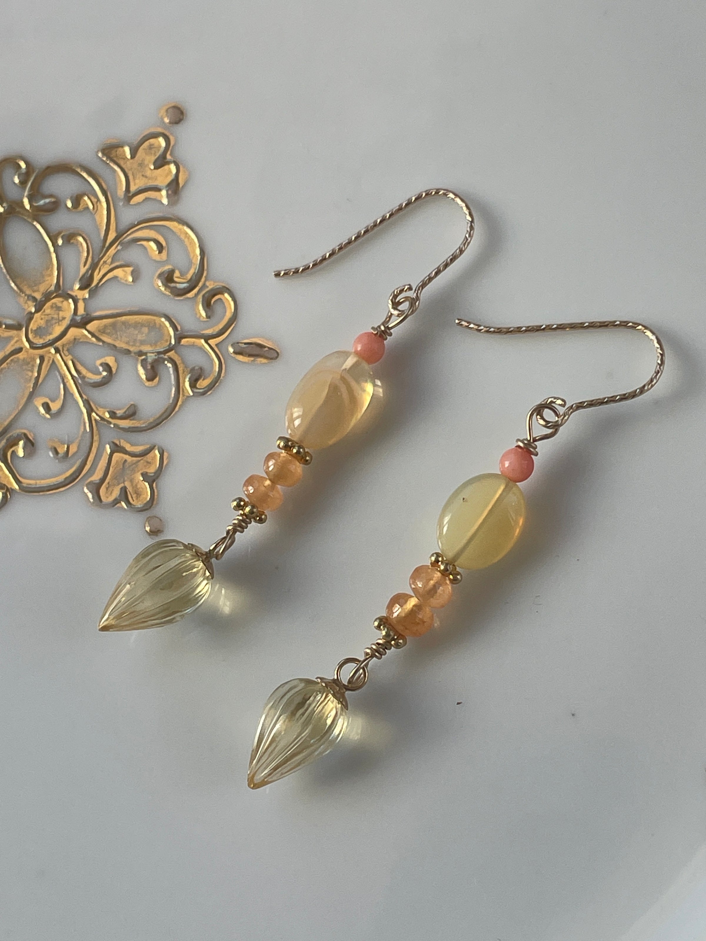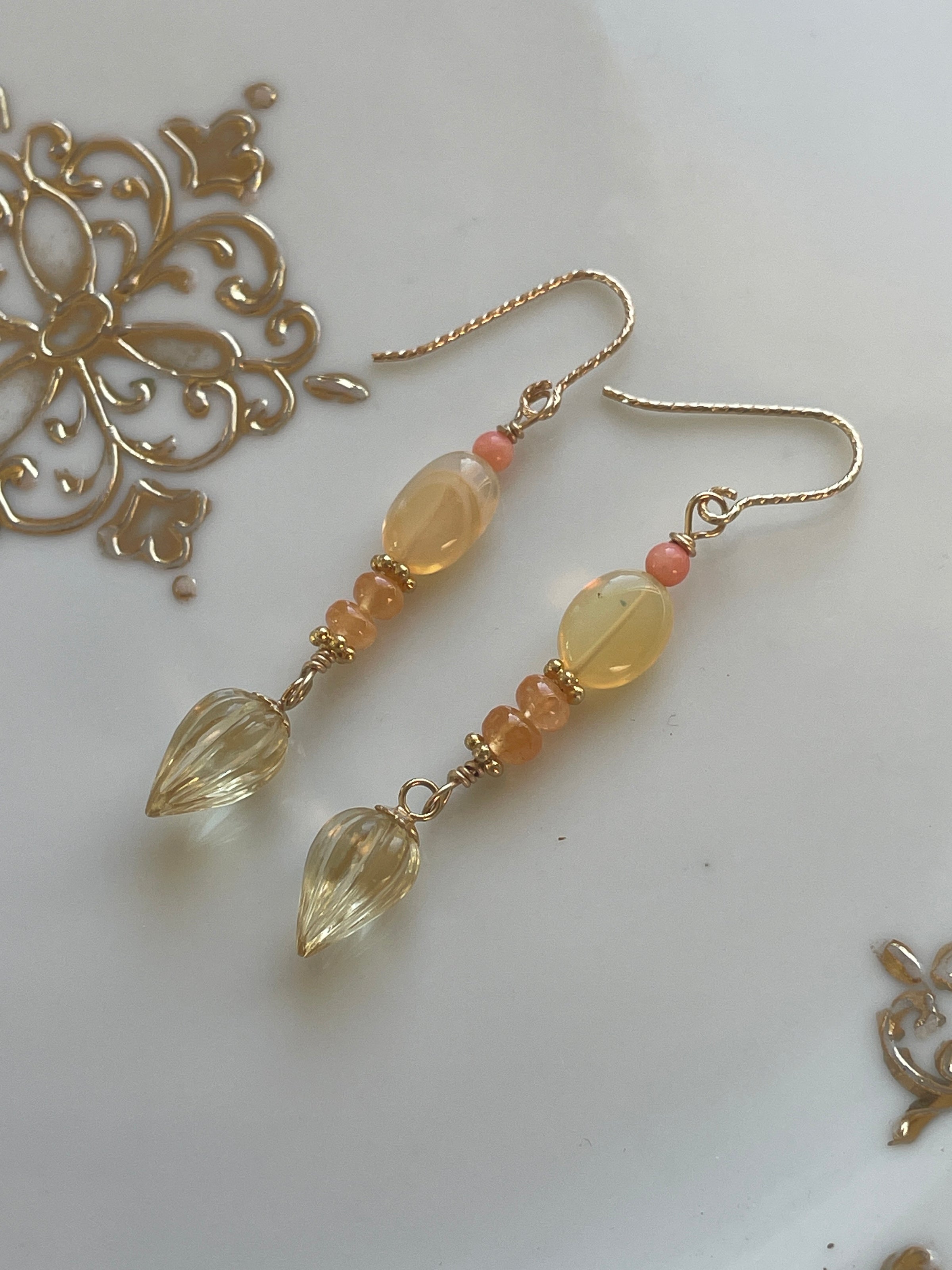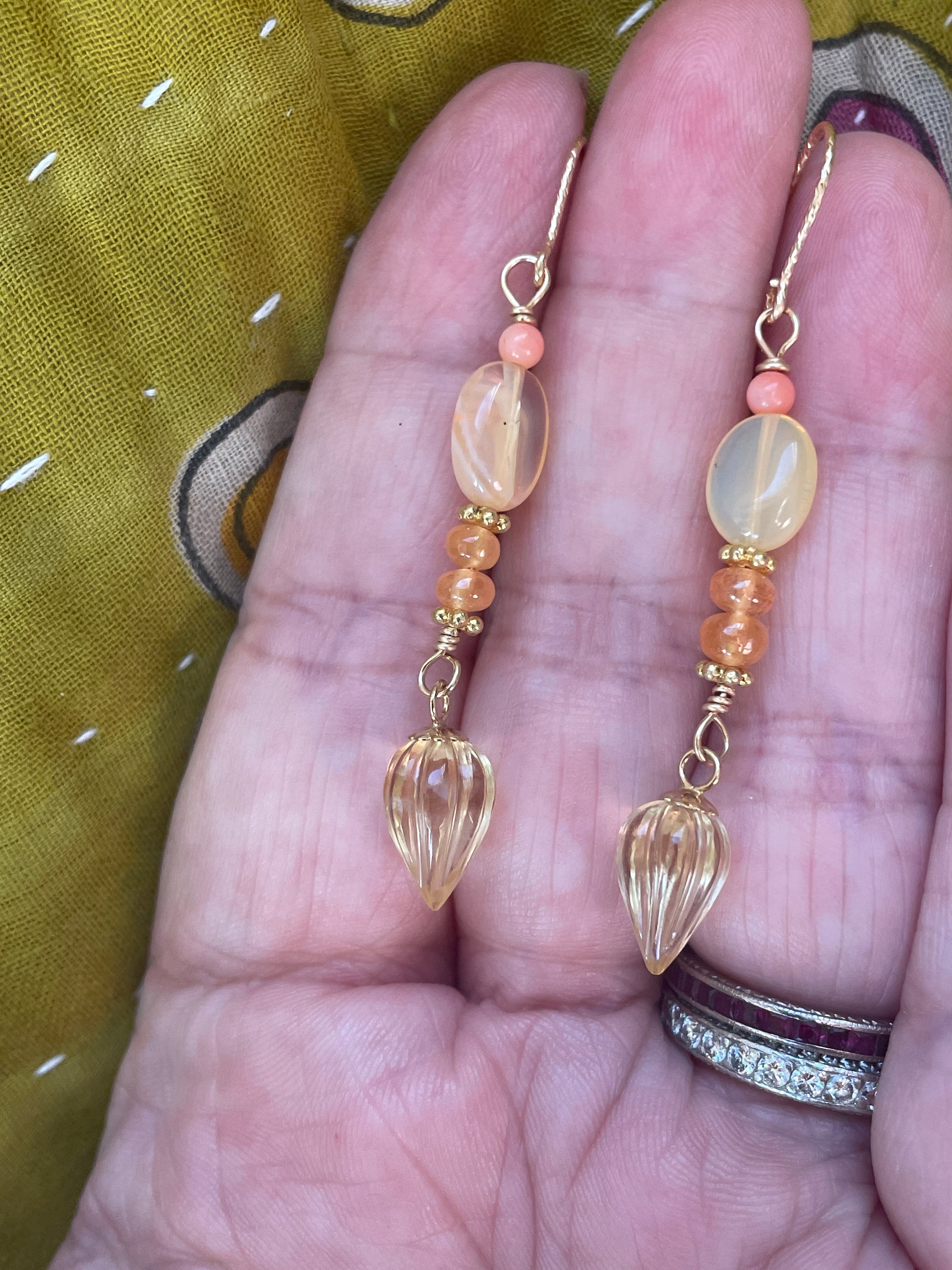Citrine Lantern Drop Earrings - Mexican Fire Opal, Coral and Mandarin Garnet - Gold Filled - Handmade