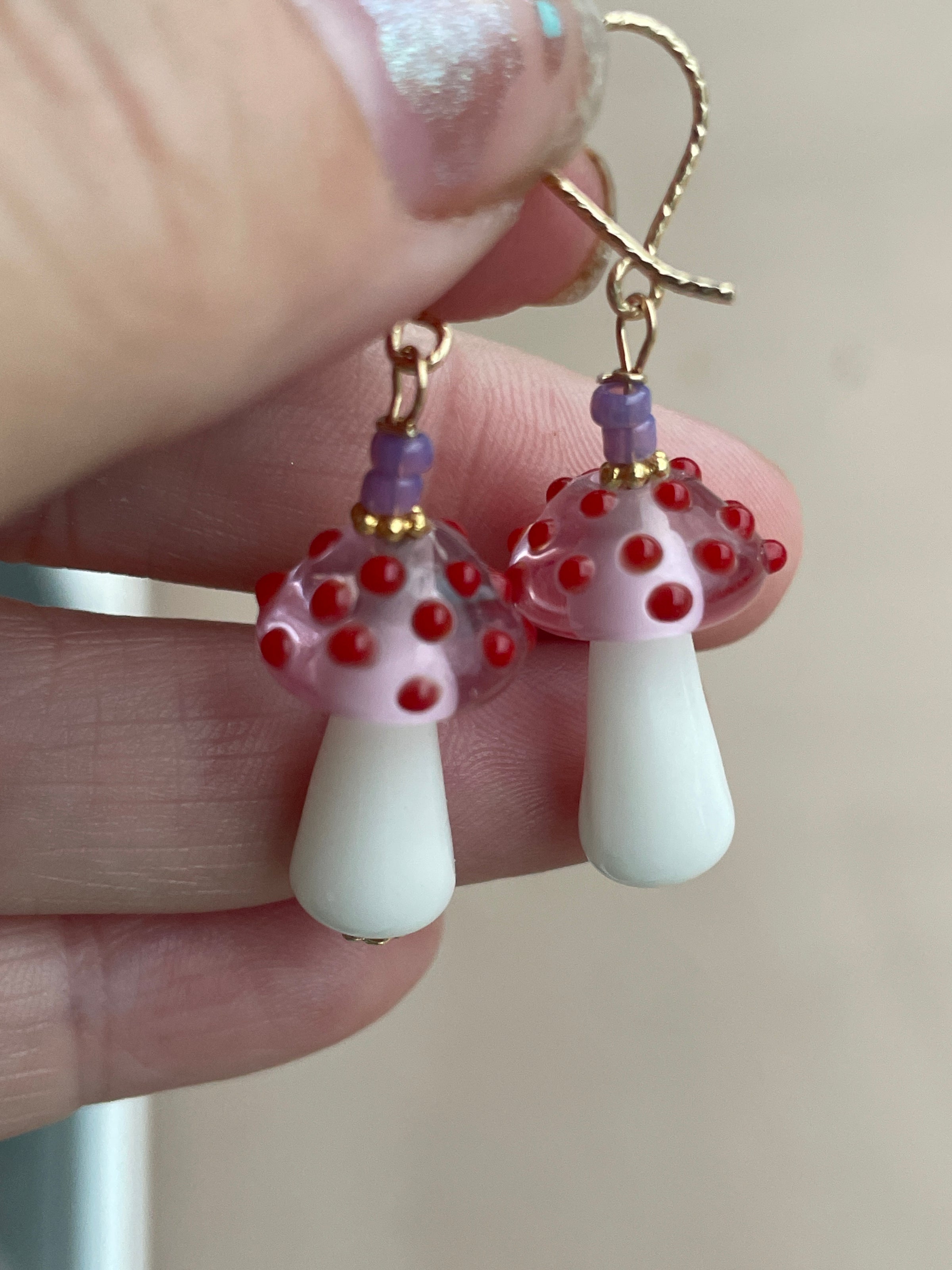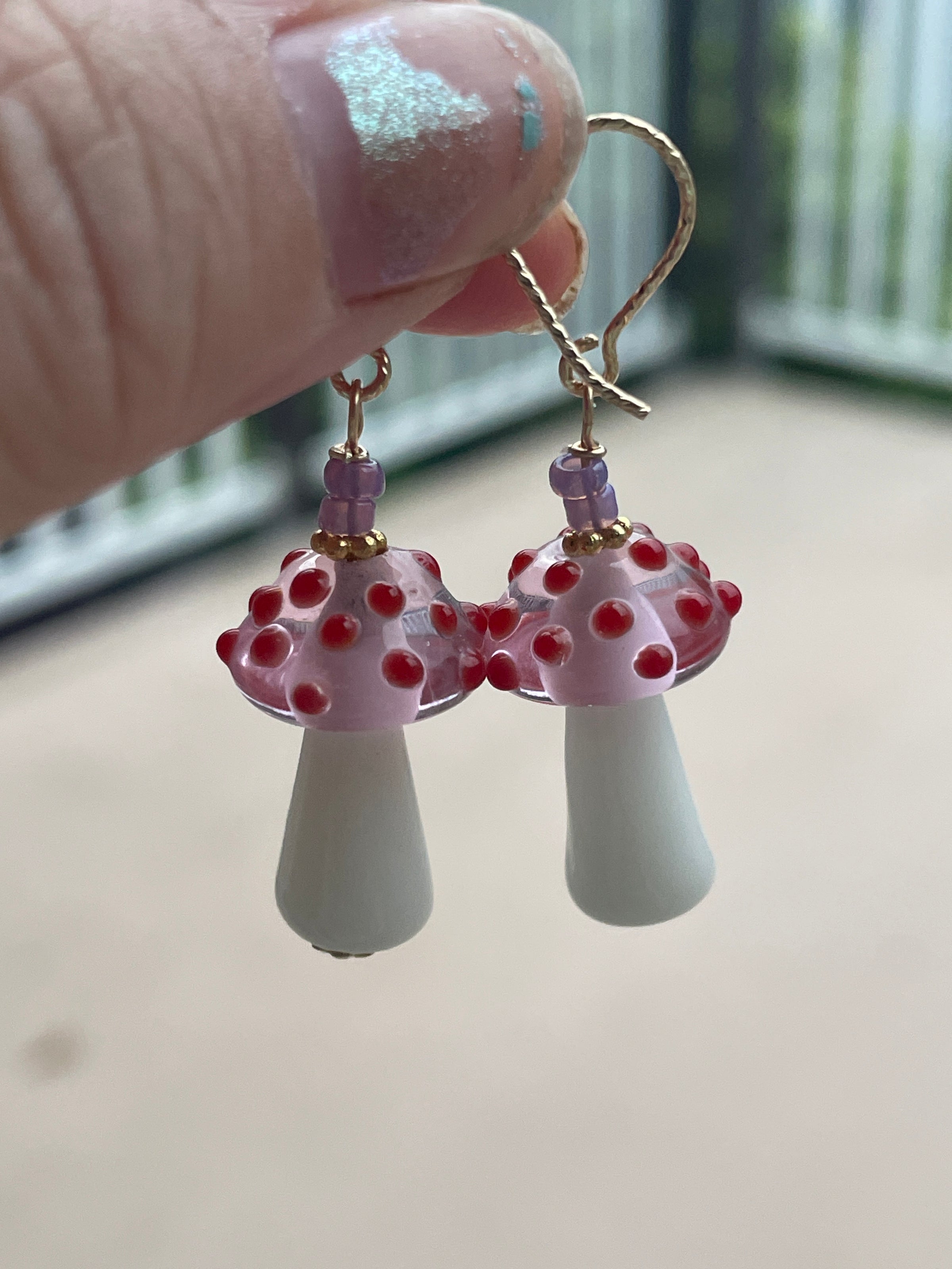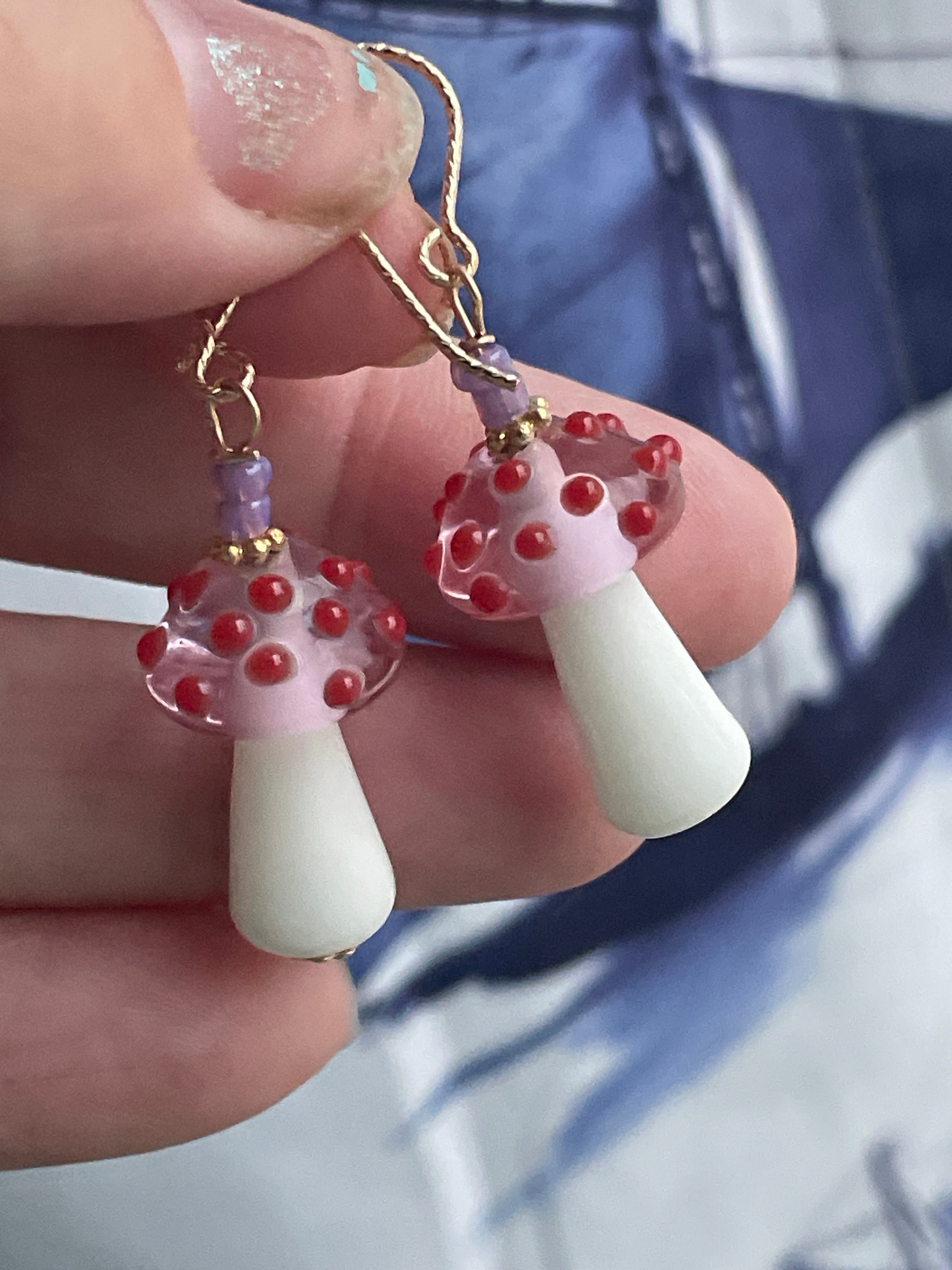 Fabulous Glass mushroom earrings with pink transparent glass and red polka dots.  These have been paired with rare Opal glass beads in a beautiful lavender shade.  All findings are gold filled including the shimmering earwires.  These measure just over 1.5 inches with earwires.