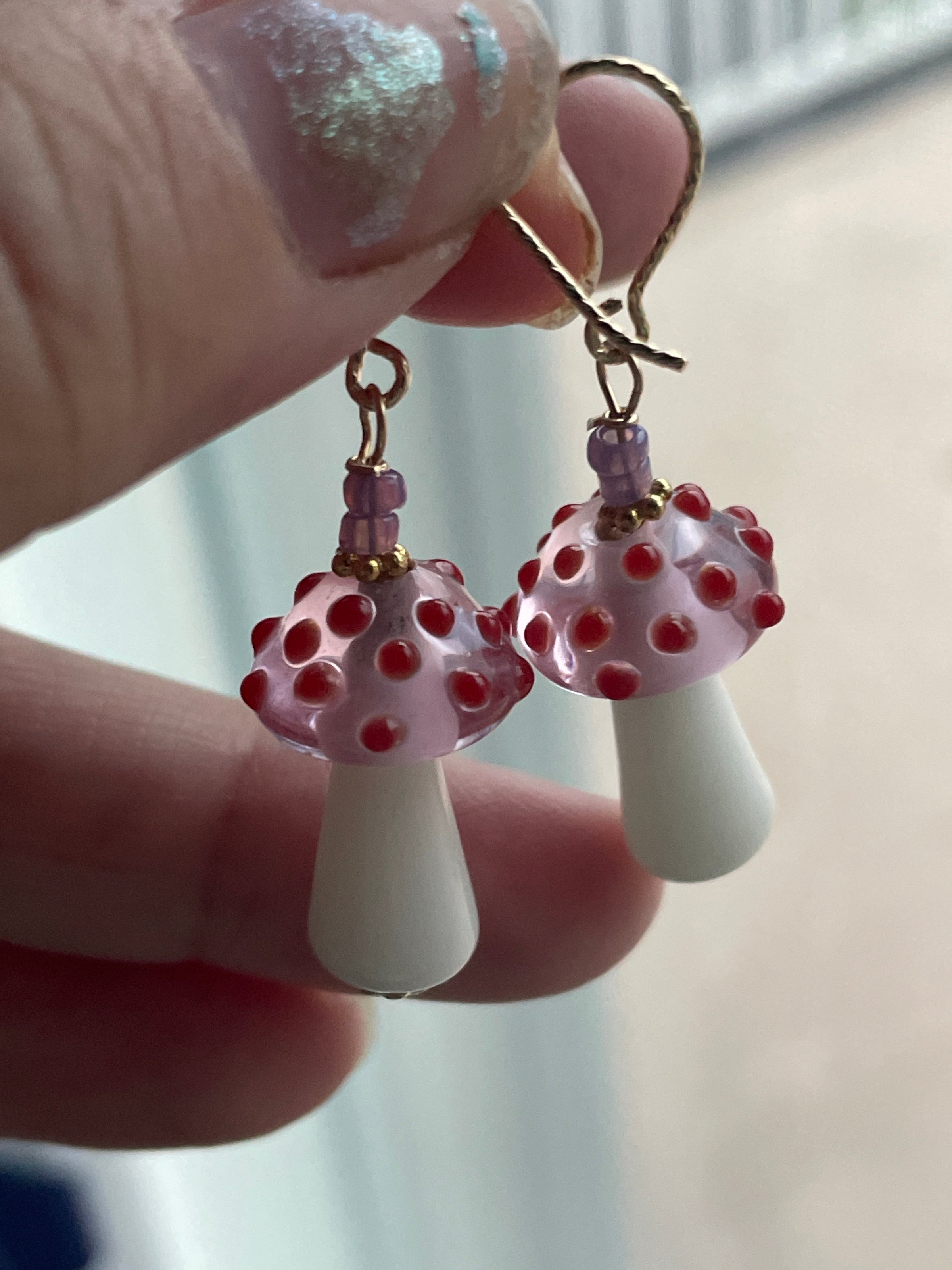 Glass Mushroom Earrings - Opal Glass - Gold Filled - Handmade