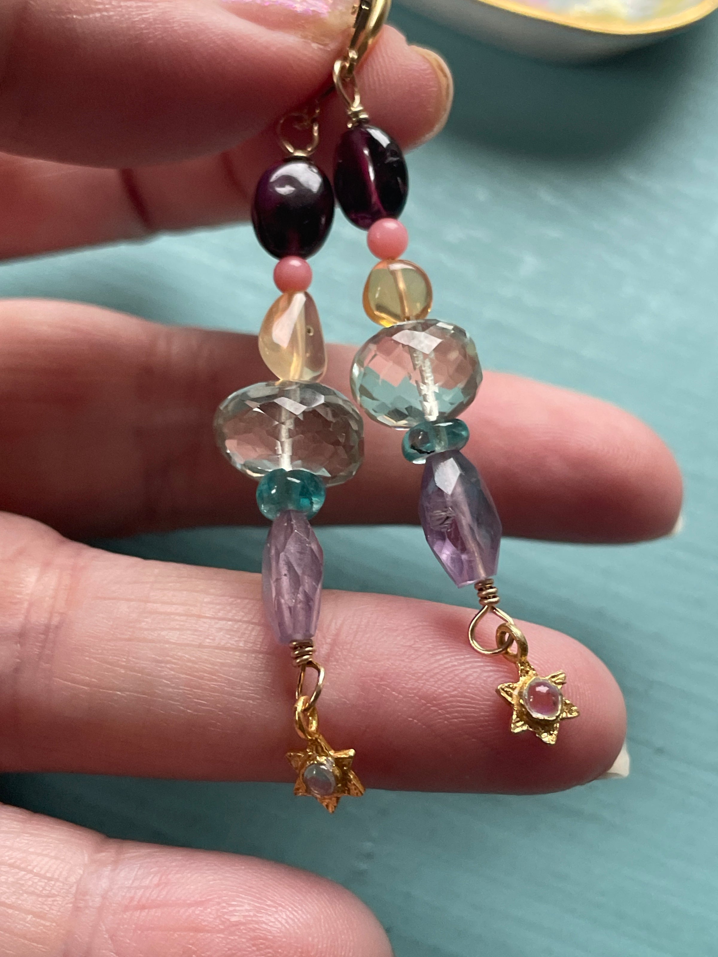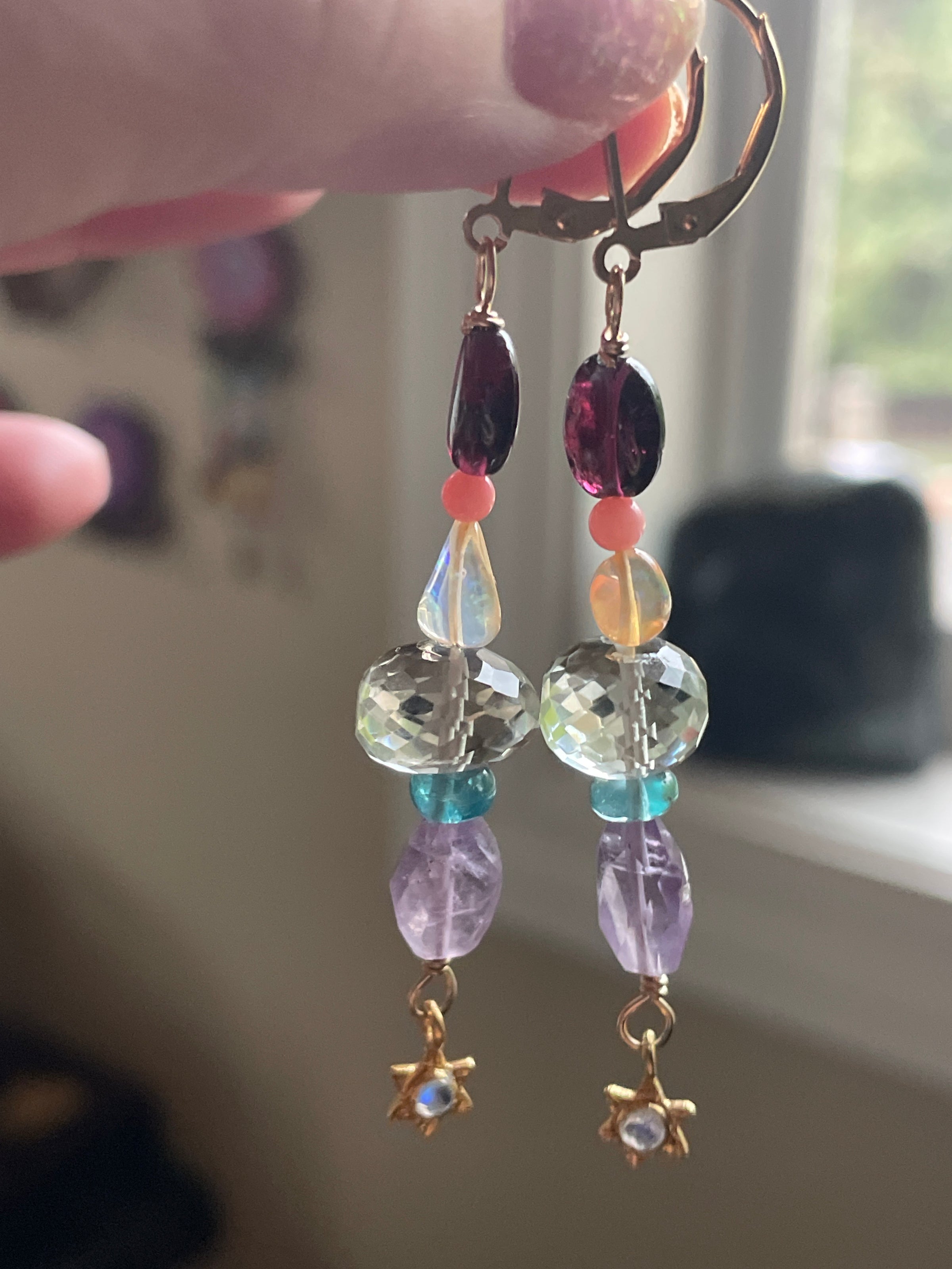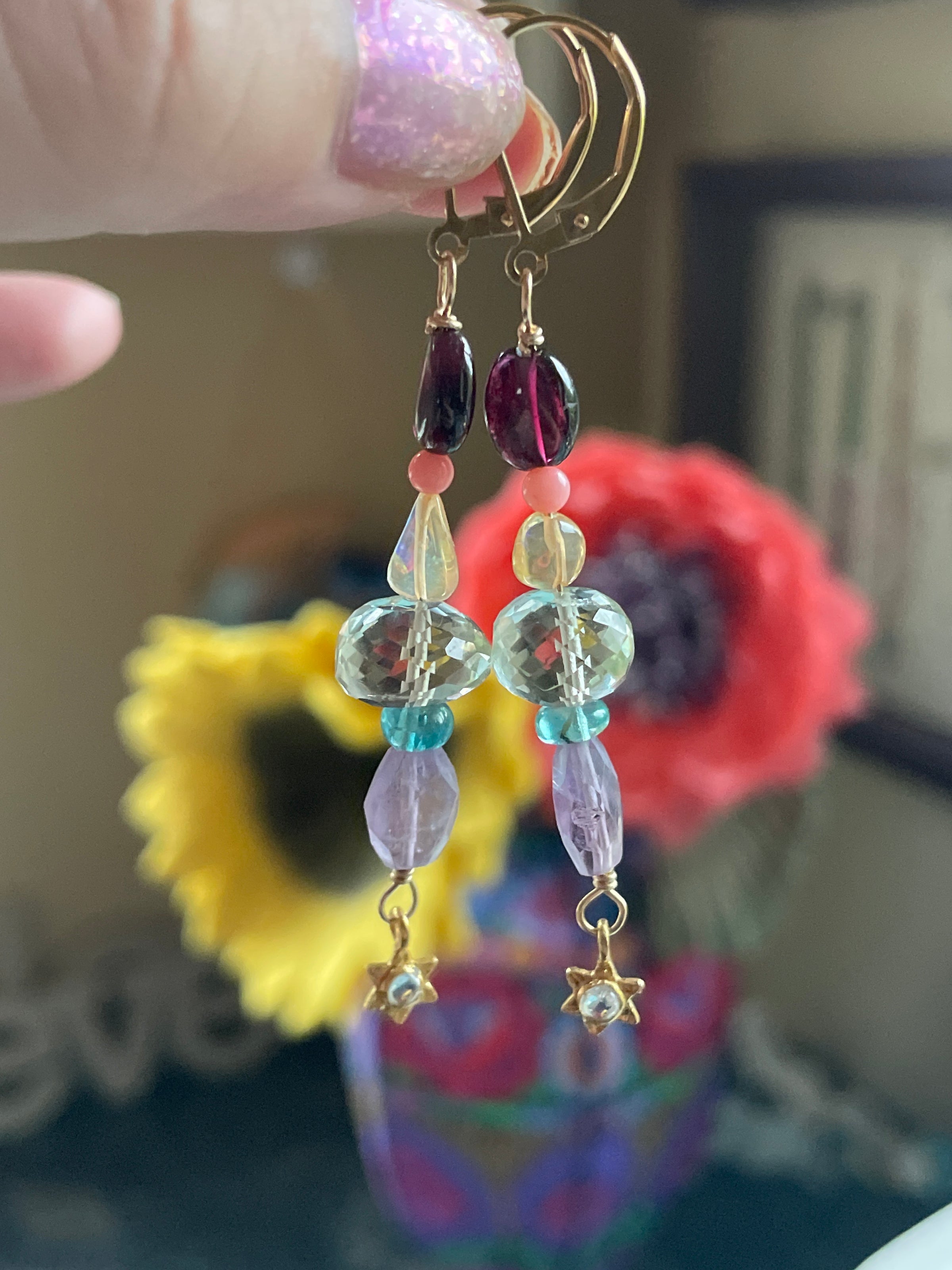 Rainbow Gemstone earrings in gold filled metal with Moonstone Star drops. These are so luminous and shimmery. Earrings measure approx 2.5 inches with Moonstone Stars. Stones are: Garnet, Coral, Mexican Fire Opal, Prehnite, Apatite and Amethyst. All findings are gold filled except dangling Stars which are Gold over Sterling Silver.