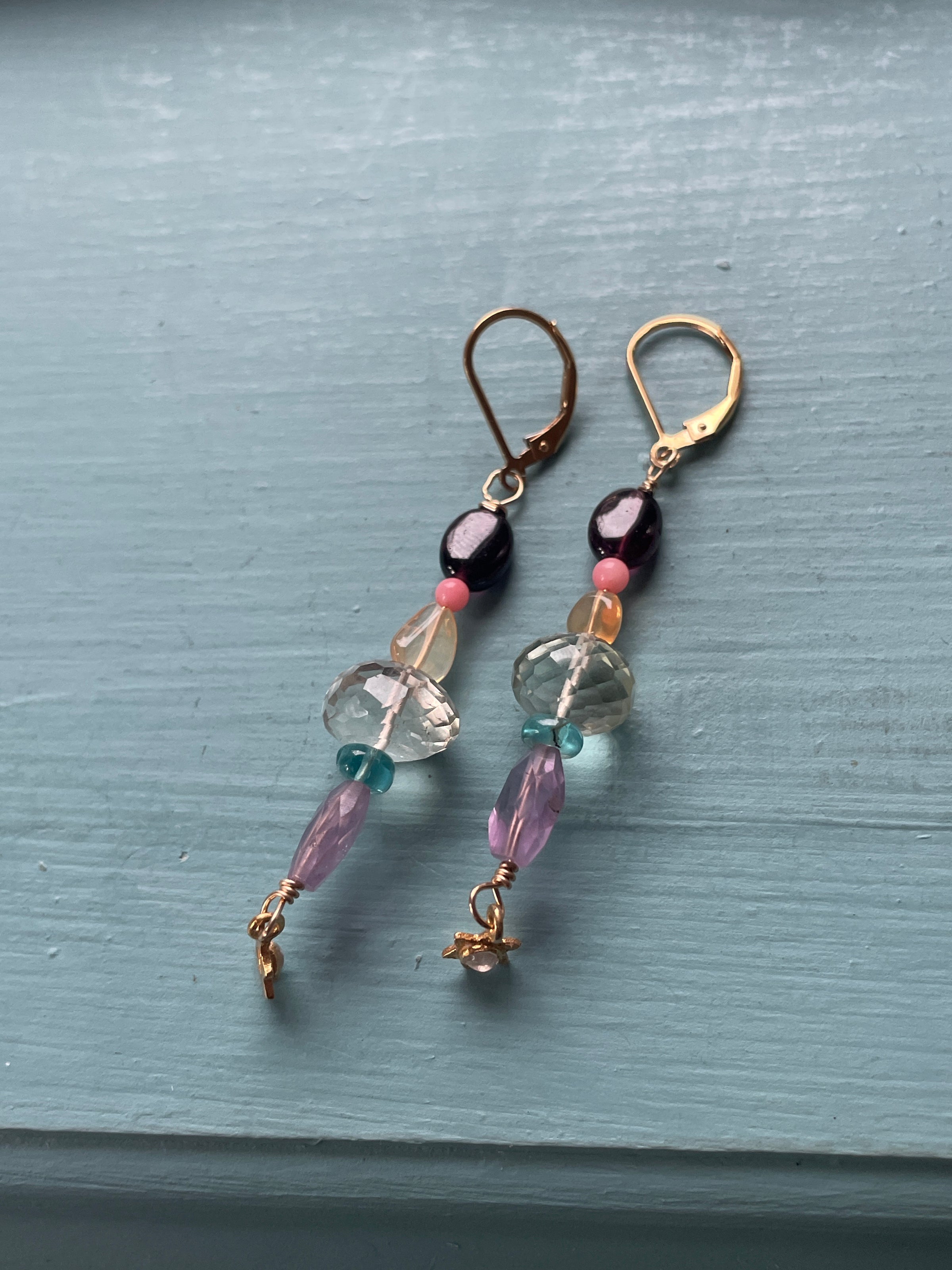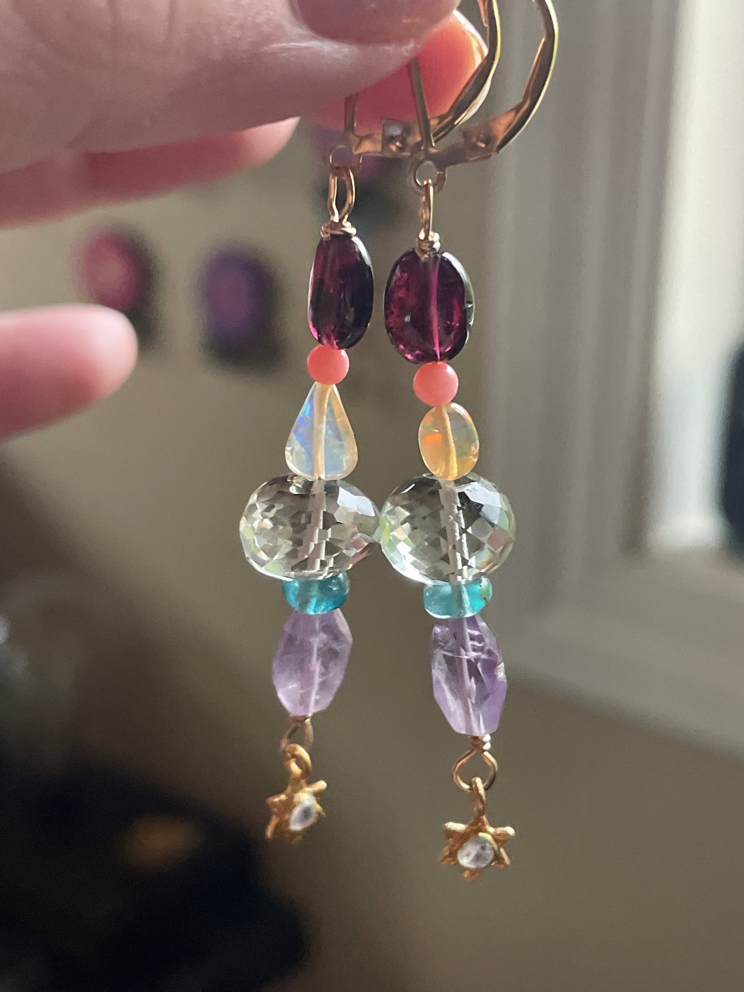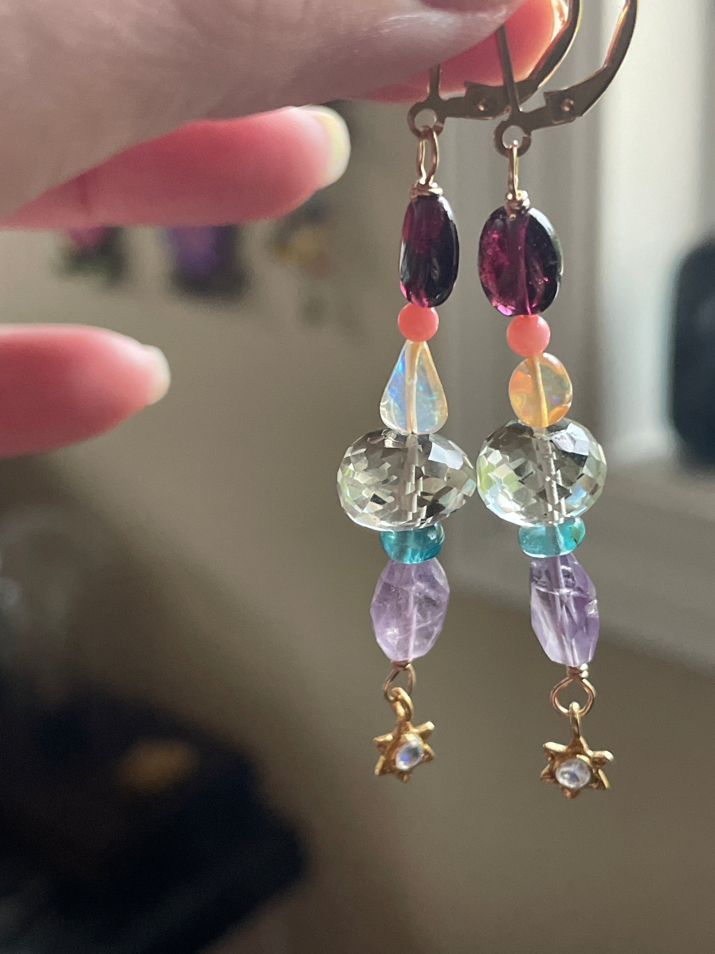 Rainbow Gemstone earrings in gold filled metal with Moonstone Star drops. These are so luminous and shimmery. Earrings measure approx 2.5 inches with Moonstone Stars. Stones are: Garnet, Coral, Mexican Fire Opal, Prehnite, Apatite and Amethyst. All findings are gold filled except dangling Stars which are Gold over Sterling Silver.