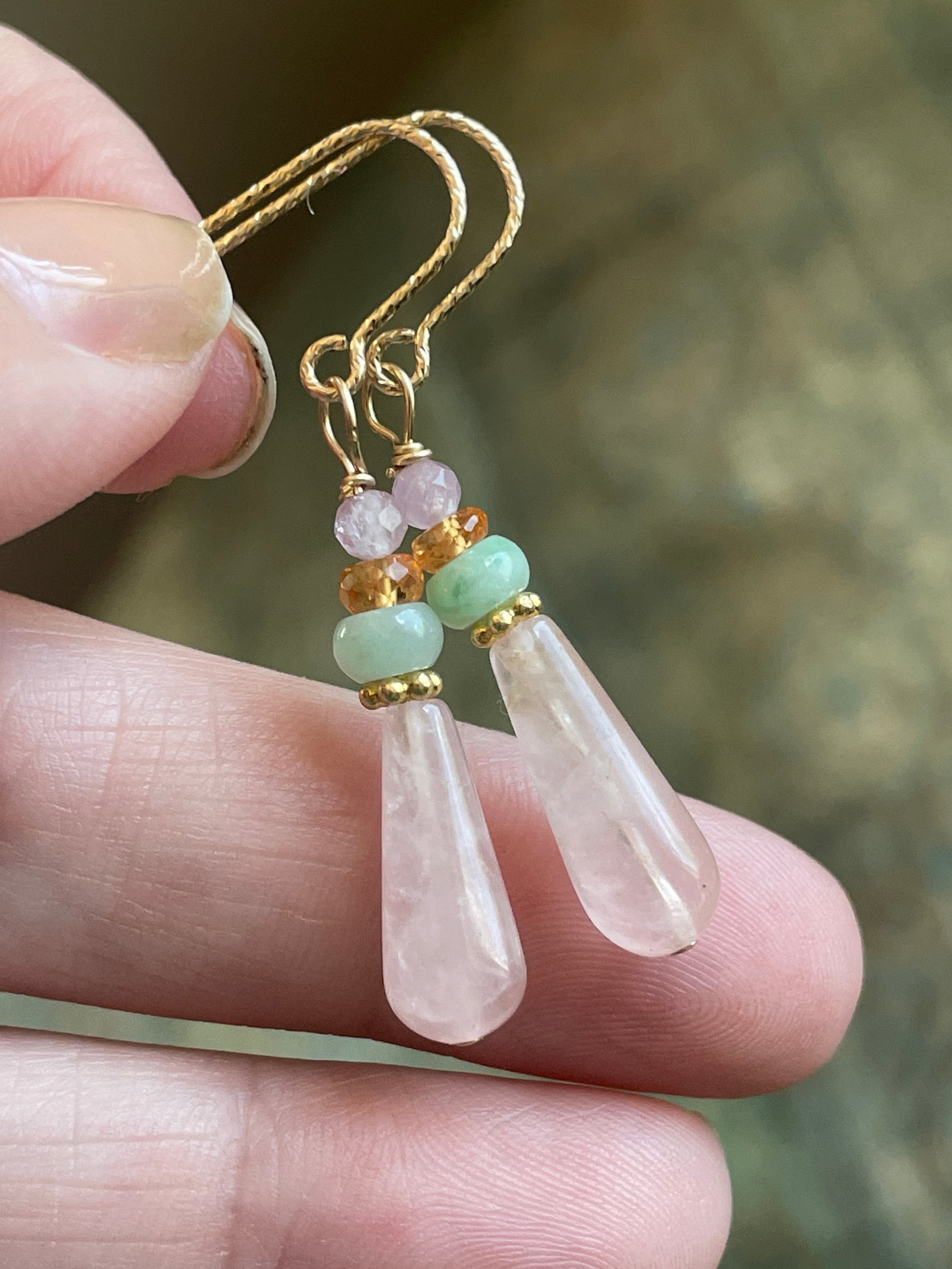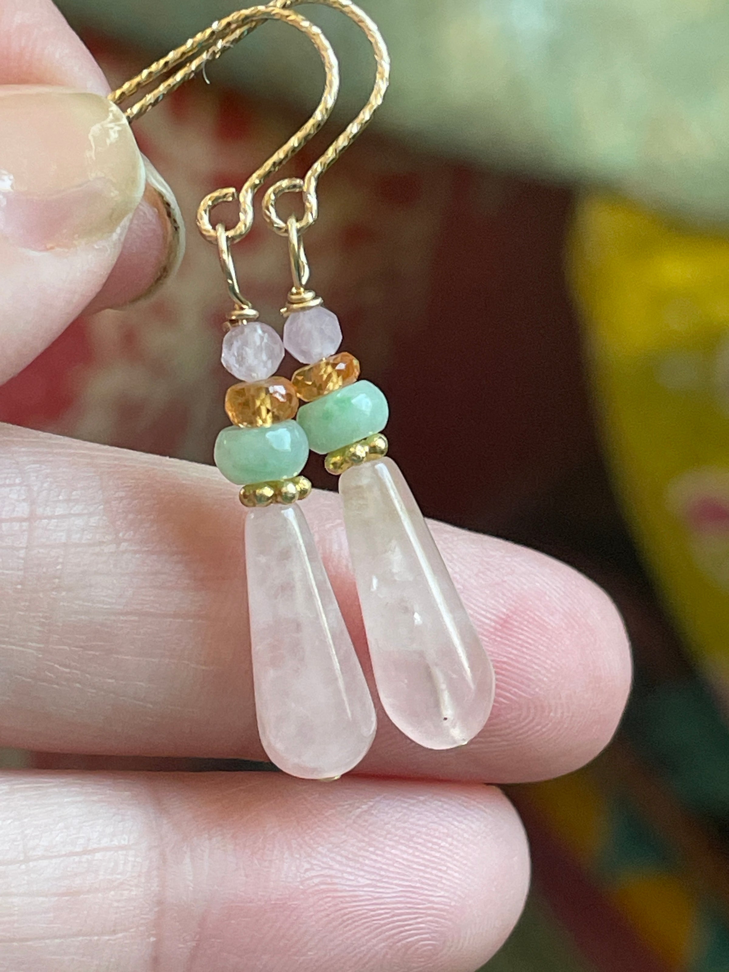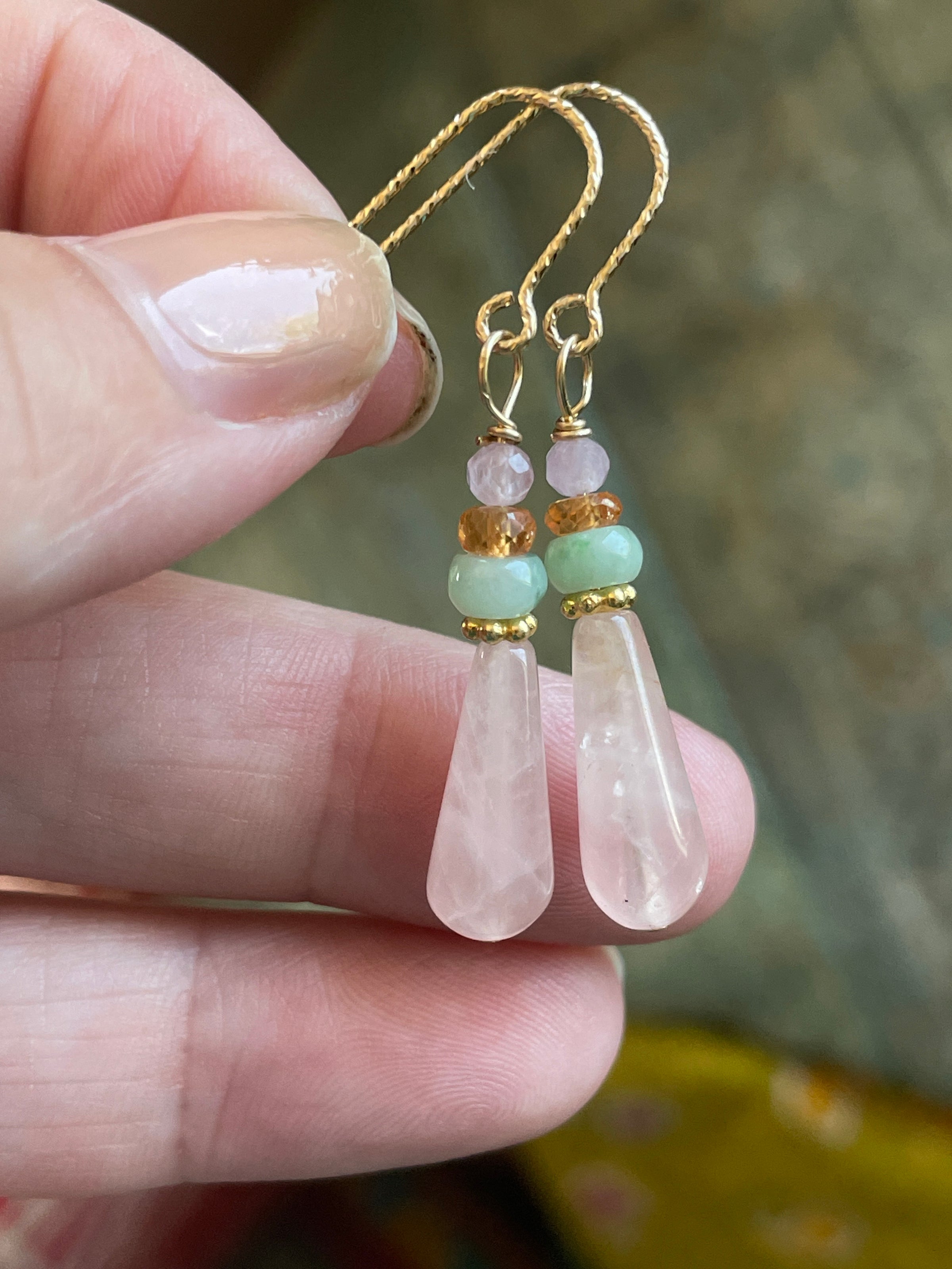 Luminous Rose Quartz drops have been paired with Jade, Mandarin Garnet and Kunzite. Beautiful soft shades together. These measure approx 1.5 inches. All findings are gold filled.