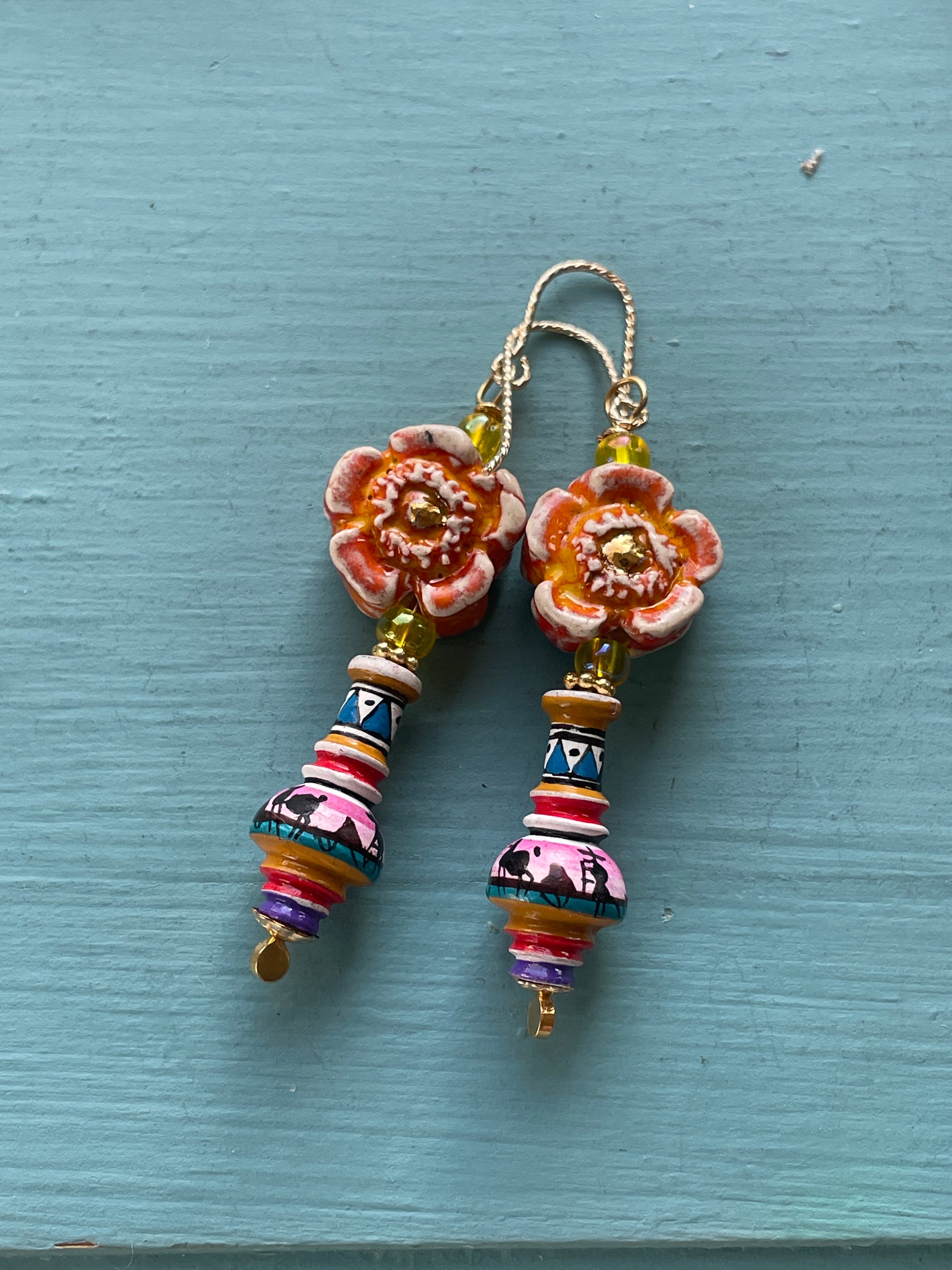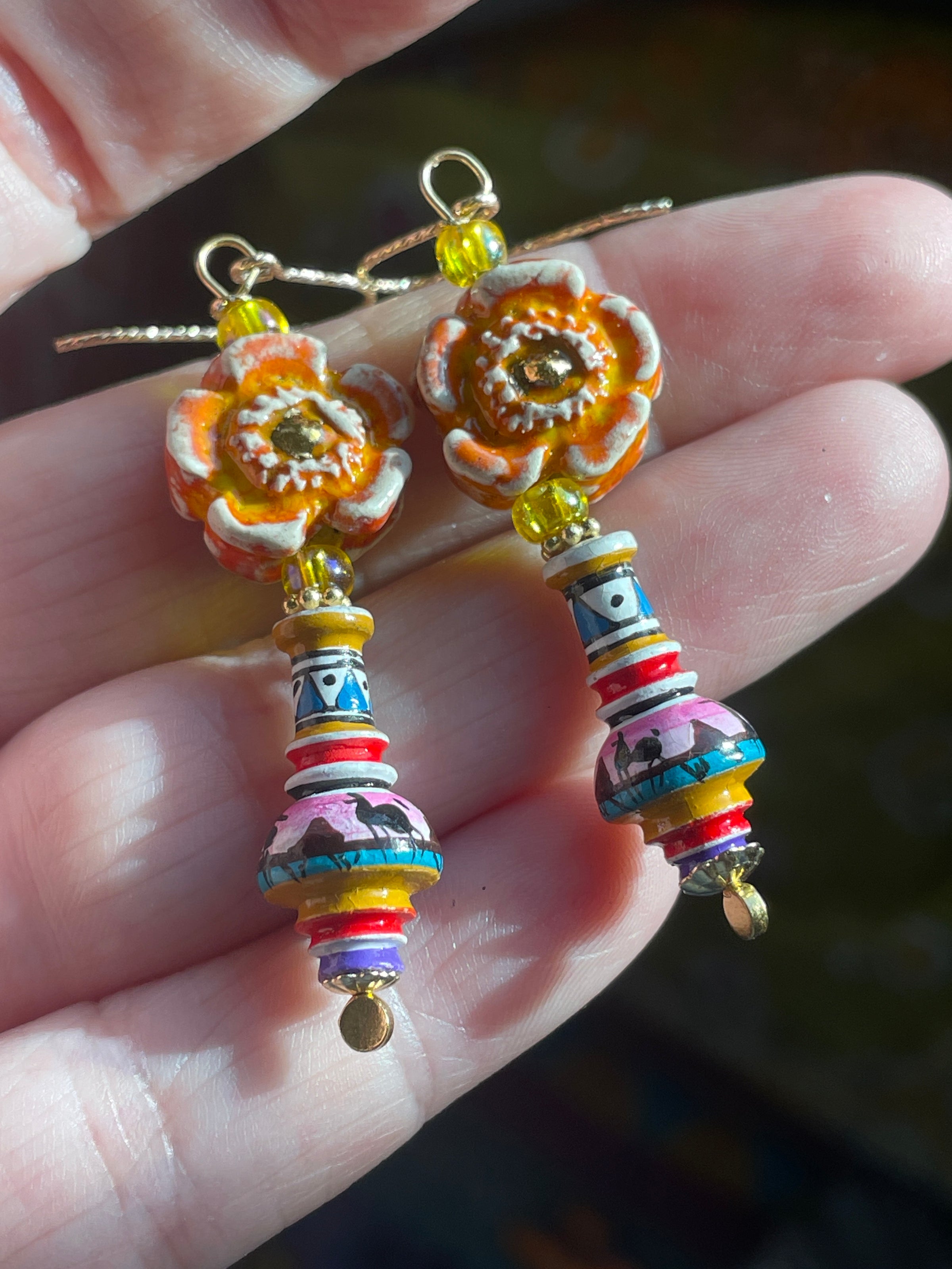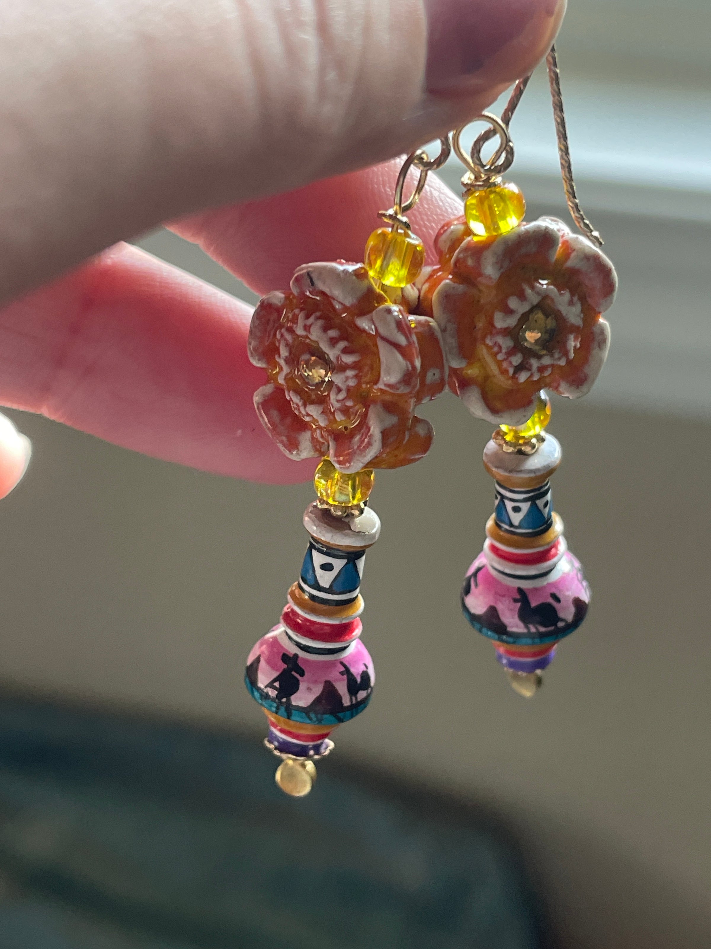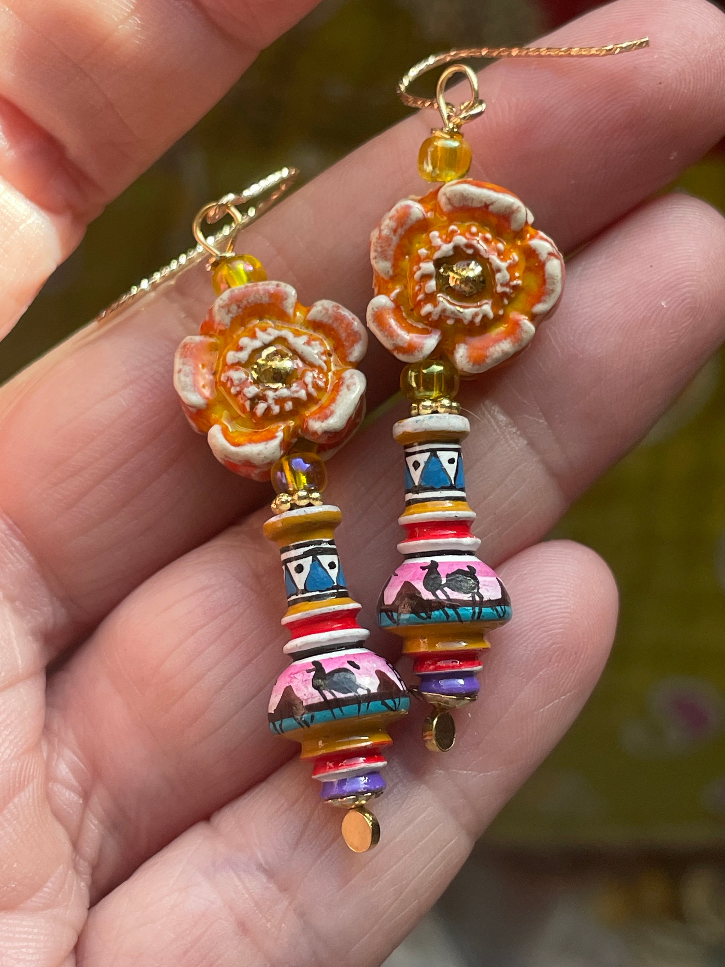 Vibrant vintage Peruvian Vase beads have been paired with handmade Porcelain flower beads with real gold painted centers and vintage yellow glass beads. All findings are gold filled and Vermeil. These measure approx 2.25 inches.