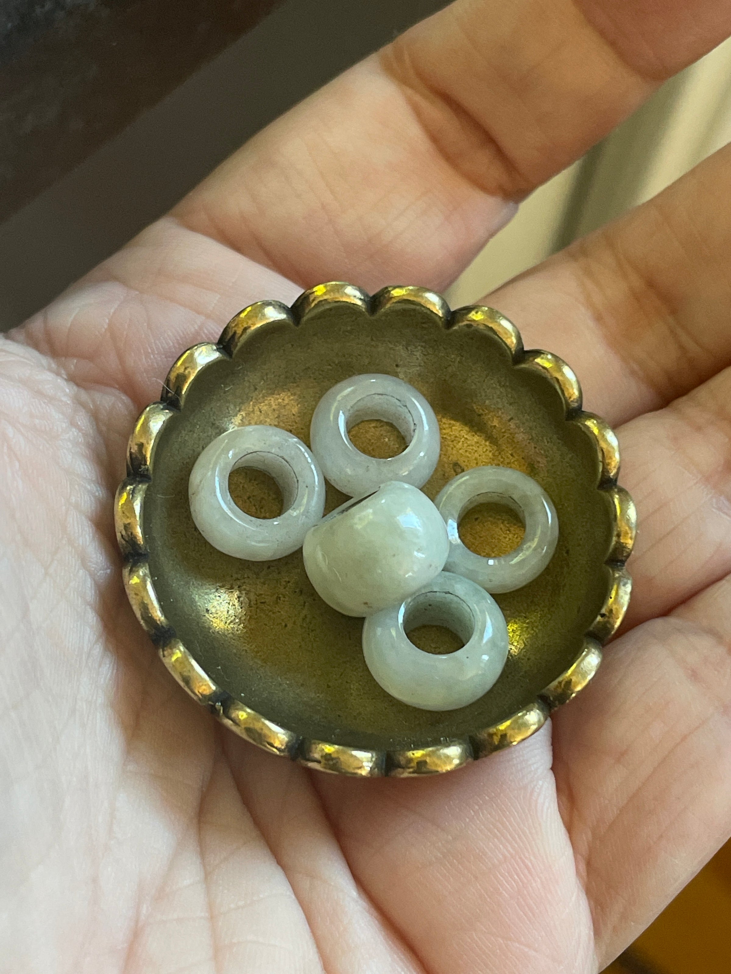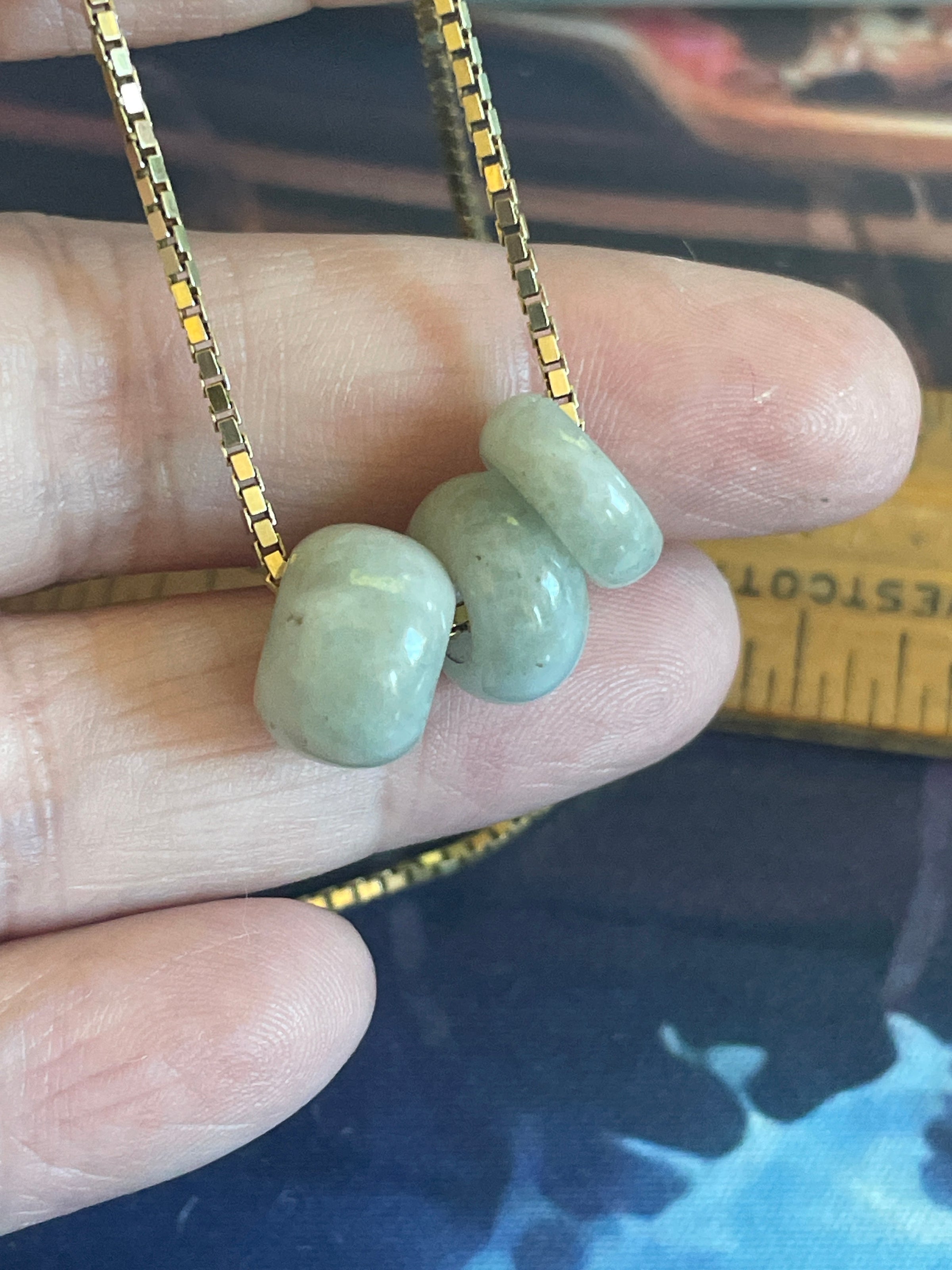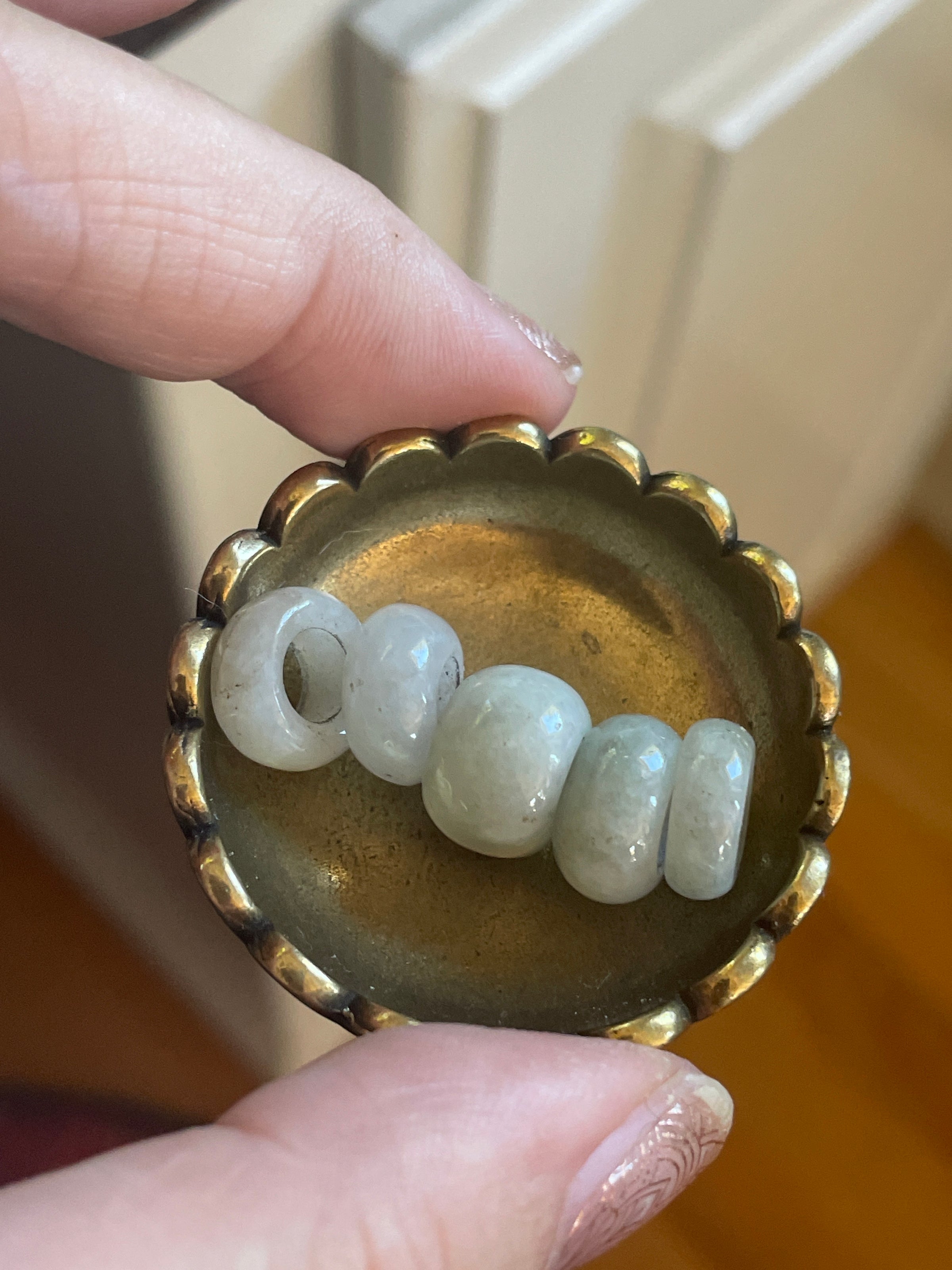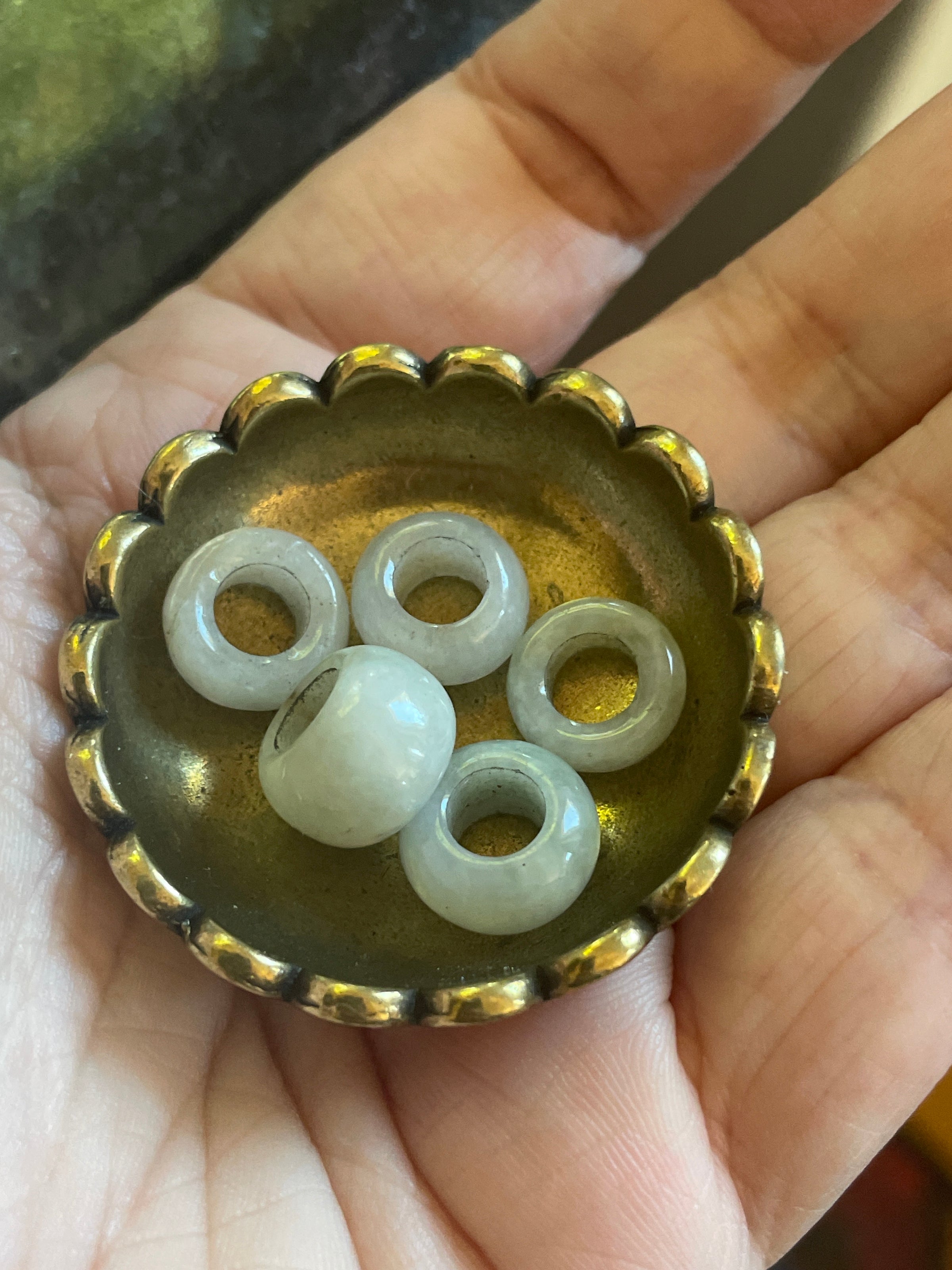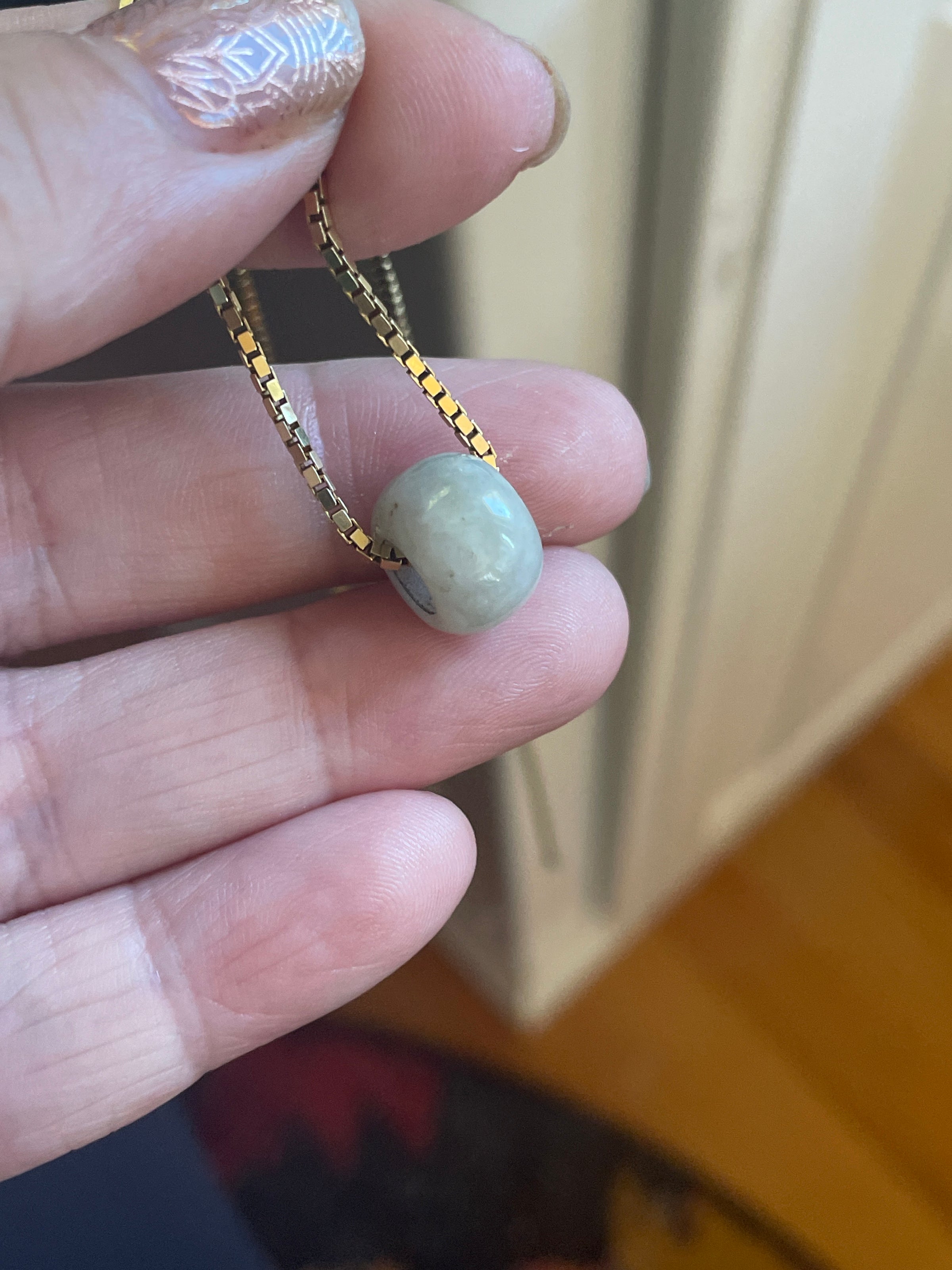 Vintage Jade bead pendant beads. Listing is for 1. I have 5 available. Will ship random bead unless you express preference at checkout. Opening is approximately 5mm. They measure between 4-8mm in width. Inside edges have a bit of wear showing their age. Chain shown to see how they look. Not included.