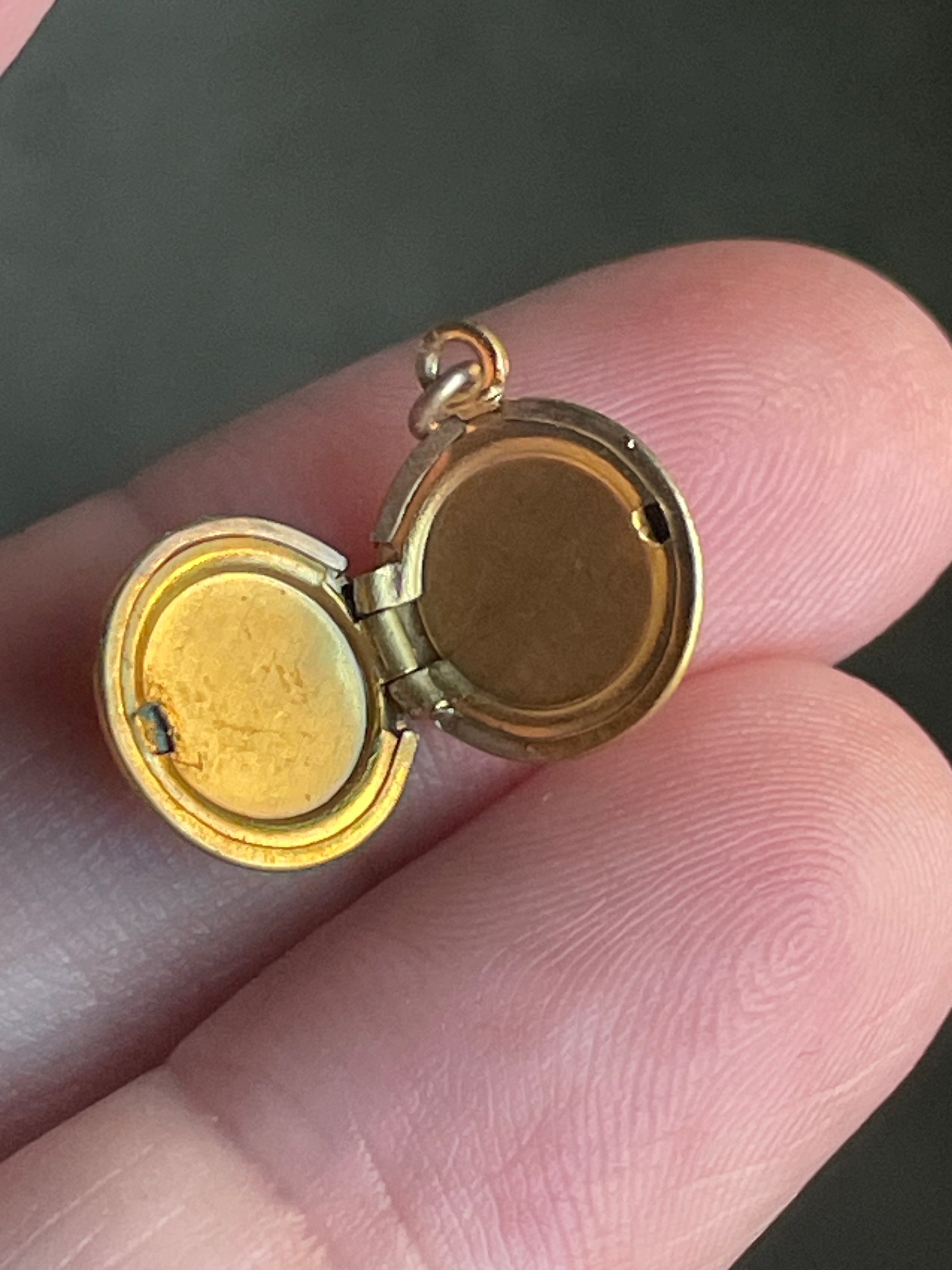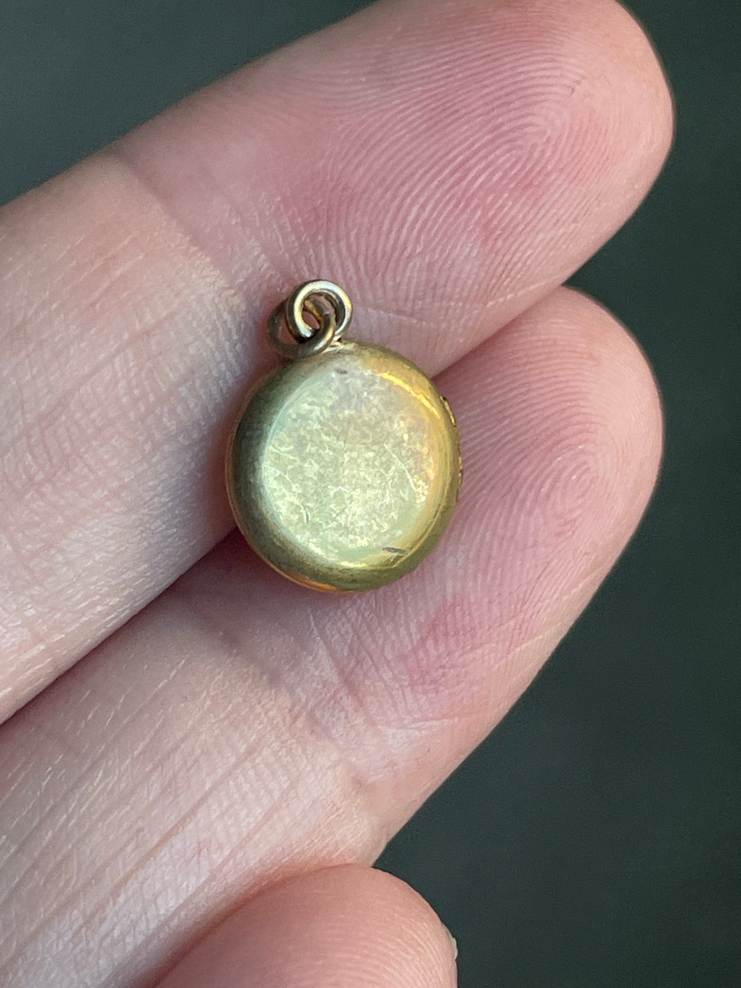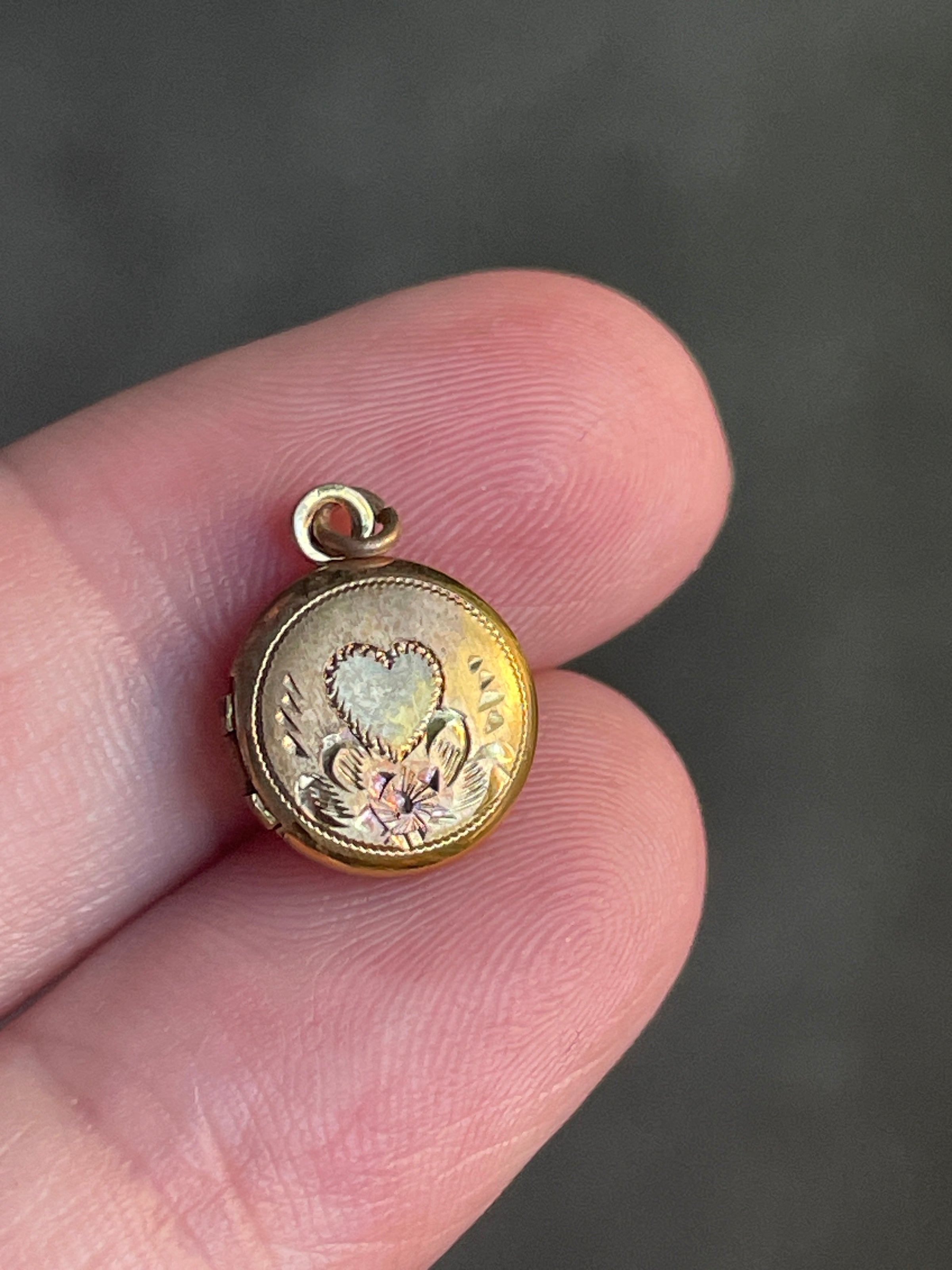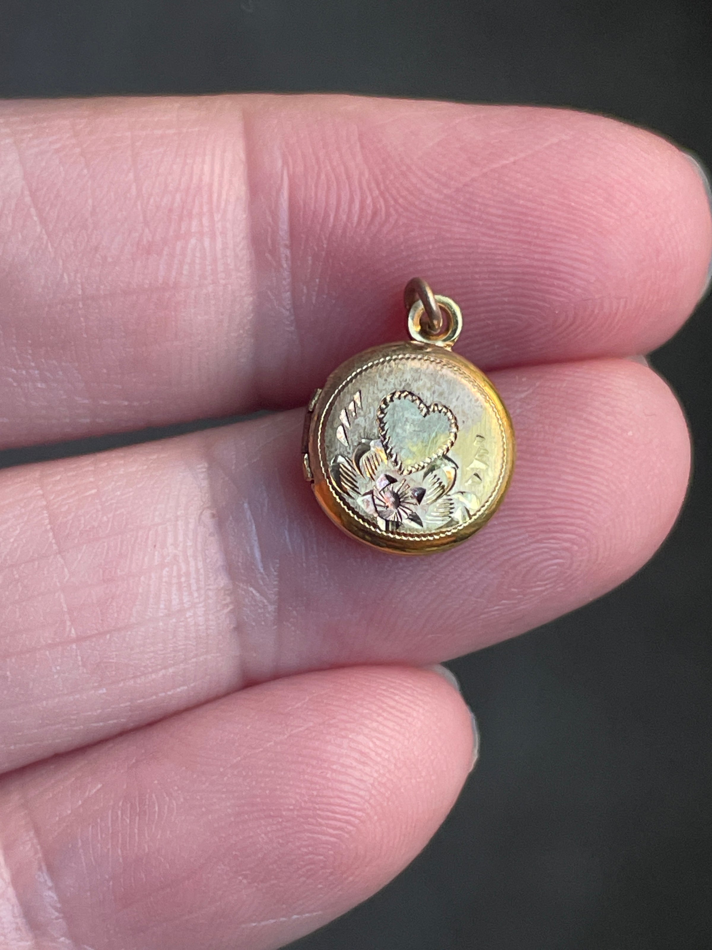 Sweet plain tiny engraved gold filled locket with rose gold flower. Measures approx 0.5 inches round with top loop x 9mm Note top loop is extremely small requiring a small chain. Locket closes with a snap.