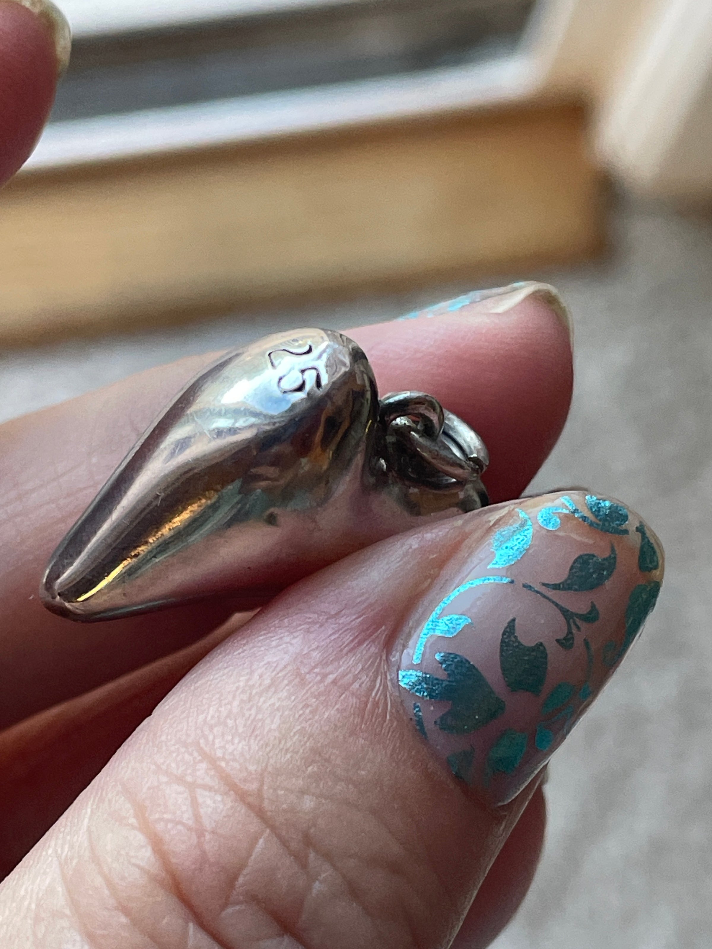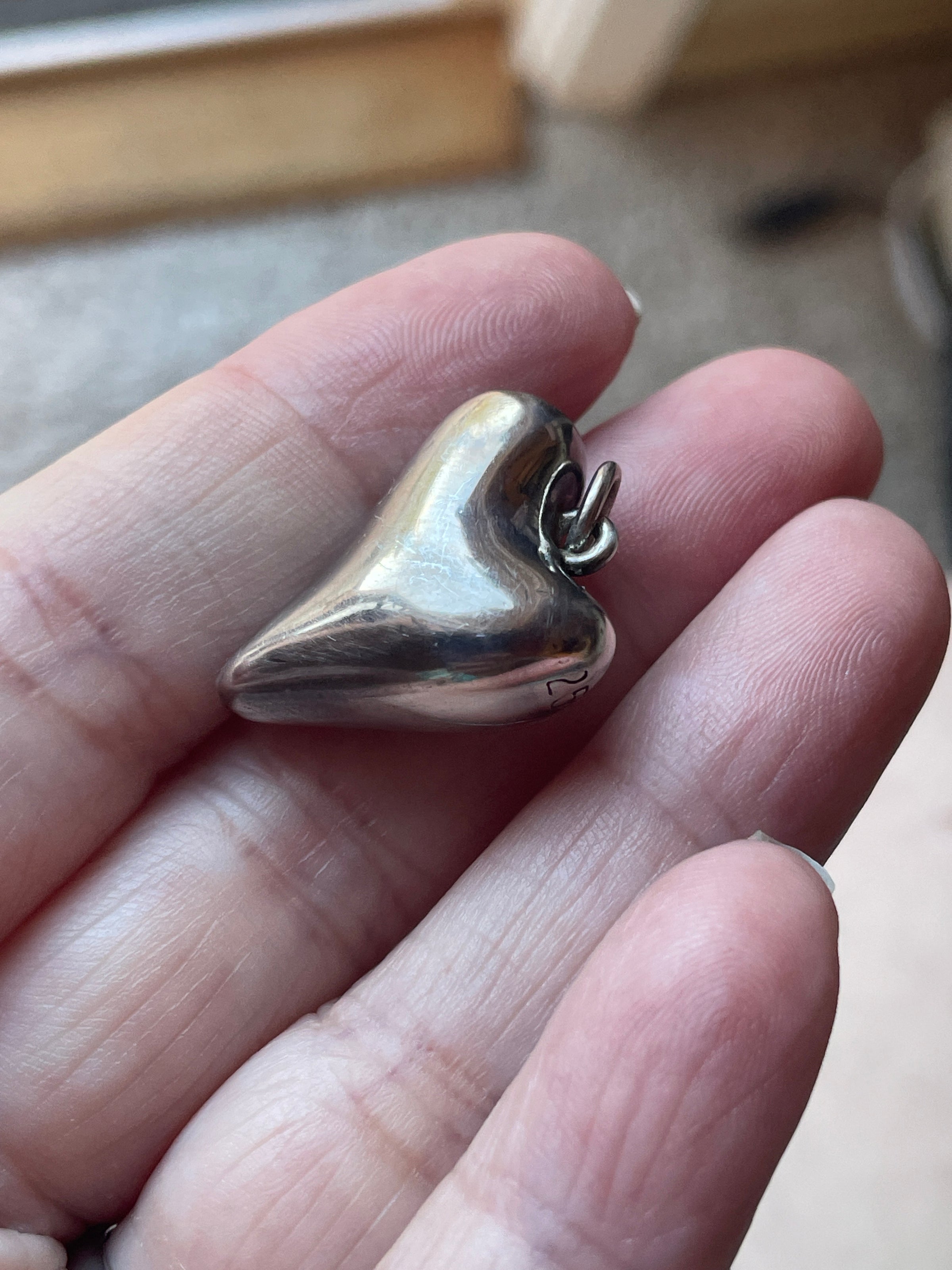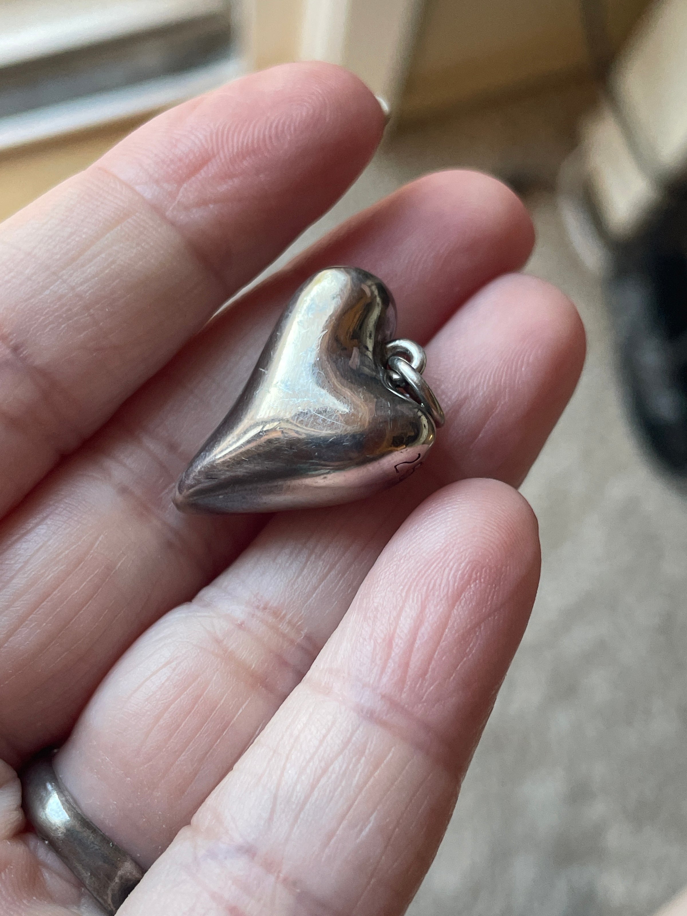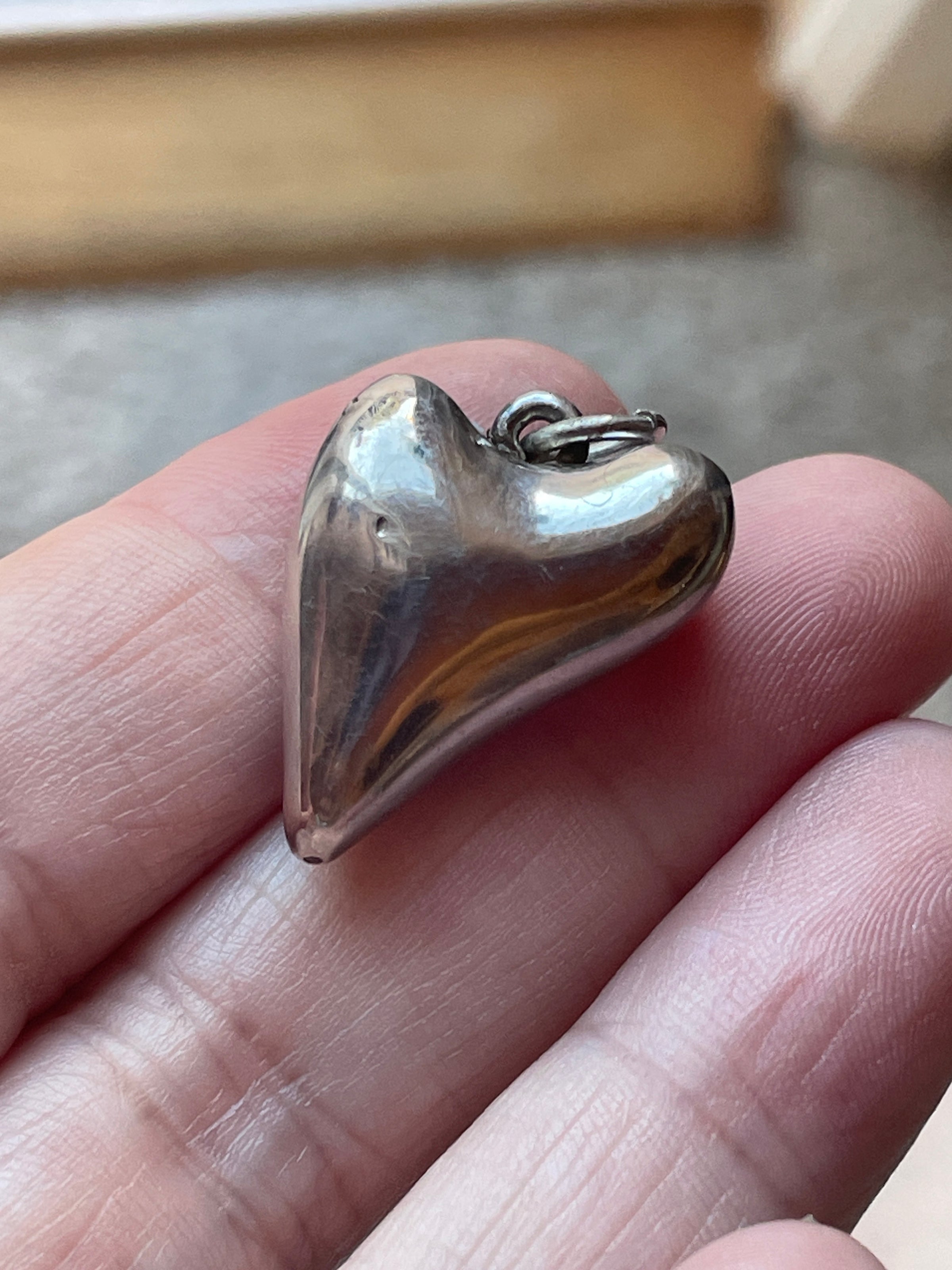 Fabulous vintage Witch’s shape heart pendant in a beautiful puffy shape. Measures just over 0.75 inches with top loop. Has a few small dings as a Witch’s heart wood. Stamped “925” on heart itself.