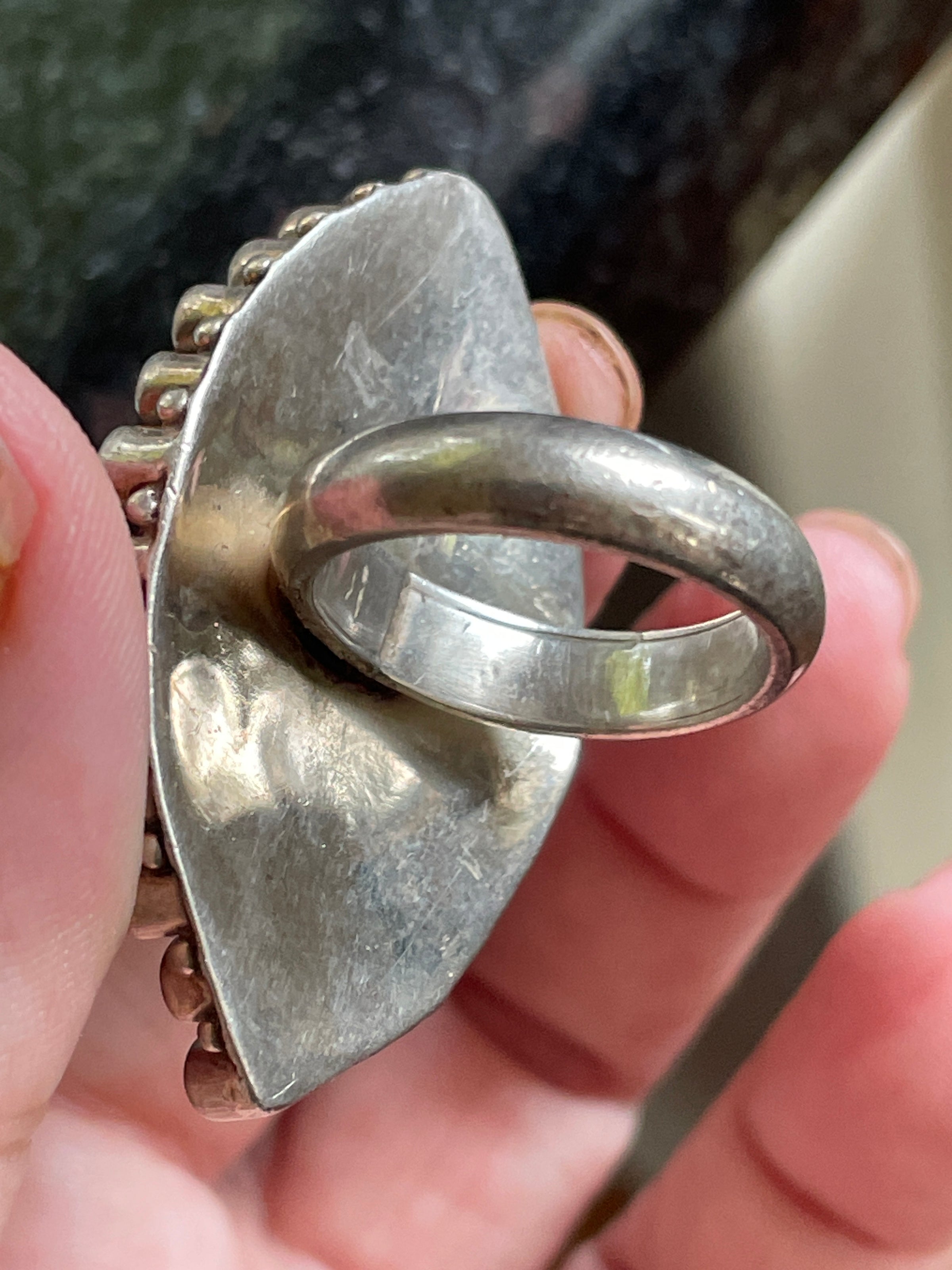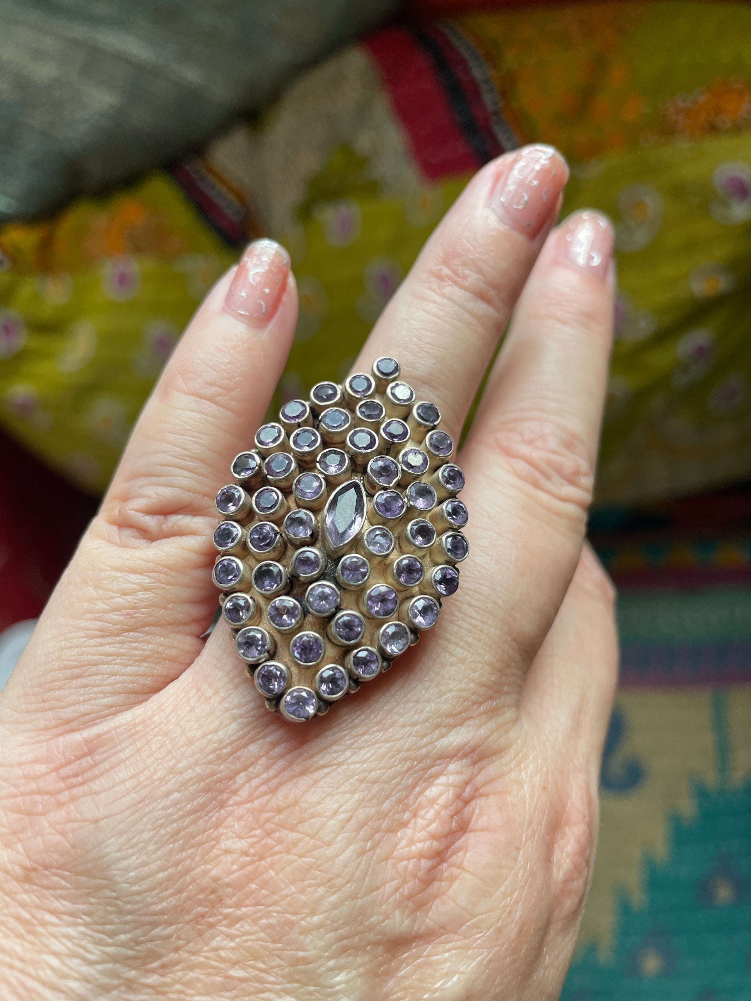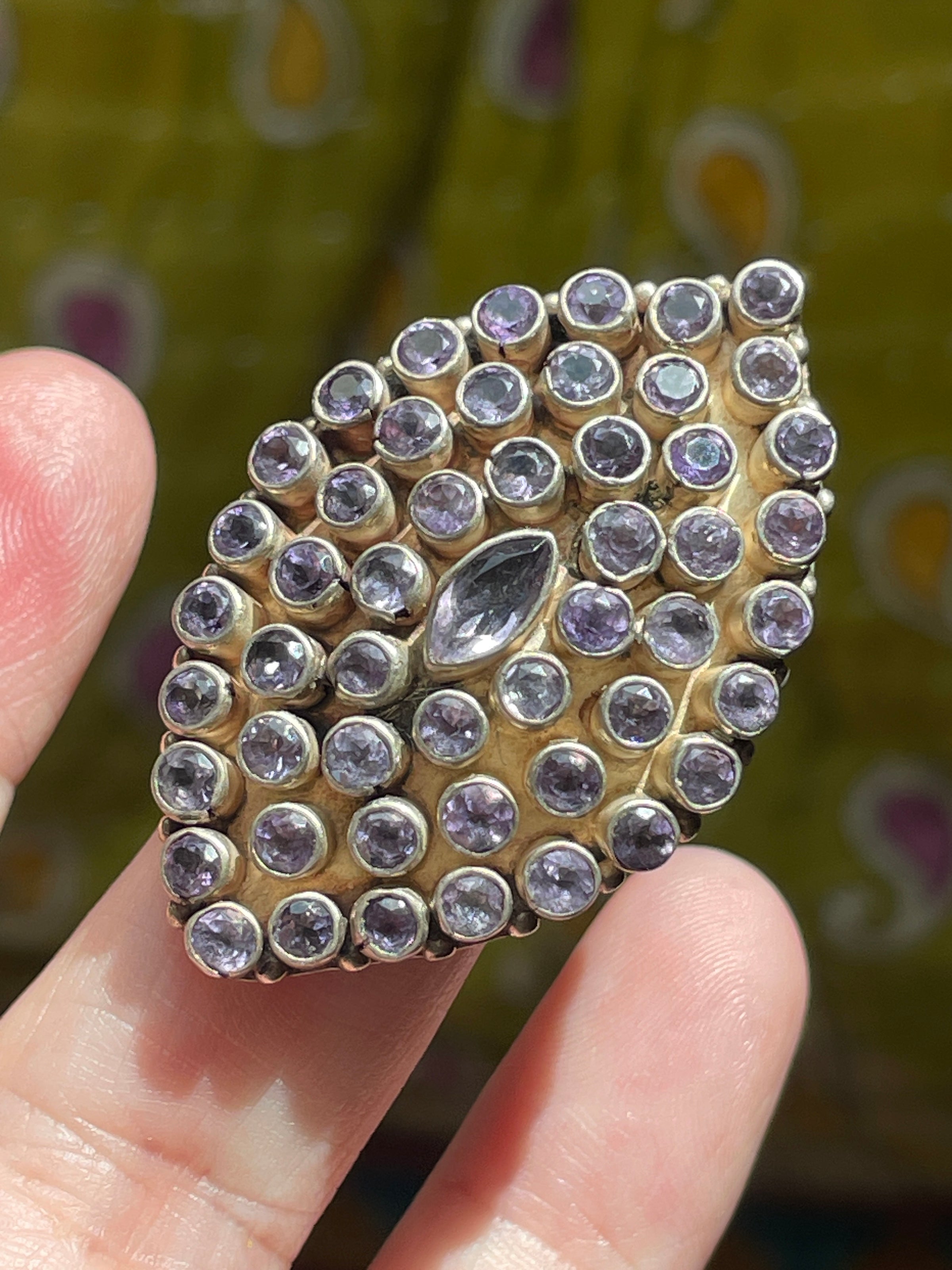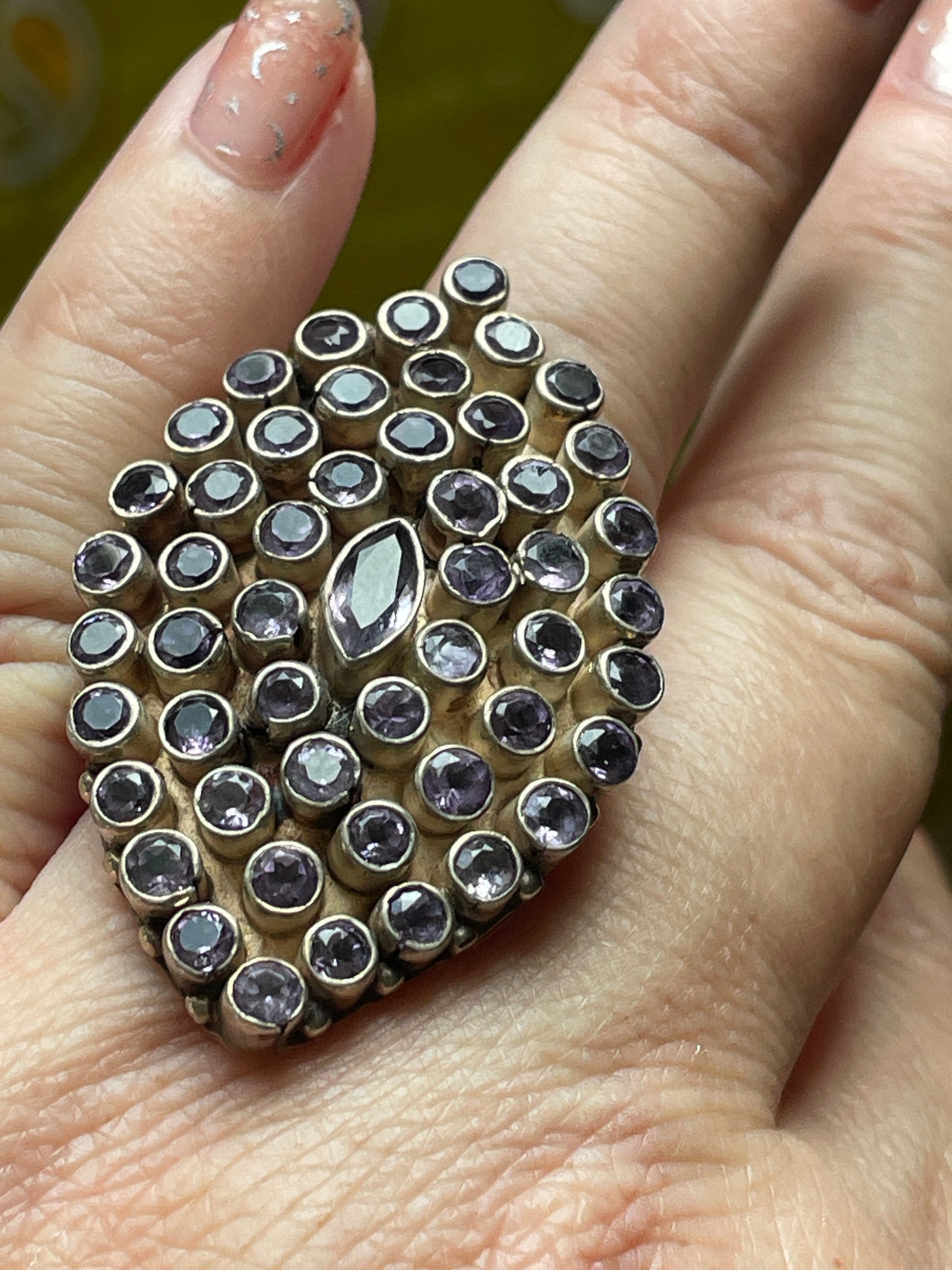 Stunning huge Amethyst statement ring in sterling silver. Heavy and well made. Ring face measures-.75 inches x 1.25 inches. Ring size = 7.5. Tested sterling. Ring weighs 19.45 grams.