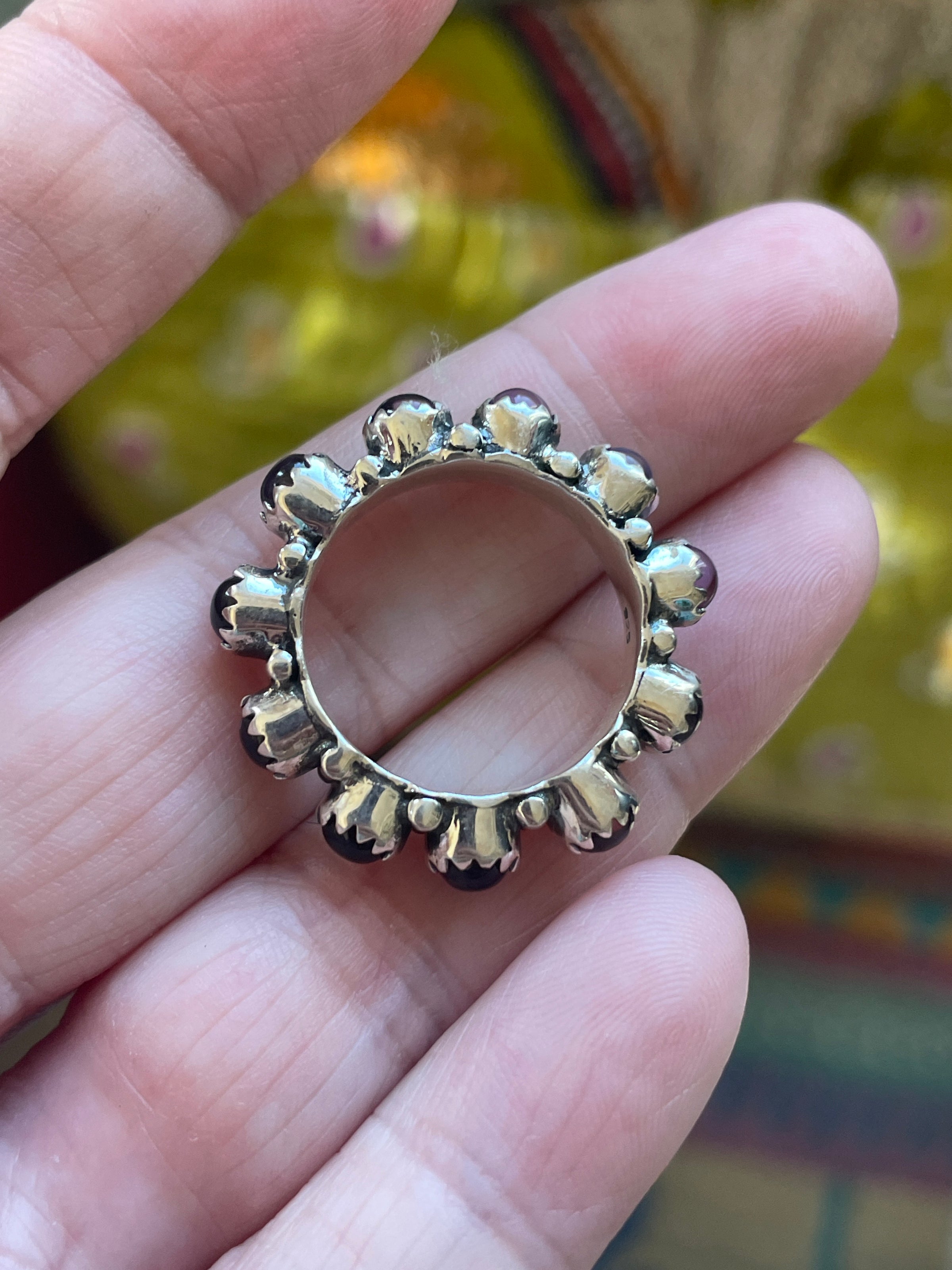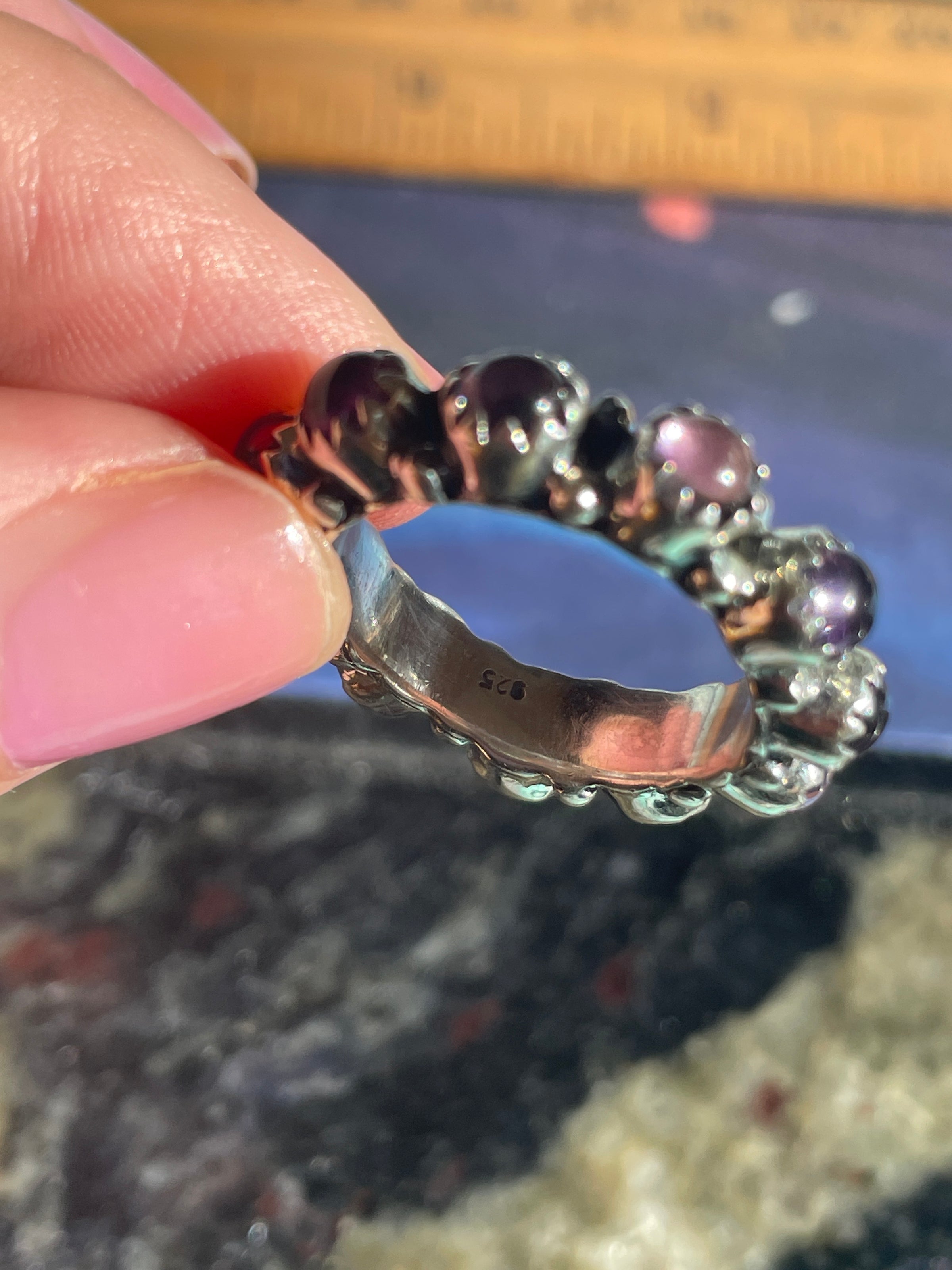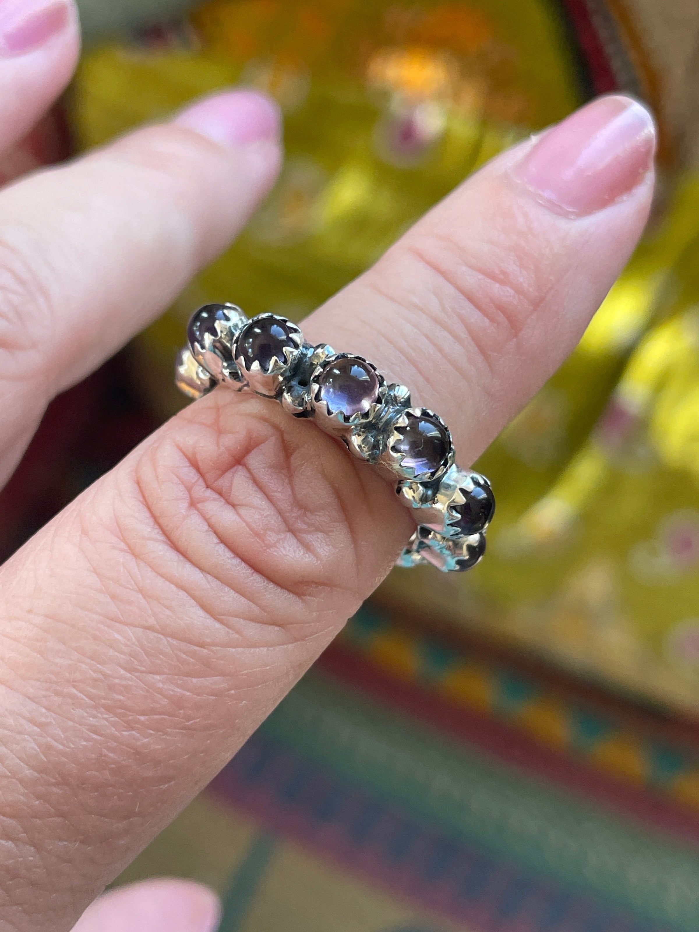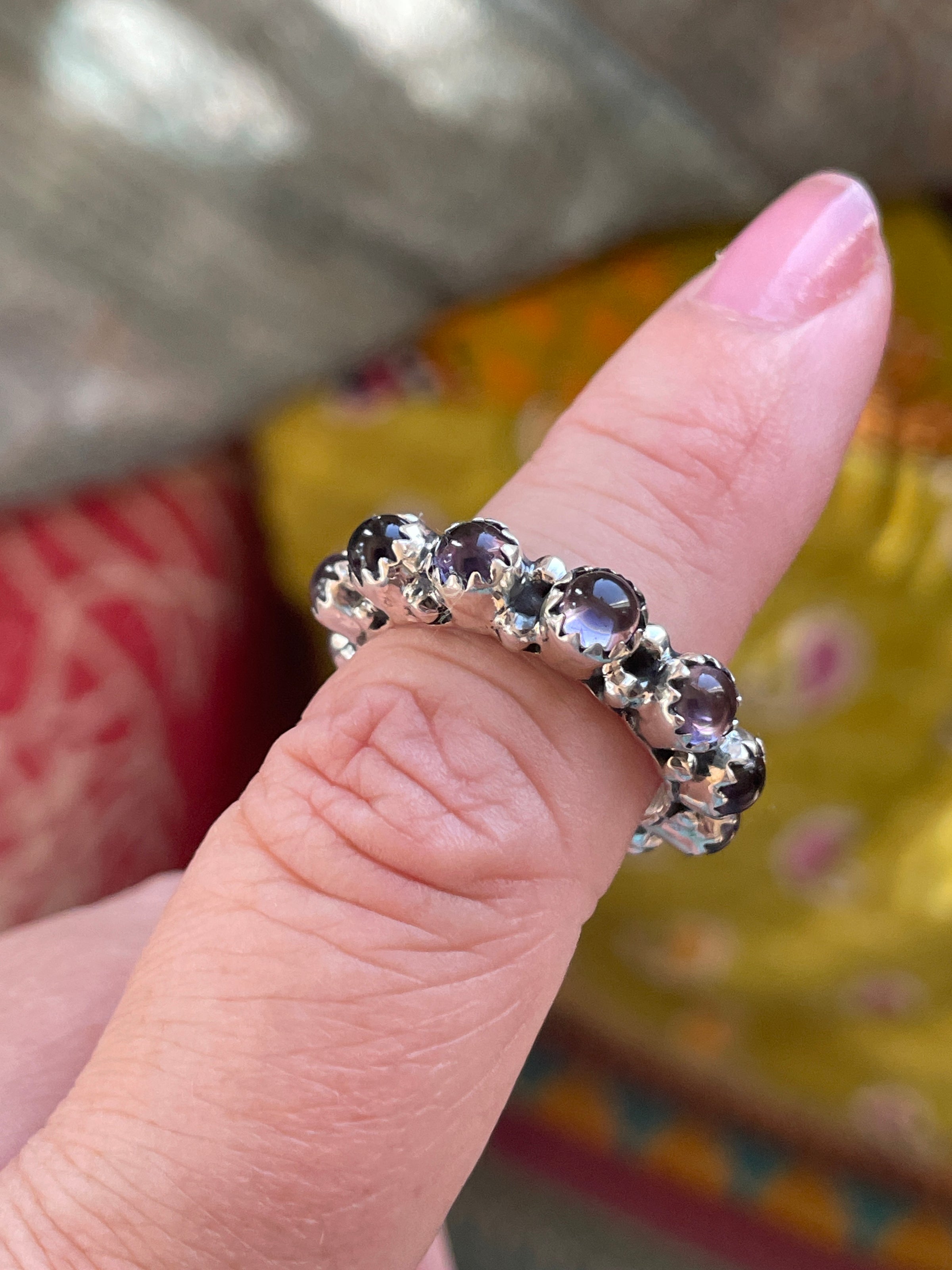 Gorgeous luminous Amethyst eternity ring in sterling silver.  Has cab Amethysts all the way around.  Size = 7.  Cannot be sized based on stones going the whole way around.  Has beaded details as well.  Stamped 925 for sterling.