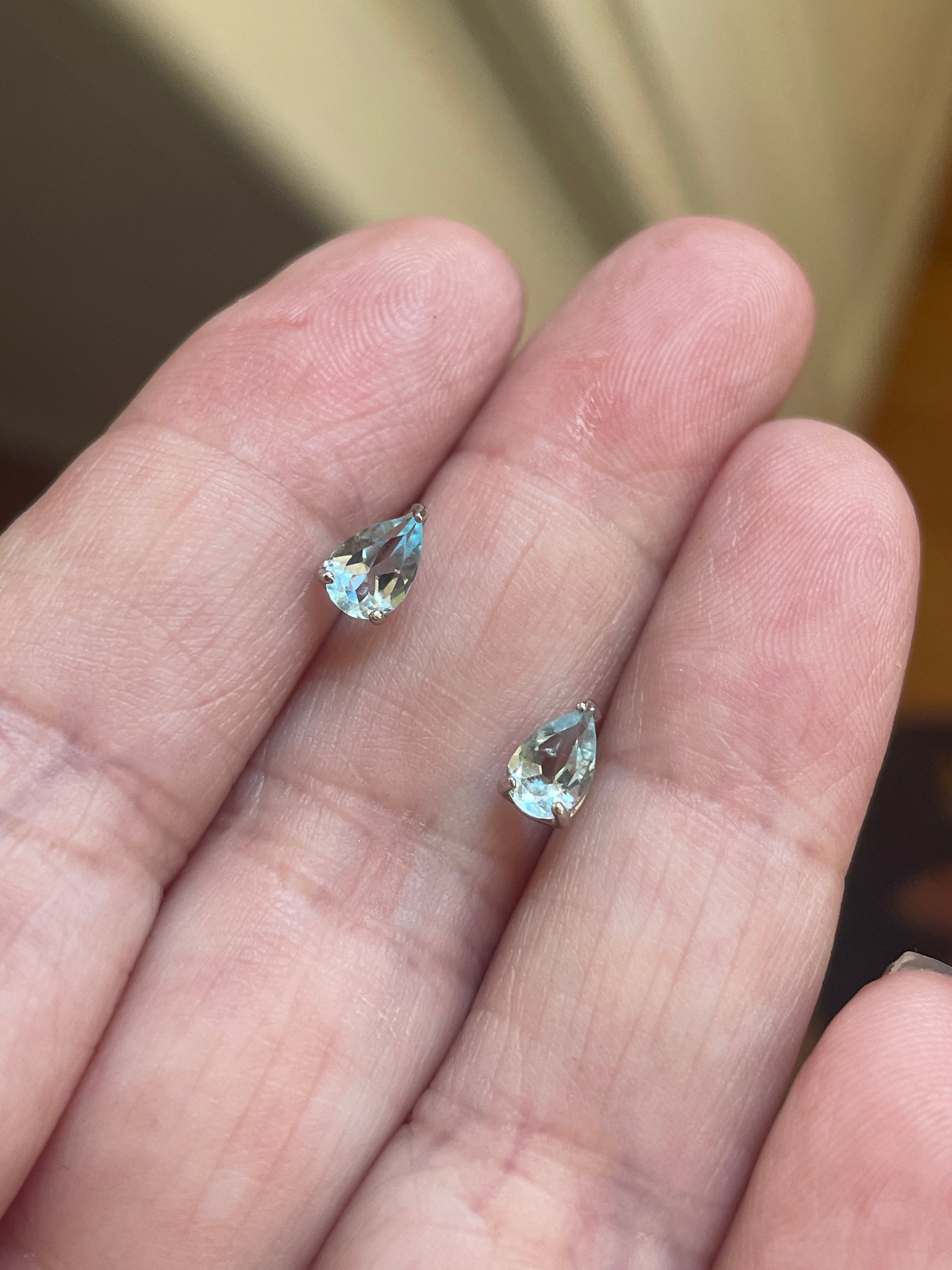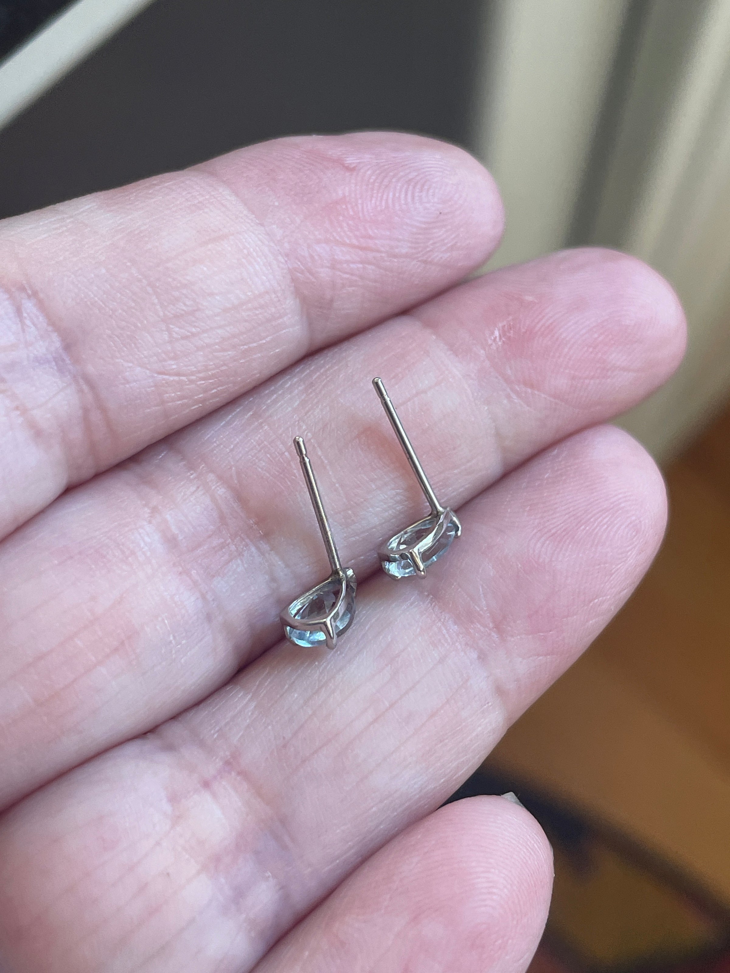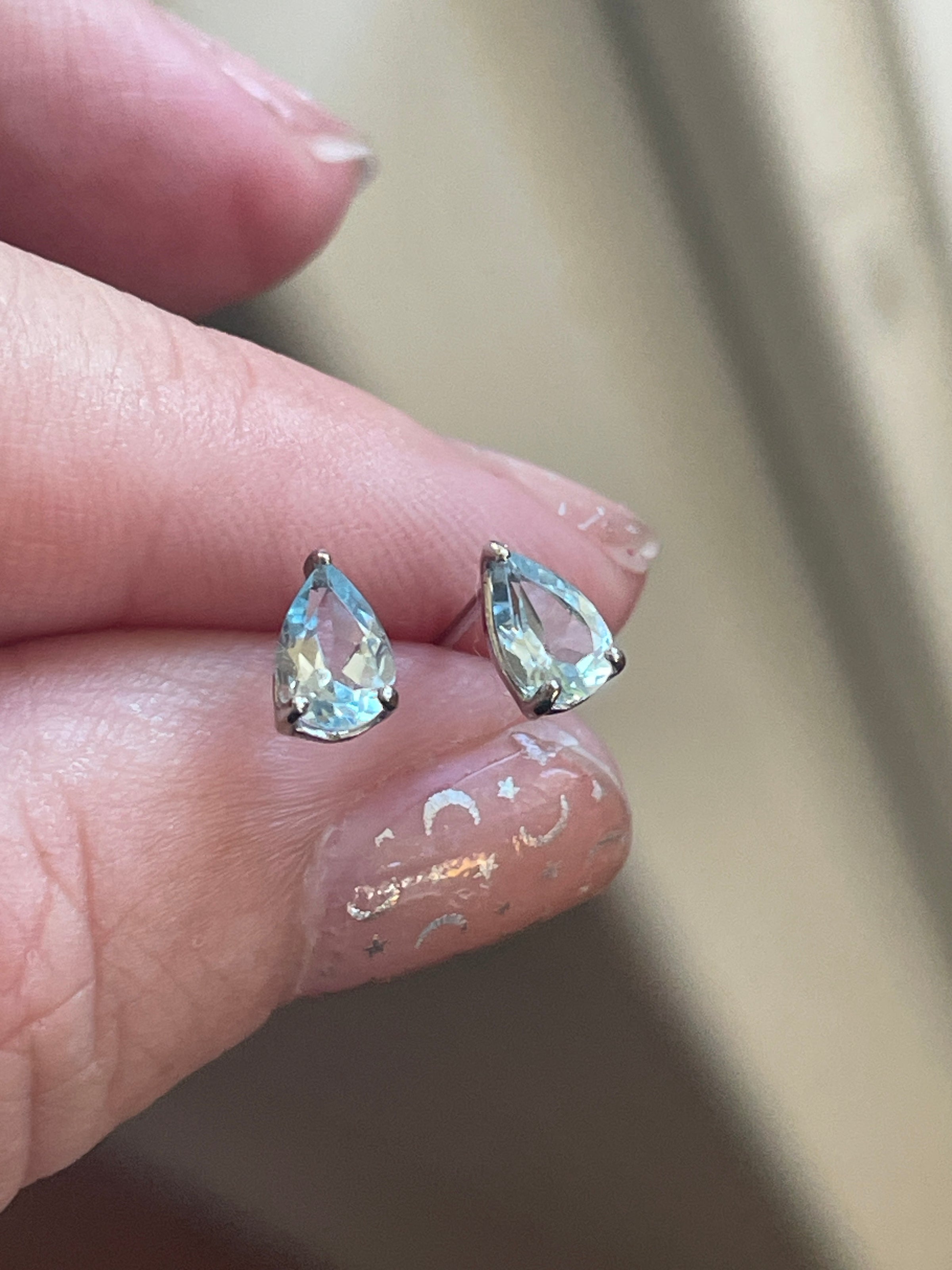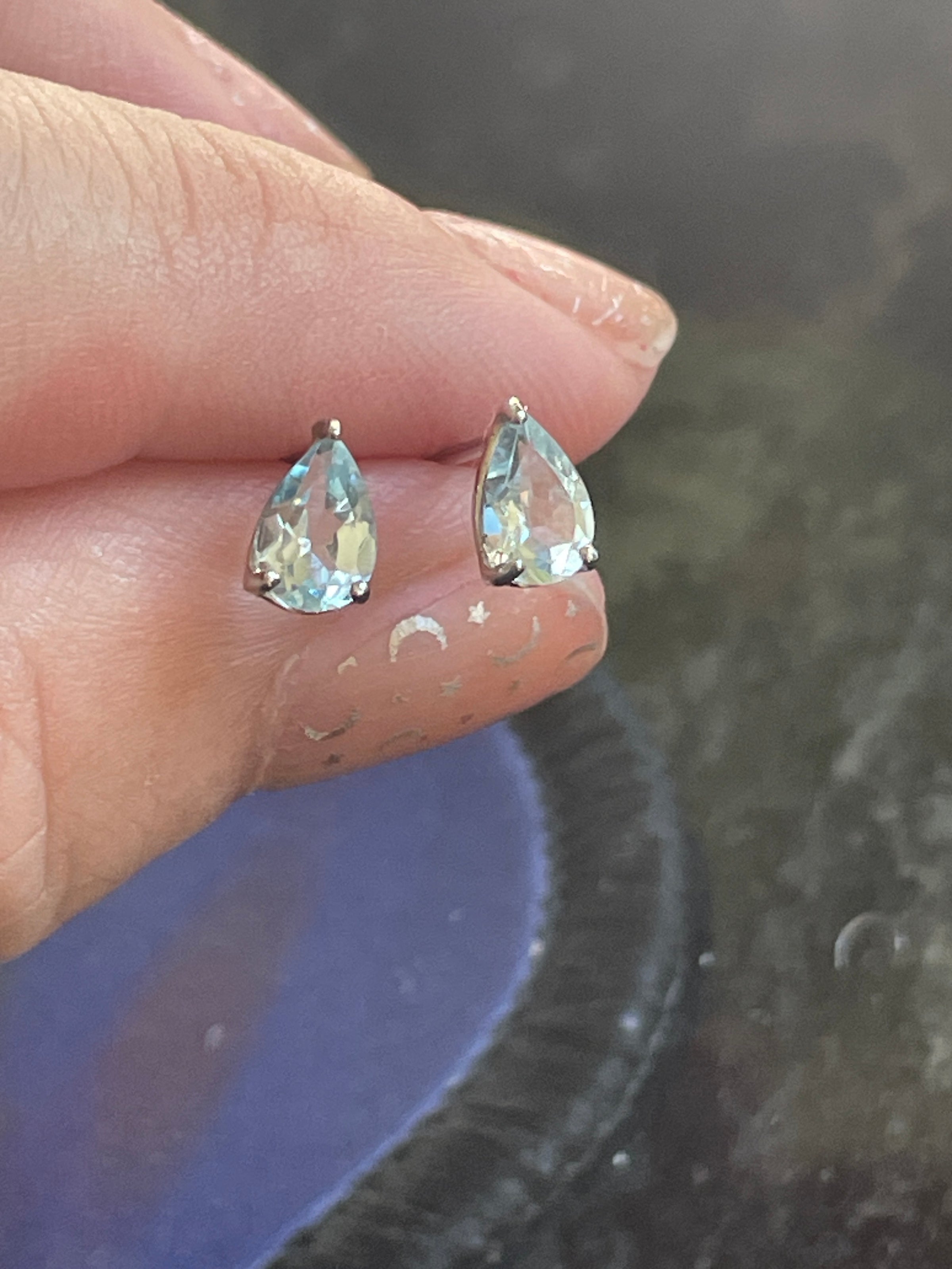 Beautiful vintage teardrop Aquamarine stud earrings in 10k white gold. Earrings measure approx 6mm x 4mm. Stamped 10k on posts. They come with plastic backs.