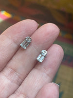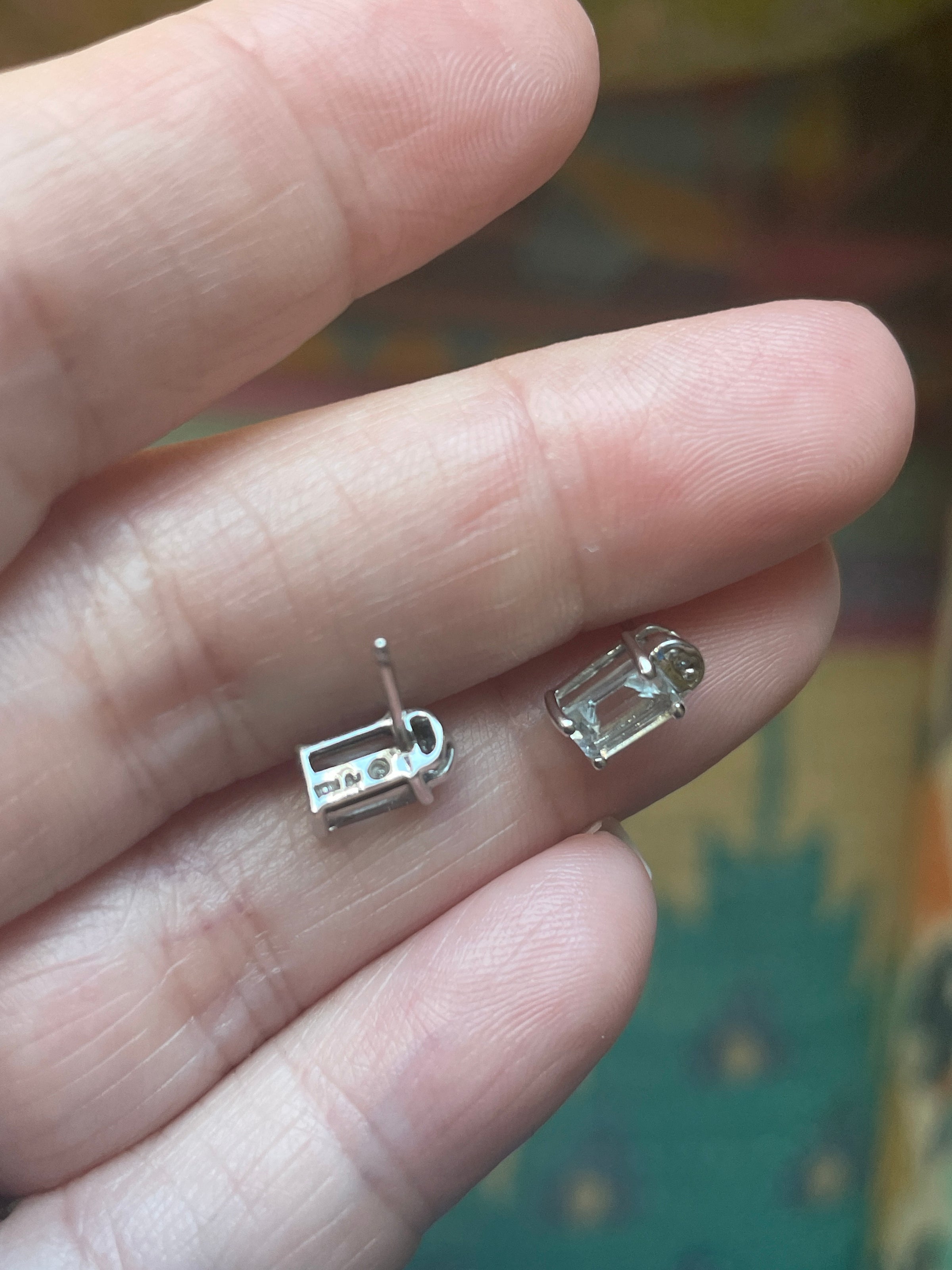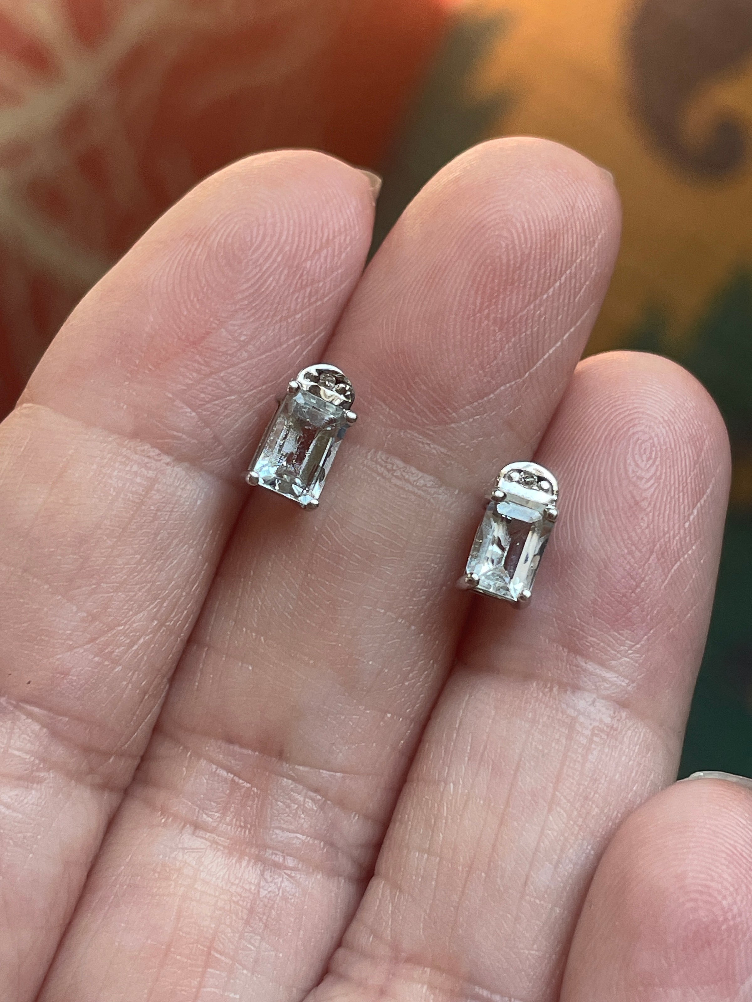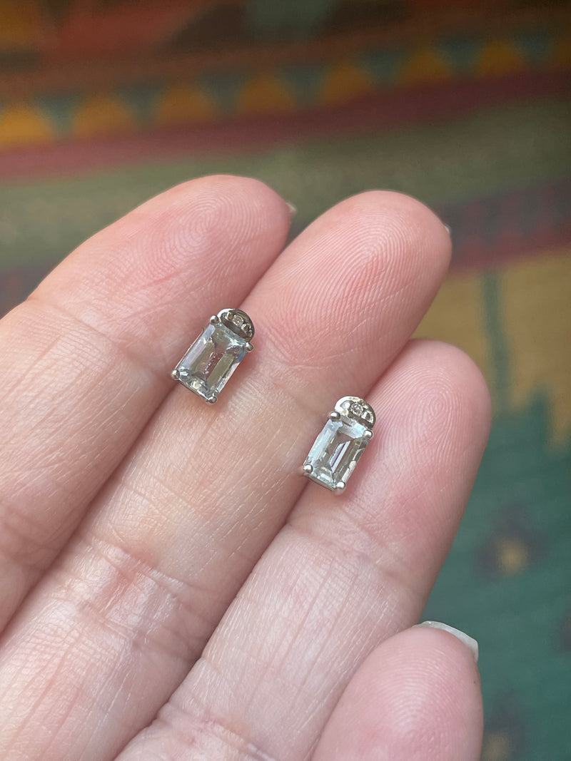 Stunning vintage Aquamarine earrings in an emerald cut set in 10k white gold with small White Sapphire accents above. Aquamarines are a very pale blue. Stones measure approx 5mm x 3mm. Stamped 10k on earrings. They come with plastic backs.