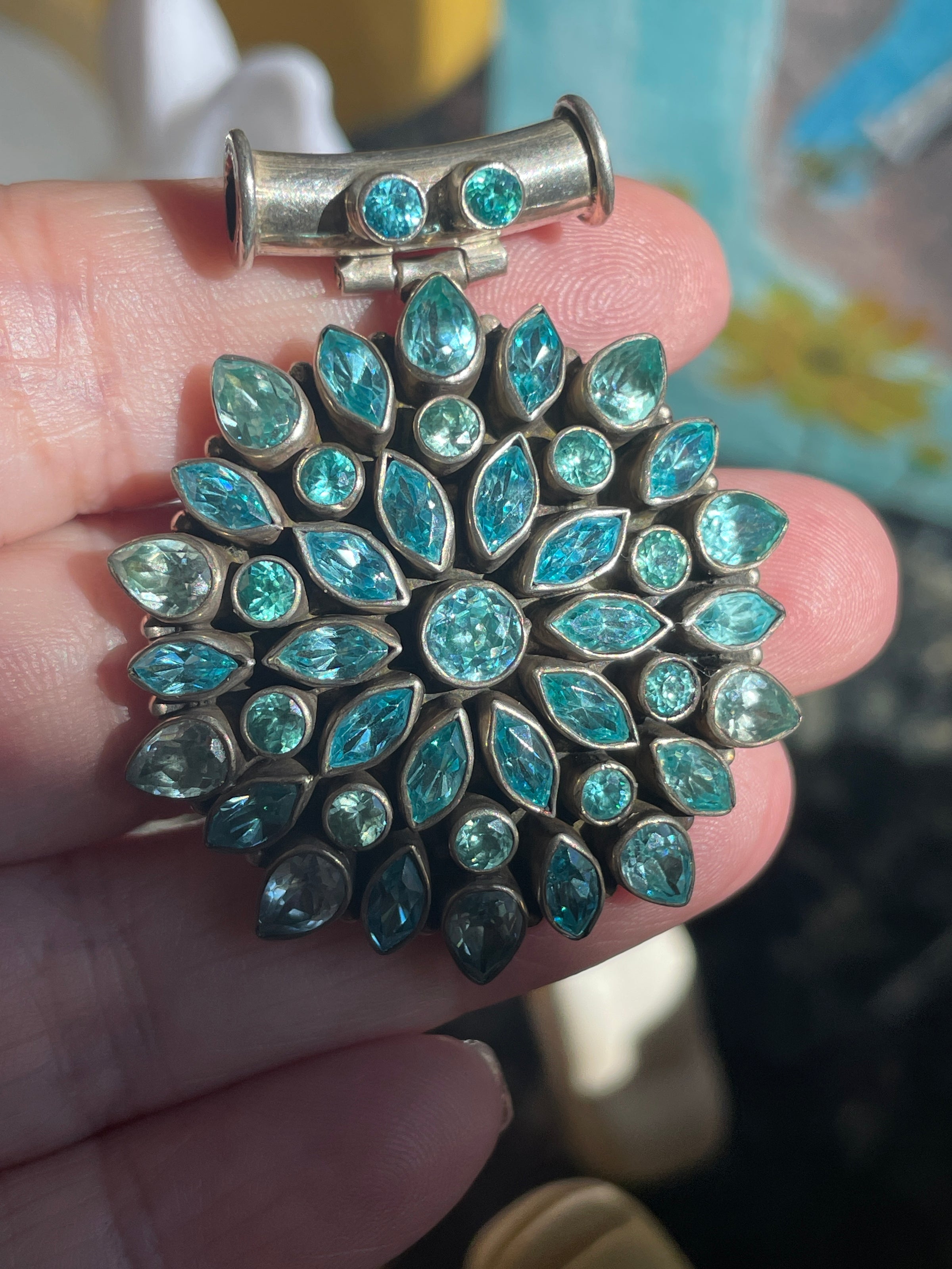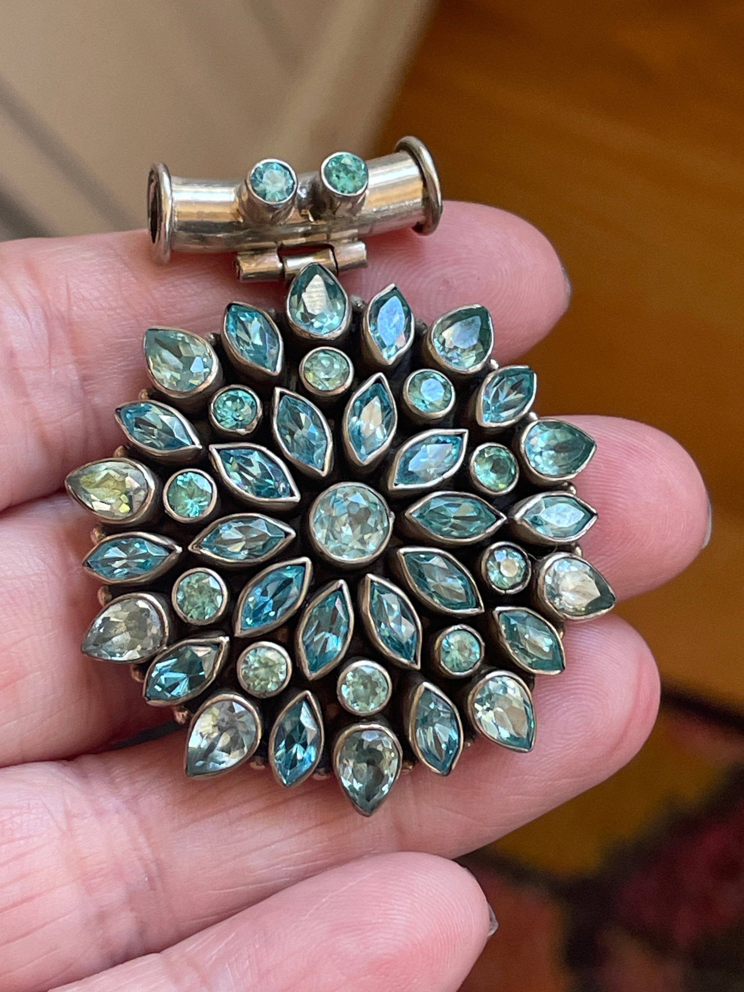 Huge statement Blue Topaz cluster pendant with two shades of blue. Pendant measures just under 1.75 inches x 1.25 inches. Has a tube-like bail that a chain can pass through. Stamped 925. Weighs 23.11 grams.