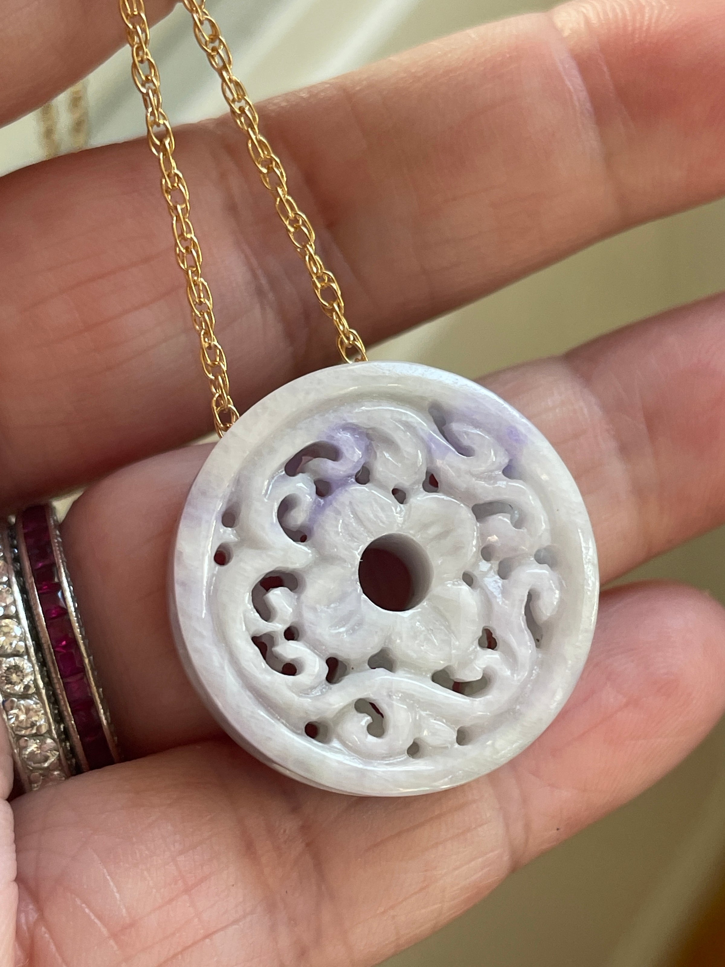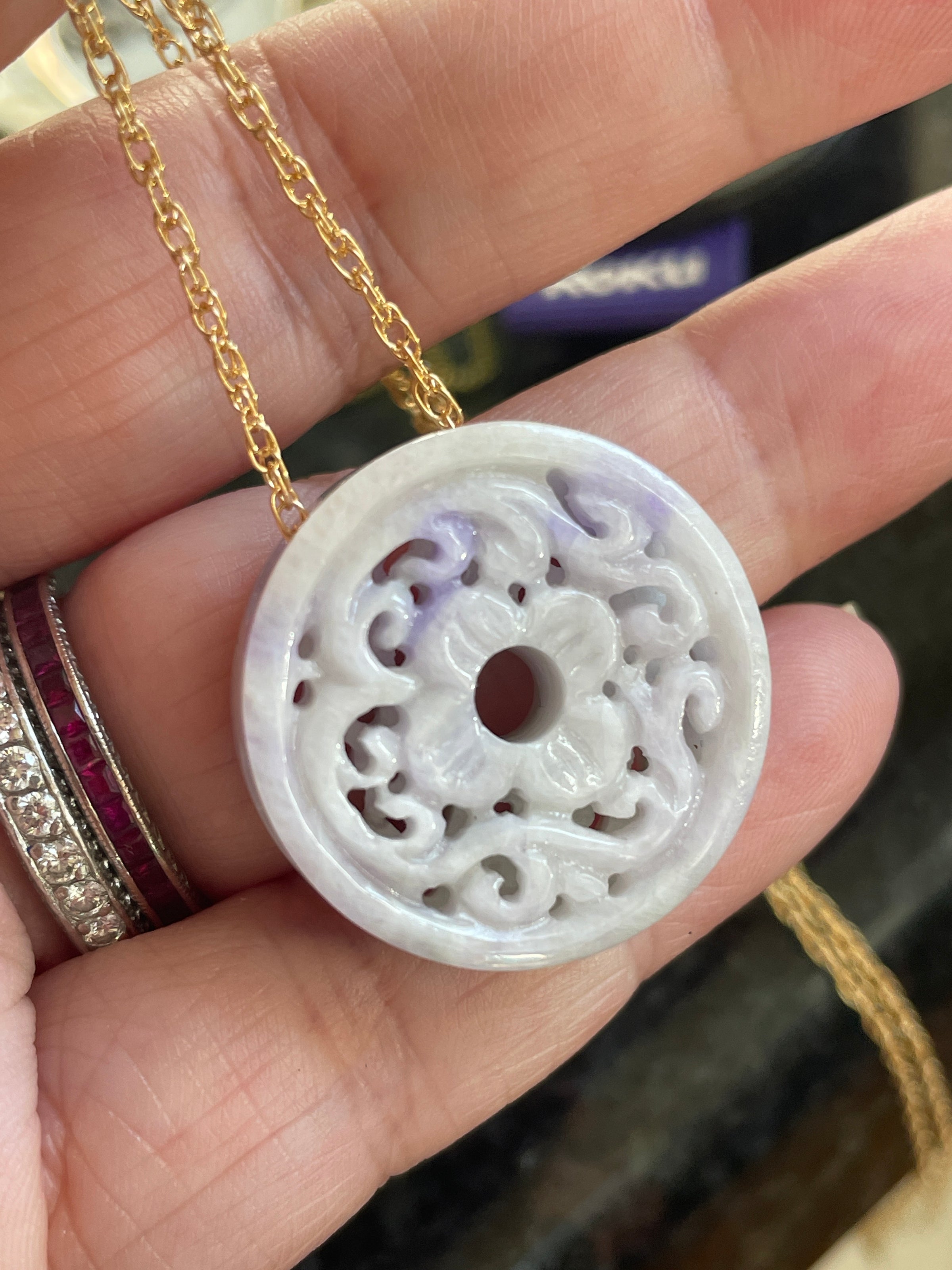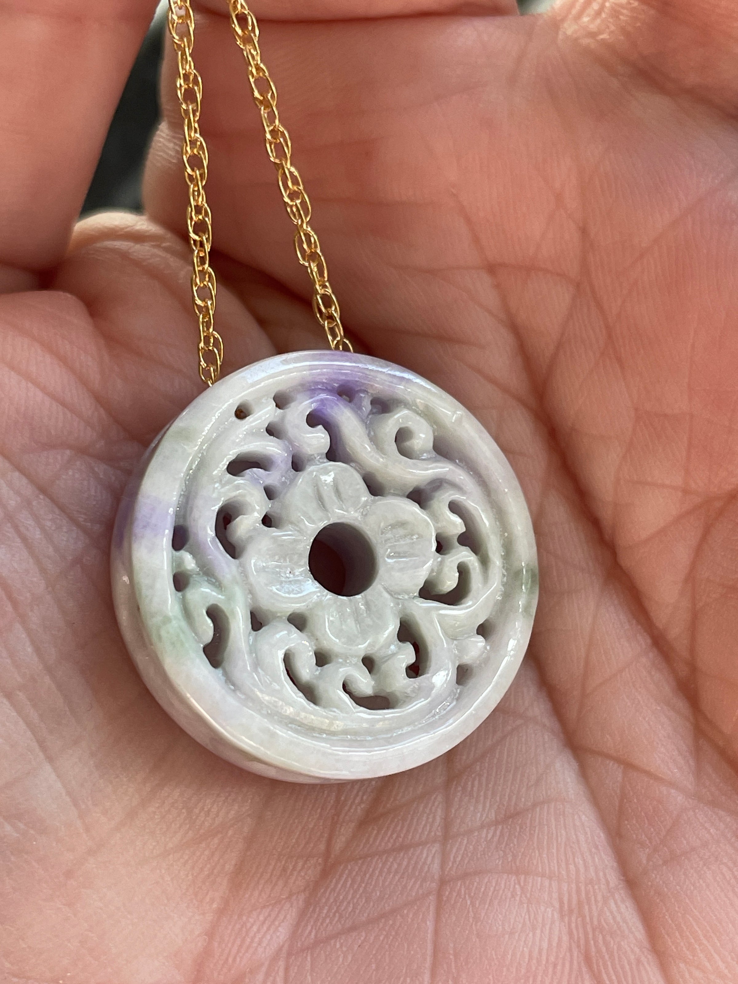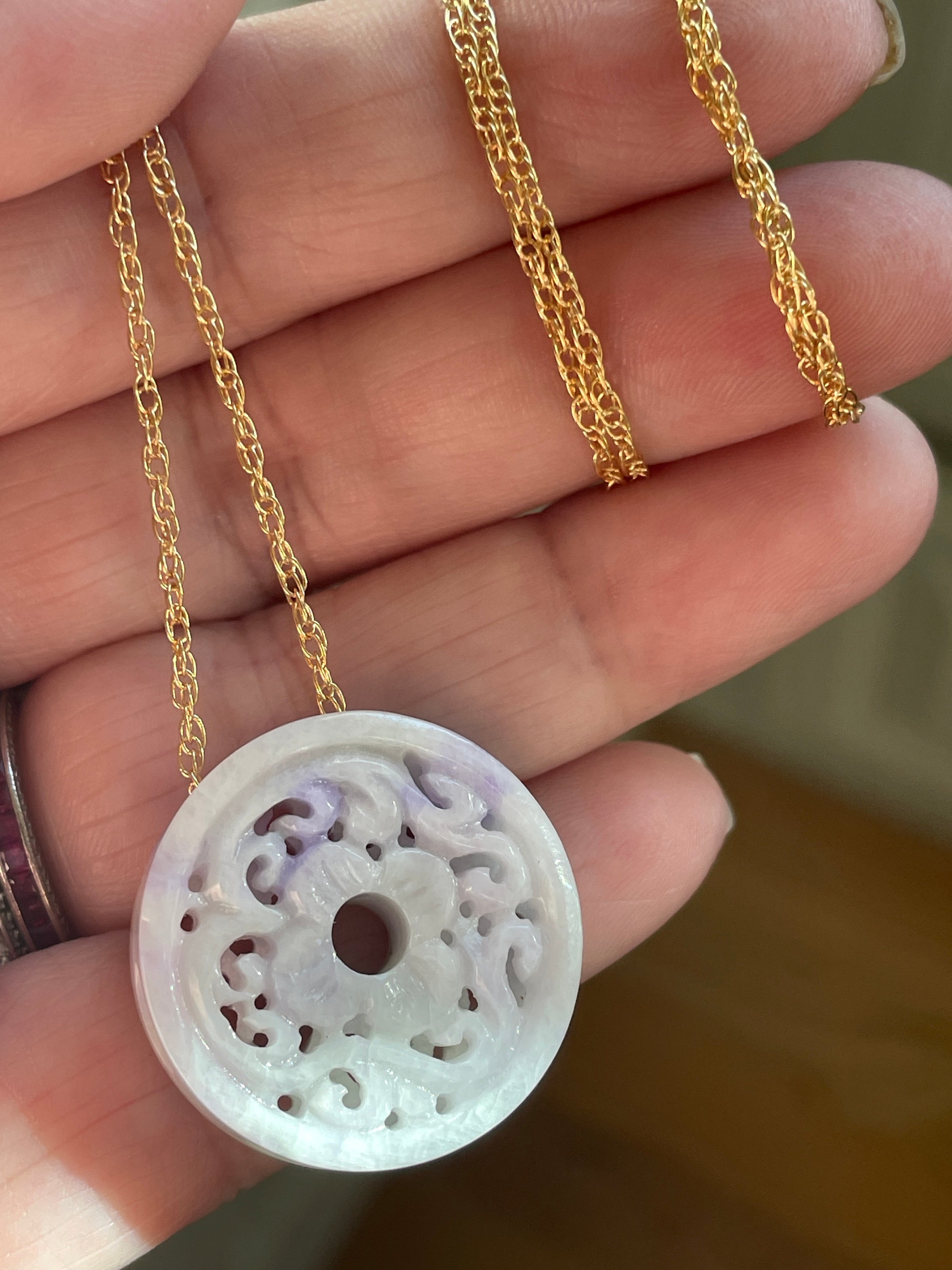 Incredible large carved Jade flower bead necklace on gold filled chain. Carvings on both sides. Pendant measures approx 1 inch across. Chain is approx 18 inches. Marked for gold filled.