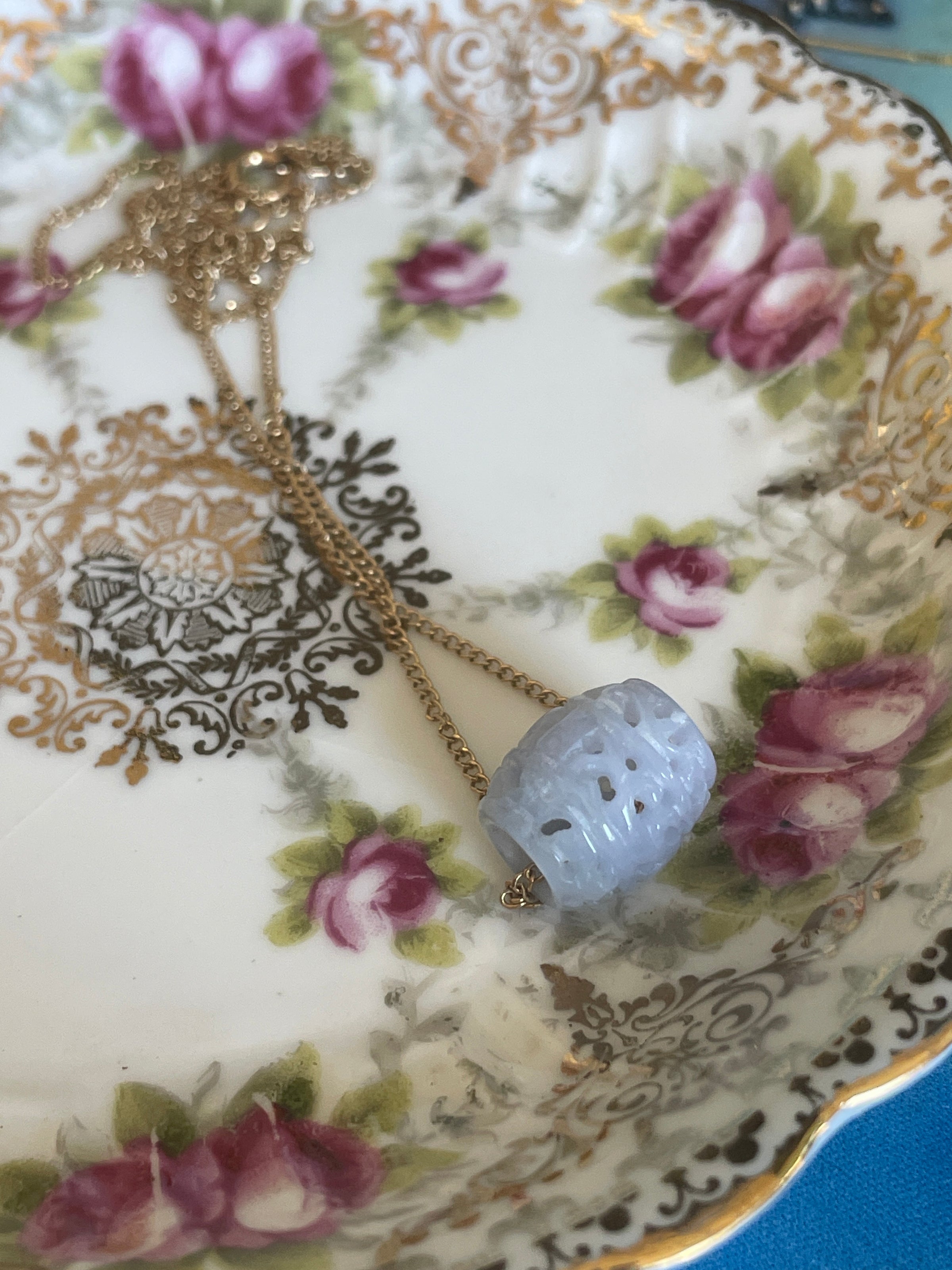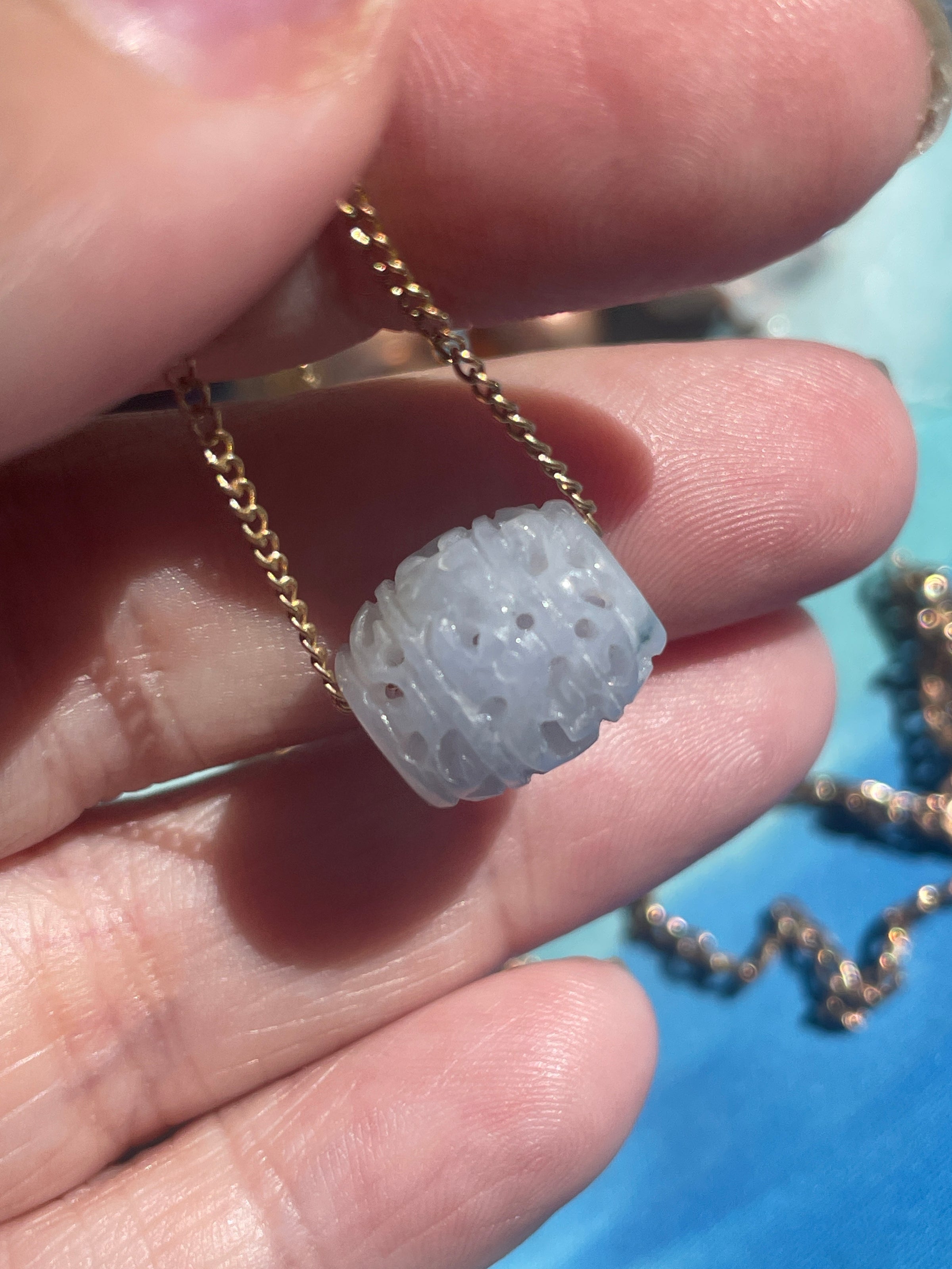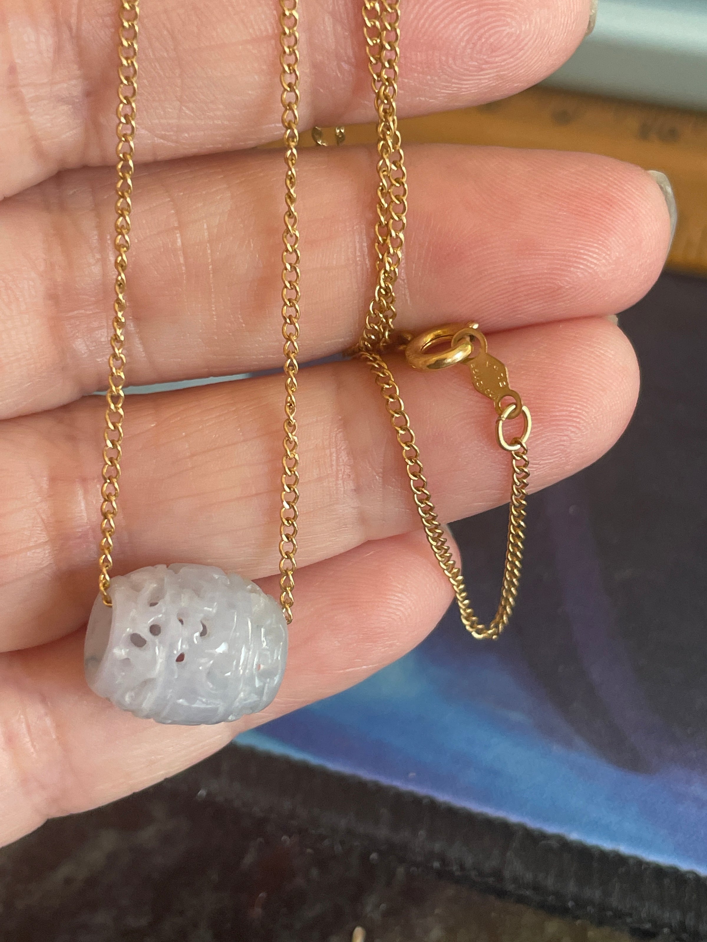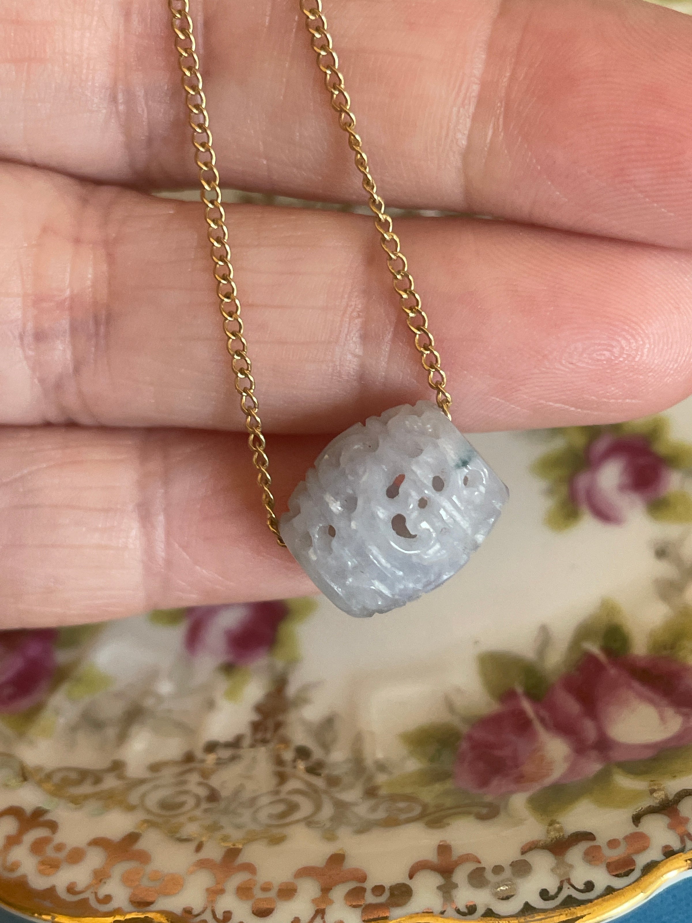 Lovely carved Lavender Jade bead pendant on vintage gold filled chain. Bead measures 0.5 inches across. Chain is approximately 17 inches. Stamped “1/20 12k GF.”