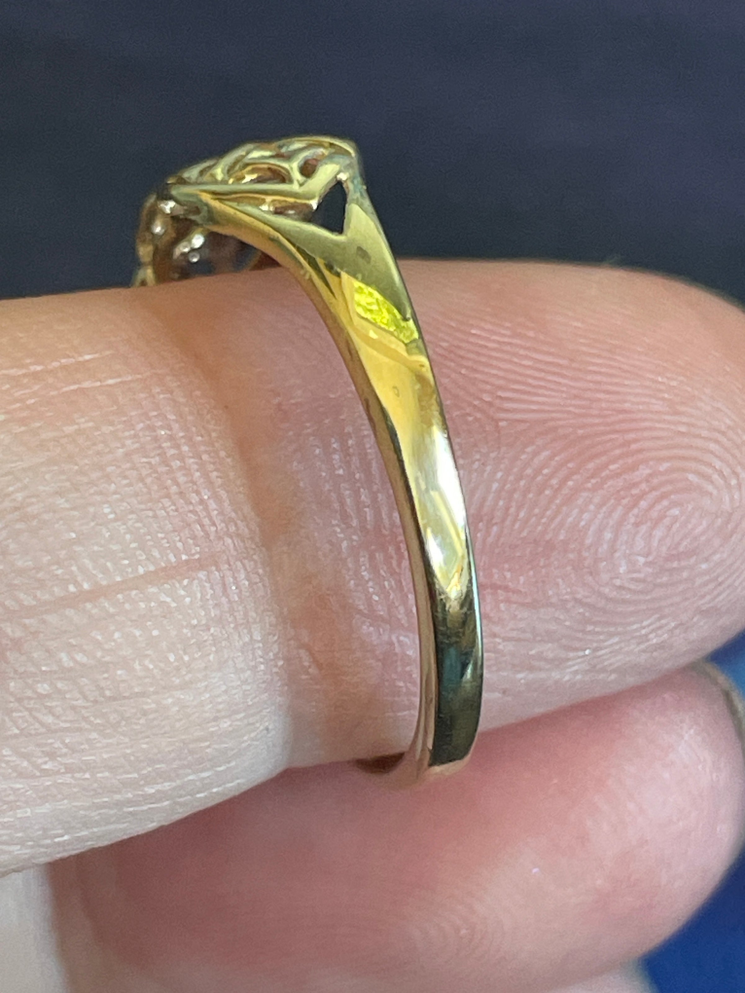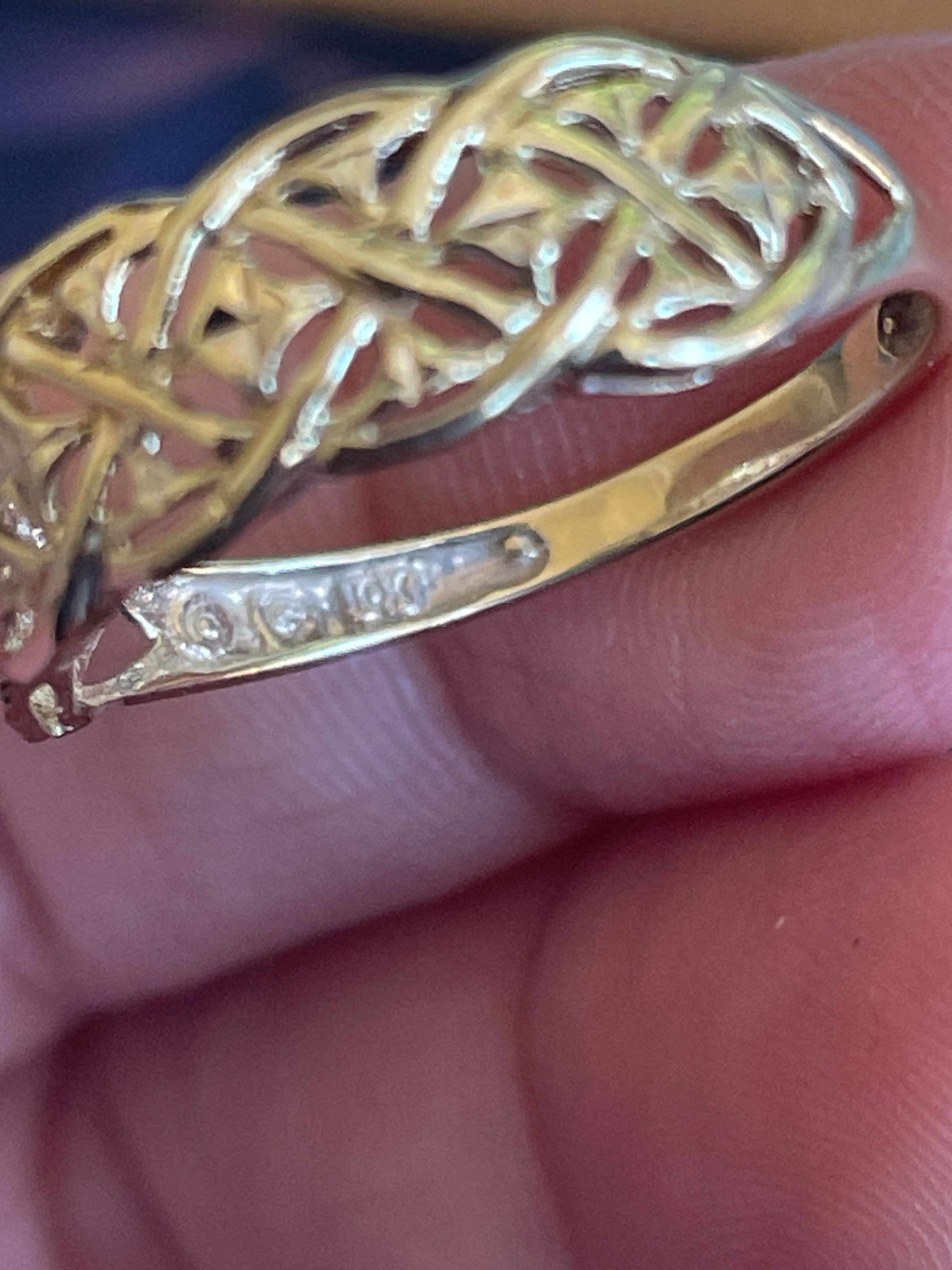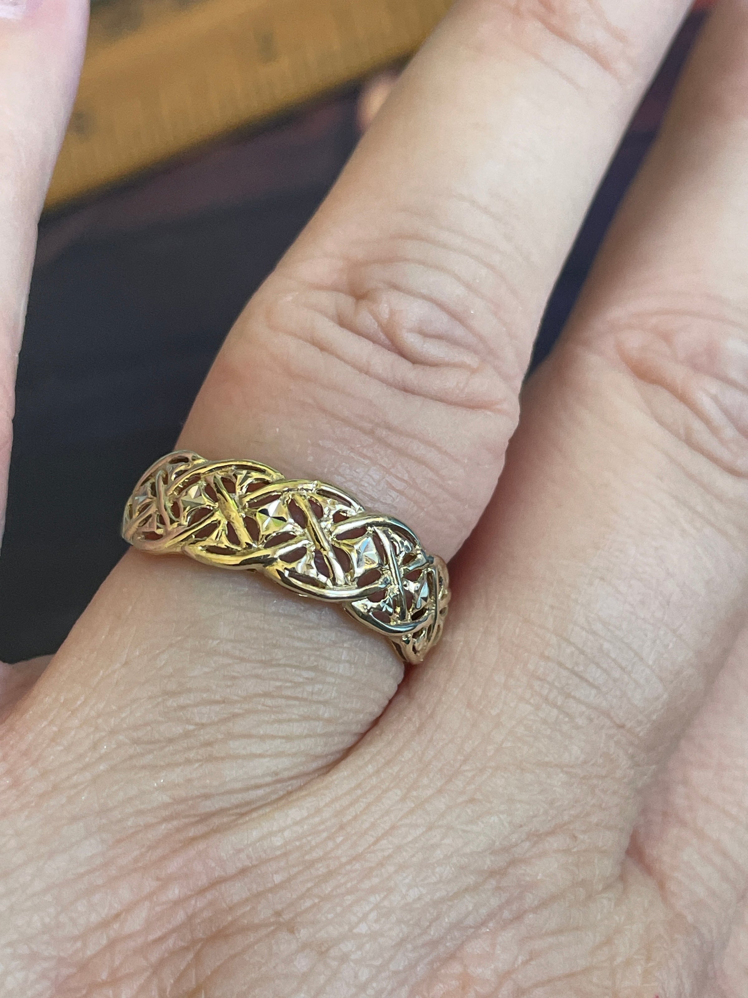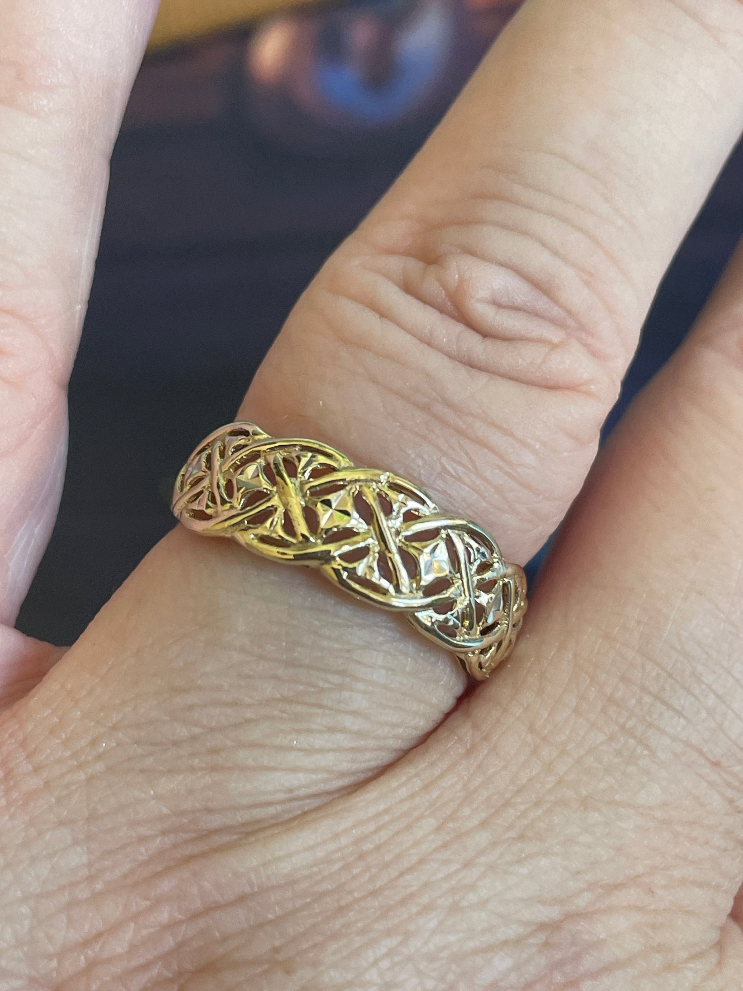 Gorgeous ornate Celtic ring in 10k yellow gold.  Back is plain so can be sized by jeweler.  Ring size currently  = 7.75.  Stamps 10k.