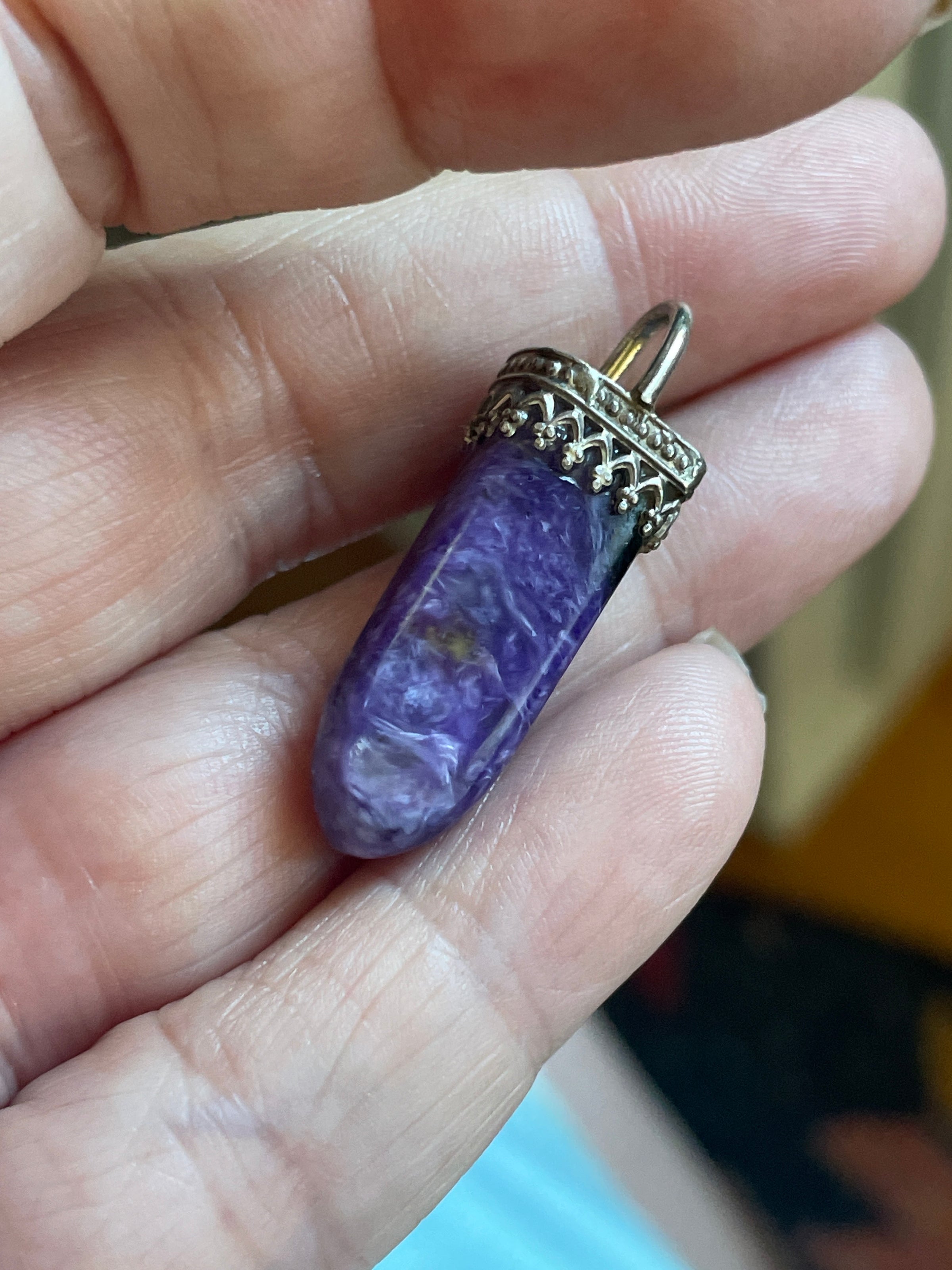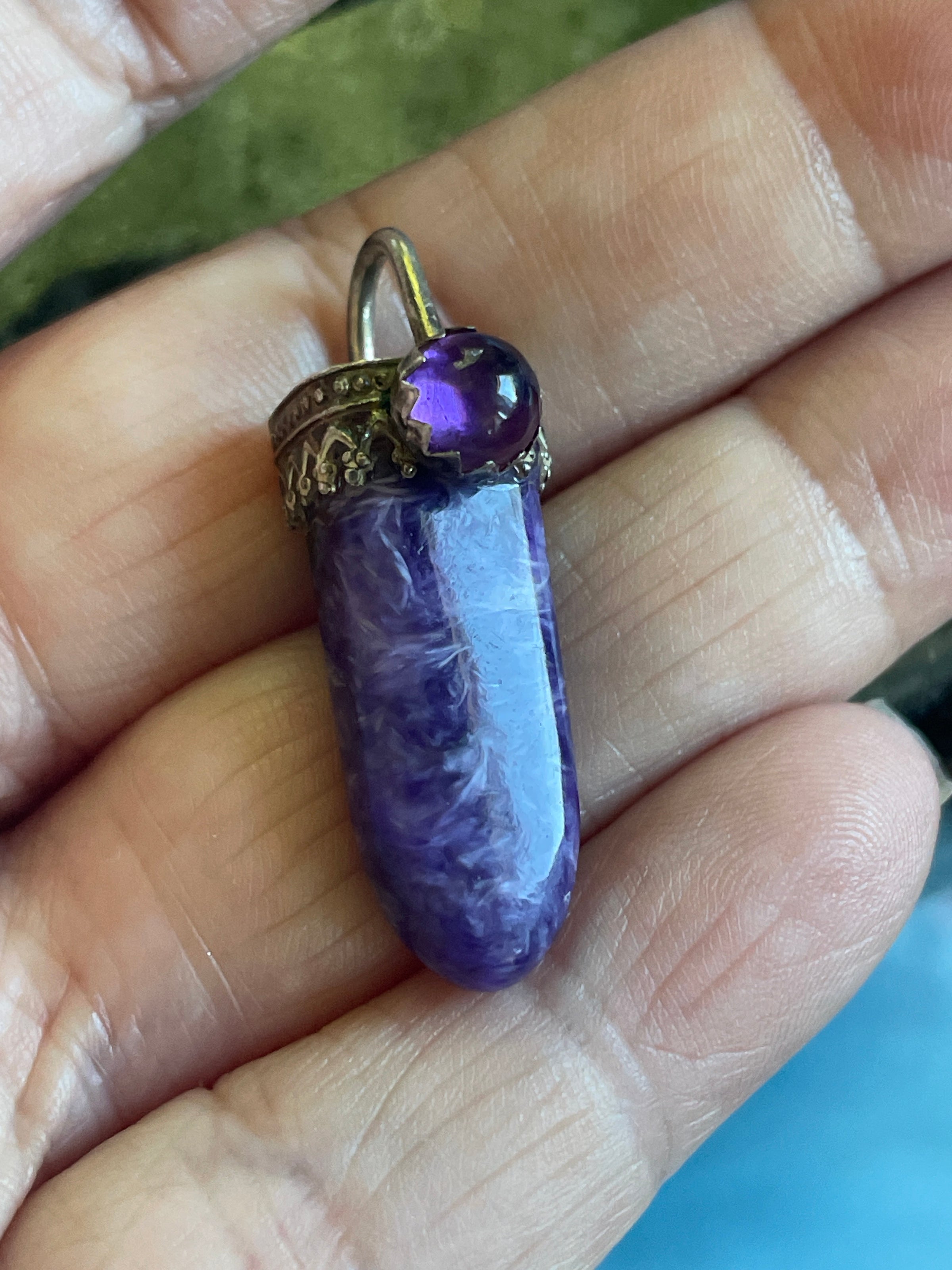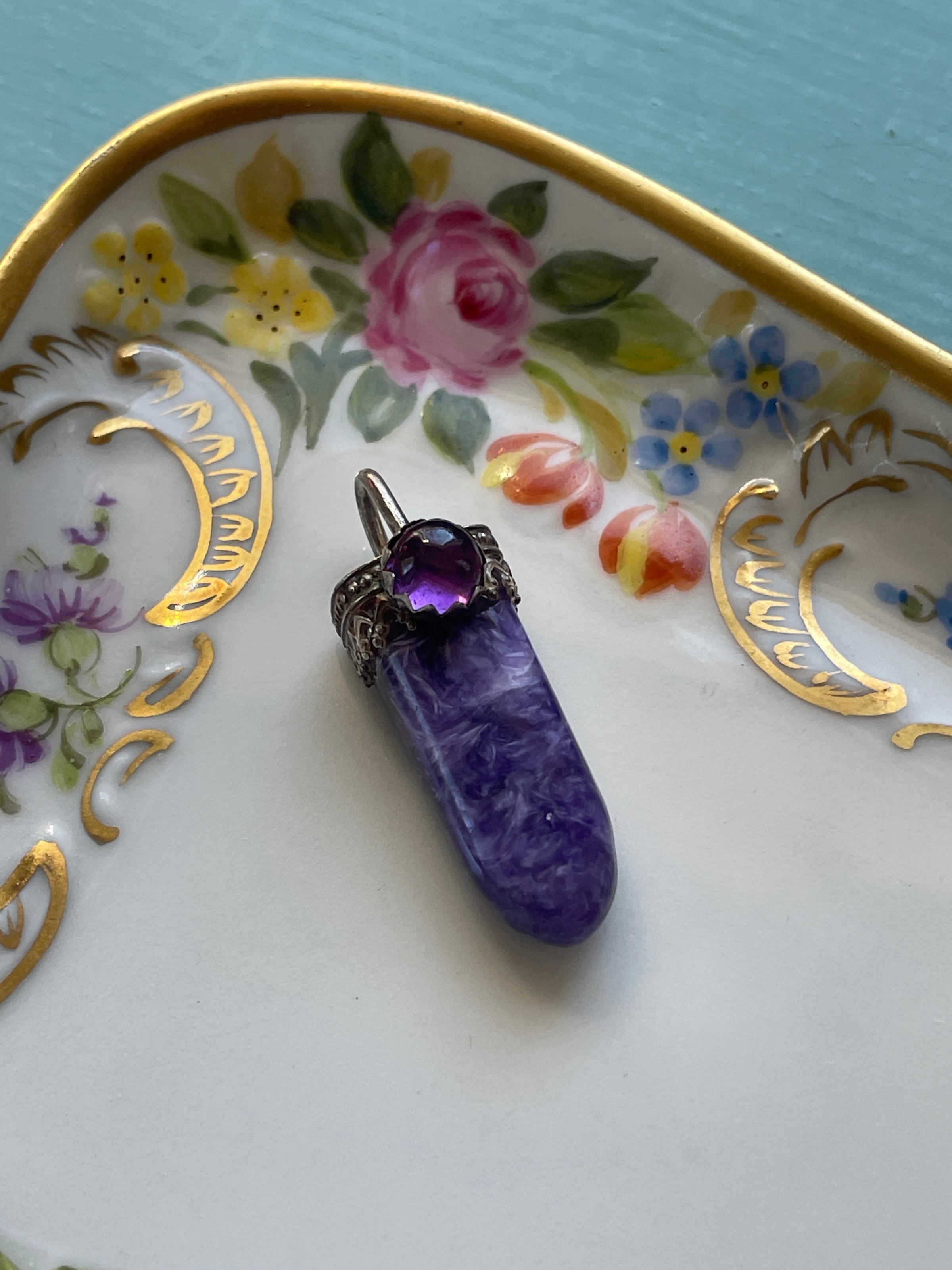 Beautiful vintage Charoite pendant with Amethyst accent in sterling. Pendant measures approx 1.25 inches. Tested sterling.