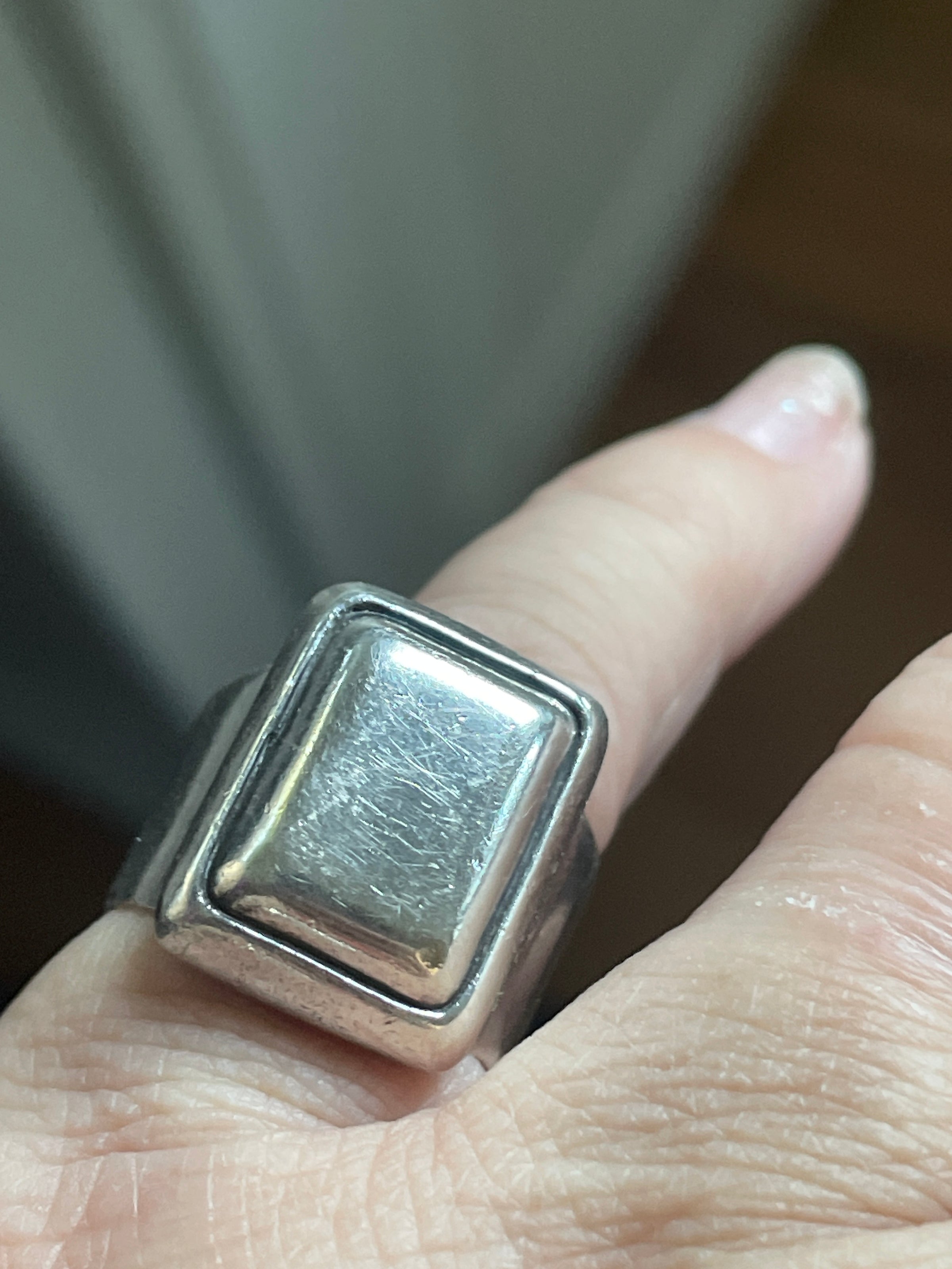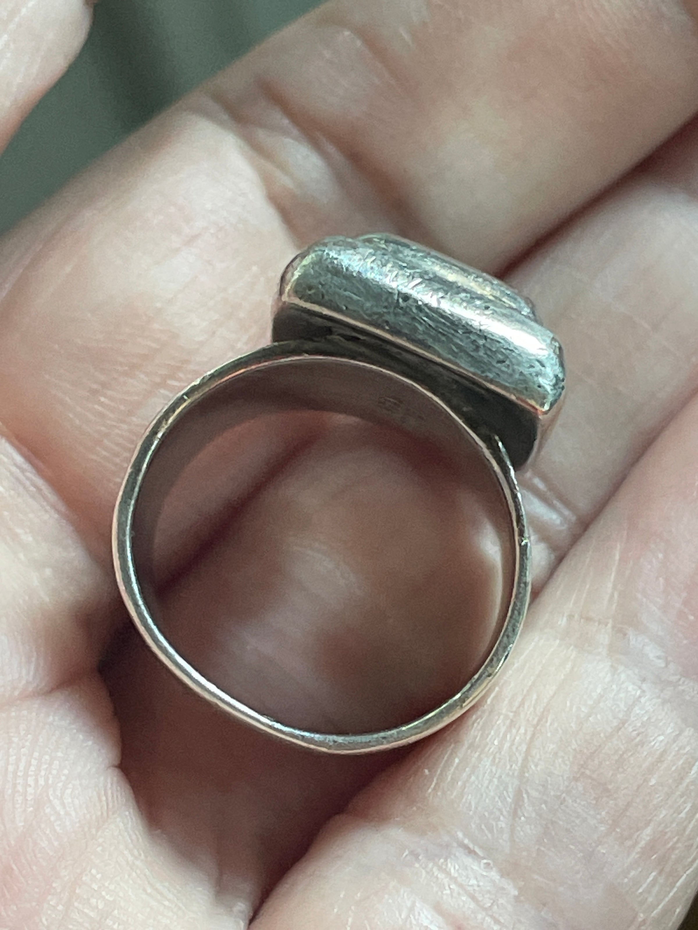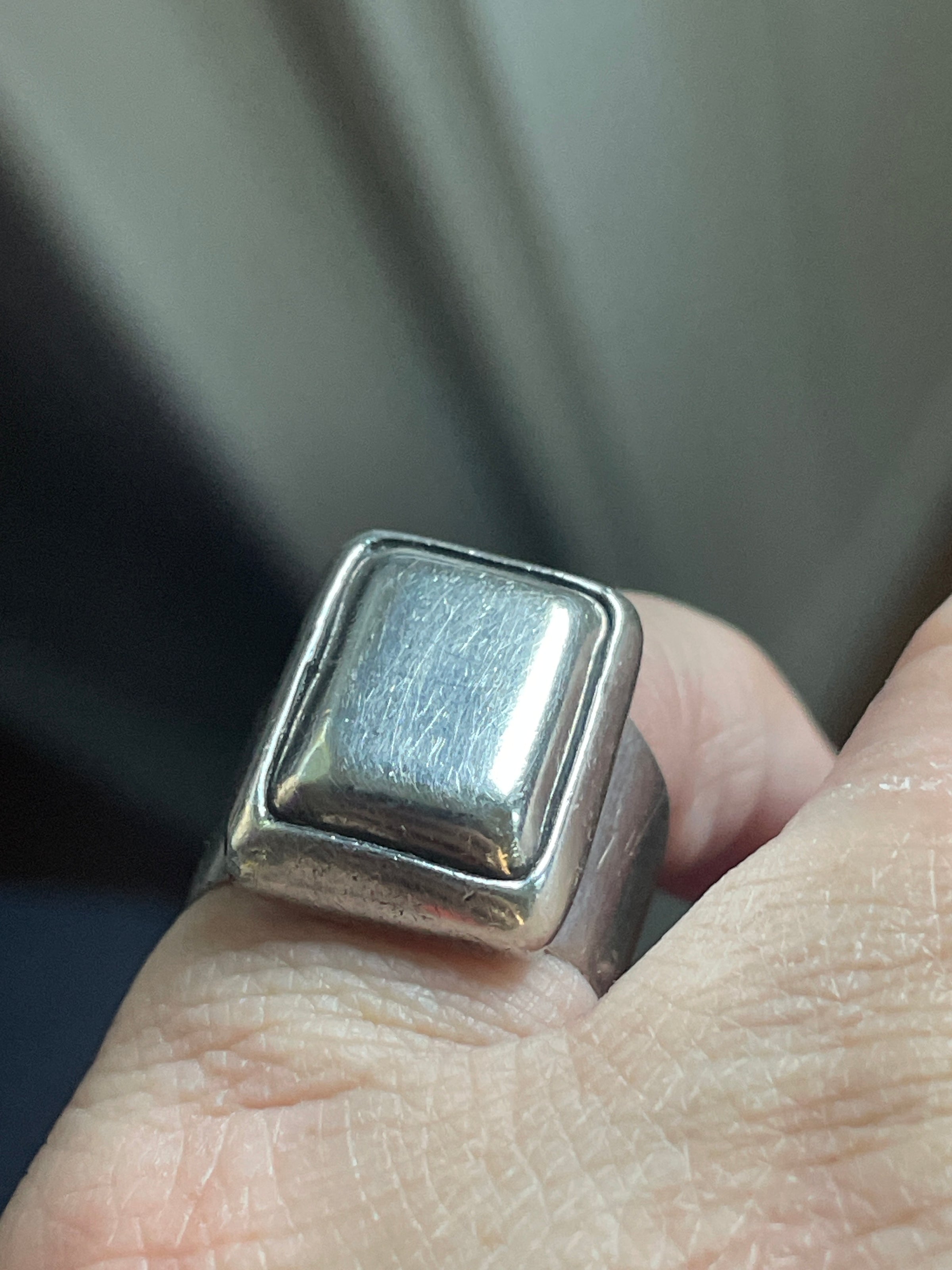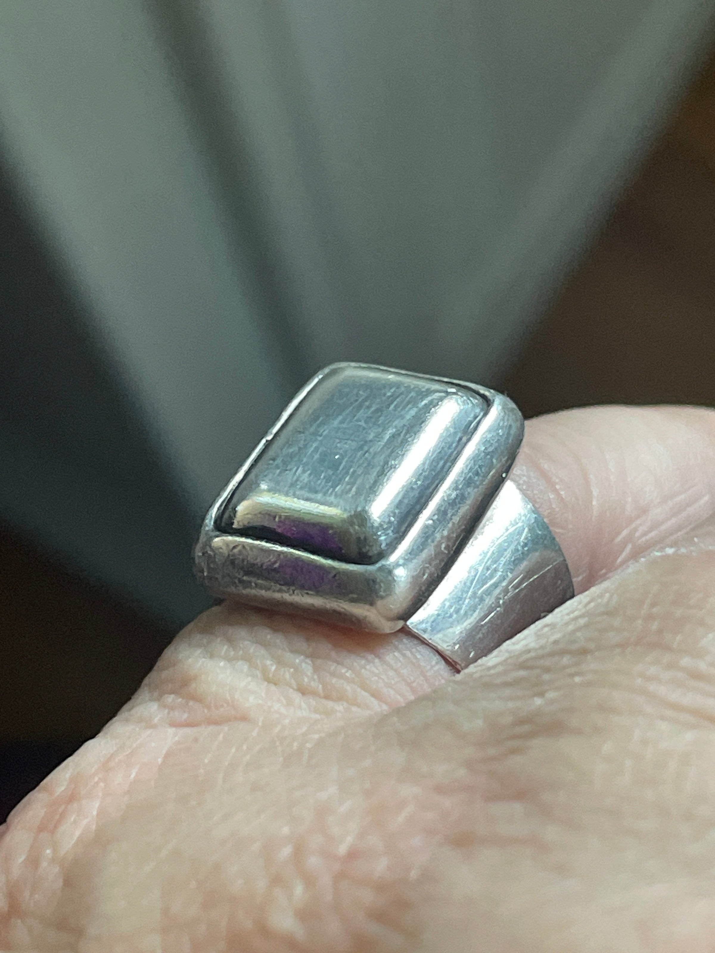 Fabulous well loved worn signet ring with heavy design. Has light scratches that make it look time worn and loved. Out of round but approx size 5. Comfortable to wear. Stamped Sterling”Mexico” and “925.” Weighs 11.14 grams.
