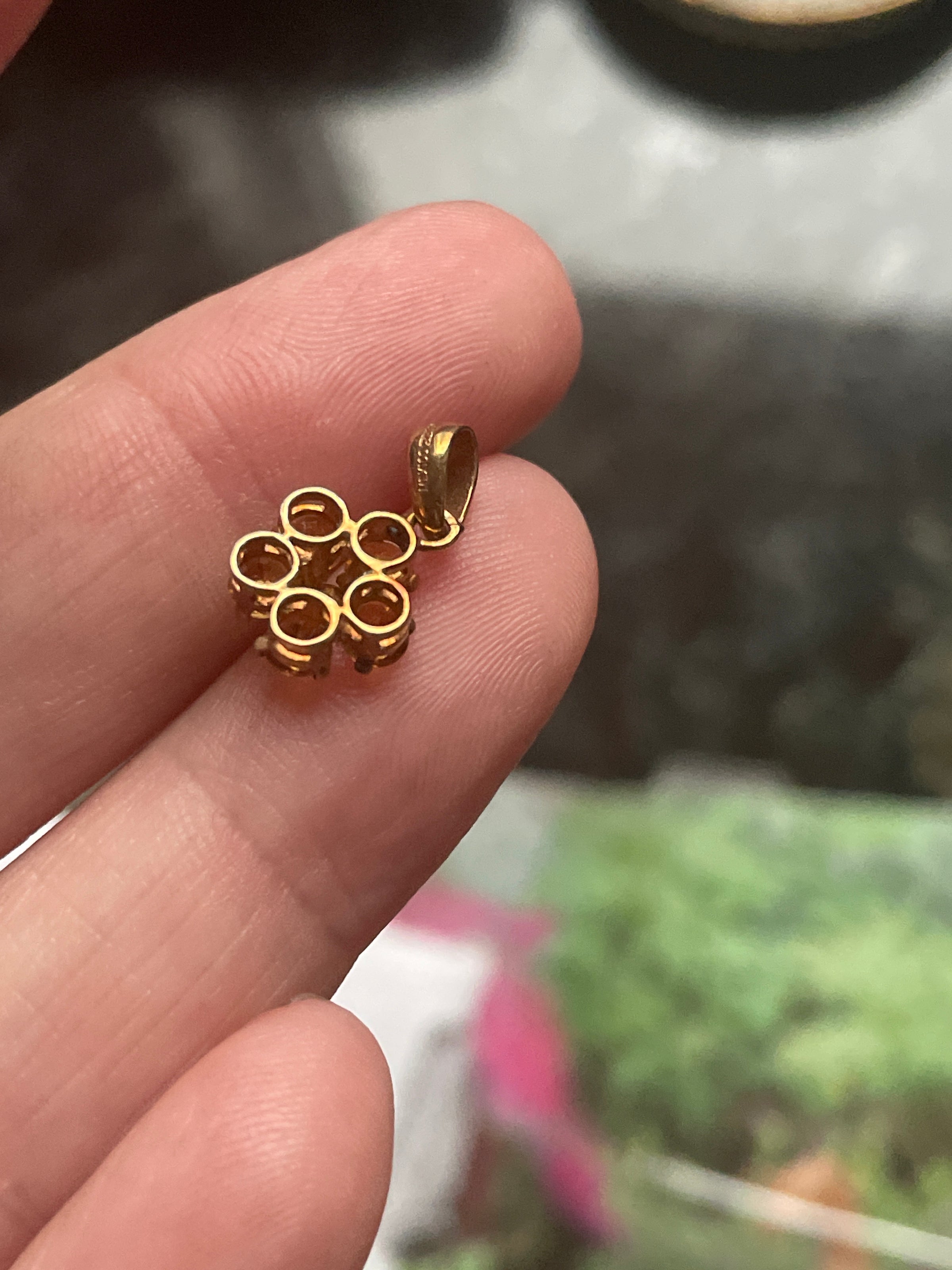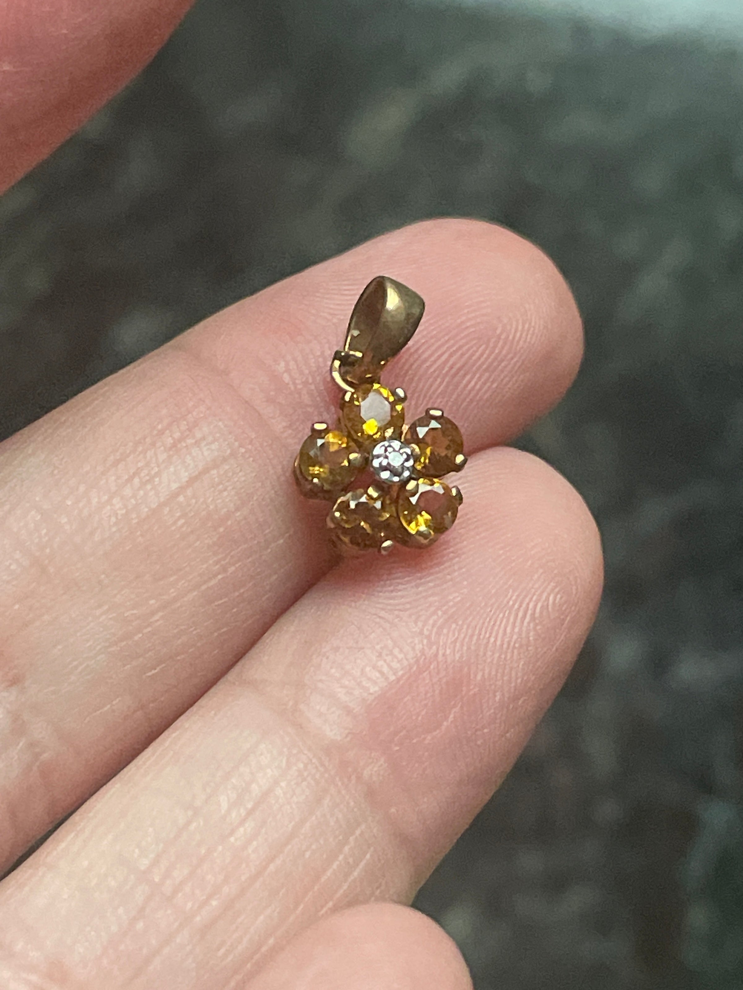 Lovely Citrine flower pendant in 10k gold with tiny Diamond center (note center is white gold and small Diamond sits at the center. Pendant measures just over 0.5 inches with top bail. Bail stamped 10k.