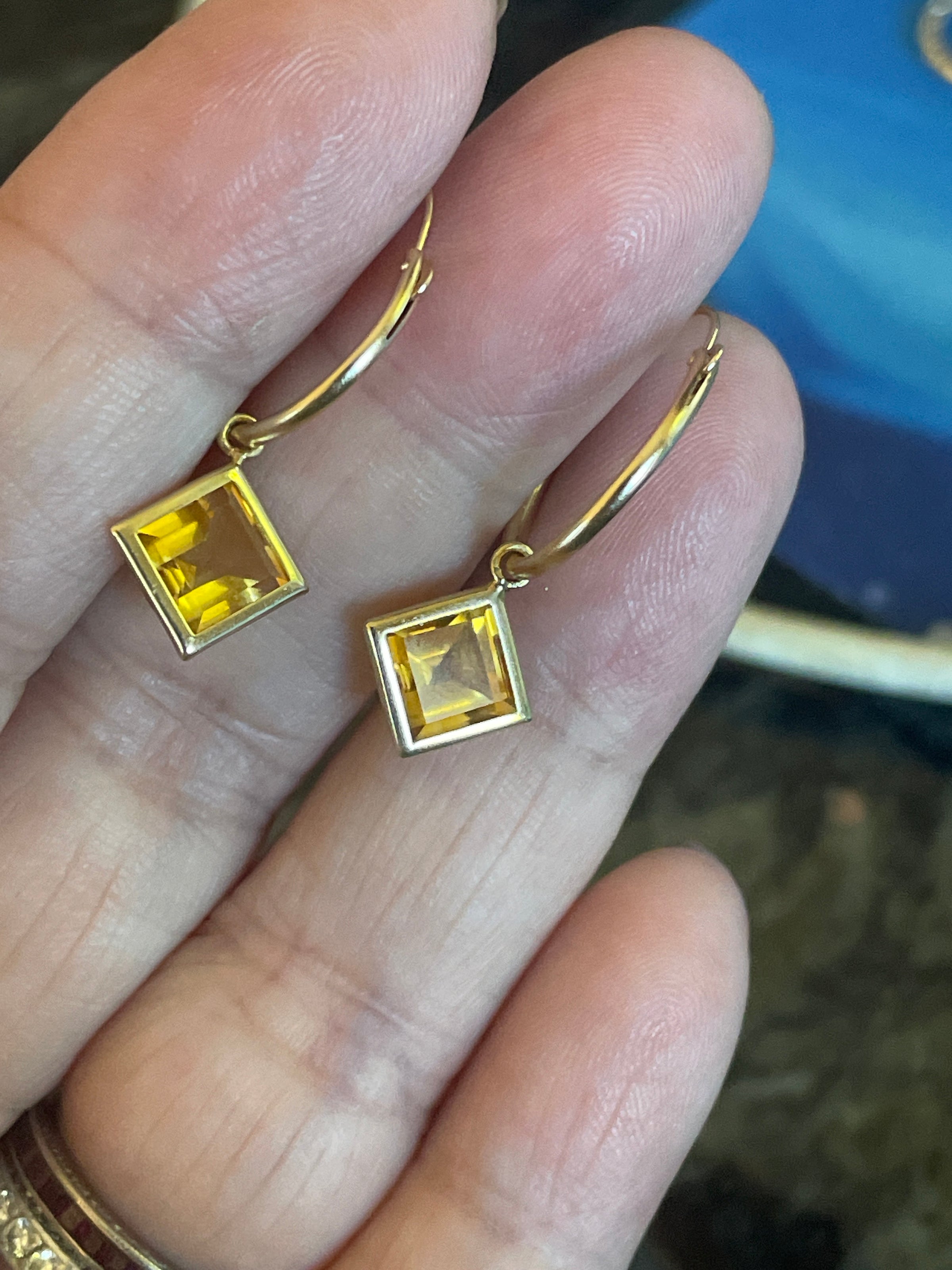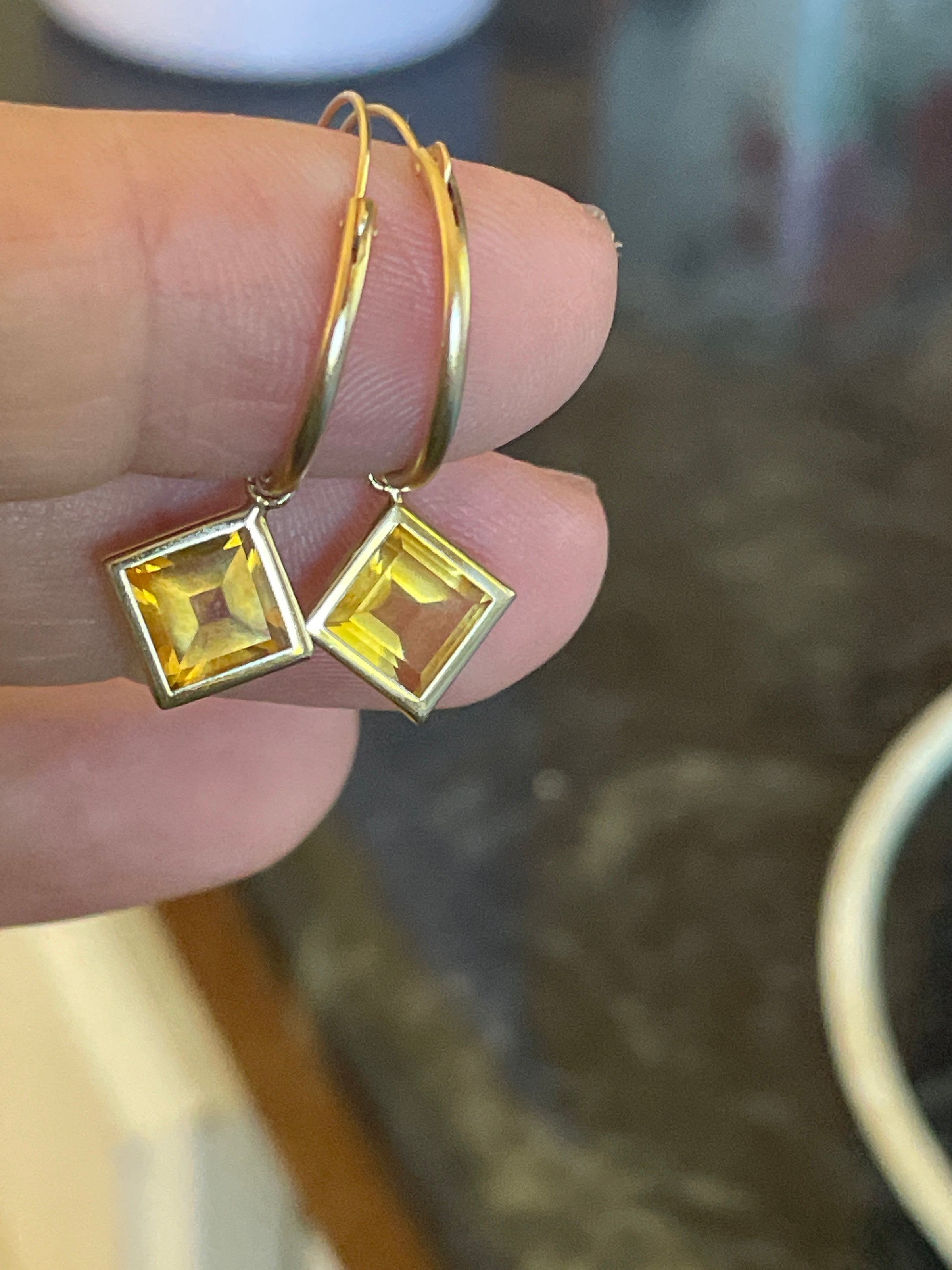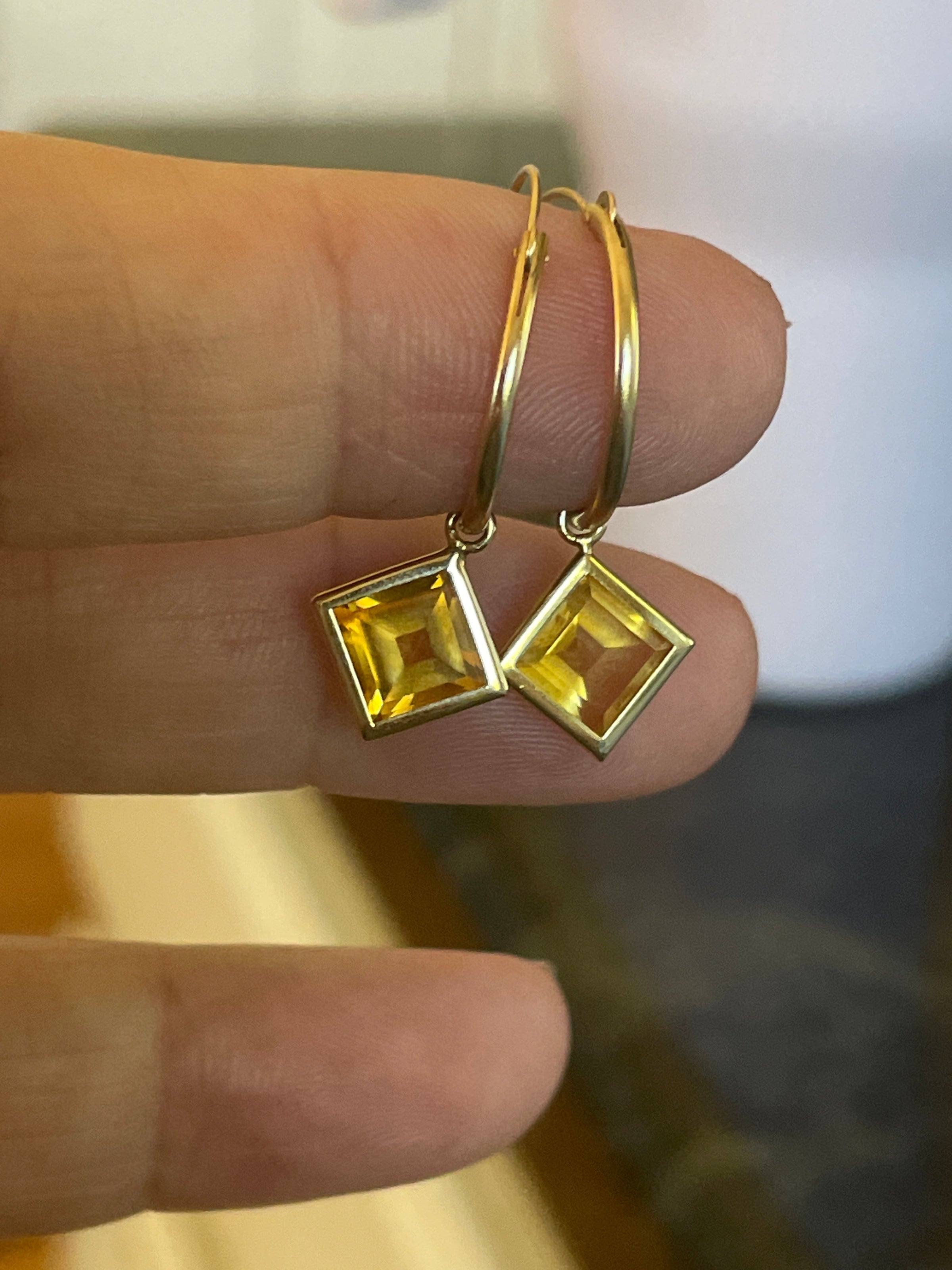 Fabulous vintage 14k gold hoops with geometric Citrine drops.  Hoops can be worn with or without drops.  Hoops just under 0.75 inches and just over 1 inch with drops.  Hoops stamped 14k.