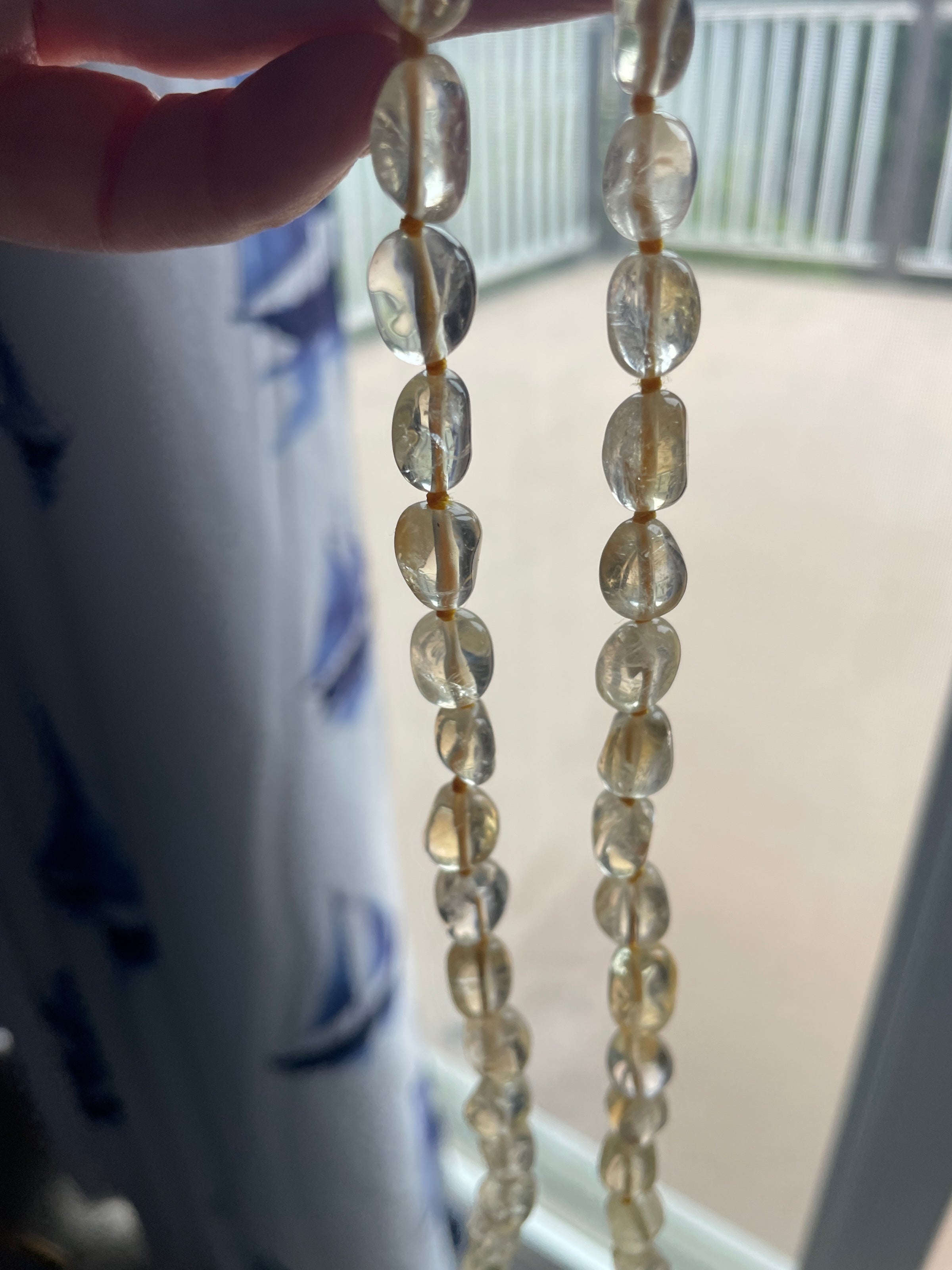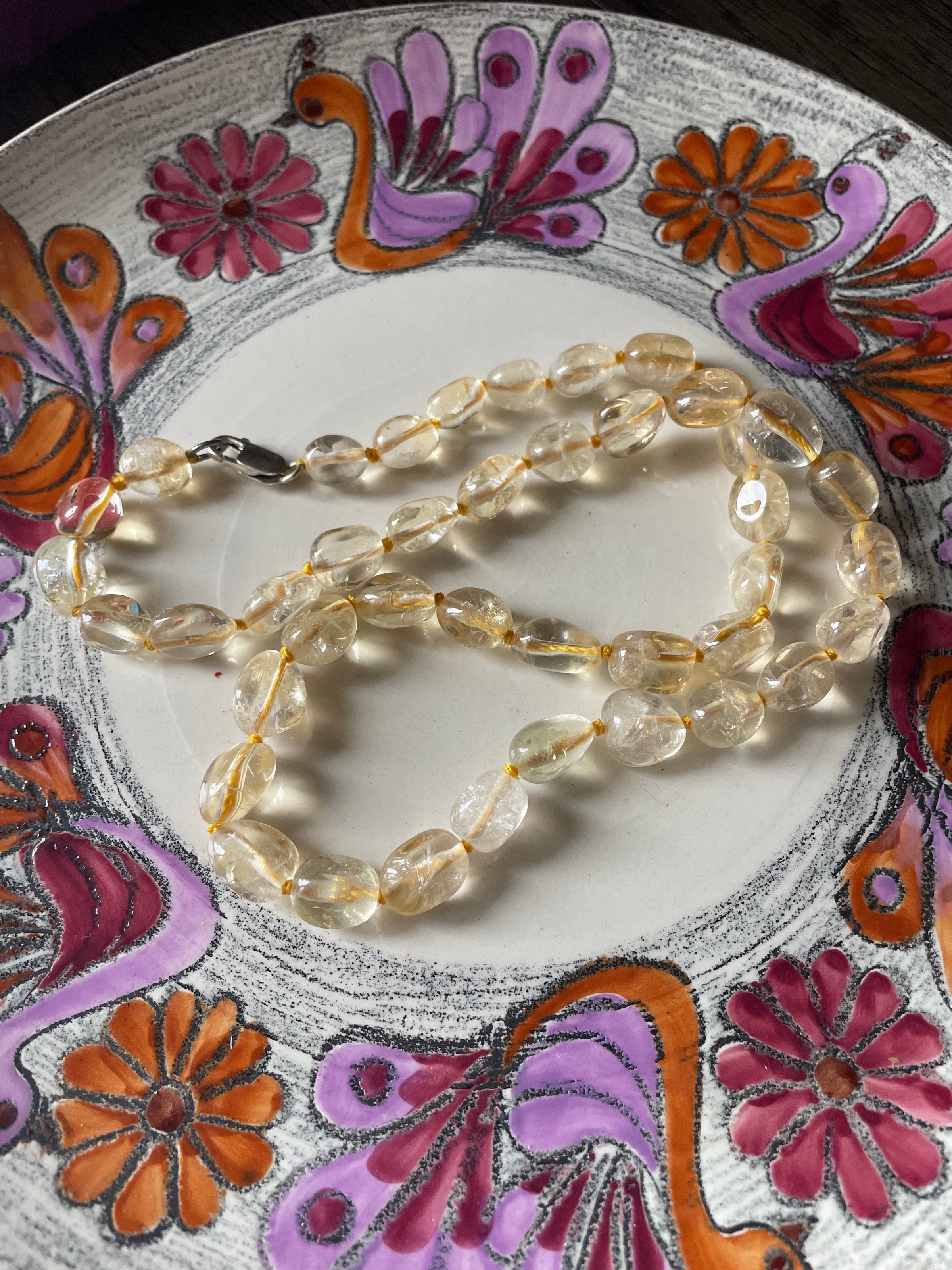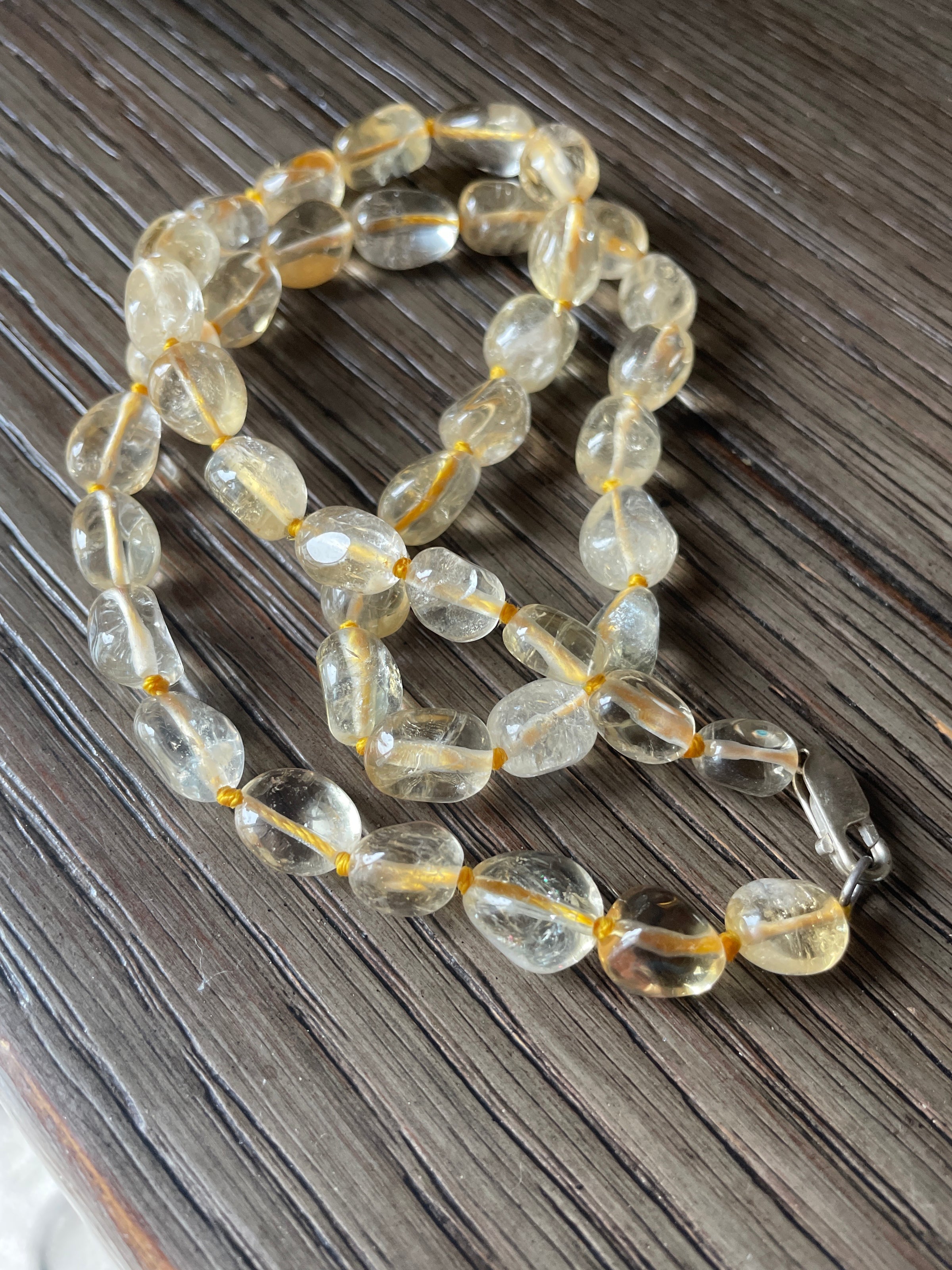 Beautiful vintage Citrine knotted necklace with sterling clasp. Yellow silk or cord used and very well done. Measures approx 19 inches. The stones have beautiful translucency. Clasp stamped 925 for sterling.